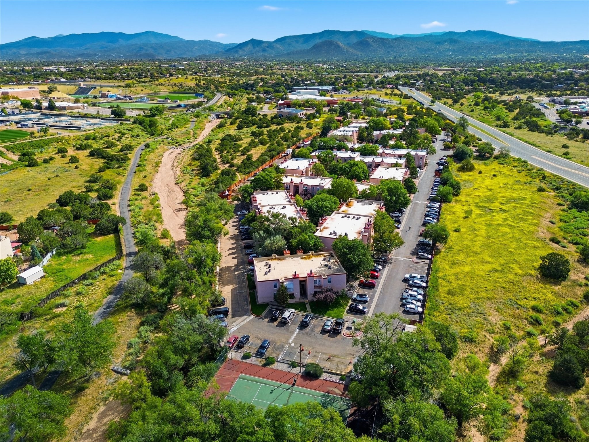 A well-maintained 2-bedroom, 2-bathroom ground-floor condo nestled within the sought-after Zia Vista community. Move-in ready and thoughtfully designed, this home offers the perfect blend of comfort, functionality, and modern convenience. Step inside to a bright, inviting space featuring an enclosed kitchen with granite countertops, complete with essential appliances for the new homeowner. The breakfast counter seamlessly connects the kitchen to the dining area, which flows naturally into the spacious living room--perfect for entertaining or relaxing after a long day. From the living area, step out to your enclosed balcony, a sun-filled retreat ideal for morning coffee or quiet reading. The primary bedroom features a private ensuite bath with a full glass-enclosed shower, while the second bedroom and bath provide flexibility for guests or a home office. A separate laundry area adds everyday convenience, and your reserved parking space right out-front makes coming home a breeze. Located close to the main gate and clubhouse, this condo offers easy access to Zia Vista's lots of amenities, including a heated swimming pool, relaxing hot tub, community clubhouse, activity court, scenic walking trails, and on-site laundry facilities--all within a secure, gated environment for added peace of mind. Whether you're a young professional, starting a family, or enjoying retirement, this home offers the ideal mix of comfort, convenience, and community. Situated just minutes from shopping, dining, and outdoor recreation, you'll experience the best of Santa Fe living right at your doorstep.