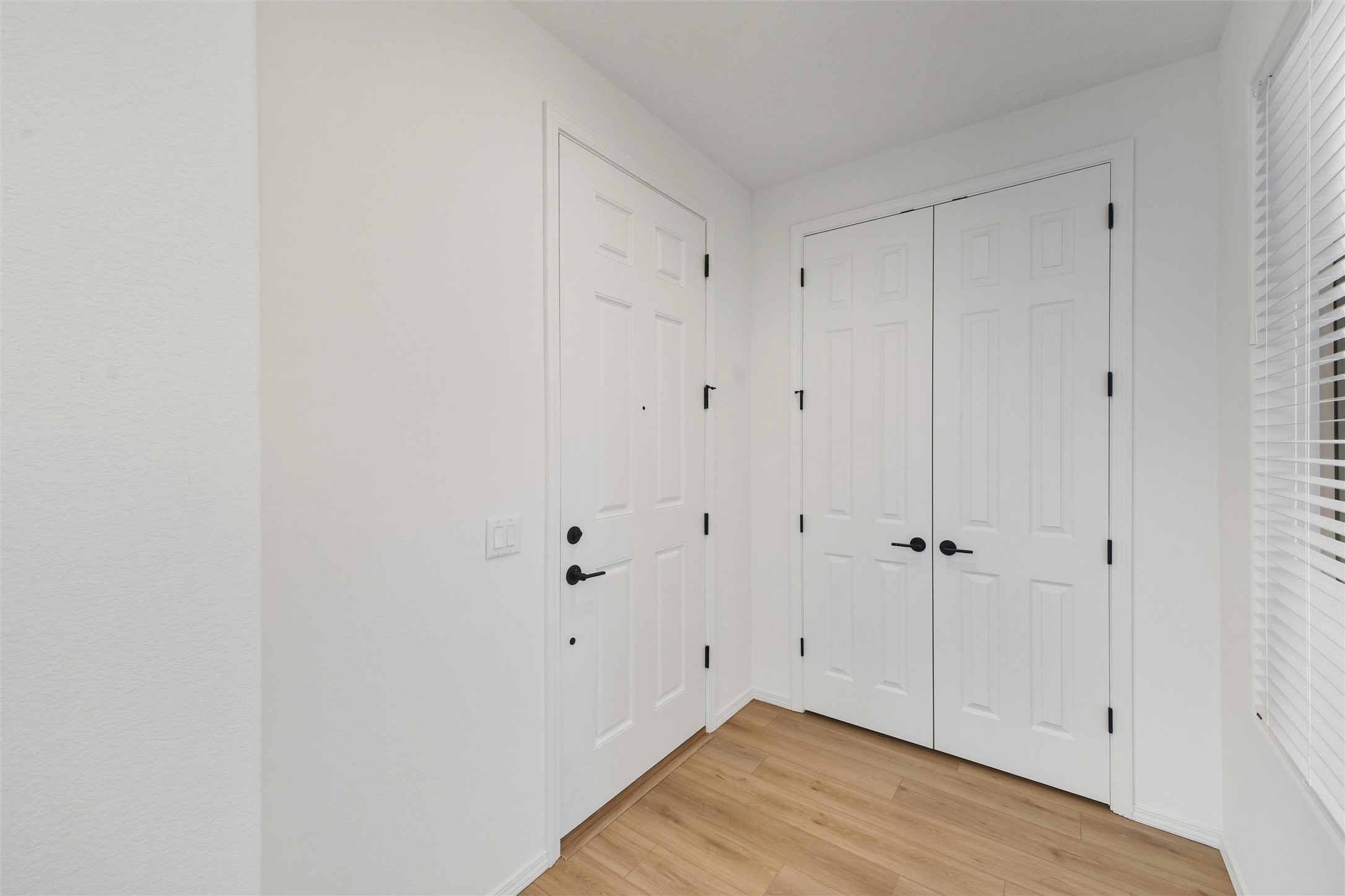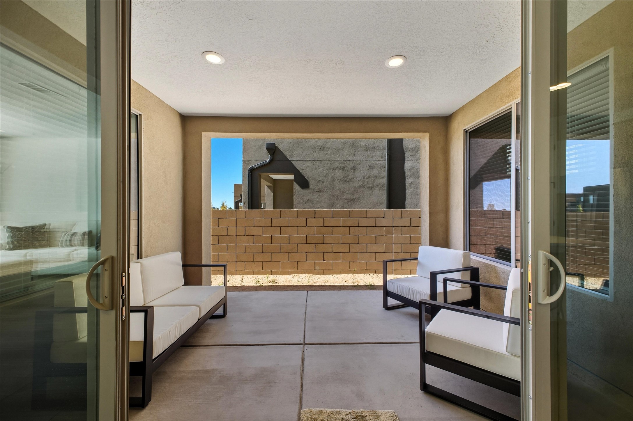 Welcome to your nearly new, 2023 Pulte home, the lovely covered entry portal provides protection from the weather, inside you'll be surprised by the double door closet providing ample storage space. The light and bright floor plan begins with a spacious living room that blends well with the open-concept kitchen and dining space, luxury vinyl flooring throughout. Your well-equipped kitchen features a generous island with seating, spacious pantry, wall oven, 5-burner gas cooktop, modern finishes, newer stainless-steel appliances, custom cabinets, and beautiful quartz countertops. Two sliding doors across from the island offer you easy access to enjoy the lovely Santa Fe weather while you lounge under your covered patio in your private-side courtyard. Just off the kitchen, adorned with beautiful French doors, you'll find a dedicated flex space that you could use as an office, den, or media room, centrally located but separate. The first floor also features a full-sized laundry room, below stair closet/storage and easy access to your two-car garage, all providing you more storage spaces. Upstairs, you'll discover your versatile bonus room, perfect for a kids' playroom, home gym, media space, the opportunities are endless. Your home comes complete with two bedrooms that share a full bath in the hallway, and a spacious primary owner's suite. The primary en-suite bath features double vanities, a generous glass-enclosed tiled shower, and a private water closet, all connected to a large walk-in closet. Your home features an on-demand, energy efficient, tankless hot water heater, central heat and refrigerated A/C, all designed to provide hours of indoor comfort. The Las Soleras community is located just minutes from I-25, the 599, medical facilities, and a plethora of shopping and dining options. Bordering the Las Soleras community you'll find a large open space featuring a park that offers a basketball court, playground, dog run, walking trial and a cabana for entertaining.