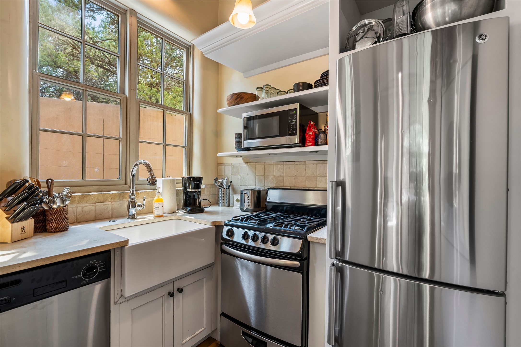 Exquisite 3-bedroom, 3.5-bath vacation rental or primary home and guest house. Excellent on Hyde Park Road situated in a tranquil, gated forest setting, just 10 miles from the Santa Fe Ski Basin. Additionally, the world-famous Ten Thousand Waves spa is right across the road, providing a serene escape for relaxation and rejuvenation. Elegantly designed property featuring imported floor tiles and windows from France. The layout is thoughtfully divided by a foyer, creating the unique opportunity for single family, live/work property or dual living spaces--perfect for families, guests, creative types, or even rental opportunities. The main house has a large living room with stately fireplace, dining room, kitchen, and two bedrooms including one upstairs. The attached guesthouse has a living room, dining room and a generous-sized kitchen with sufficient space for a table for 4-6 and one luxury suite with a glam soaking tub in its bedroom. Recent upgrades enhance the home's appeal, including a new roof, new BBQs, and several new mini splits for comfort in every season. Multiple outdoor areas and portals invite you to enjoy the breathtaking surroundings, whether it's morning coffee on the patio or evening gatherings under the stars. Short drive to the historic Santa Fe Plaza or take public transportation right out your front door.