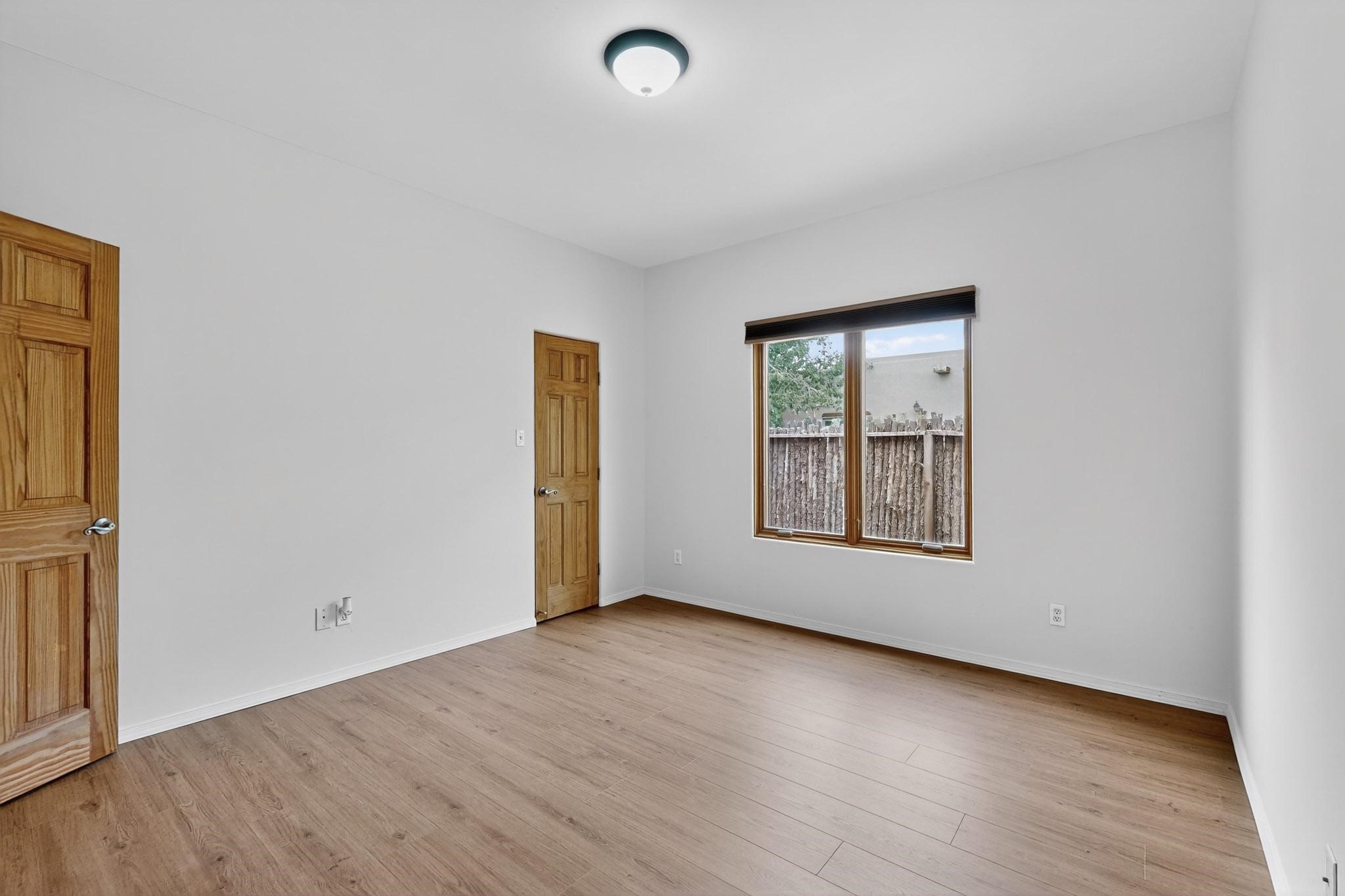 The is the most charming unit and a must see! This rare one level, end unit (next to open space) has 2 bedrooms, 2 full baths, a 1 car garage and pitched roof and even an exterior storage closet. There are high beautiful cathedral ceilings with heavy wood beams and T&G. Floors are tile throughout main area and wood-like new vinyl flooring in bedrooms. There are peaceful patios in front and back and very private with coyote fencing all around. This home has been completely painted throughout, a new belt drive garage door opener has also been installed for the new owner. This home has an open living/dining area with a beautiful kiva wood burning fireplace with a banco. This is an exceptional unit and shows like new. Please schedule today, it is vacant and ready for a new owner. Please schedule through showing Time. Virtual Staging and fire in fireplace digitally added.