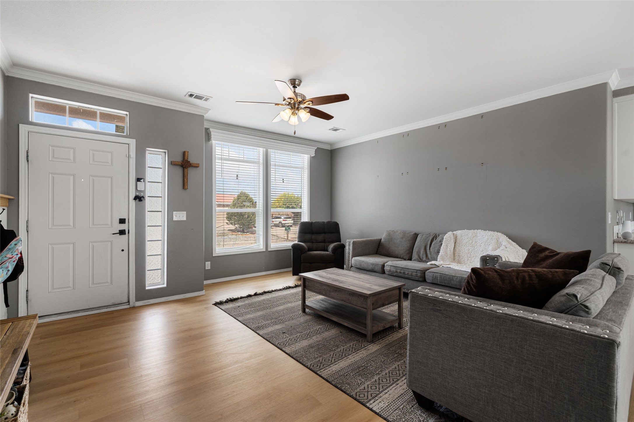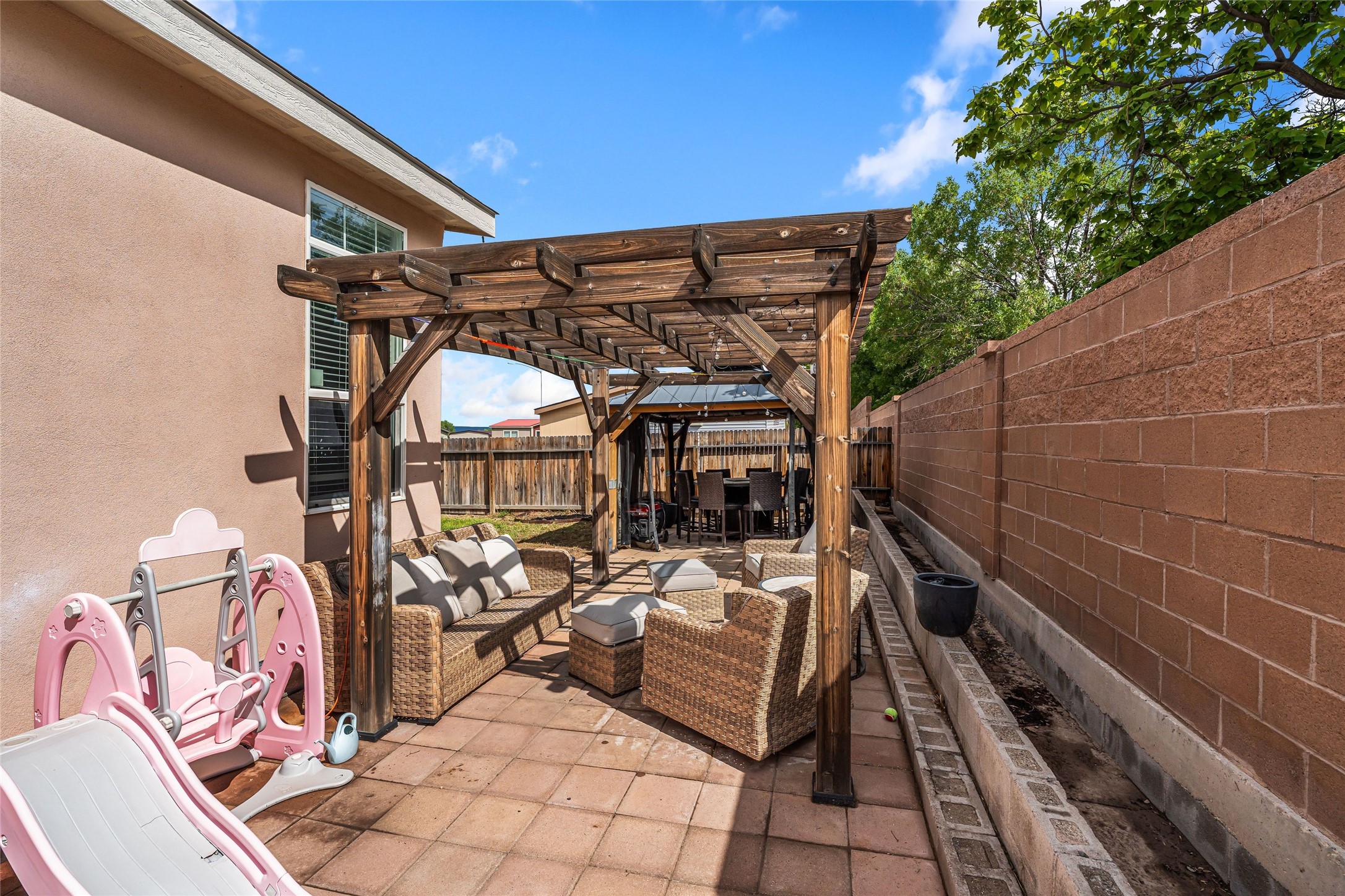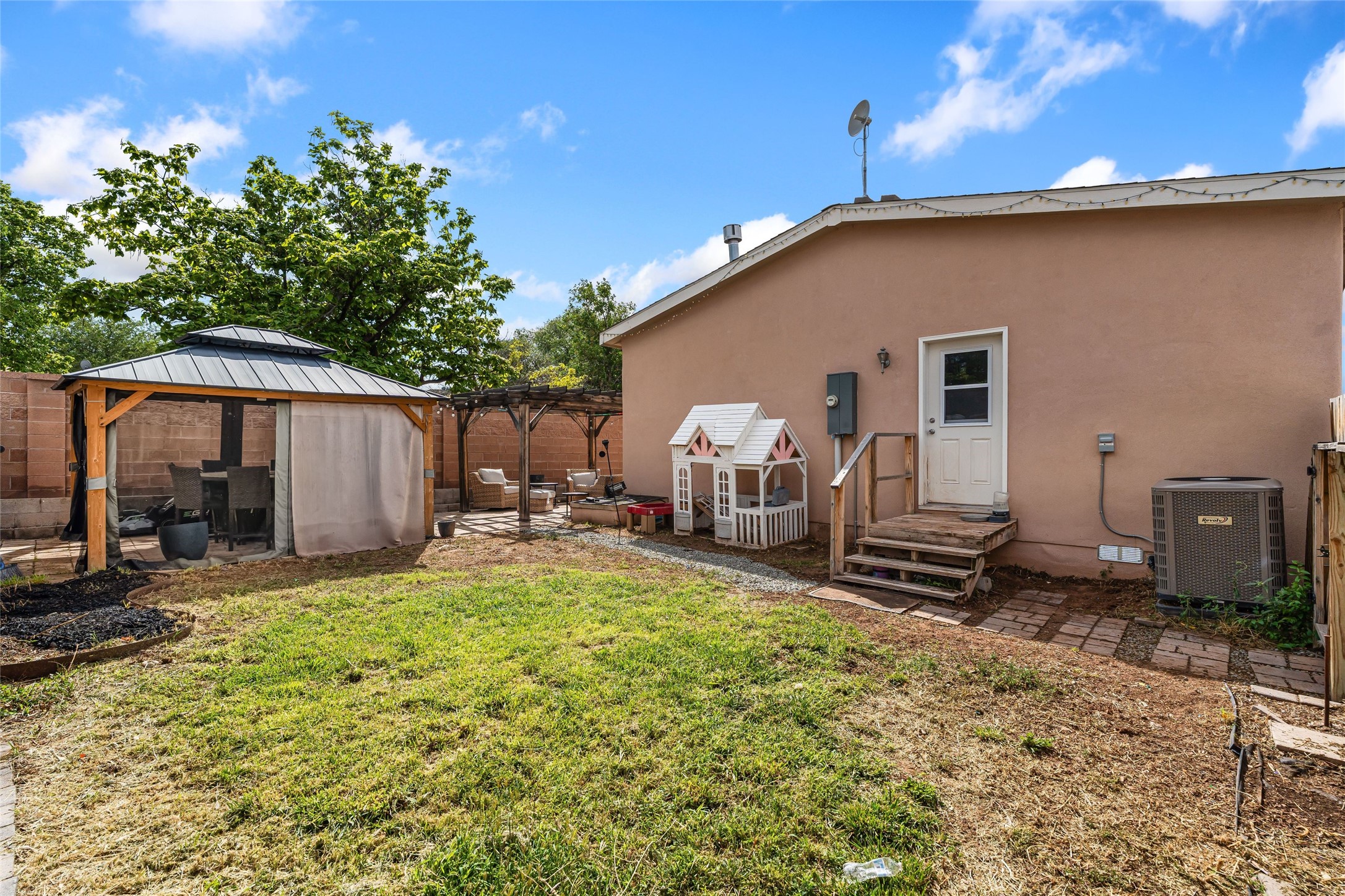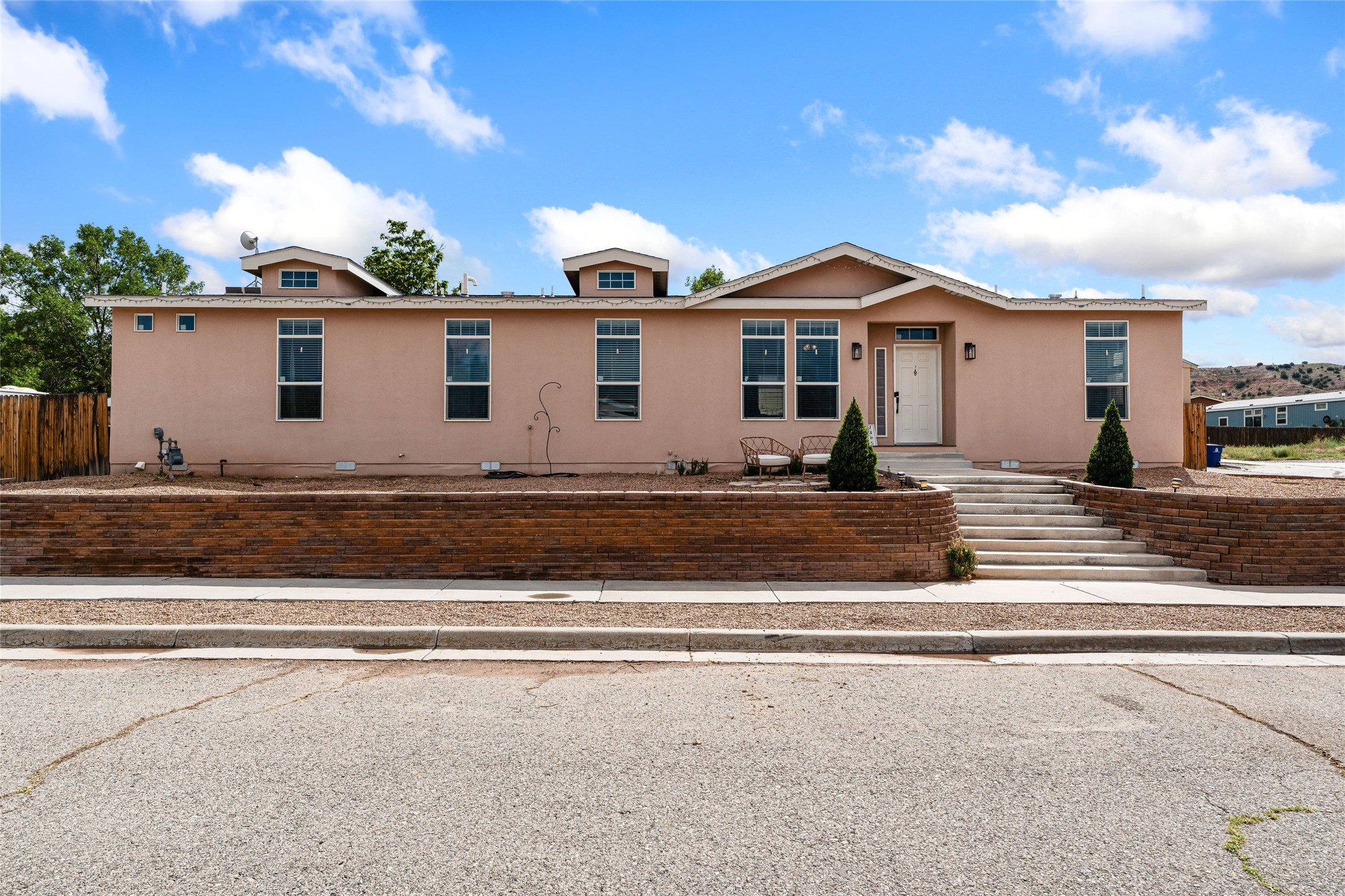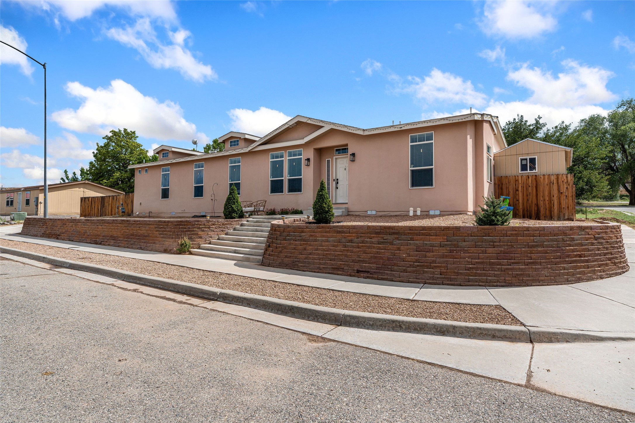 Updated 3-bedroom, 2-bath modular home sited on a corner lot with a permanent foundation and numerous seller improvements, this residence offers both style and functionality. Step inside to discover a bright and inviting open floor plan, featuring new luxury vinyl plank flooring. The kitchen showcases crisp white cabinets, modern appliances, and a spacious center island with seating for four. The built-in hutch and adjacent dining area provide a welcoming atmosphere for family meals and gatherings, with easy access to the backyard for outdoor entertaining. The primary bedroom has clerestory windows which fill the space with natural light and an oversized walk-in closet for ample storage. The remodeled en-suite bath has dual sinks and soaking tub, perfect for unwinding after a long day. Two additional guest bedrooms share a well-appointed bath, making this home ideal for families or guests. The second living area offers versatile options as a den, media room, or play area, catering to your lifestyle needs. Outside, enjoy the side pergola and covered outdoor dining area, perfect for alfresco dining and entertaining. The large side patio and garden areas provide ample opportunities for outdoor pursuits. Also has a retaining wall and fence. Located in the heart of Espaola with the added benefit of being equidistant from Santa Fe and Los Alamos.