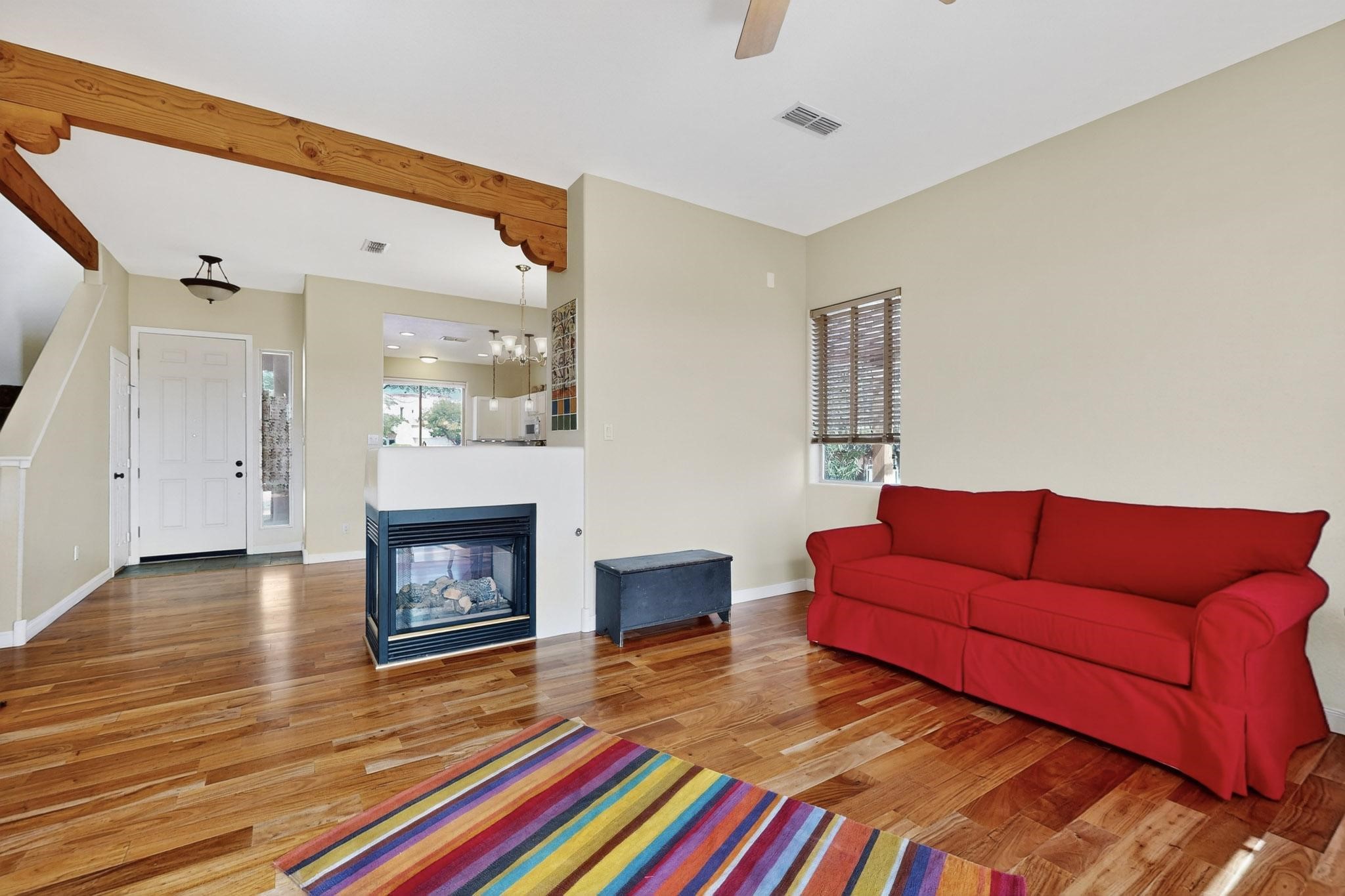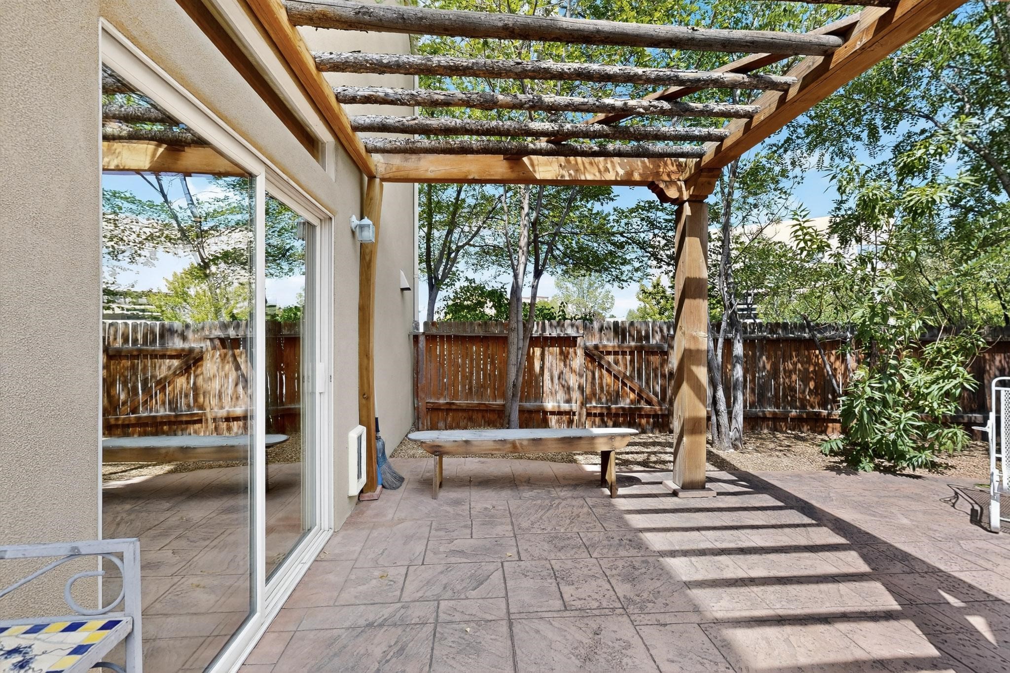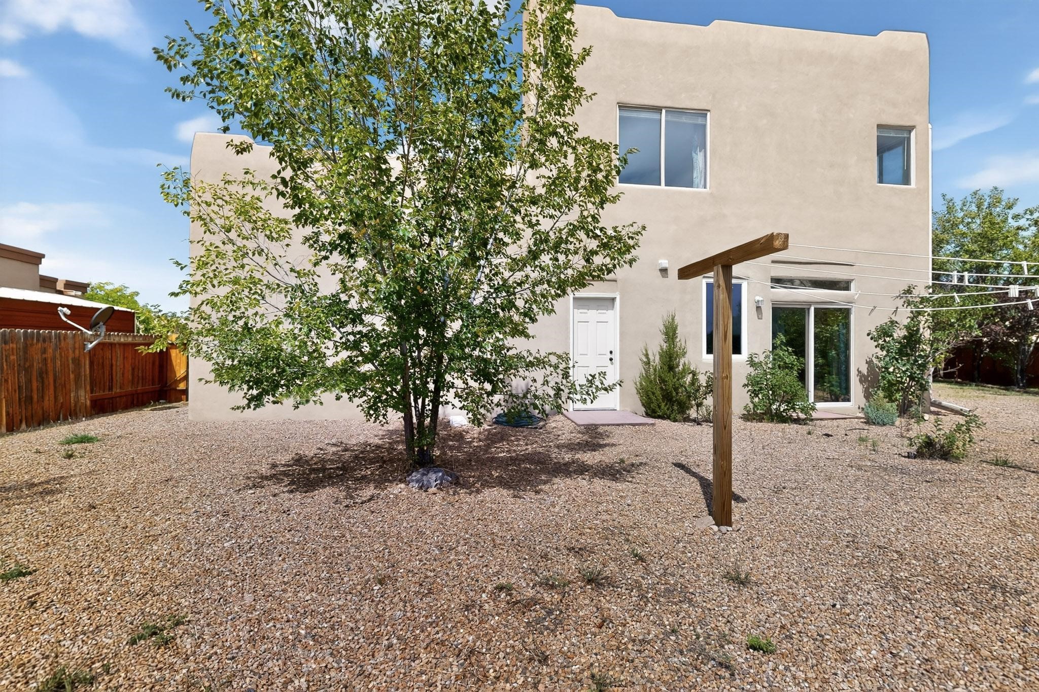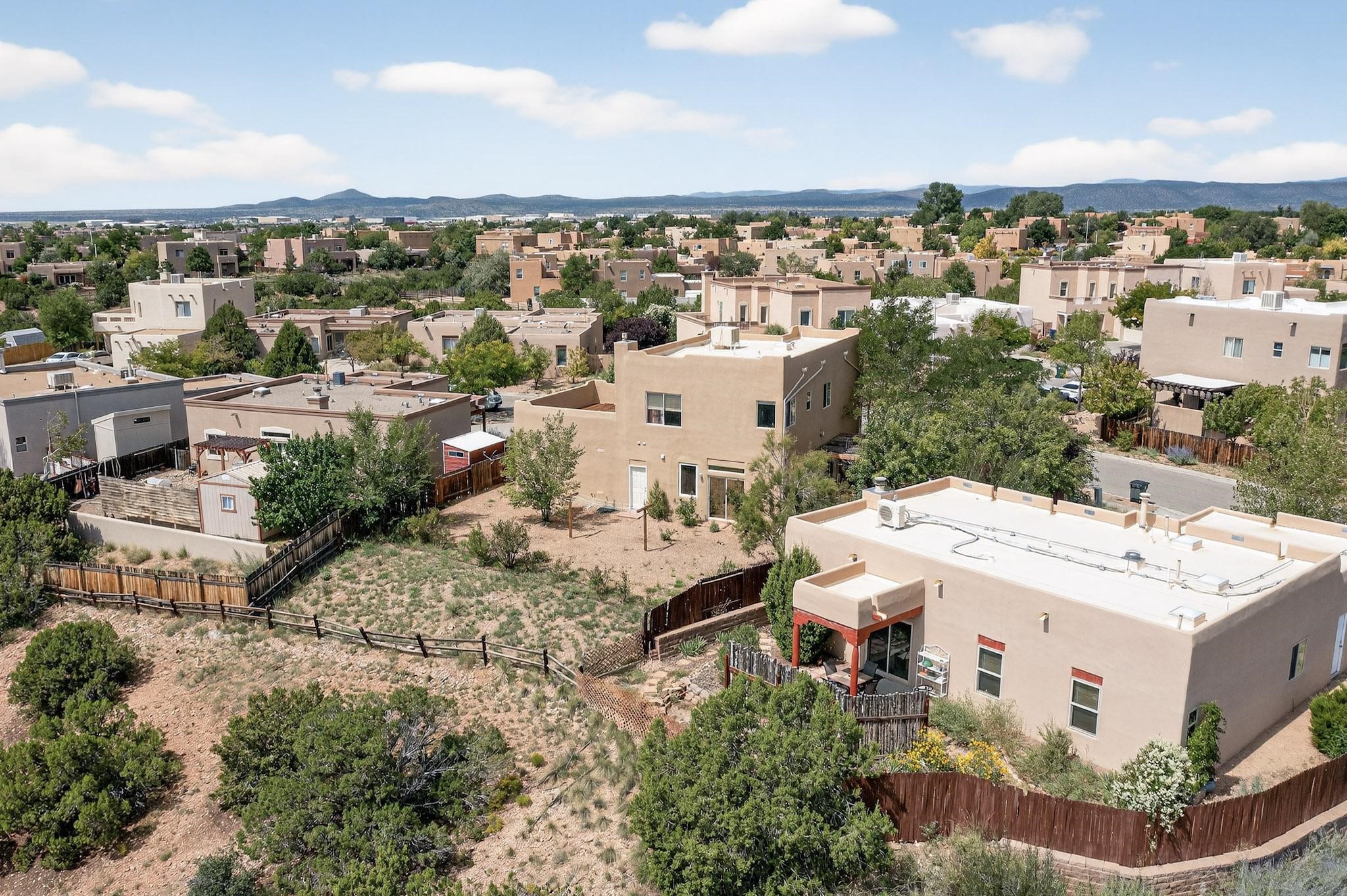 Nestled atop a serene arroyo, this exceptional property offers unparalleled convenience, mere minutes from Highway 599 and Cerrillos Road--perfect for commuters heading to Los Alamos (45 minutes) or Albuquerque (50 minutes). This location is the heart of a vibrant community, with tree-lined sidewalks and trails along Jaguar Drive, nearby schools, a public library, and the picturesque Swan Park. Plus, you can easily access historic Agua Fria Street for a quick 20-minute drive to the Railyard or Plaza in the charming heart of Santa Fe. Inside, the home welcomes you with soaring ceilings and is truly move-in ready, featuring a newer TPO roof and fresh exterior stucco. The original garage has been transformed into a stunning Artist Studio, a versatile space that can easily be reverted back or used as additional flex space for your hobbies or as a family room. The ground floor seamlessly opens onto a spacious outdoor patio, surrounded by mature trees, creating an ideal setting for entertaining or peace and relaxation. The beautifully upgraded kitchen is perfect for culinary enthusiasts and entertaining, while the master suite upstairs offers a spa tub and a private outdoor deck--your sanctuary for morning yoga or evening stargazing. With a drip irrigation system in place to maintain lush, green grounds and keep the house cool, this property truly embodies comfort and convenience. Don't miss your chance to call this beautiful home your own!