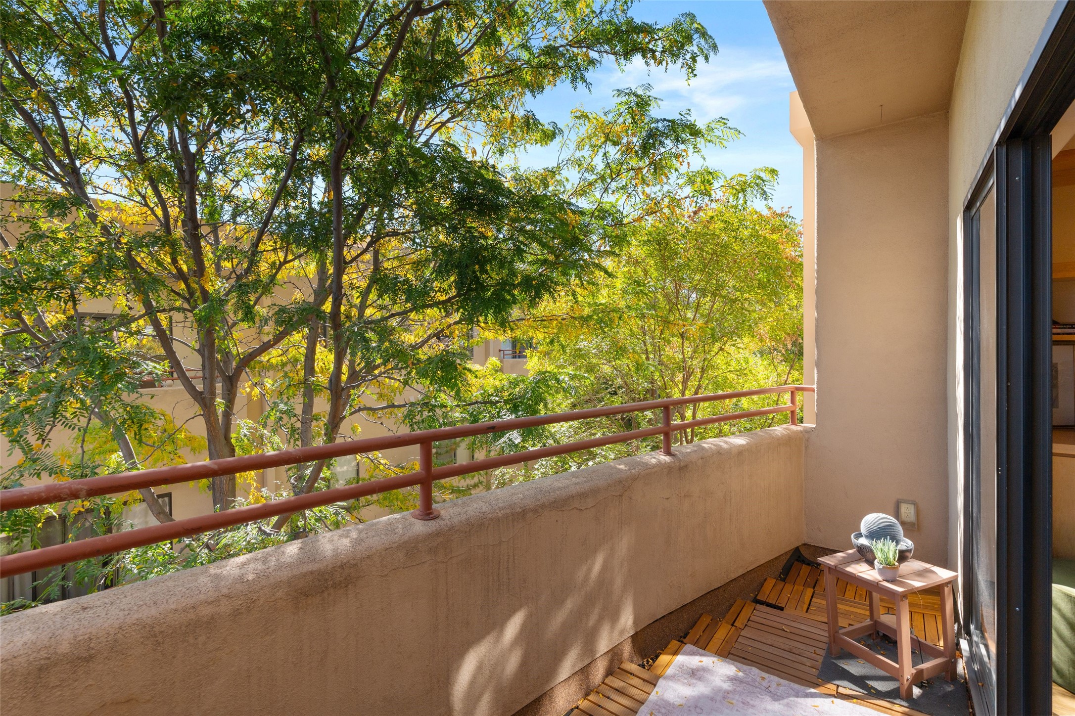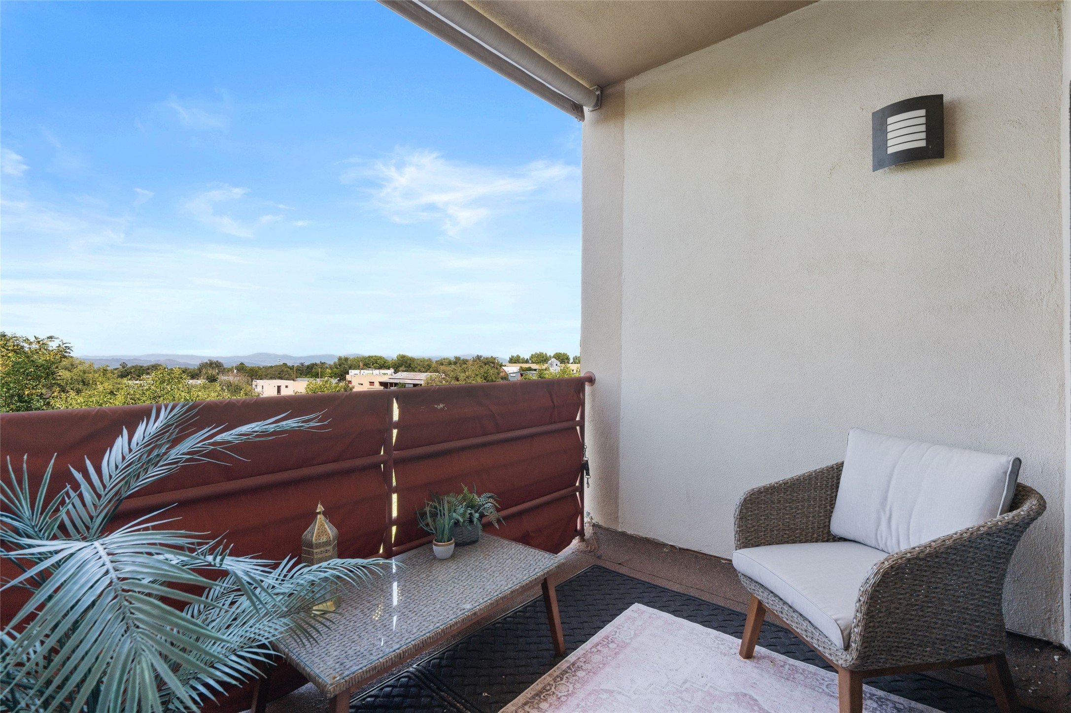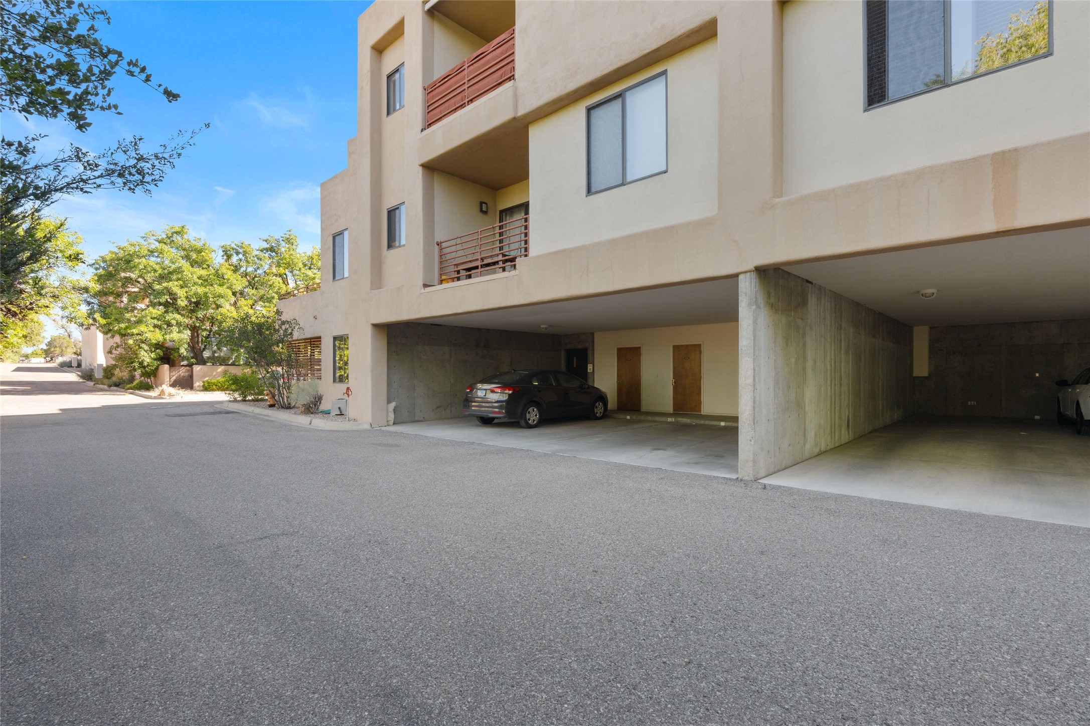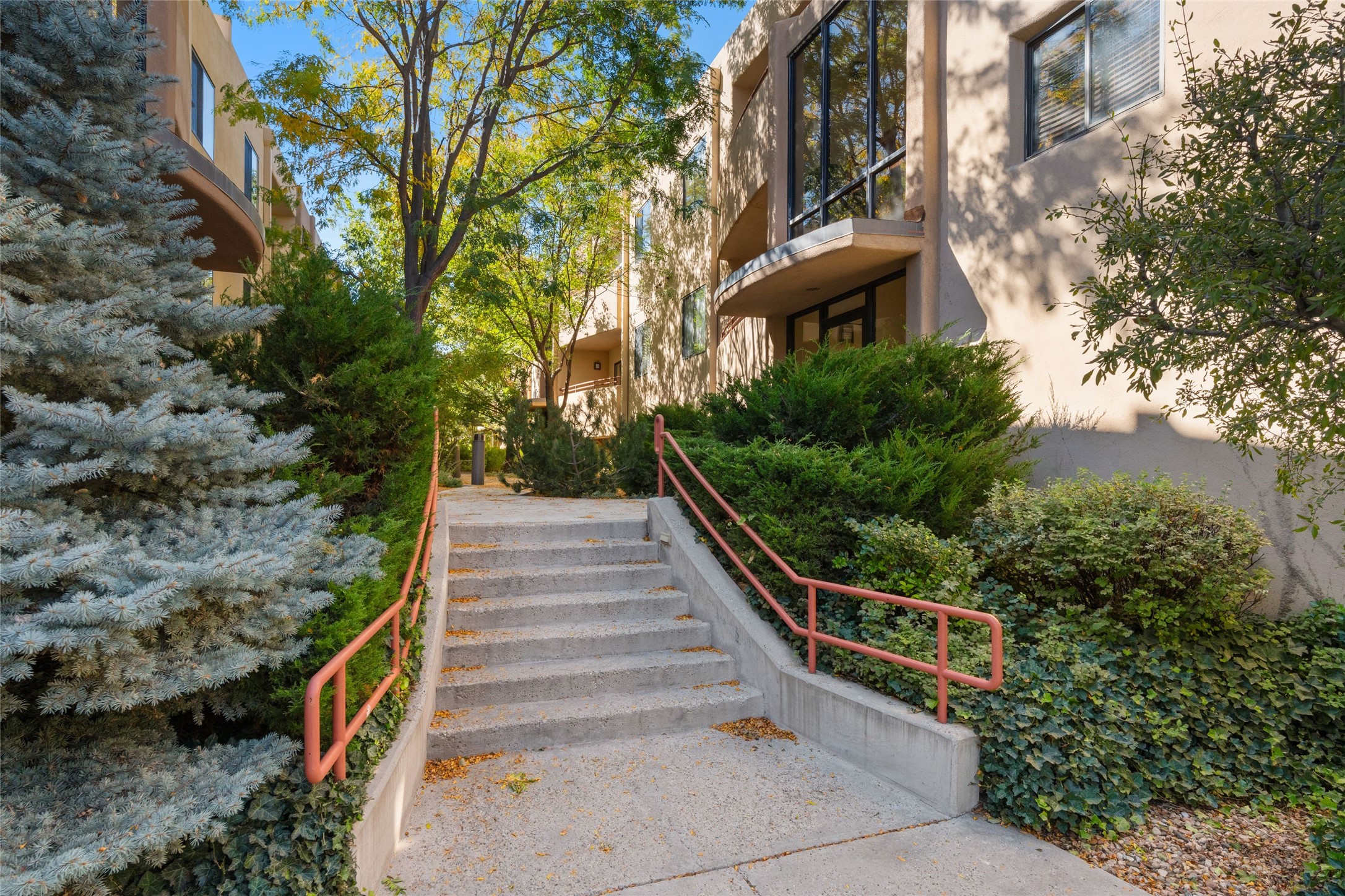 Classic urban oasis surrounded by mature trees, La Remuda Condominium is located on the edge of Midtown where you can walk to relaxed eateries featuring global cuisine and local flair. Not far from theRailyard, quick stops to Trader Joe's and Whole Foods. The central location is convenientfor a fast commute to Los Alamos or I-25. This bright and airy condo features an open floor plan with sliding glass doors at each end of the living/dining rooms with access to the 2 balconies. The kitchen is well designed, with exceptional storage, high quality stainless steel appliances, butcher block on one side of the counter and Italian tile on the other. Other features include: central air conditioning and heating installed in 2023, 9 foot ceilings, beautiful bamboo floors, custom drapes, custom dividedclosets, custom cabinets in living room and office, private storage: 5.5' x 17', Asko washer and dryer, whole house water filtration system installed in 2025, 2 under cover designated parking spots with direct entrance to the secure building, upper floor unit with no interior steps, new roof in 2024 and refreshed stucco in 2025. One of the two only units at La Remuda with 3 bedrooms. This condo is on the second floor and stairs are required to access it.