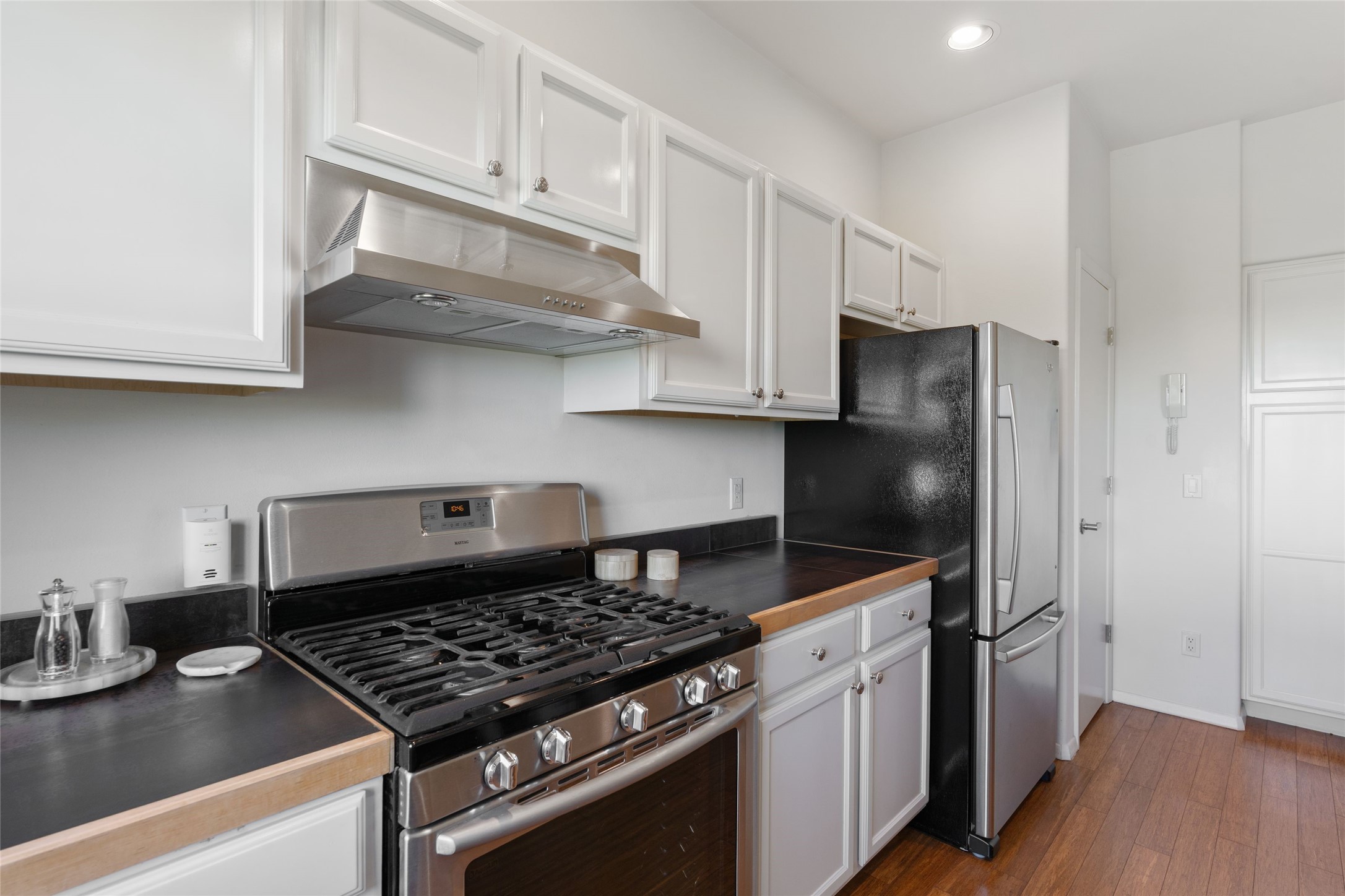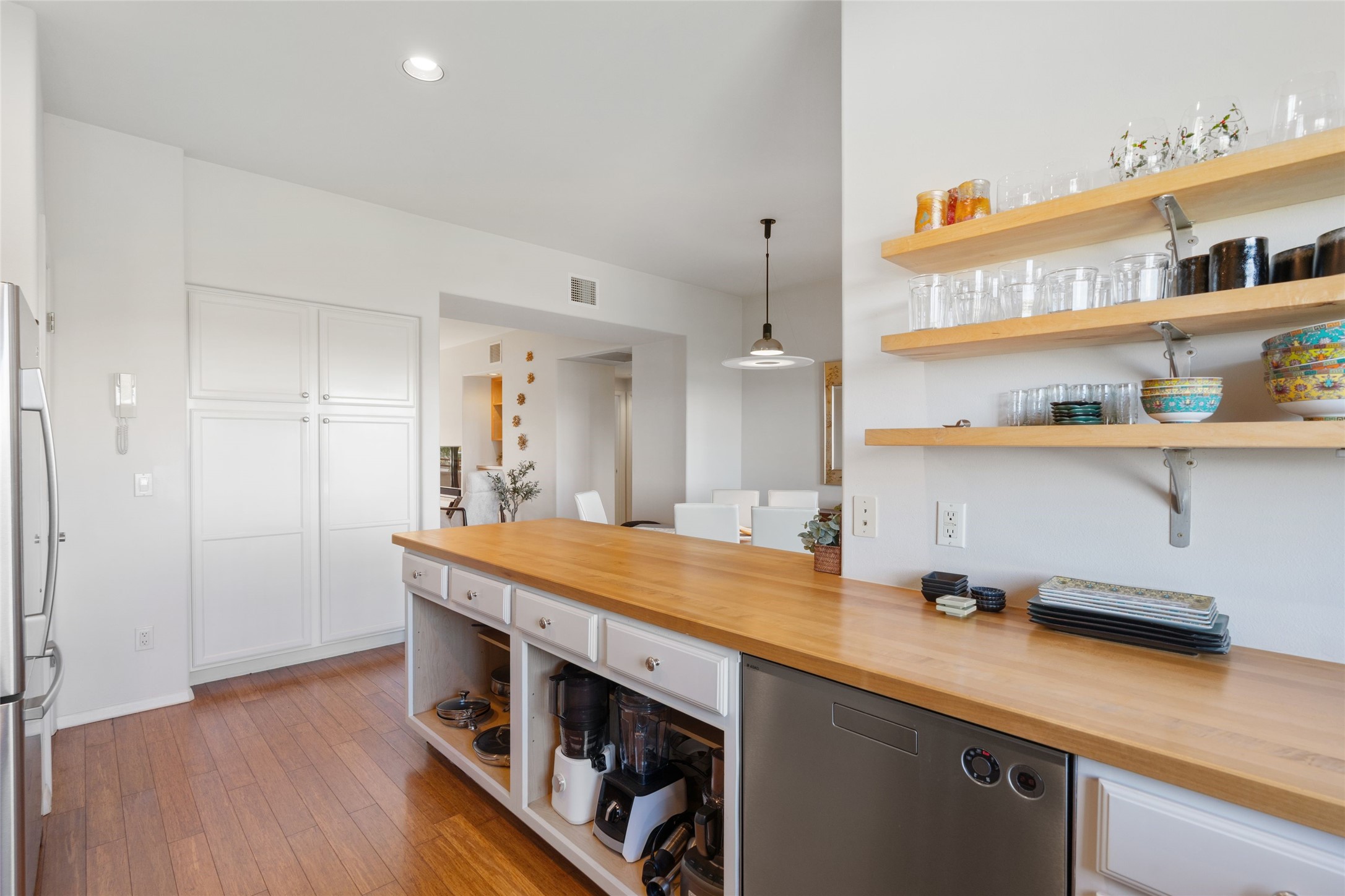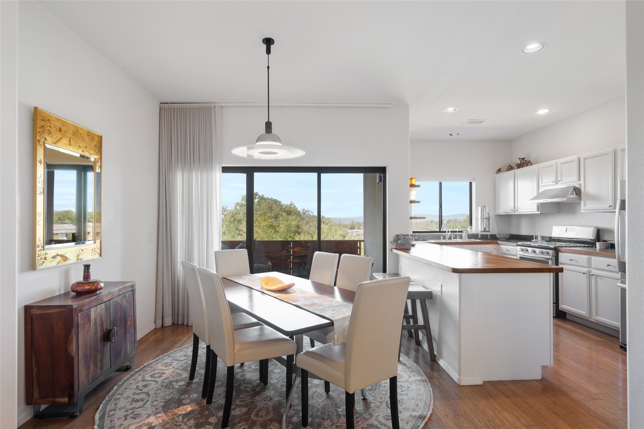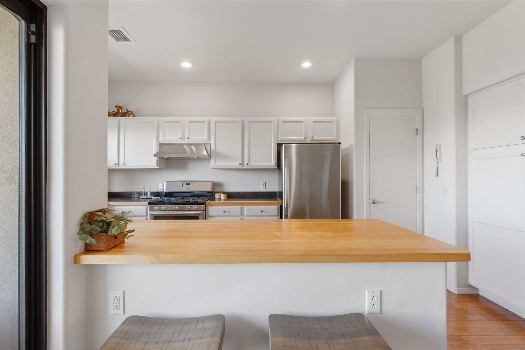 Classic urban oasis surrounded by mature trees, La Remuda Condominium is located on the edge of Midtown where you can walk to relaxed eateries featuring global cuisine and local flair. Not far from theRailyard, quick stops to Trader Joe's and Whole Foods. The central location is convenientfor a fast commute to Los Alamos or I-25. This bright and airy condo features an open floor plan with sliding glass doors at each end of the living/dining rooms with access to the 2 balconies. The kitchen is well designed, with exceptional storage, high quality stainless steel appliances, butcher block on one side of the counter and Italian tile on the other. Other features include: central air conditioning and heating installed in 2023, 9 foot ceilings, beautiful bamboo floors, custom drapes, custom dividedclosets, custom cabinets in living room and office, private storage: 5.5' x 17', Asko washer and dryer, whole house water filtration system installed in 2025, 2 under cover designated parking spots with direct entrance to the secure building, upper floor unit with no interior steps, new roof in 2024 and refreshed stucco in 2025. One of the two only units at La Remuda with 3 bedrooms. This condo is on the second floor and stairs are required to access it.
