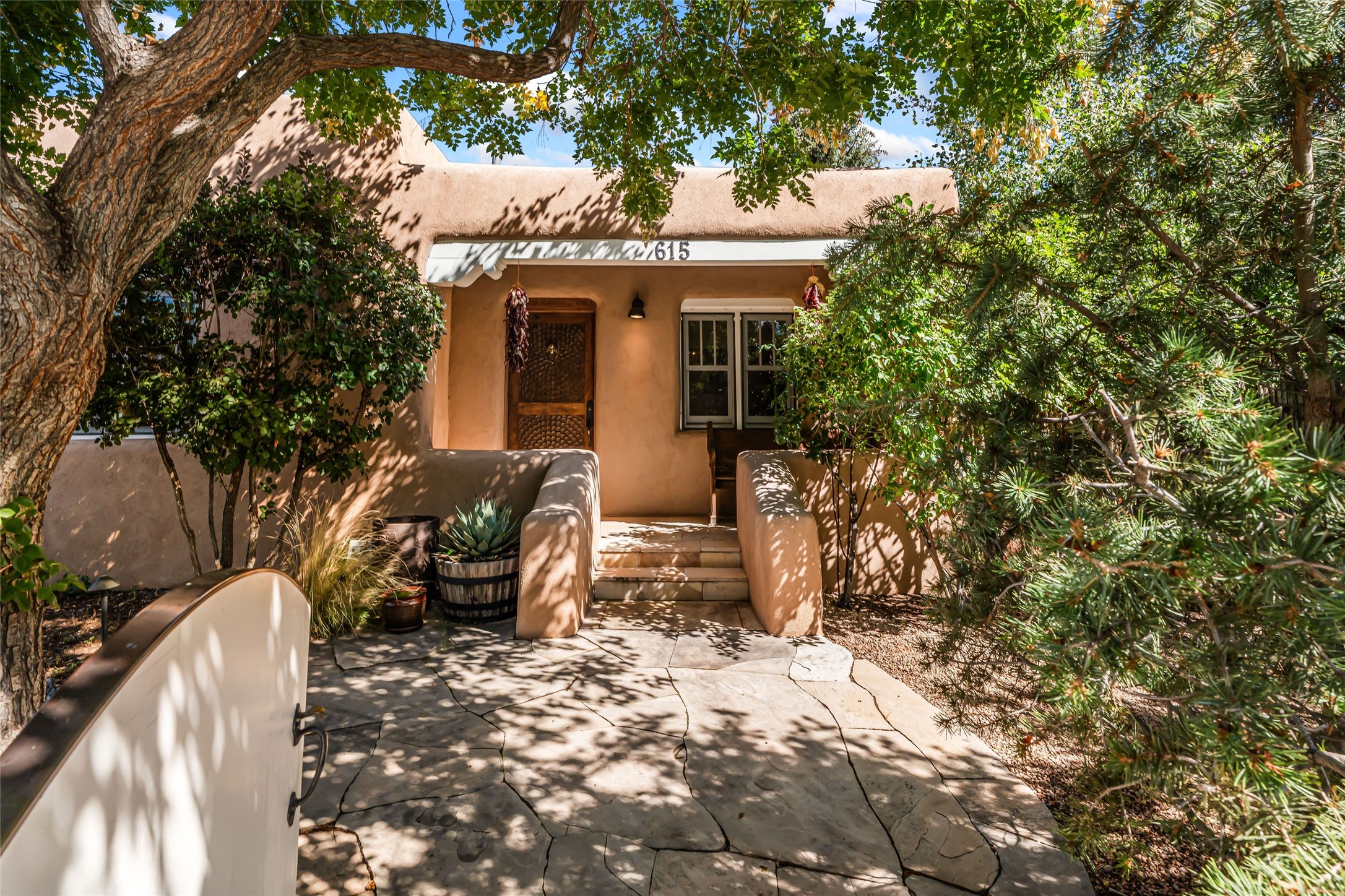 A rare Santa Fe gem - this adobe sanctuary on an oversized lot offers seamless indoor-outdoor living with a fully fenced wraparound yard. Stacked stone walls, wooden gates, a grapevine-covered arbor, and fragrant landscaped gardens create a serene setting where every window frames natural beauty. Inside, renovations preserve authentic adobe character while introducing a fresh, contemporary feel. Skylights brighten the kitchen, and the spacious great room with French doors to the courtyard is ideal for entertaining. The floor plan includes two bedrooms, a full bath, powder room, large laundry room, and a flexible study or dressing room off the primary suite. A private downstairs space provides additional storage or the opportunity for a refinished retreat. Nestled at the heart of the Railyard District, just blocks from Joseph's Pub, Mille, Dolina, Paloma, and minutes to the Plaza, this calming home combines timeless Santa Fe charm with modern updates and unbeatable location.