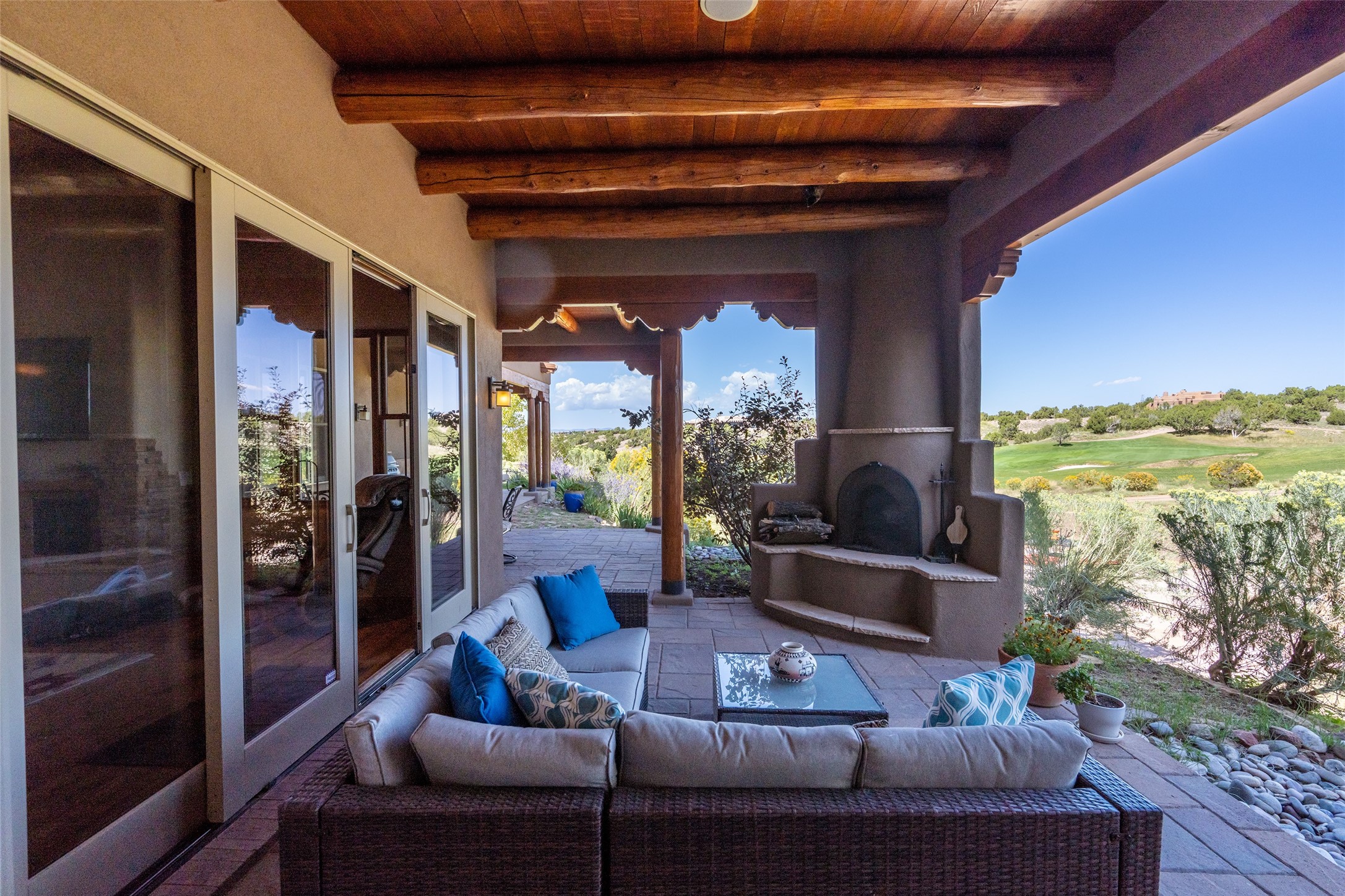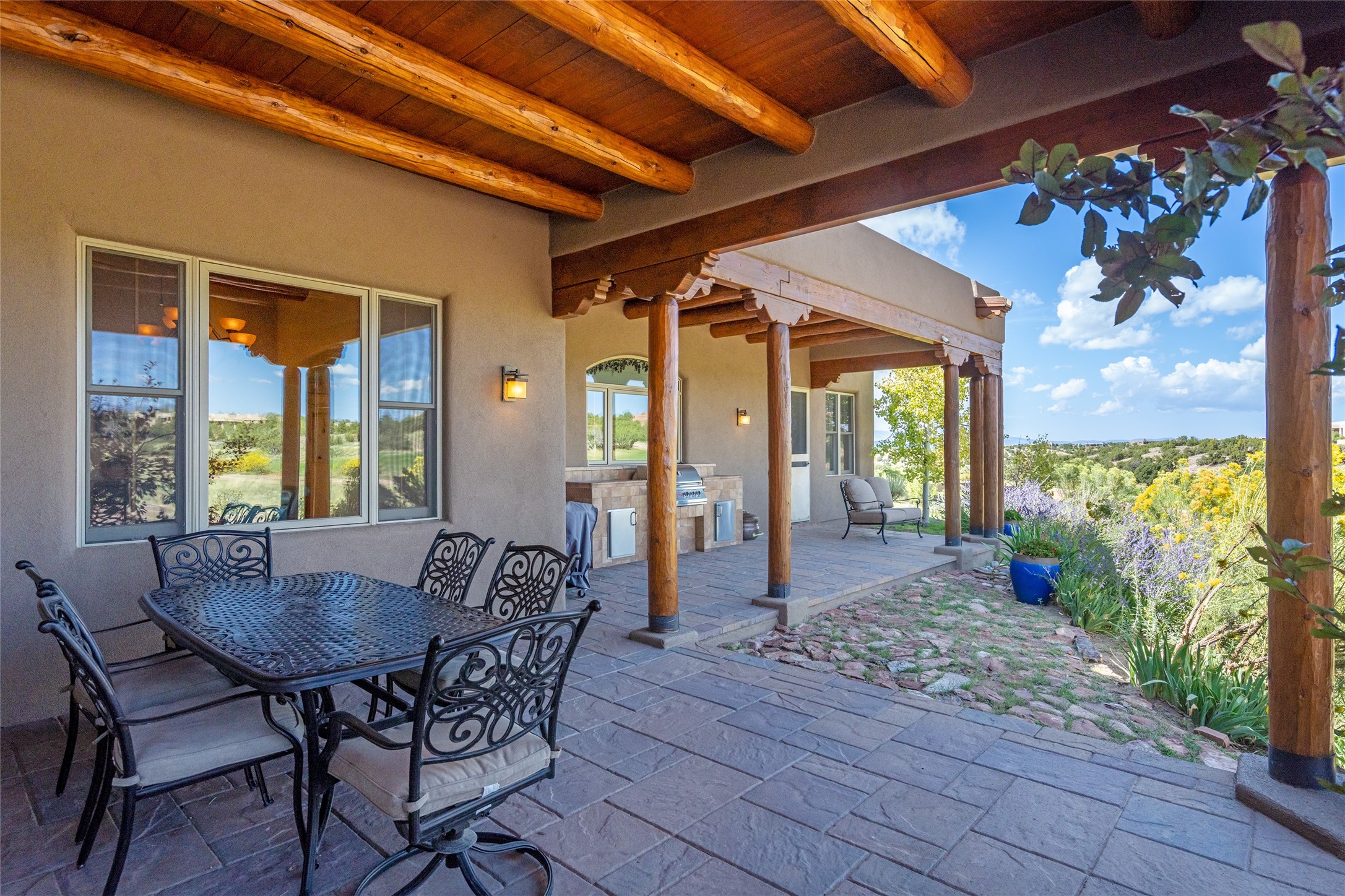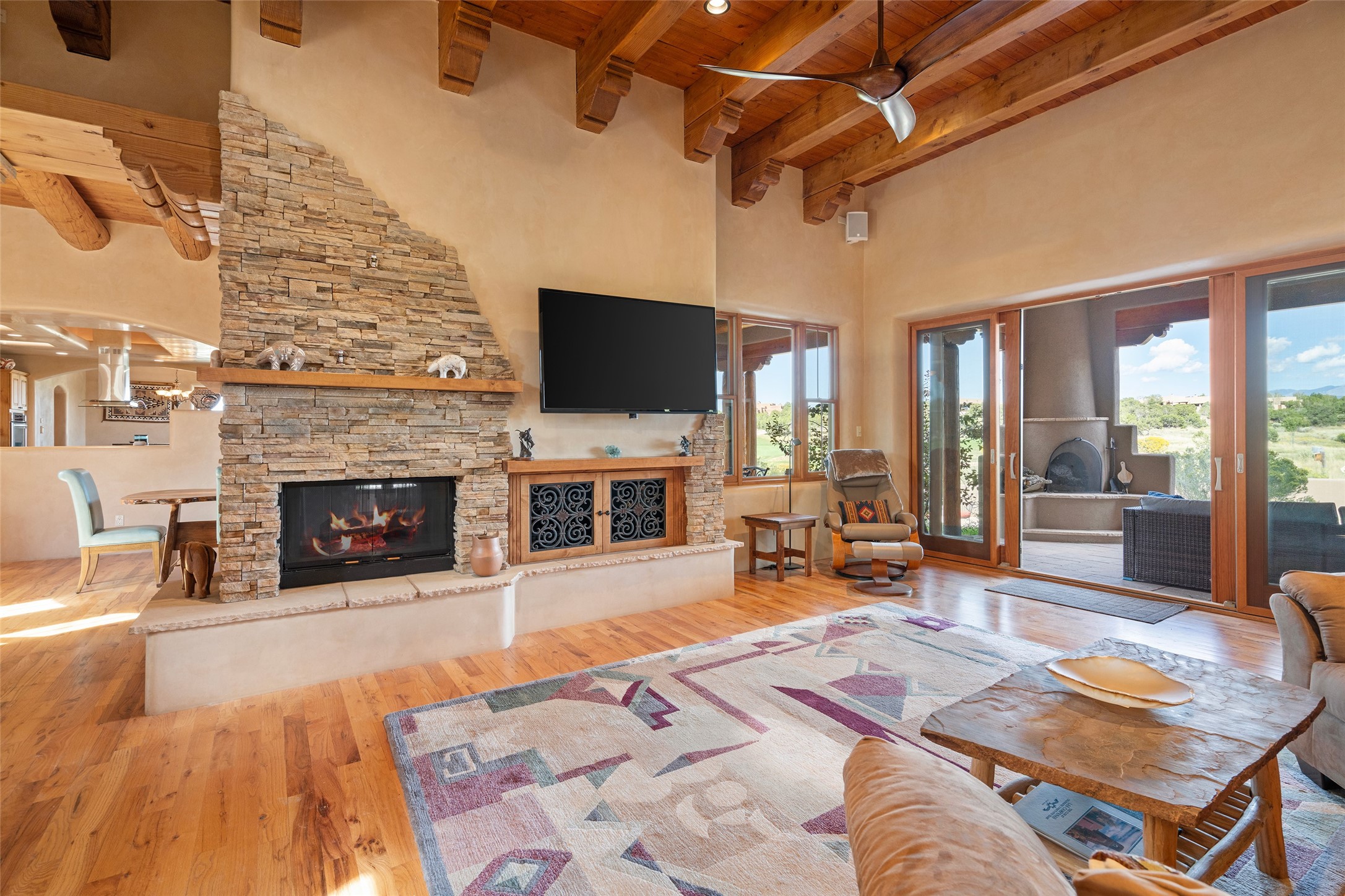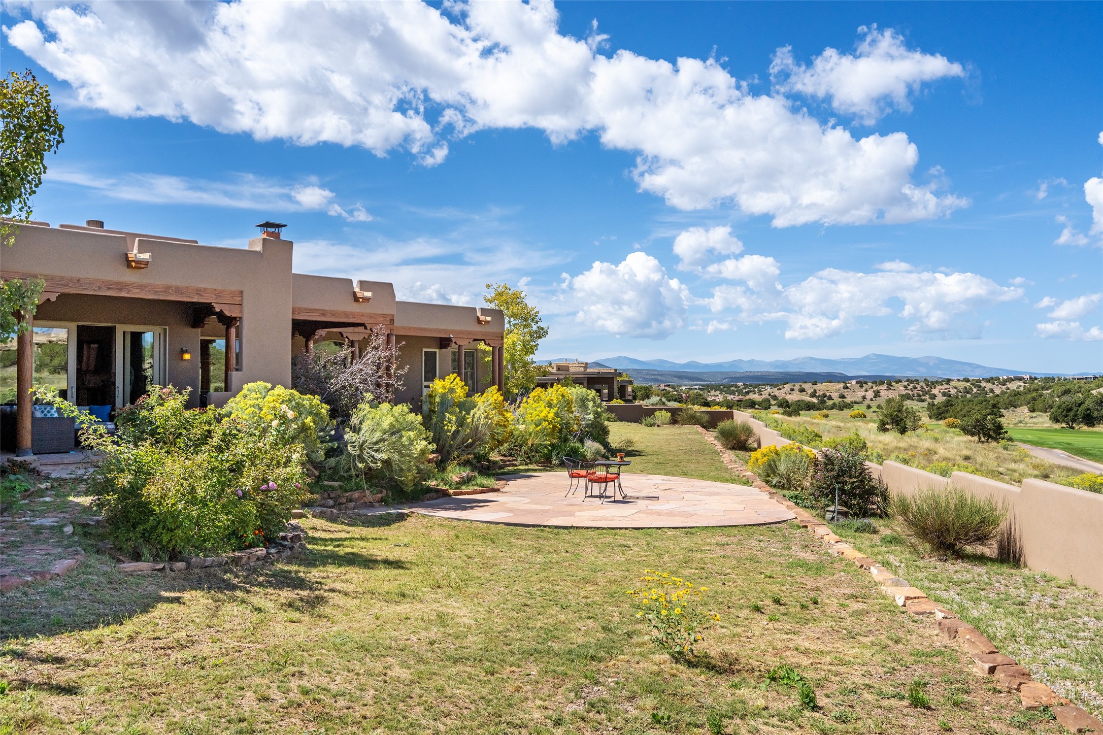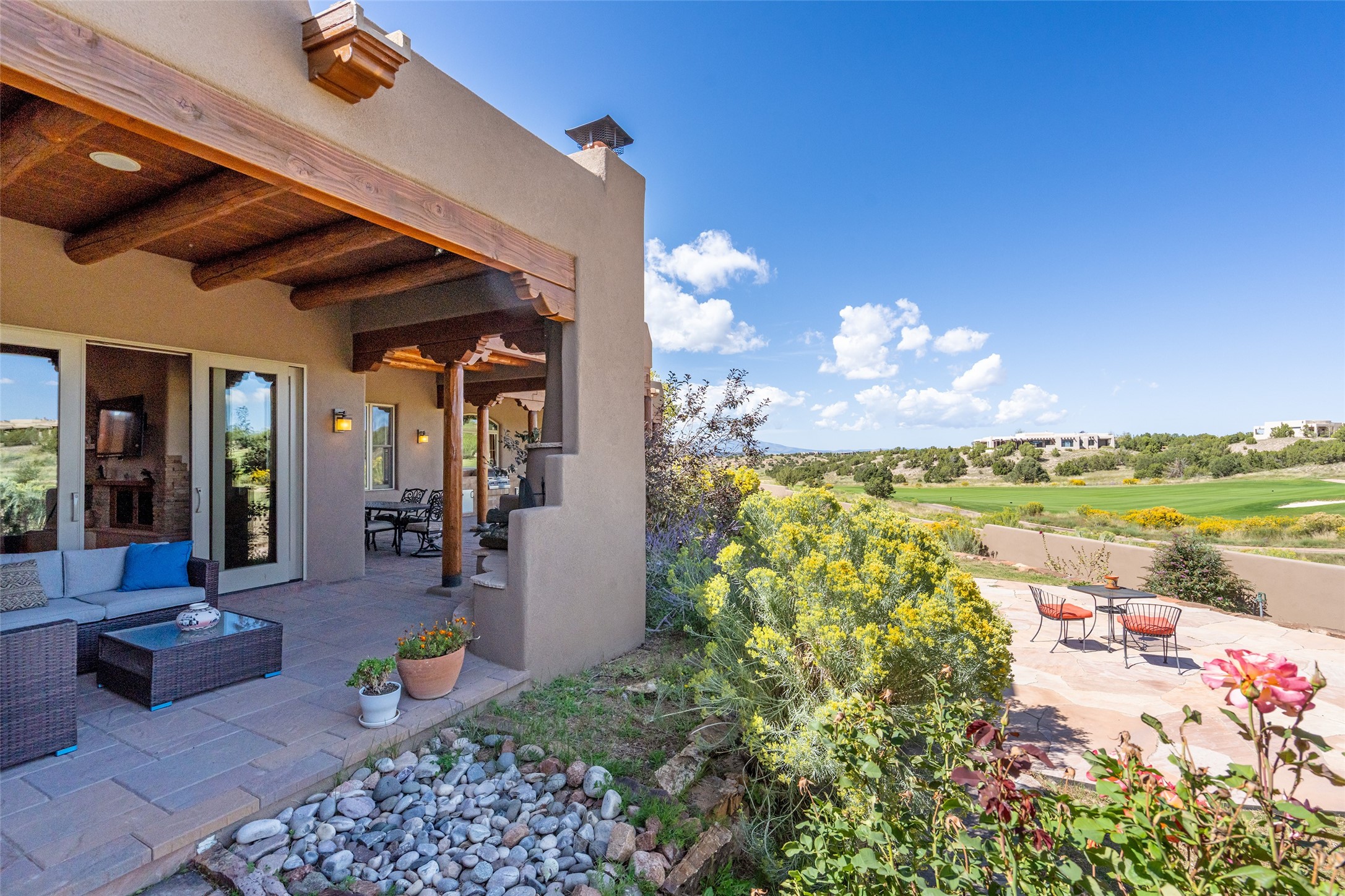 The Grand Trifecta of Santa Fe Living!! This exceptional Las Campanas residence delivers the ultimate blend of golf course living, panoramic mountain vistas, and timeless Santa Fe design. Perfectly sited on a quiet cul-de-sac overlooking the 8th hole of the Sunset Golf Course, the home showcases sweeping views of both the Sangre de Cristo and Jemez mountain ranges--truly some of the finest in Santa Fe. From the hand-laid stone driveway to the beautifully landscaped entry, the curb appeal sets the tone for what awaits inside. Rich Santa Fe character abounds with richly hued, hand-troweled plaster walls, an Anasazi stacked stone dual-sided fireplace, magnificent ceiling treatments including massive beams, vigas and wood ceilings, beautifully carved corbels, and elegant recessed ceiling details. Flagstone accents and custom craftsmanship flow seamlessly throughout. The thoughtfully designed floor plan encompasses three spacious ensuite bedrooms, each distinctly private. The primary suite is a retreat of its own, complete with a spa-like bath featuring dual vanities, a soaking tub, and French doors leading to the expansive portals. At the heart of the home, the chef's kitchen combines modern function with rustic warmth--offering custom cabinetry, granite counters, professional-grade appliances, a center island with five-burner cooktop, and a large pantry. The adjacent dining area captures both views and intimacy, anchored by the stone-trimmed two-sided fireplace. Outdoor living is elevated with a wrap-around portal, built-in grill, and unobstructed vistas of the golf course and surrounding mountains. From sunrise over the Sangres to sunsets over the Jemez, every moment here is a masterpiece. Whether as a perfect lock-and-leave getaway or a full-time residence, this rare offering blends masterful design, luxury, and location--Santa Fe living at its very best.