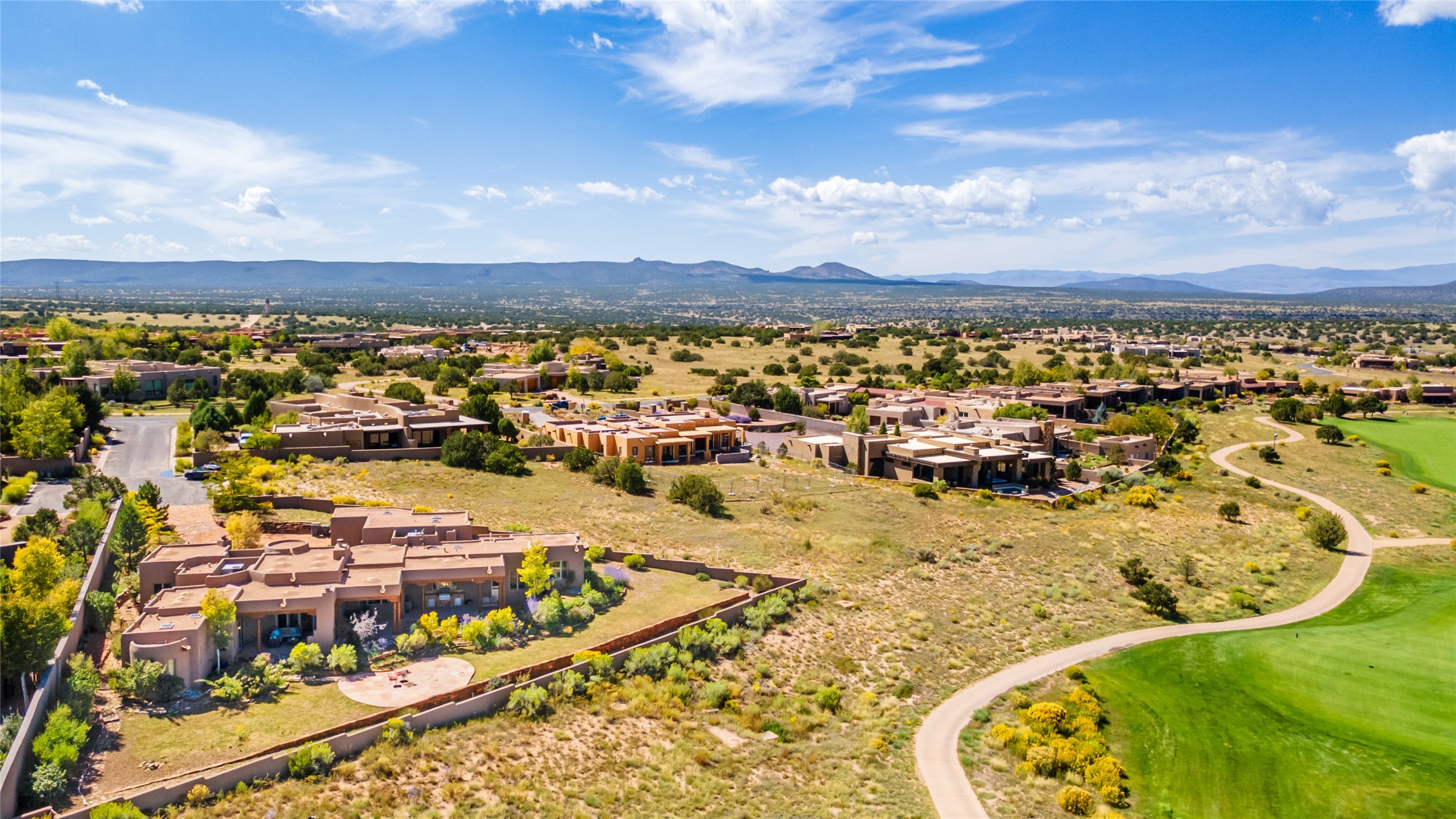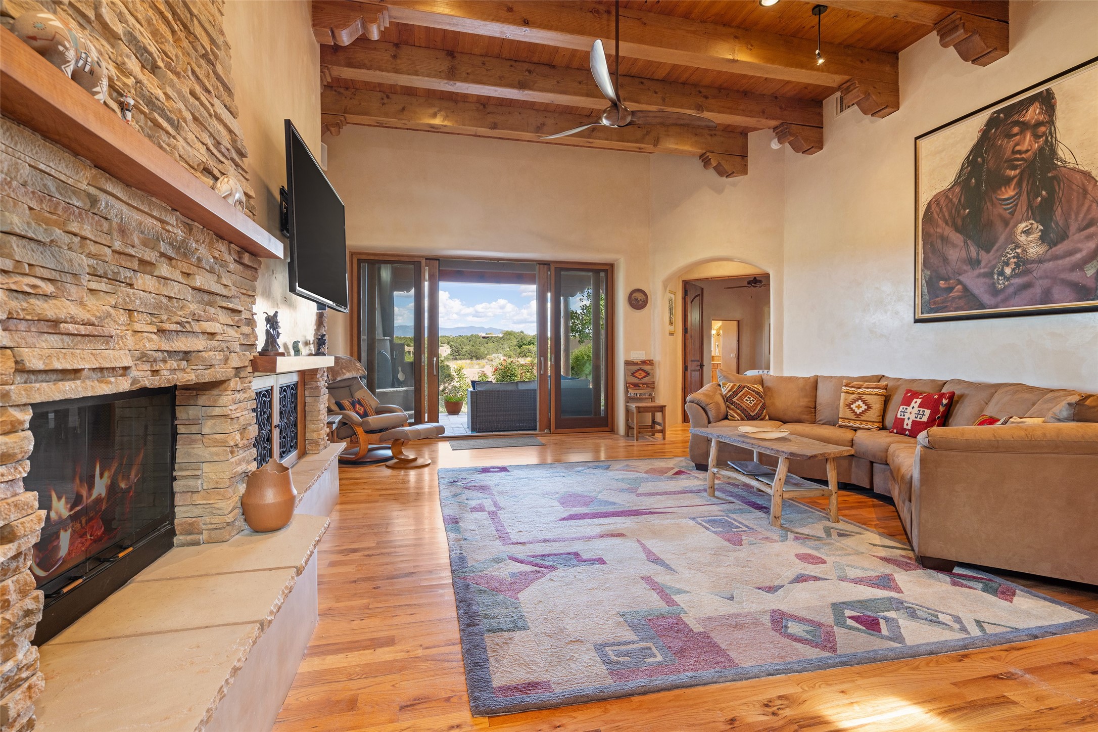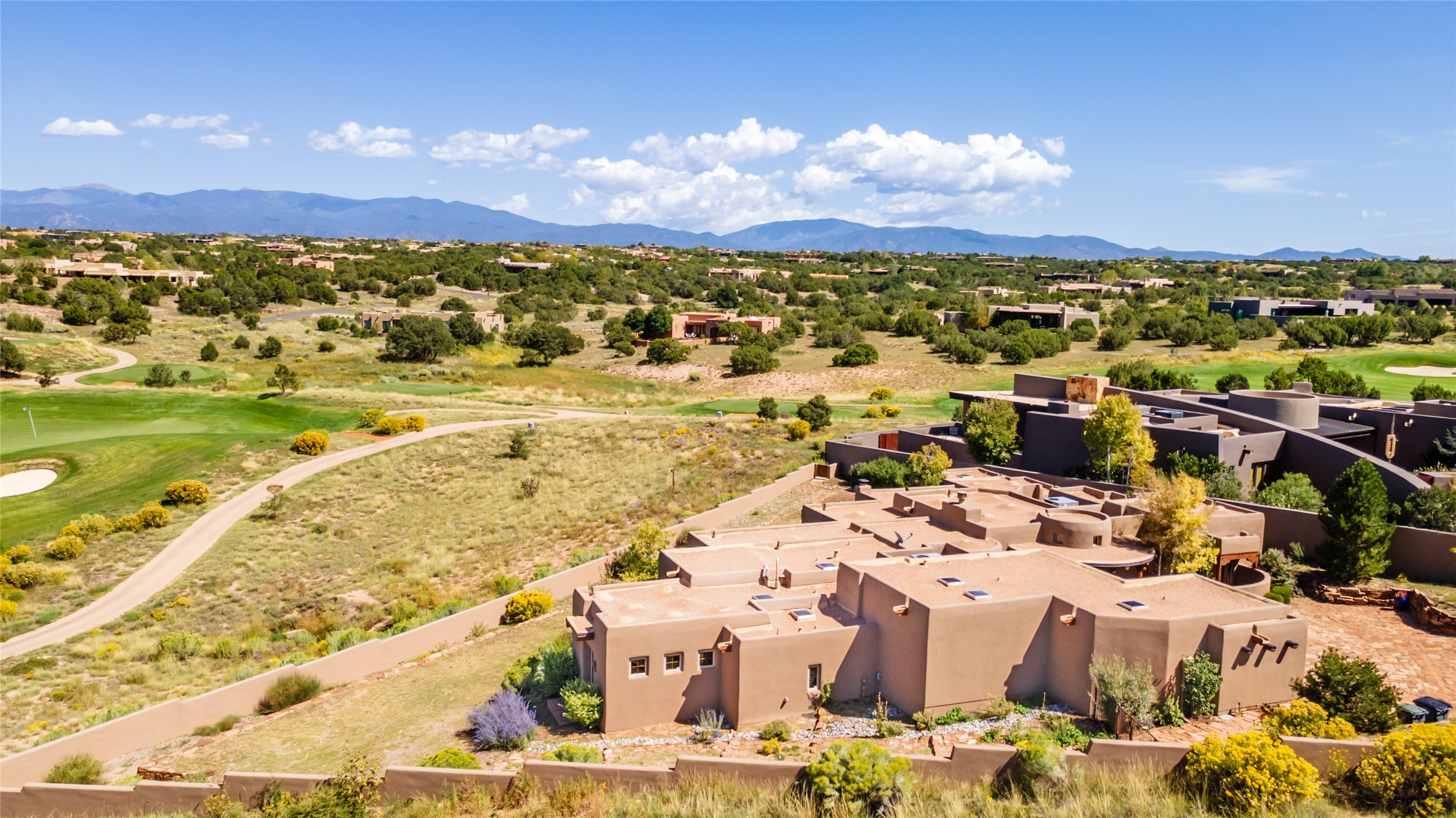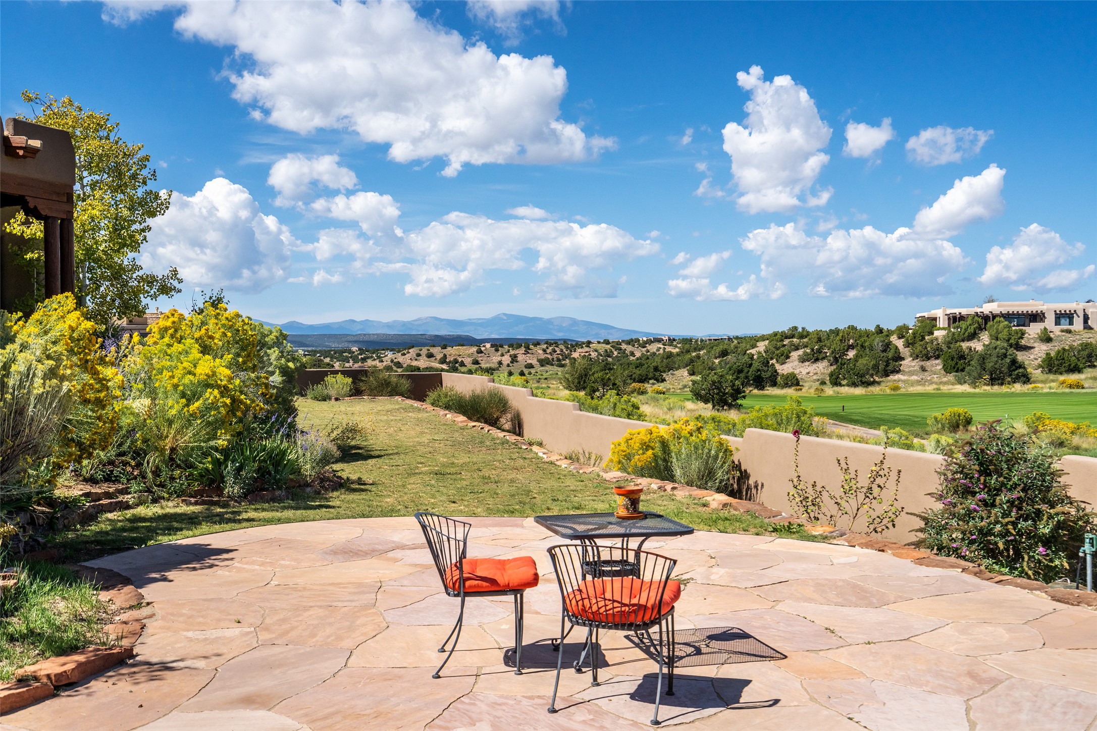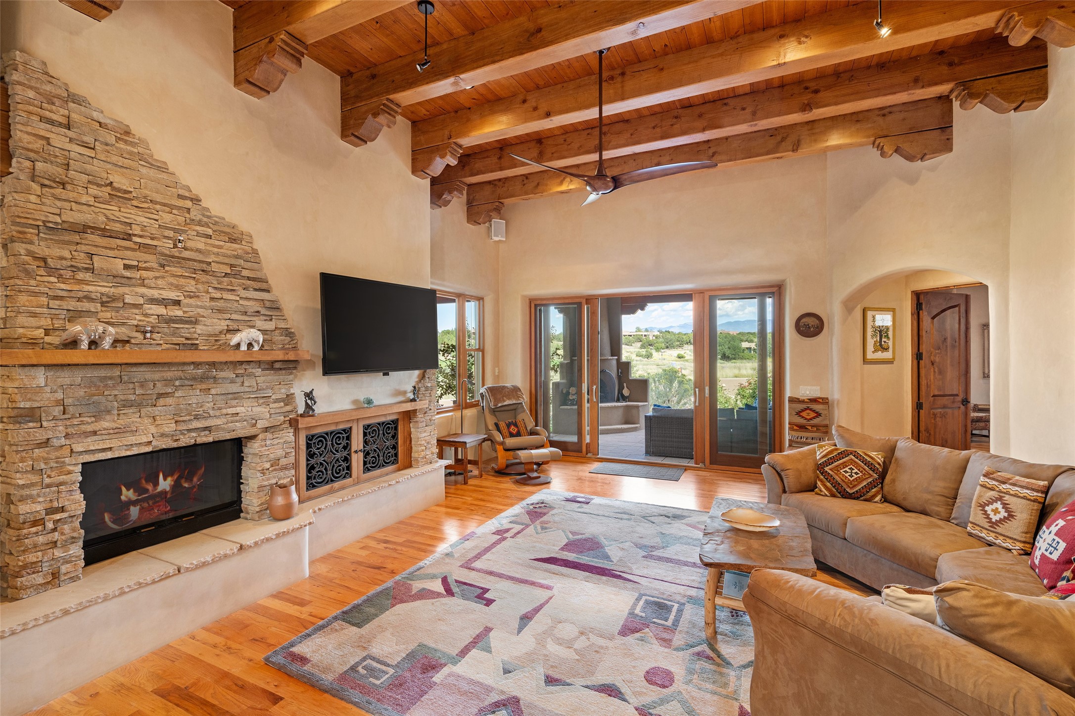 The Grand Trifecta of Santa Fe Living!! This exceptional Las Campanas residence delivers the ultimate blend of golf course living, panoramic mountain vistas, and timeless Santa Fe design. Perfectly sited on a quiet cul-de-sac overlooking the 8th hole of the Sunset Golf Course, the home showcases sweeping views of both the Sangre de Cristo and Jemez mountain ranges--truly some of the finest in Santa Fe. From the hand-laid stone driveway to the beautifully landscaped entry, the curb appeal sets the tone for what awaits inside. Rich Santa Fe character abounds with richly hued, hand-troweled plaster walls, an Anasazi stacked stone dual-sided fireplace, magnificent ceiling treatments including massive beams, vigas and wood ceilings, beautifully carved corbels, and elegant recessed ceiling details. Flagstone accents and custom craftsmanship flow seamlessly throughout. The thoughtfully designed floor plan encompasses three spacious ensuite bedrooms, each distinctly private. The primary suite is a retreat of its own, complete with a spa-like bath featuring dual vanities, a soaking tub, and French doors leading to the expansive portals. At the heart of the home, the chef's kitchen combines modern function with rustic warmth--offering custom cabinetry, granite counters, professional-grade appliances, a center island with five-burner cooktop, and a large pantry. The adjacent dining area captures both views and intimacy, anchored by the stone-trimmed two-sided fireplace. Outdoor living is elevated with a wrap-around portal, built-in grill, and unobstructed vistas of the golf course and surrounding mountains. From sunrise over the Sangres to sunsets over the Jemez, every moment here is a masterpiece. Whether as a perfect lock-and-leave getaway or a full-time residence, this rare offering blends masterful design, luxury, and location--Santa Fe living at its very best.