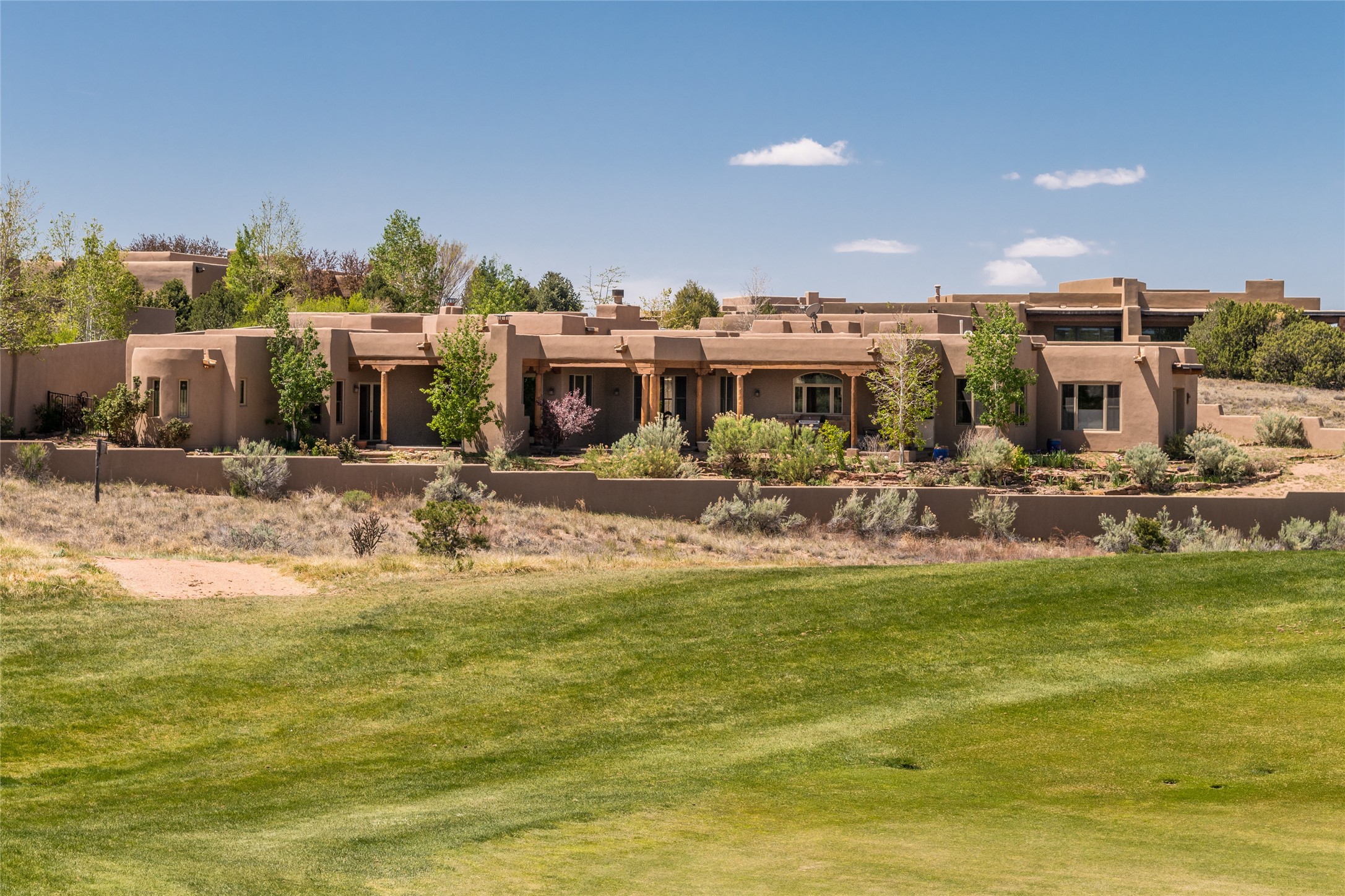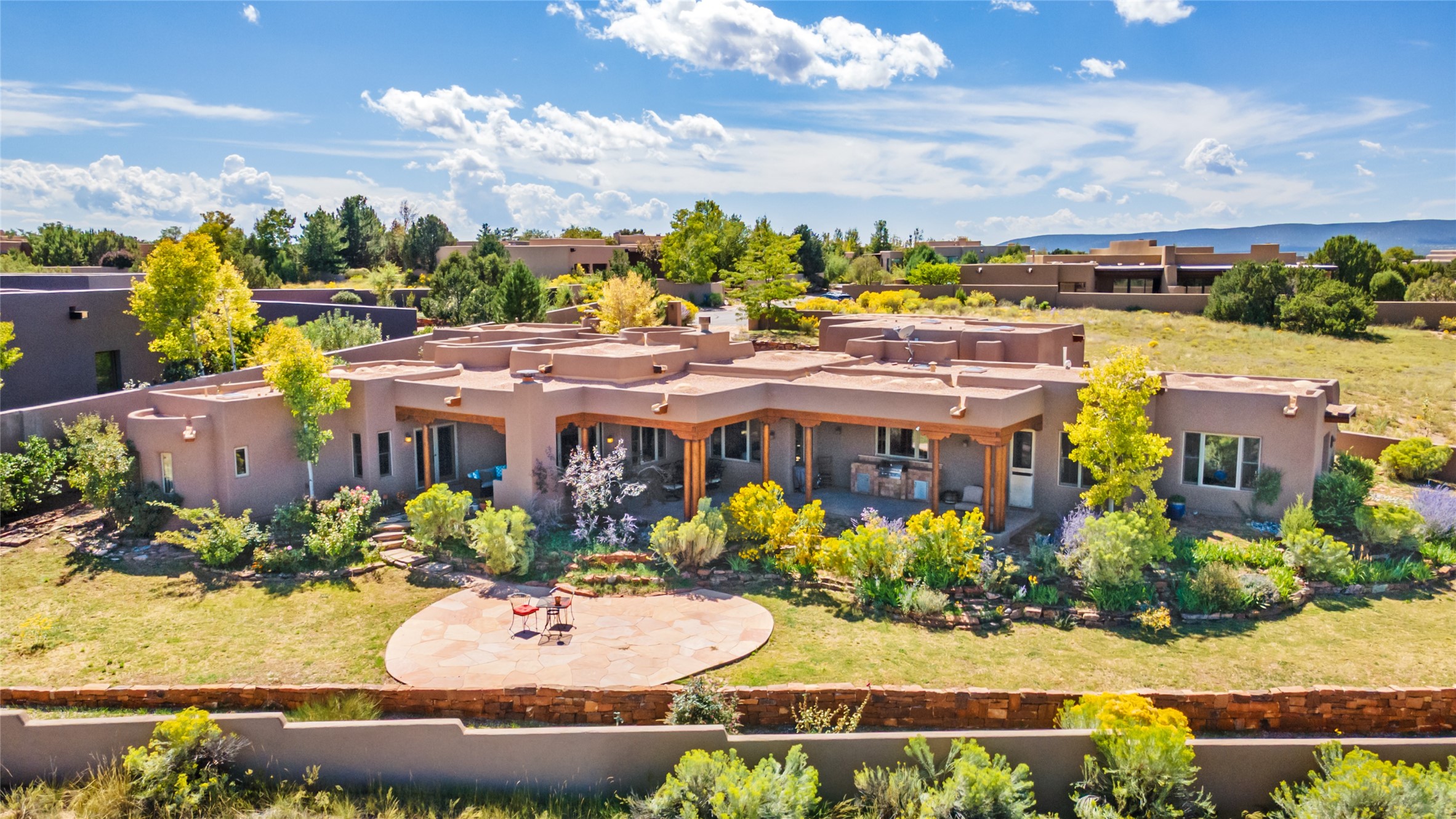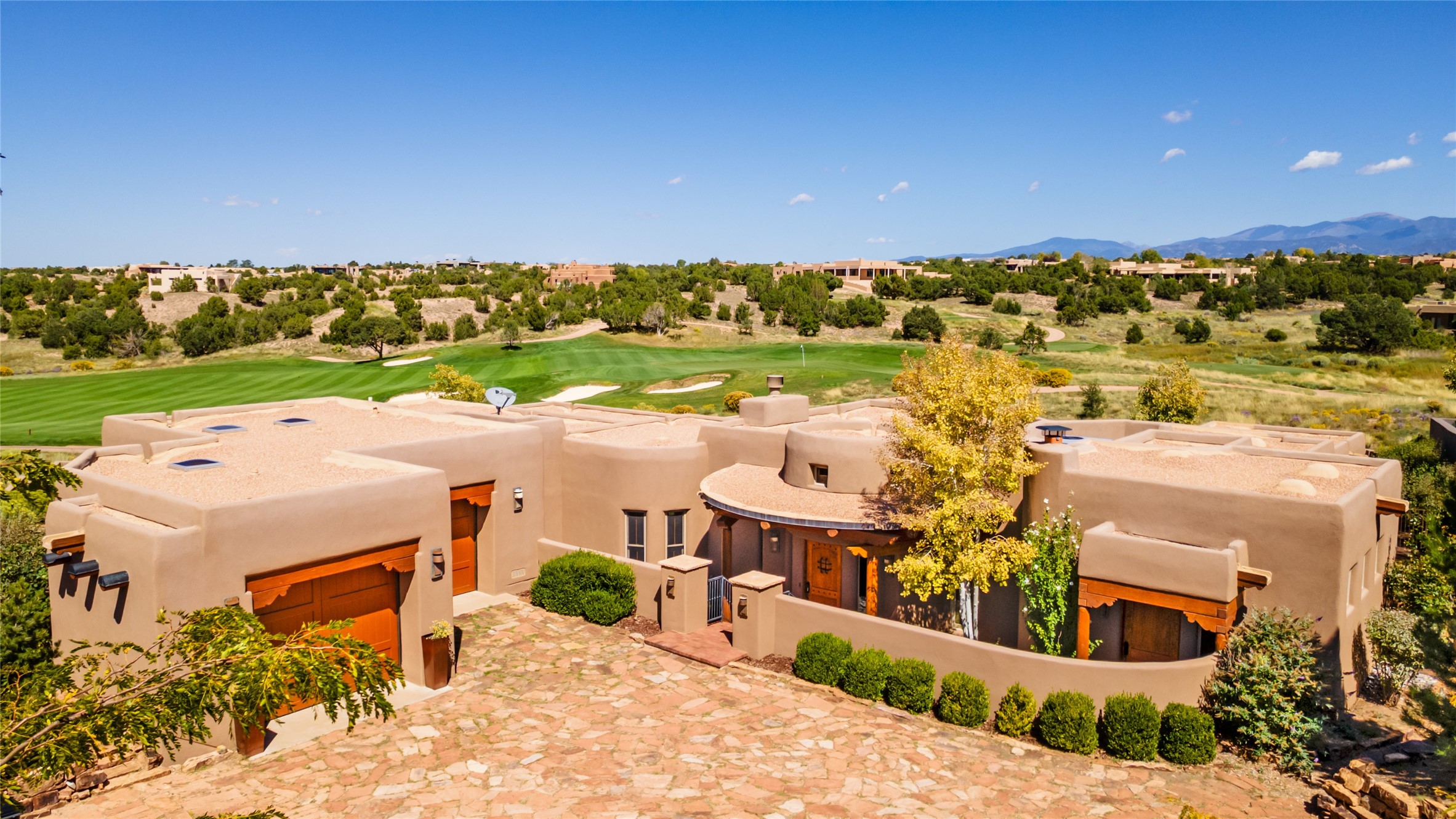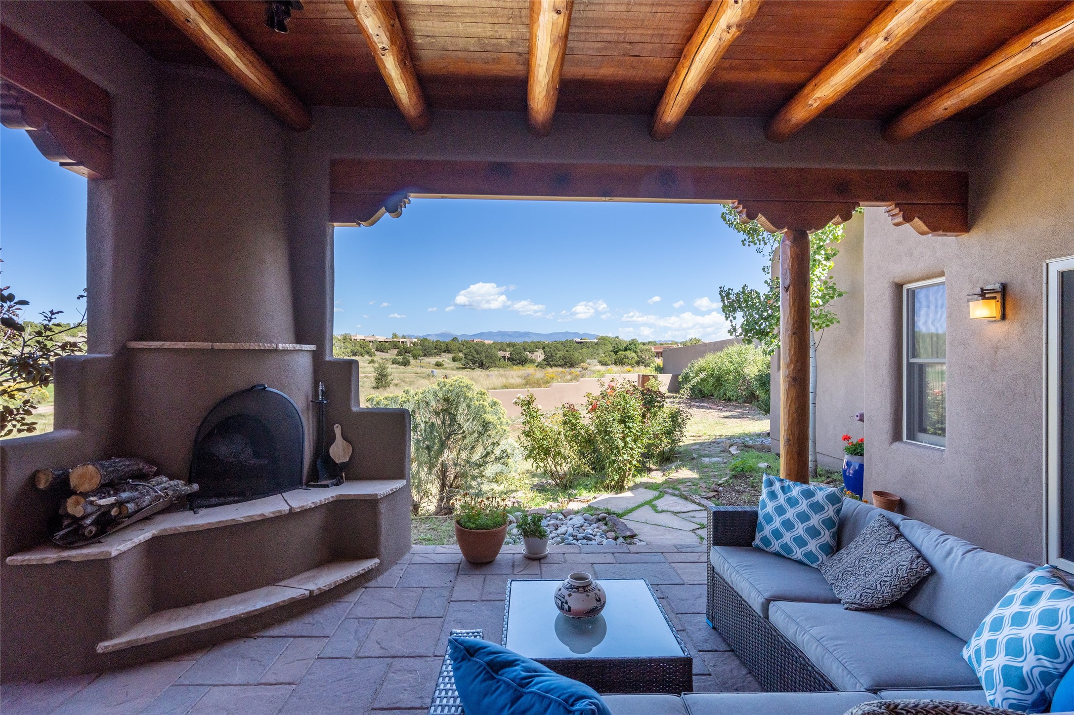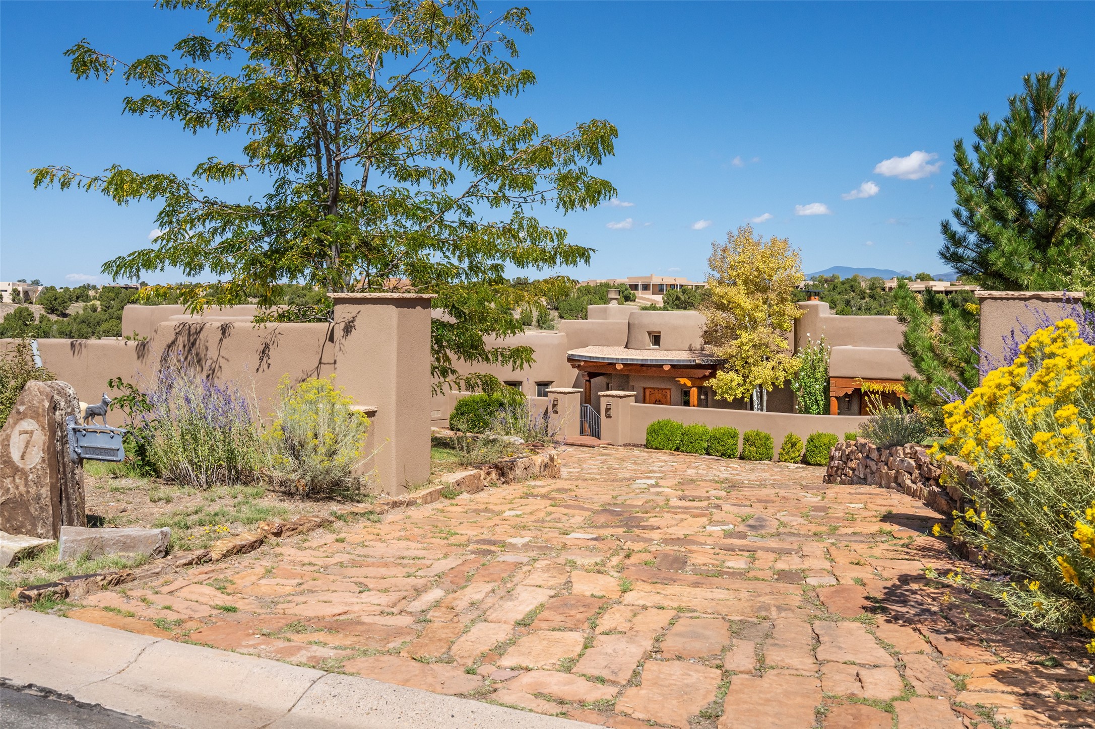 The Grand Trifecta of Santa Fe Living!! This exceptional Las Campanas residence delivers the ultimate blend of golf course living, panoramic mountain vistas, and timeless Santa Fe design. Perfectly sited on a quiet cul-de-sac overlooking the 8th hole of the Sunset Golf Course, the home showcases sweeping views of both the Sangre de Cristo and Jemez mountain ranges--truly some of the finest in Santa Fe. From the hand-laid stone driveway to the beautifully landscaped entry, the curb appeal sets the tone for what awaits inside. Rich Santa Fe character abounds with richly hued, hand-troweled plaster walls, an Anasazi stacked stone dual-sided fireplace, magnificent ceiling treatments including massive beams, vigas and wood ceilings, beautifully carved corbels, and elegant recessed ceiling details. Flagstone accents and custom craftsmanship flow seamlessly throughout. The thoughtfully designed floor plan encompasses three spacious ensuite bedrooms, each distinctly private. The primary suite is a retreat of its own, complete with a spa-like bath featuring dual vanities, a soaking tub, and French doors leading to the expansive portals. At the heart of the home, the chef's kitchen combines modern function with rustic warmth--offering custom cabinetry, granite counters, professional-grade appliances, a center island with five-burner cooktop, and a large pantry. The adjacent dining area captures both views and intimacy, anchored by the stone-trimmed two-sided fireplace. Outdoor living is elevated with a wrap-around portal, built-in grill, and unobstructed vistas of the golf course and surrounding mountains. From sunrise over the Sangres to sunsets over the Jemez, every moment here is a masterpiece. Whether as a perfect lock-and-leave getaway or a full-time residence, this rare offering blends masterful design, luxury, and location--Santa Fe living at its very best.