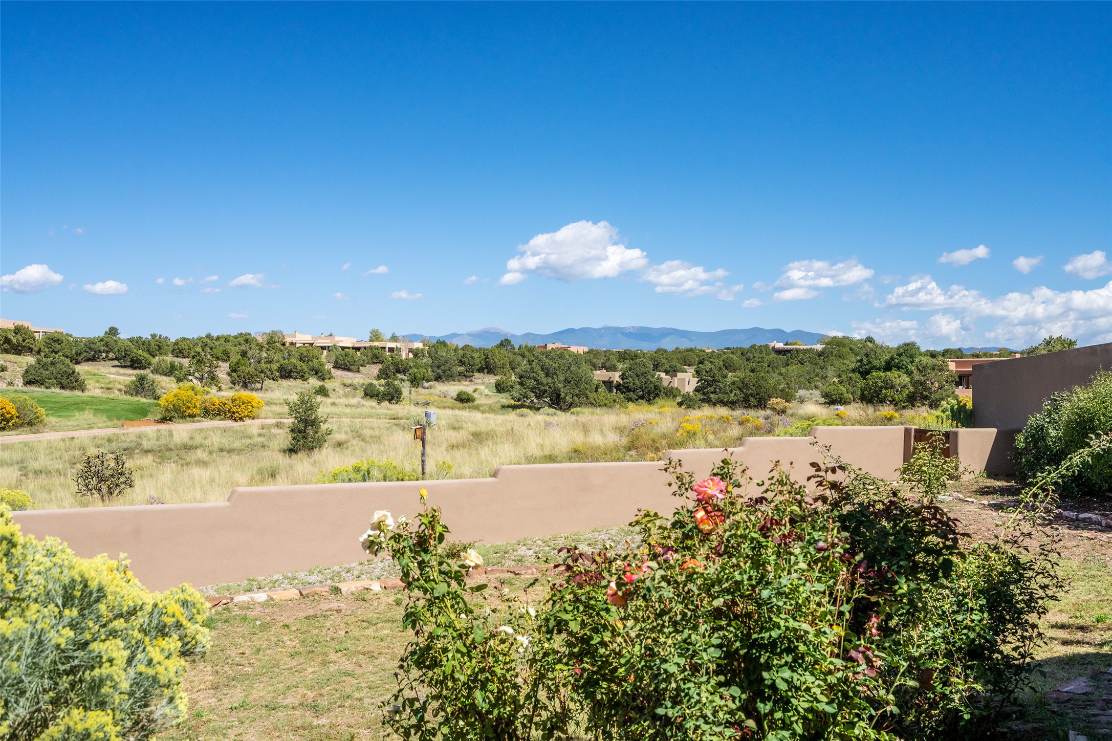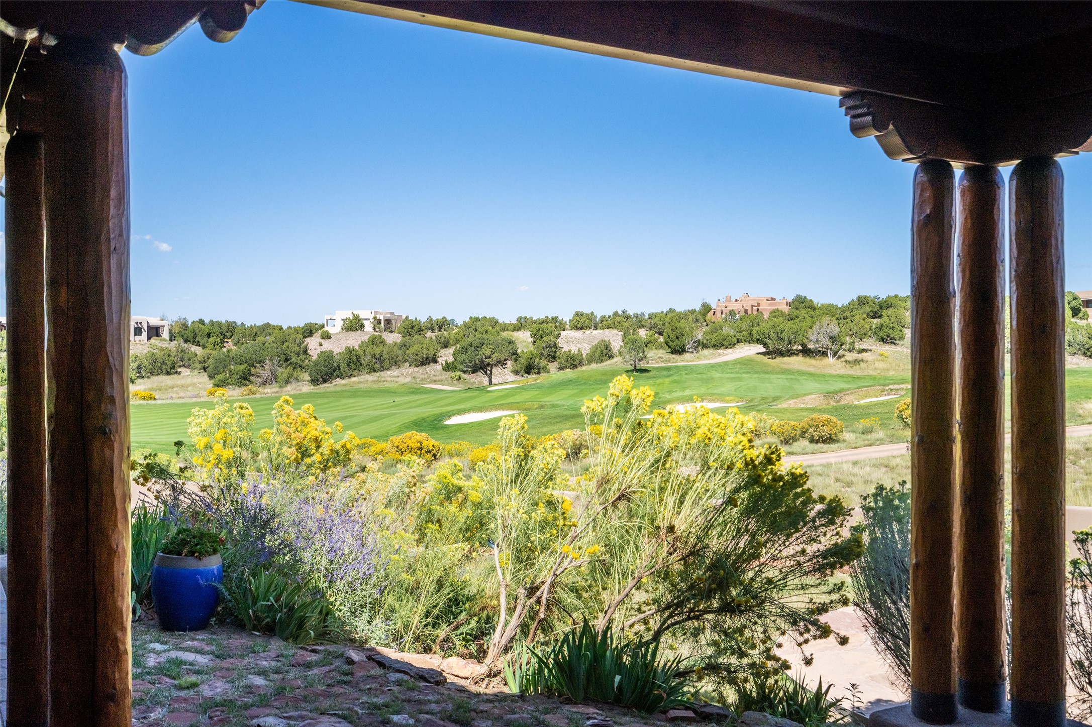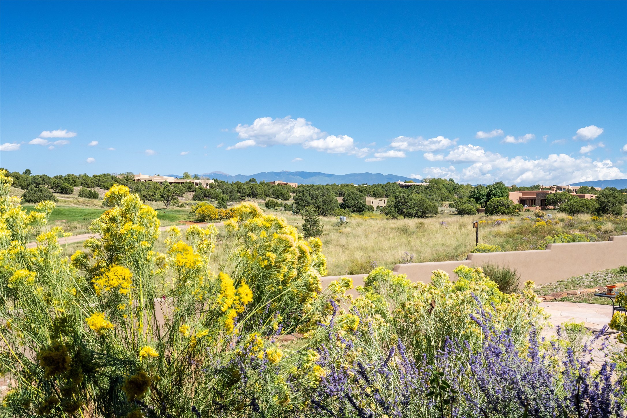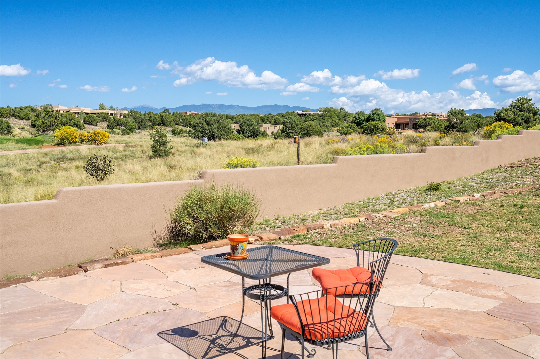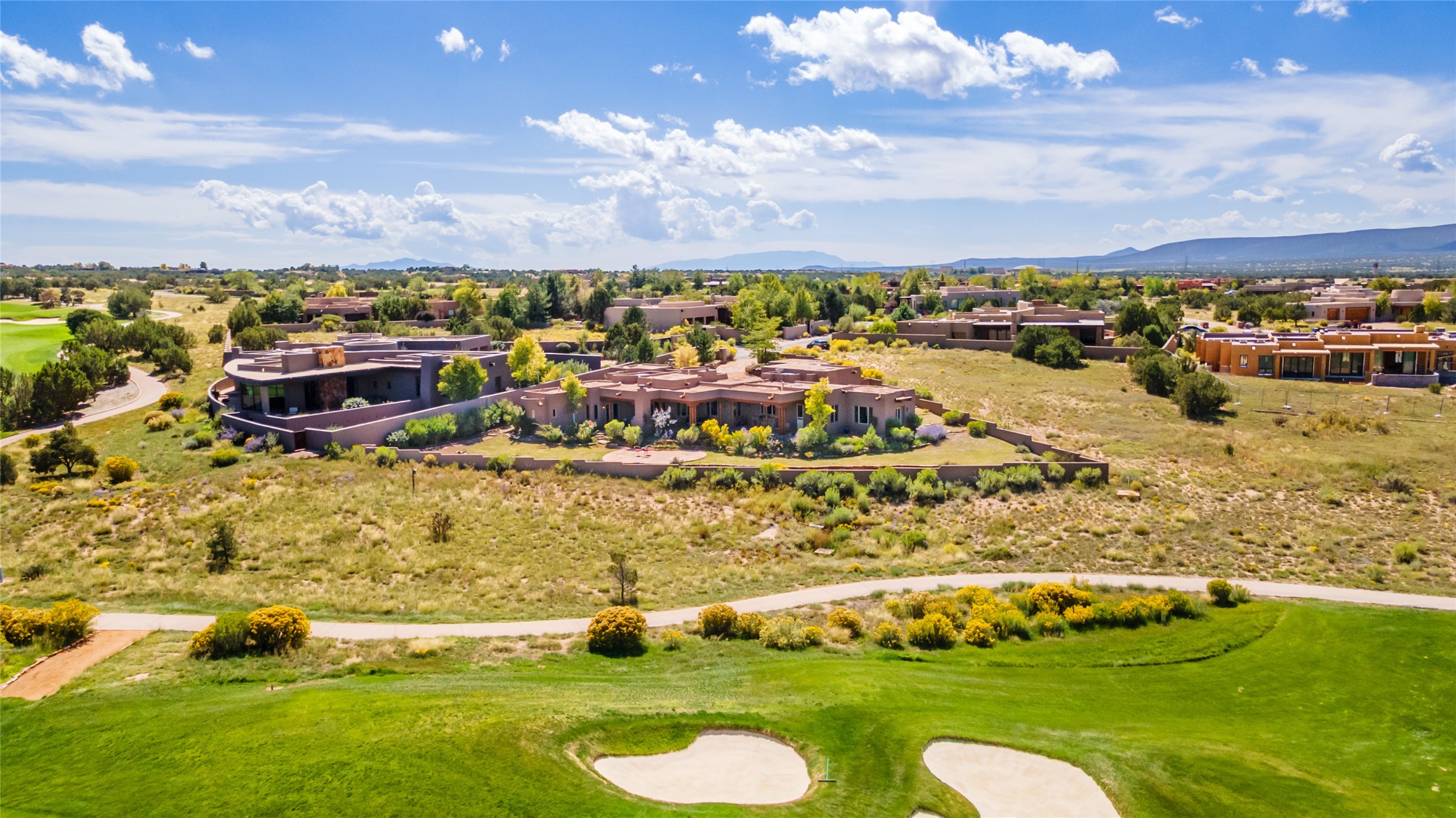 The Grand Trifecta of Santa Fe Living!! This exceptional Las Campanas residence delivers the ultimate blend of golf course living, panoramic mountain vistas, and timeless Santa Fe design. Perfectly sited on a quiet cul-de-sac overlooking the 8th hole of the Sunset Golf Course, the home showcases sweeping views of both the Sangre de Cristo and Jemez mountain ranges--truly some of the finest in Santa Fe. From the hand-laid stone driveway to the beautifully landscaped entry, the curb appeal sets the tone for what awaits inside. Rich Santa Fe character abounds with richly hued, hand-troweled plaster walls, an Anasazi stacked stone dual-sided fireplace, magnificent ceiling treatments including massive beams, vigas and wood ceilings, beautifully carved corbels, and elegant recessed ceiling details. Flagstone accents and custom craftsmanship flow seamlessly throughout. The thoughtfully designed floor plan encompasses three spacious ensuite bedrooms, each distinctly private. The primary suite is a retreat of its own, complete with a spa-like bath featuring dual vanities, a soaking tub, and French doors leading to the expansive portals. At the heart of the home, the chef's kitchen combines modern function with rustic warmth--offering custom cabinetry, granite counters, professional-grade appliances, a center island with five-burner cooktop, and a large pantry. The adjacent dining area captures both views and intimacy, anchored by the stone-trimmed two-sided fireplace. Outdoor living is elevated with a wrap-around portal, built-in grill, and unobstructed vistas of the golf course and surrounding mountains. From sunrise over the Sangres to sunsets over the Jemez, every moment here is a masterpiece. Whether as a perfect lock-and-leave getaway or a full-time residence, this rare offering blends masterful design, luxury, and location--Santa Fe living at its very best.