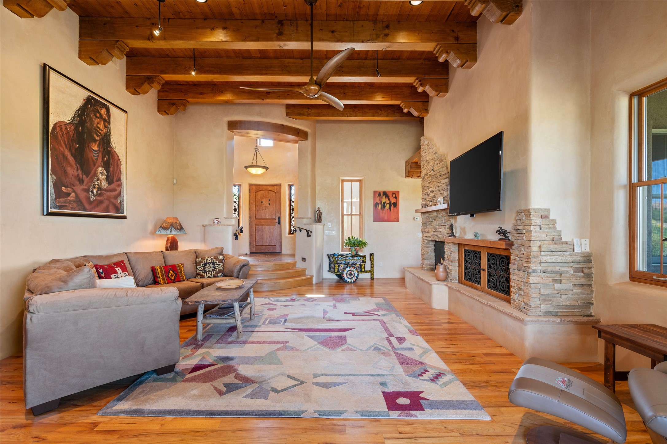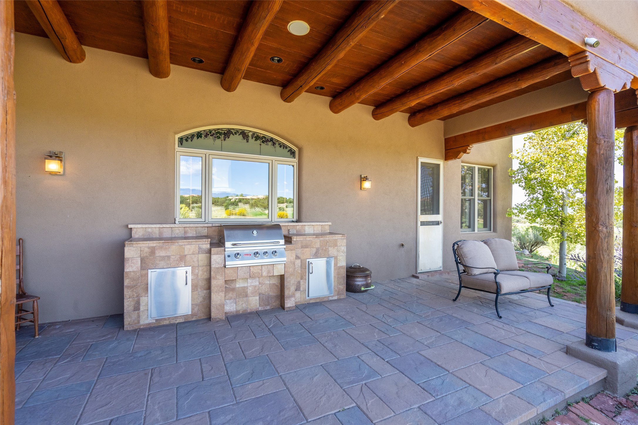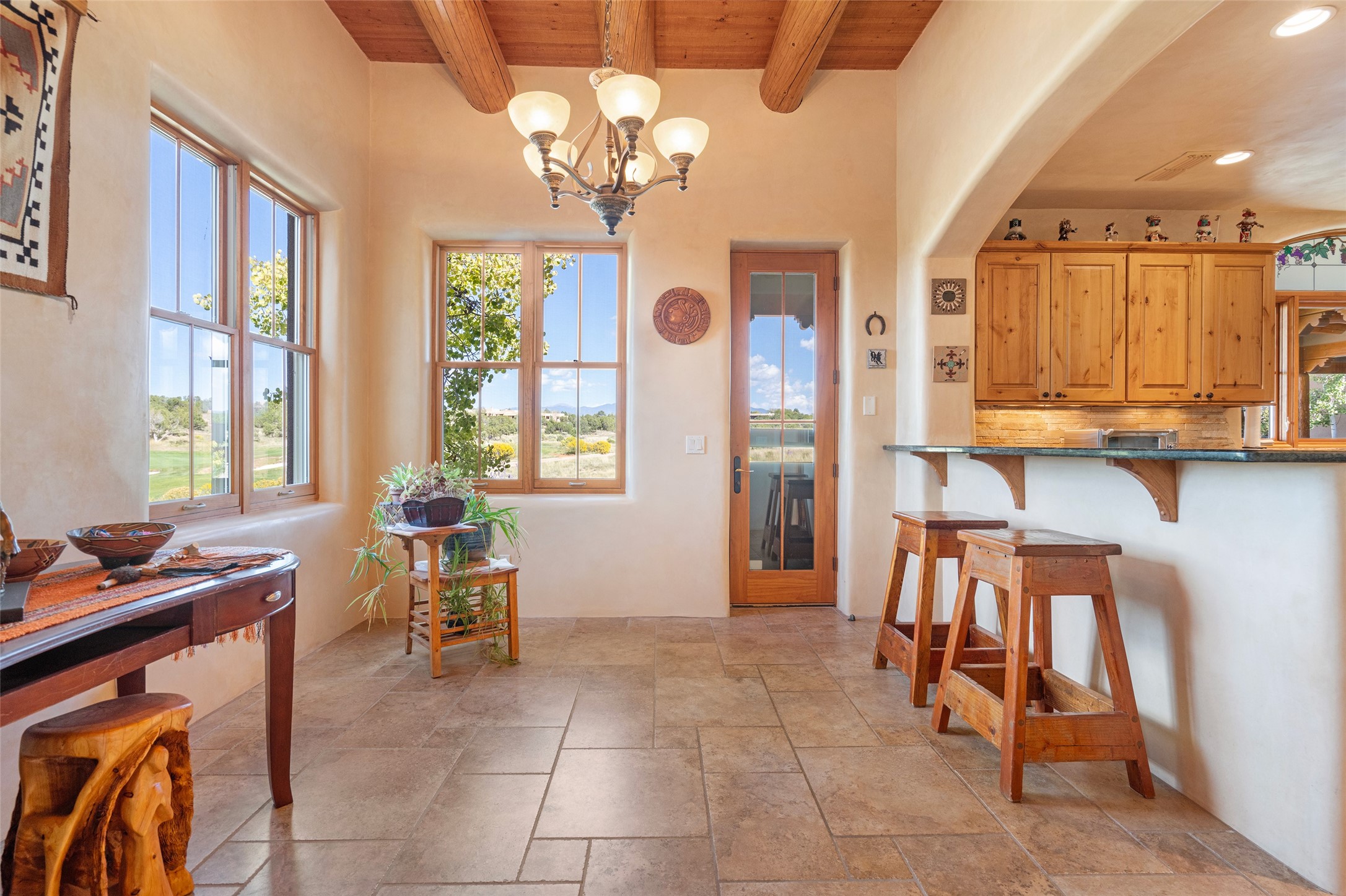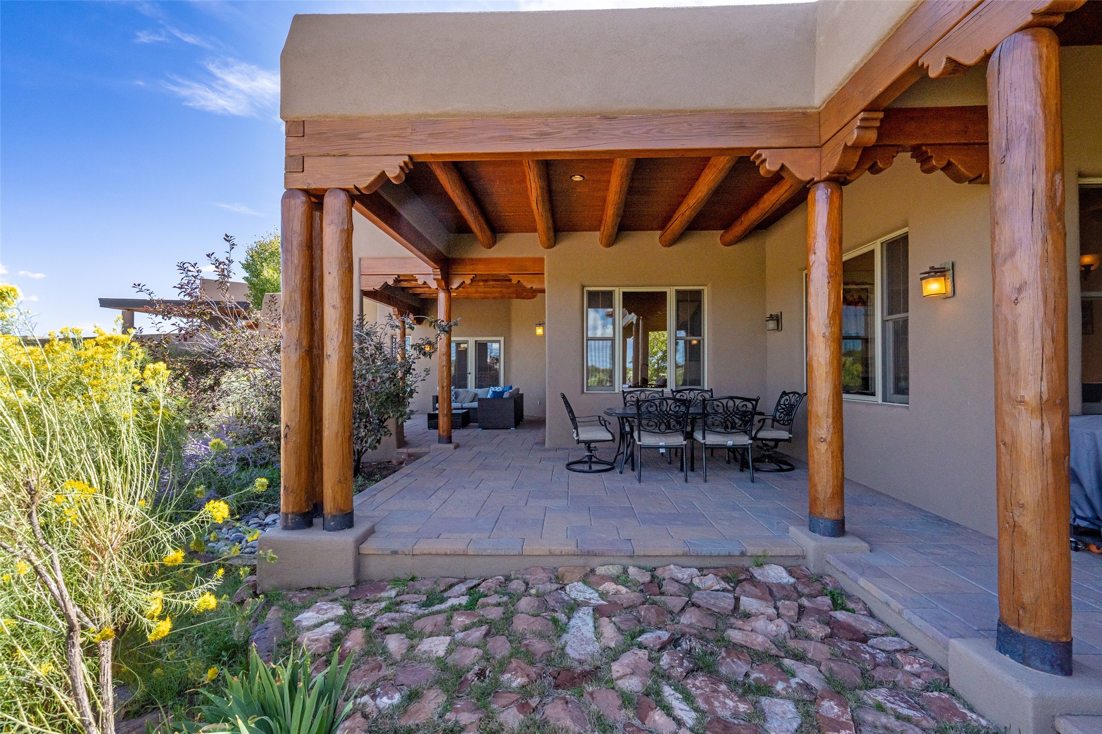 The Grand Trifecta of Santa Fe Living!! This exceptional Las Campanas residence delivers the ultimate blend of golf course living, panoramic mountain vistas, and timeless Santa Fe design. Perfectly sited on a quiet cul-de-sac overlooking the 8th hole of the Sunset Golf Course, the home showcases sweeping views of both the Sangre de Cristo and Jemez mountain ranges--truly some of the finest in Santa Fe. From the hand-laid stone driveway to the beautifully landscaped entry, the curb appeal sets the tone for what awaits inside. Rich Santa Fe character abounds with richly hued, hand-troweled plaster walls, an Anasazi stacked stone dual-sided fireplace, magnificent ceiling treatments including massive beams, vigas and wood ceilings, beautifully carved corbels, and elegant recessed ceiling details. Flagstone accents and custom craftsmanship flow seamlessly throughout. The thoughtfully designed floor plan encompasses three spacious ensuite bedrooms, each distinctly private. The primary suite is a retreat of its own, complete with a spa-like bath featuring dual vanities, a soaking tub, and French doors leading to the expansive portals. At the heart of the home, the chef's kitchen combines modern function with rustic warmth--offering custom cabinetry, granite counters, professional-grade appliances, a center island with five-burner cooktop, and a large pantry. The adjacent dining area captures both views and intimacy, anchored by the stone-trimmed two-sided fireplace. Outdoor living is elevated with a wrap-around portal, built-in grill, and unobstructed vistas of the golf course and surrounding mountains. From sunrise over the Sangres to sunsets over the Jemez, every moment here is a masterpiece. Whether as a perfect lock-and-leave getaway or a full-time residence, this rare offering blends masterful design, luxury, and location--Santa Fe living at its very best.