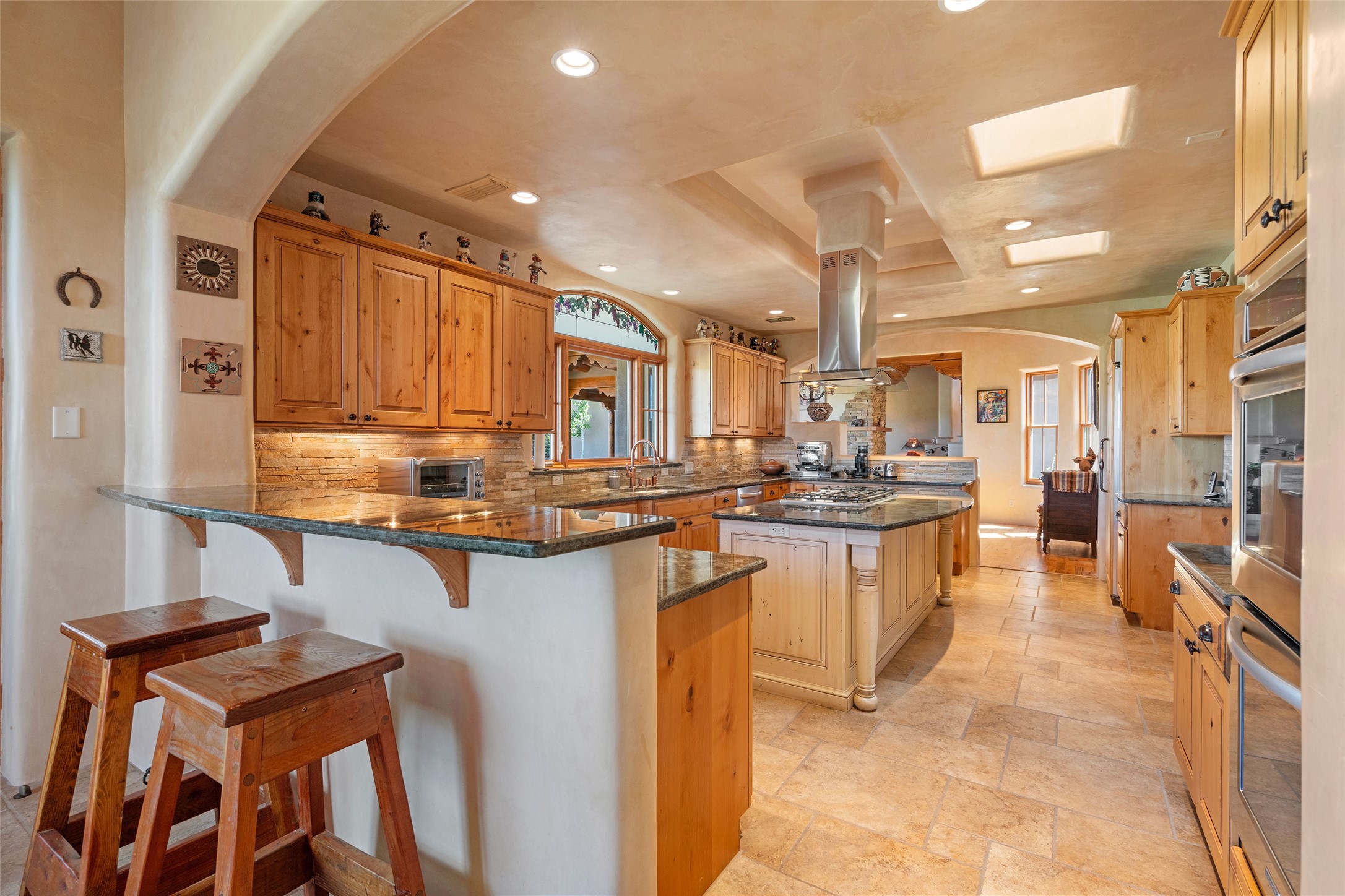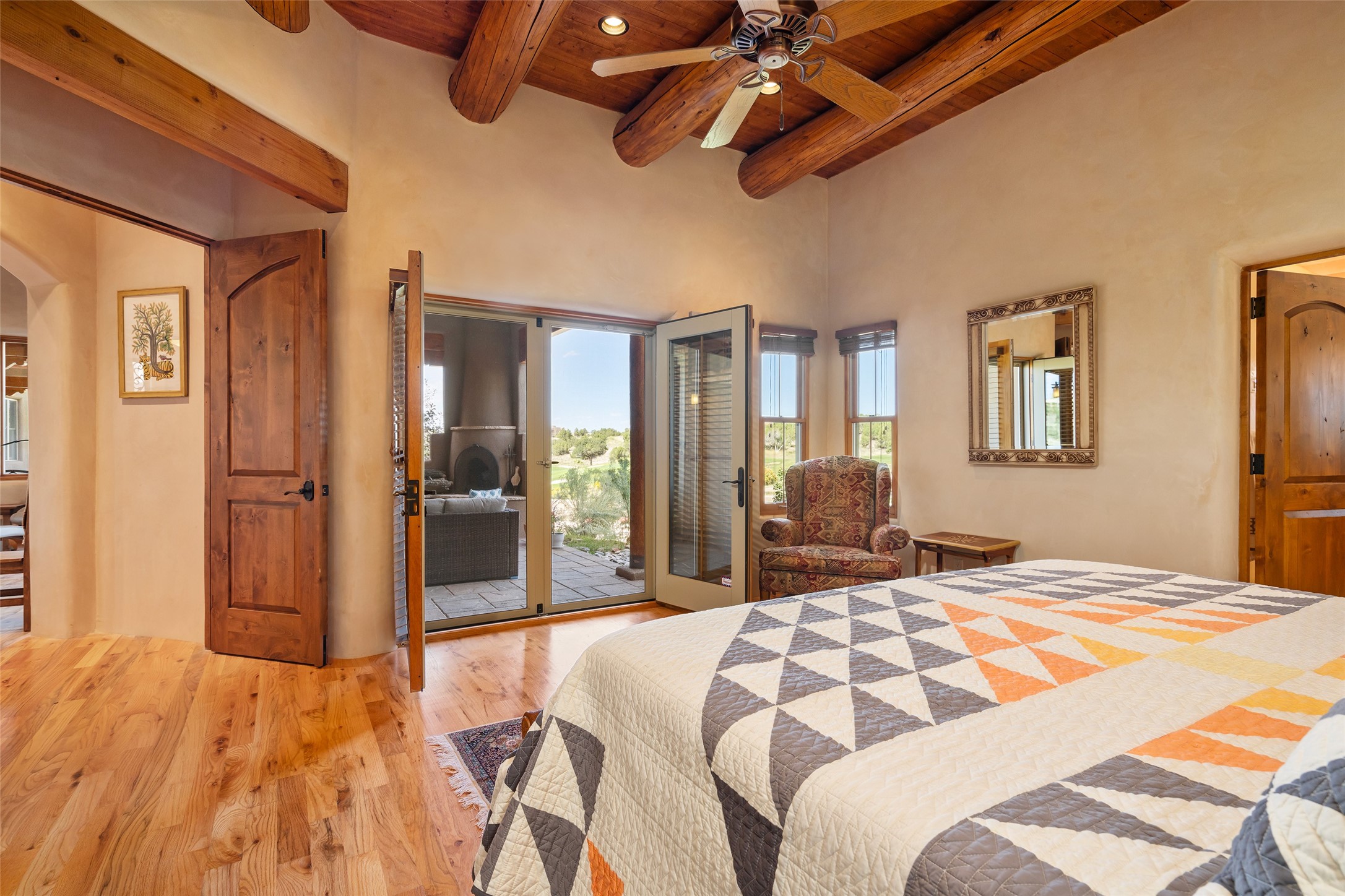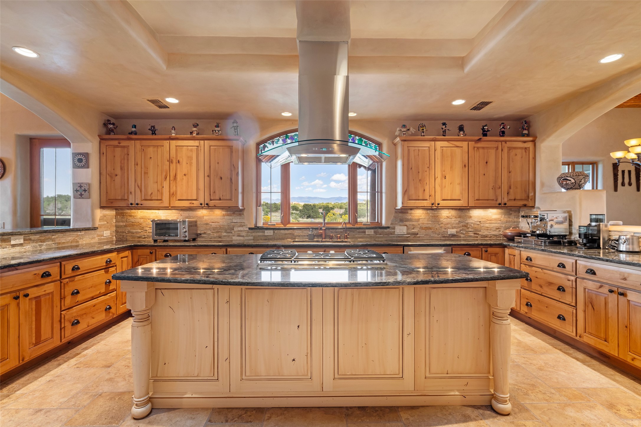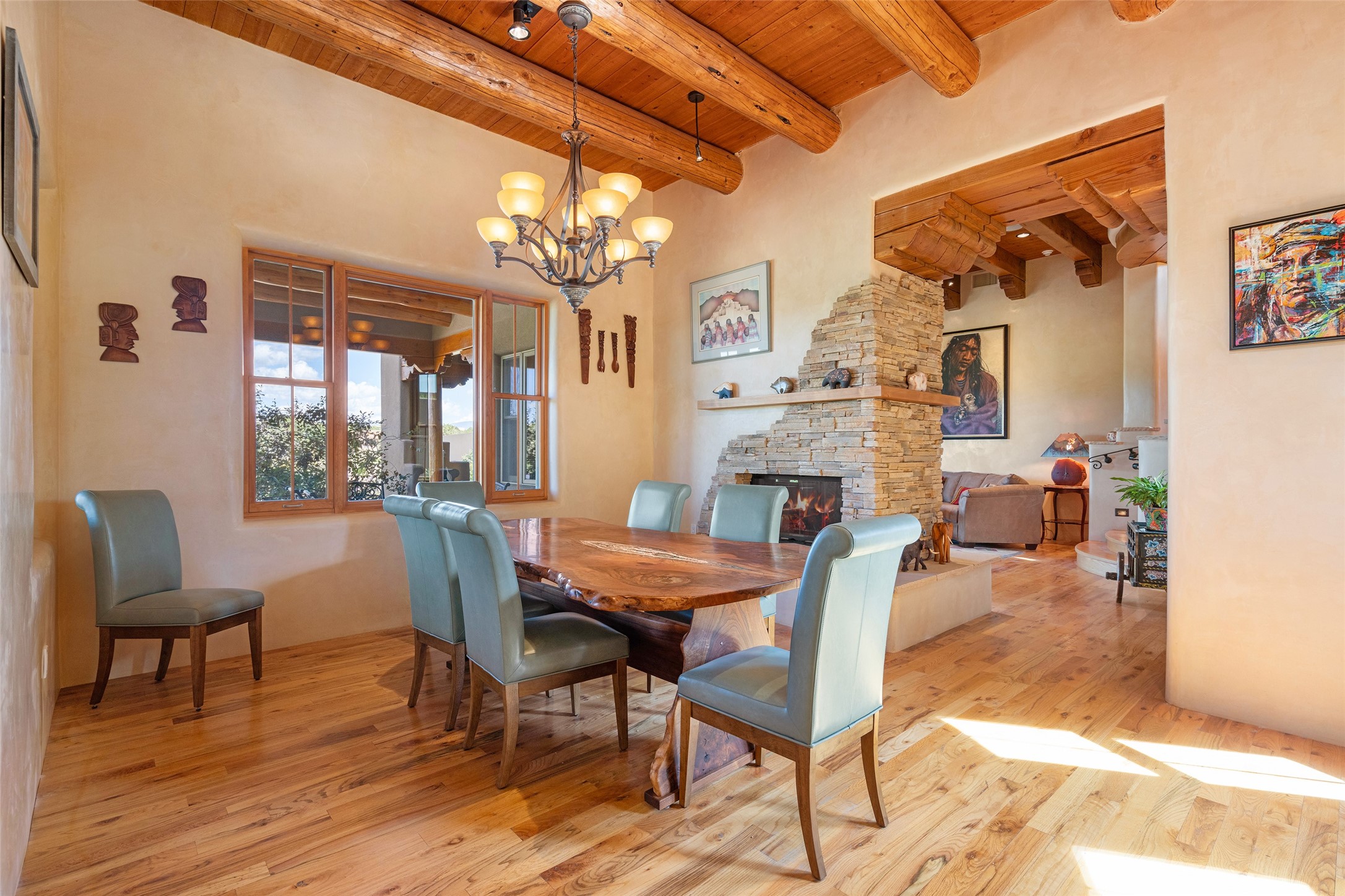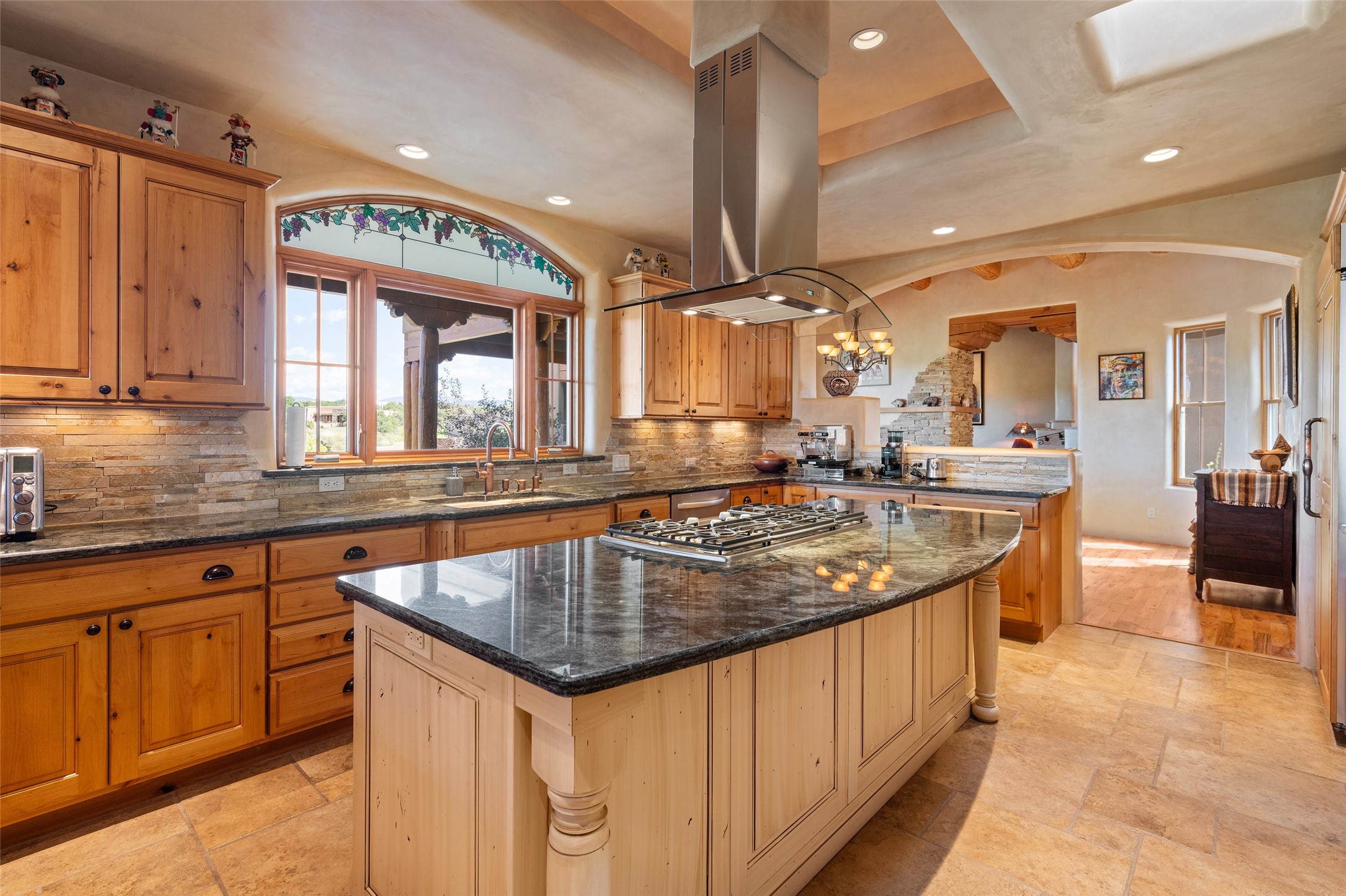 The Grand Trifecta of Santa Fe Living!! This exceptional Las Campanas residence delivers the ultimate blend of golf course living, panoramic mountain vistas, and timeless Santa Fe design. Perfectly sited on a quiet cul-de-sac overlooking the 8th hole of the Sunset Golf Course, the home showcases sweeping views of both the Sangre de Cristo and Jemez mountain ranges--truly some of the finest in Santa Fe. From the hand-laid stone driveway to the beautifully landscaped entry, the curb appeal sets the tone for what awaits inside. Rich Santa Fe character abounds with richly hued, hand-troweled plaster walls, an Anasazi stacked stone dual-sided fireplace, magnificent ceiling treatments including massive beams, vigas and wood ceilings, beautifully carved corbels, and elegant recessed ceiling details. Flagstone accents and custom craftsmanship flow seamlessly throughout. The thoughtfully designed floor plan encompasses three spacious ensuite bedrooms, each distinctly private. The primary suite is a retreat of its own, complete with a spa-like bath featuring dual vanities, a soaking tub, and French doors leading to the expansive portals. At the heart of the home, the chef's kitchen combines modern function with rustic warmth--offering custom cabinetry, granite counters, professional-grade appliances, a center island with five-burner cooktop, and a large pantry. The adjacent dining area captures both views and intimacy, anchored by the stone-trimmed two-sided fireplace. Outdoor living is elevated with a wrap-around portal, built-in grill, and unobstructed vistas of the golf course and surrounding mountains. From sunrise over the Sangres to sunsets over the Jemez, every moment here is a masterpiece. Whether as a perfect lock-and-leave getaway or a full-time residence, this rare offering blends masterful design, luxury, and location--Santa Fe living at its very best.
