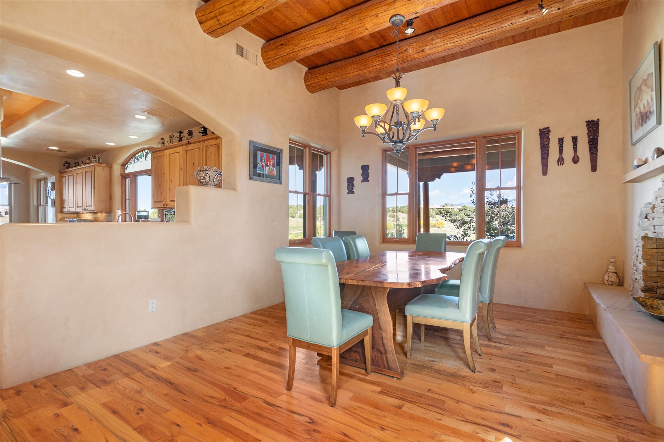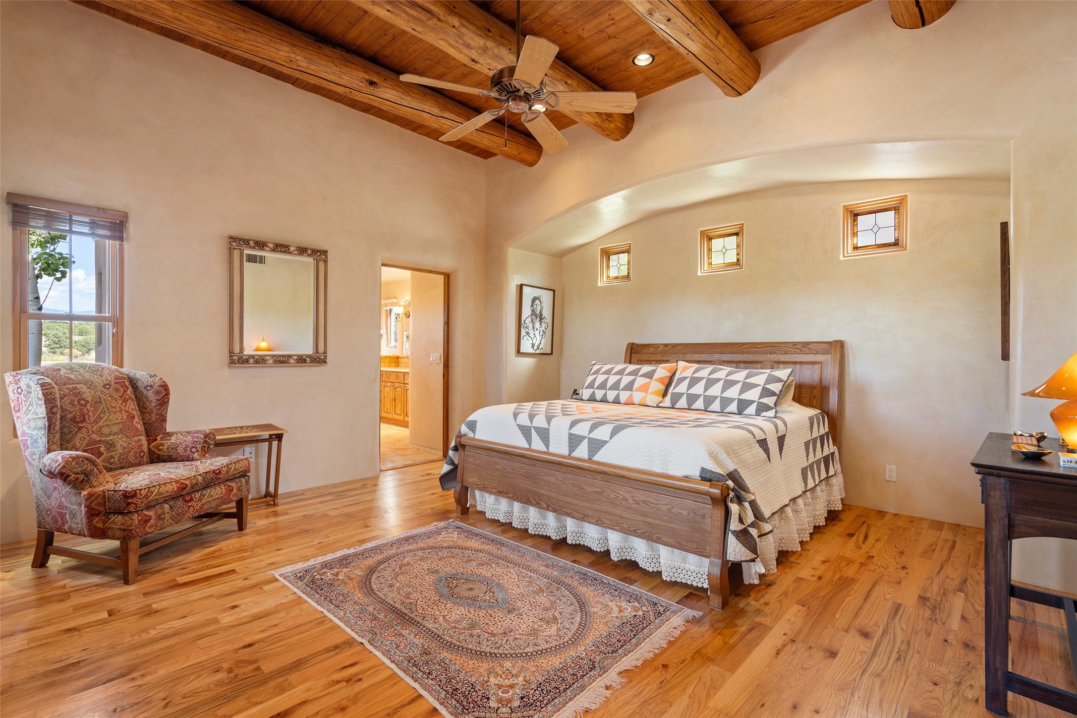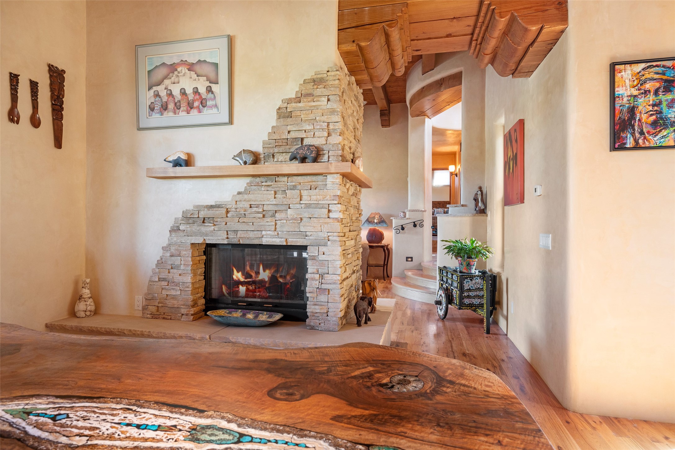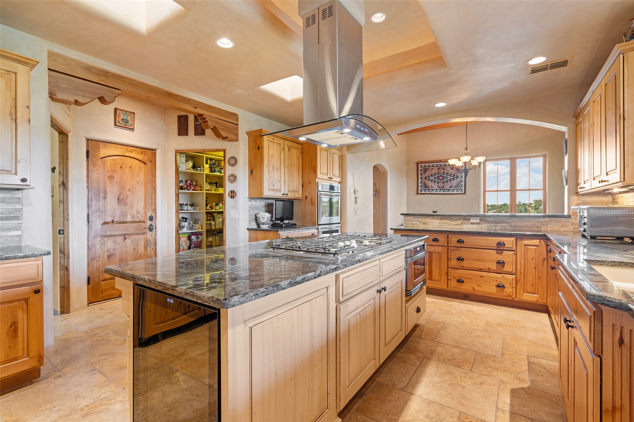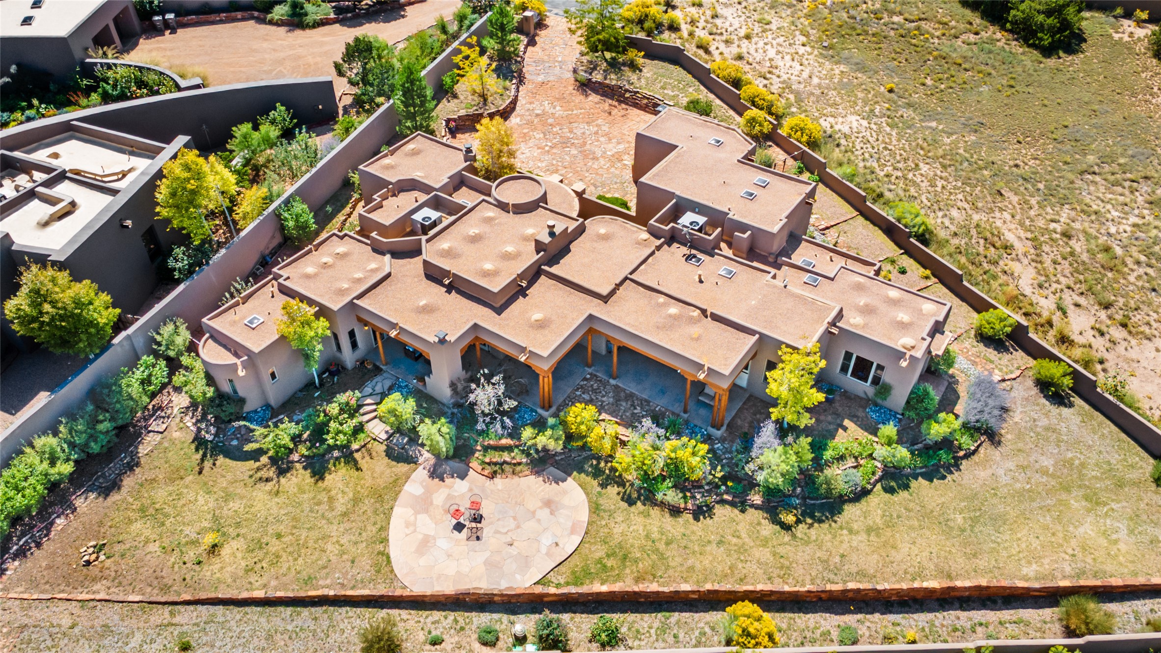 The Grand Trifecta of Santa Fe Living!! This exceptional Las Campanas residence delivers the ultimate blend of golf course living, panoramic mountain vistas, and timeless Santa Fe design. Perfectly sited on a quiet cul-de-sac overlooking the 8th hole of the Sunset Golf Course, the home showcases sweeping views of both the Sangre de Cristo and Jemez mountain ranges--truly some of the finest in Santa Fe. From the hand-laid stone driveway to the beautifully landscaped entry, the curb appeal sets the tone for what awaits inside. Rich Santa Fe character abounds with richly hued, hand-troweled plaster walls, an Anasazi stacked stone dual-sided fireplace, magnificent ceiling treatments including massive beams, vigas and wood ceilings, beautifully carved corbels, and elegant recessed ceiling details. Flagstone accents and custom craftsmanship flow seamlessly throughout. The thoughtfully designed floor plan encompasses three spacious ensuite bedrooms, each distinctly private. The primary suite is a retreat of its own, complete with a spa-like bath featuring dual vanities, a soaking tub, and French doors leading to the expansive portals. At the heart of the home, the chef's kitchen combines modern function with rustic warmth--offering custom cabinetry, granite counters, professional-grade appliances, a center island with five-burner cooktop, and a large pantry. The adjacent dining area captures both views and intimacy, anchored by the stone-trimmed two-sided fireplace. Outdoor living is elevated with a wrap-around portal, built-in grill, and unobstructed vistas of the golf course and surrounding mountains. From sunrise over the Sangres to sunsets over the Jemez, every moment here is a masterpiece. Whether as a perfect lock-and-leave getaway or a full-time residence, this rare offering blends masterful design, luxury, and location--Santa Fe living at its very best.