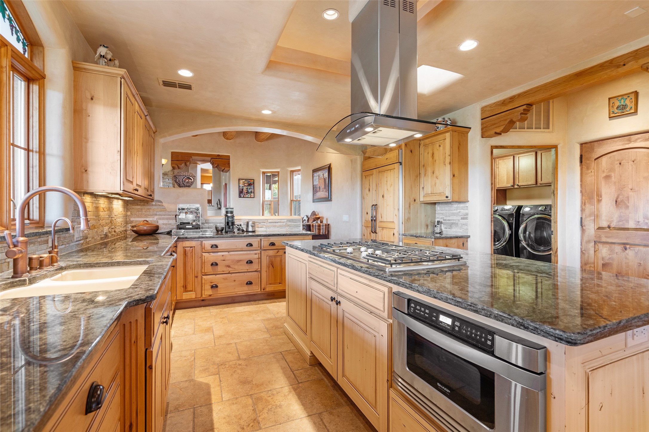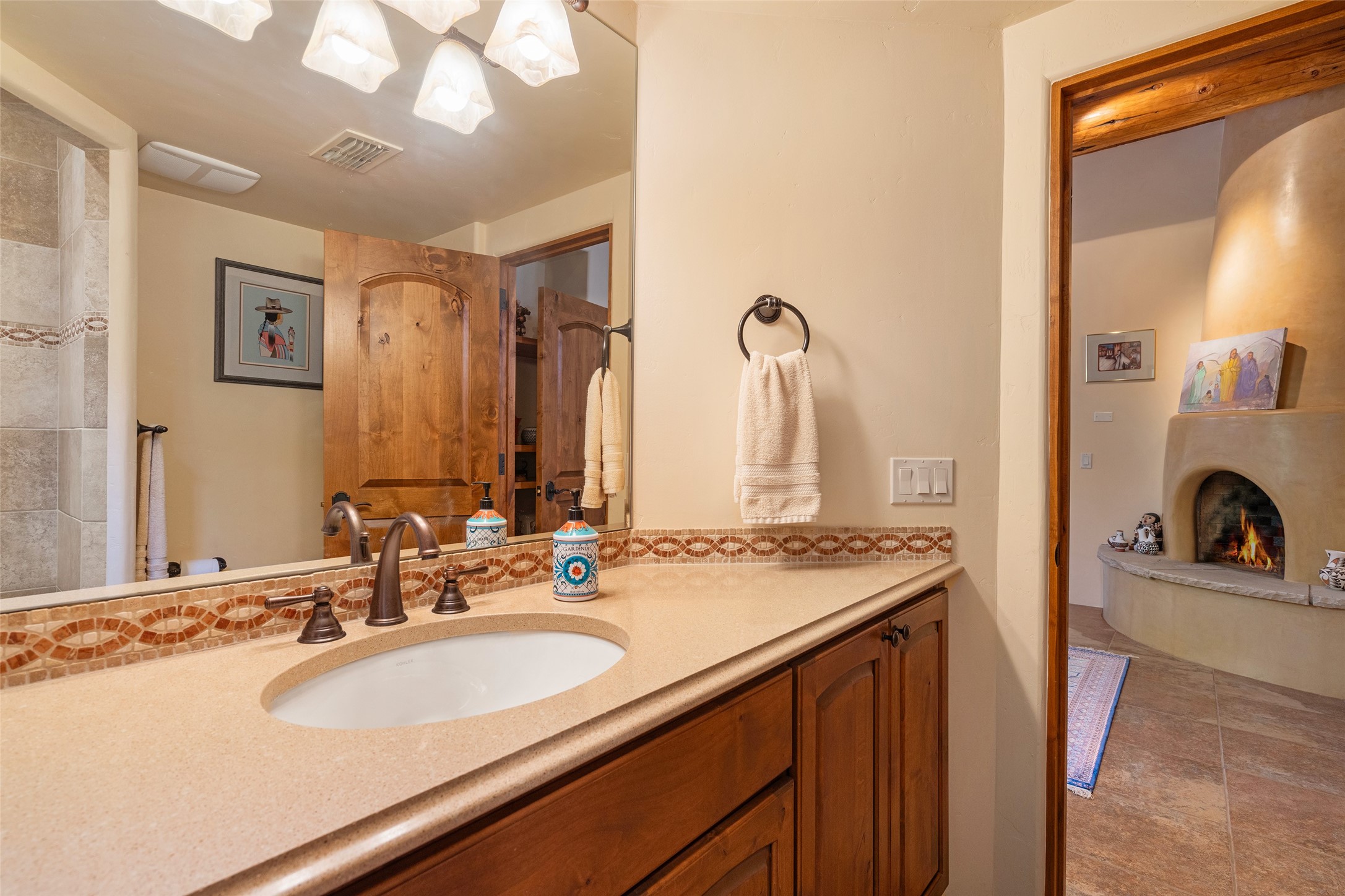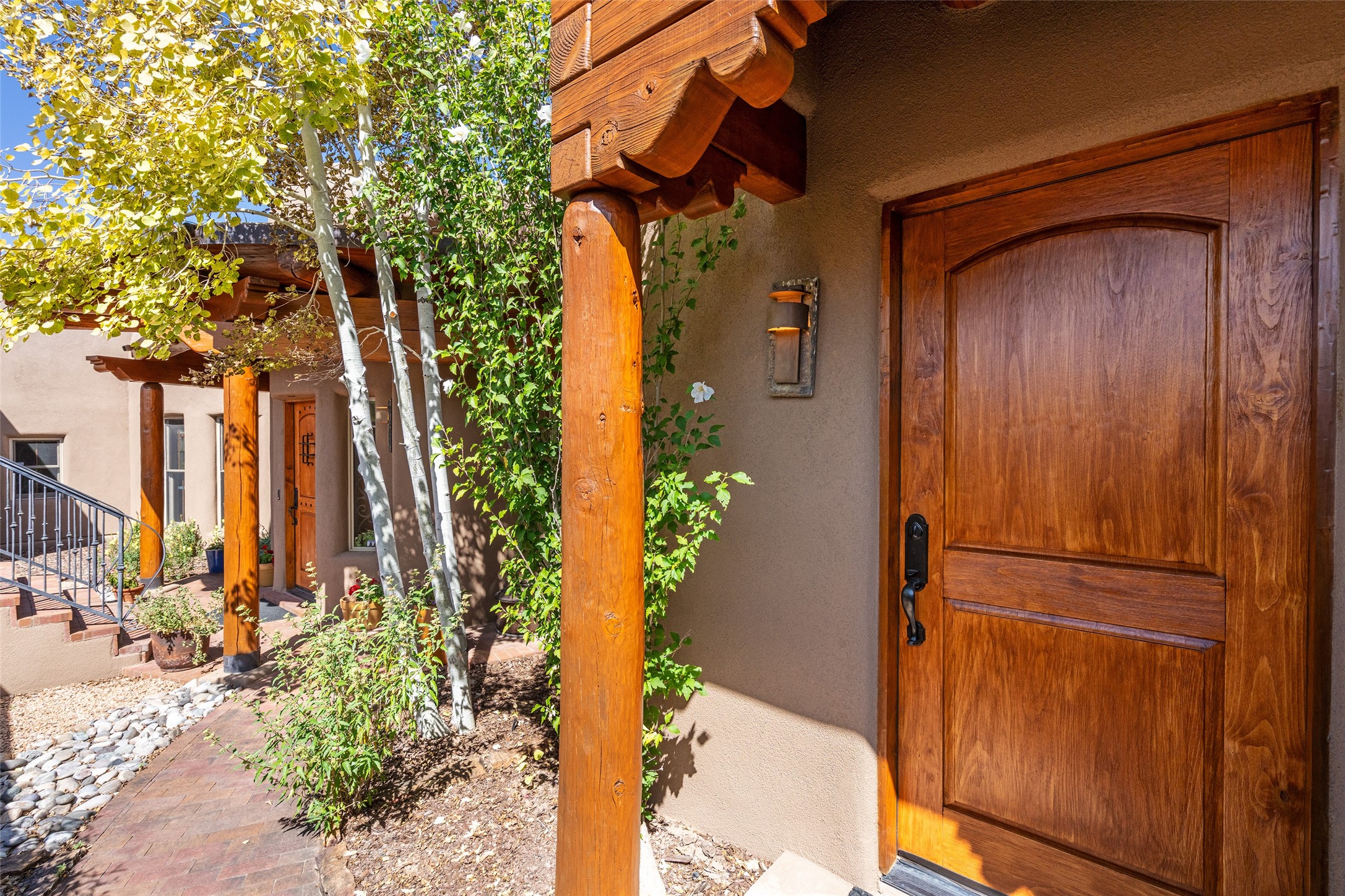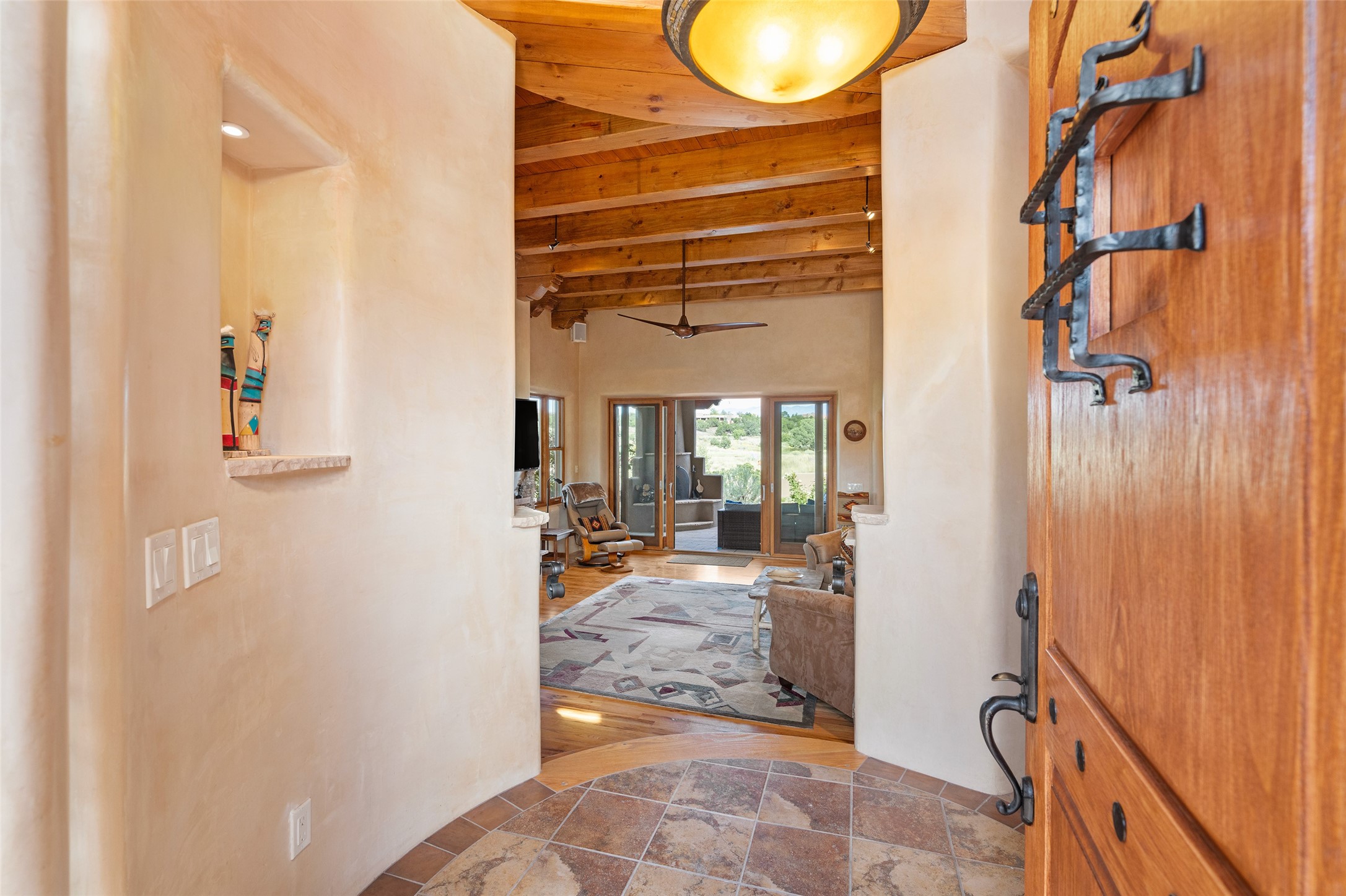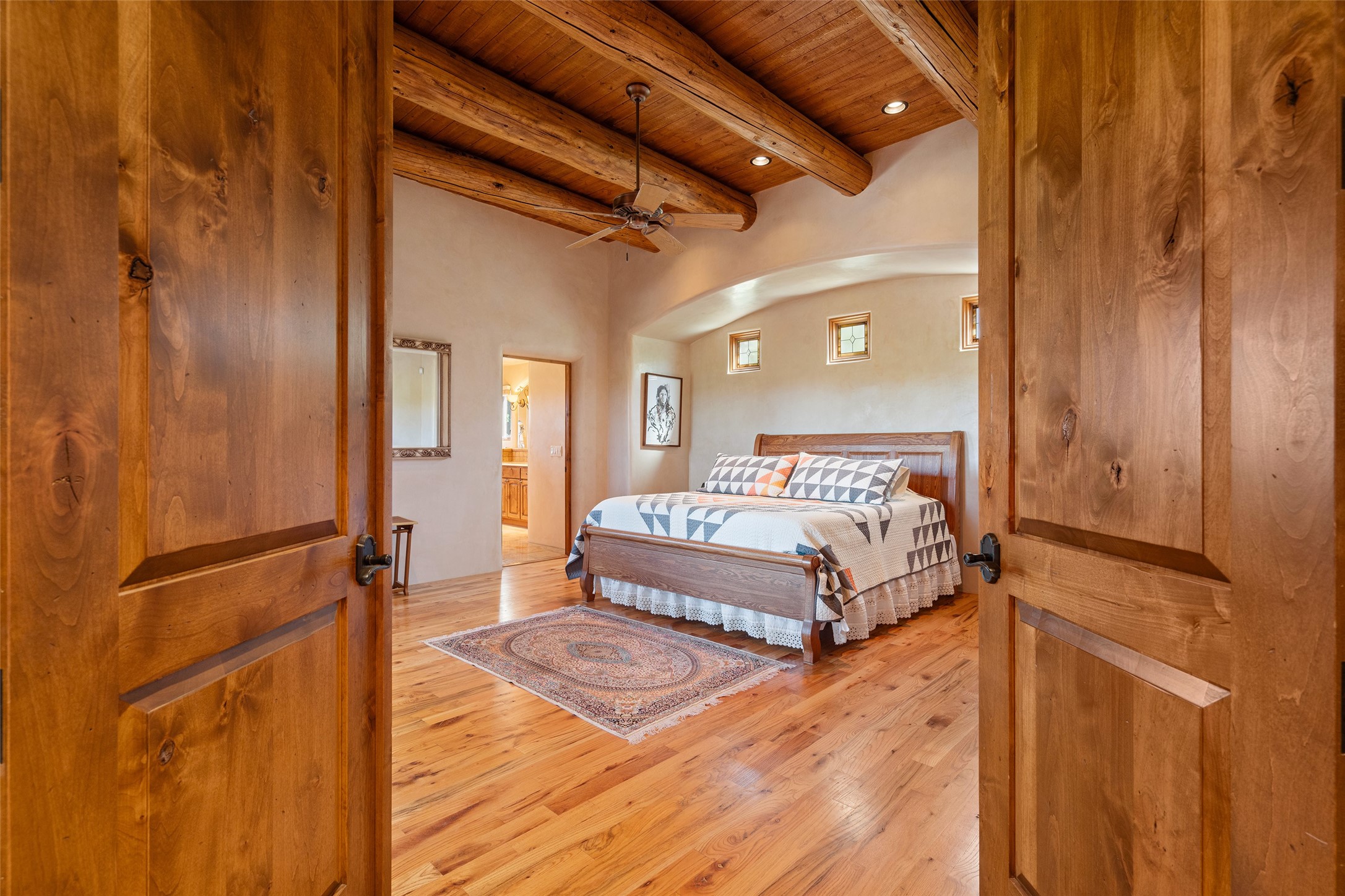 The Grand Trifecta of Santa Fe Living!! This exceptional Las Campanas residence delivers the ultimate blend of golf course living, panoramic mountain vistas, and timeless Santa Fe design. Perfectly sited on a quiet cul-de-sac overlooking the 8th hole of the Sunset Golf Course, the home showcases sweeping views of both the Sangre de Cristo and Jemez mountain ranges--truly some of the finest in Santa Fe. From the hand-laid stone driveway to the beautifully landscaped entry, the curb appeal sets the tone for what awaits inside. Rich Santa Fe character abounds with richly hued, hand-troweled plaster walls, an Anasazi stacked stone dual-sided fireplace, magnificent ceiling treatments including massive beams, vigas and wood ceilings, beautifully carved corbels, and elegant recessed ceiling details. Flagstone accents and custom craftsmanship flow seamlessly throughout. The thoughtfully designed floor plan encompasses three spacious ensuite bedrooms, each distinctly private. The primary suite is a retreat of its own, complete with a spa-like bath featuring dual vanities, a soaking tub, and French doors leading to the expansive portals. At the heart of the home, the chef's kitchen combines modern function with rustic warmth--offering custom cabinetry, granite counters, professional-grade appliances, a center island with five-burner cooktop, and a large pantry. The adjacent dining area captures both views and intimacy, anchored by the stone-trimmed two-sided fireplace. Outdoor living is elevated with a wrap-around portal, built-in grill, and unobstructed vistas of the golf course and surrounding mountains. From sunrise over the Sangres to sunsets over the Jemez, every moment here is a masterpiece. Whether as a perfect lock-and-leave getaway or a full-time residence, this rare offering blends masterful design, luxury, and location--Santa Fe living at its very best.