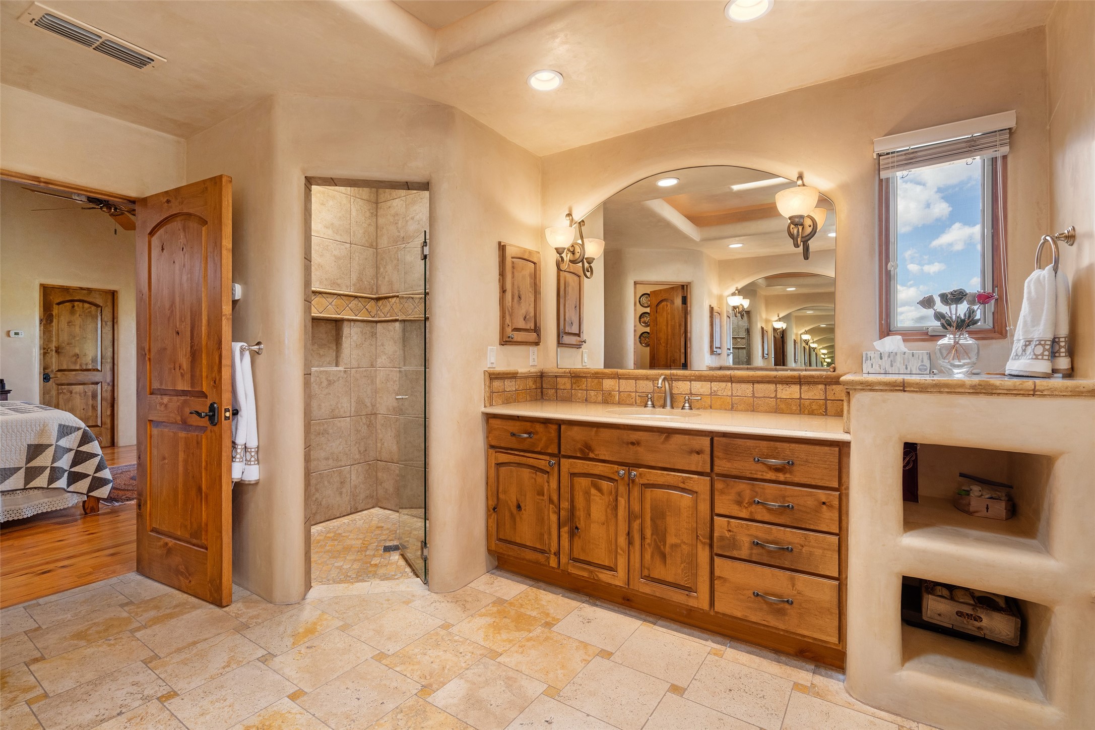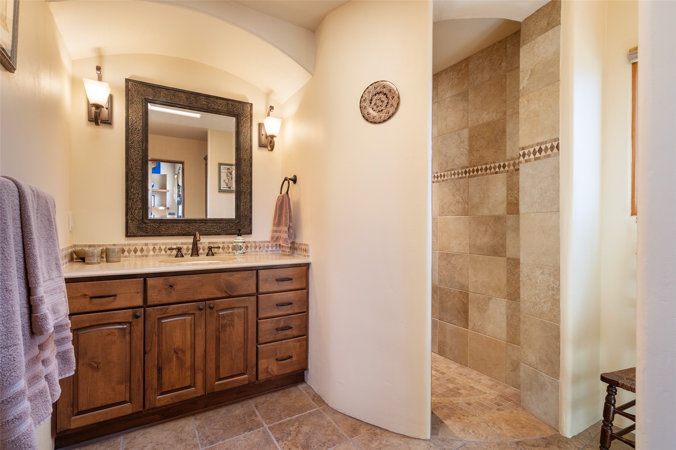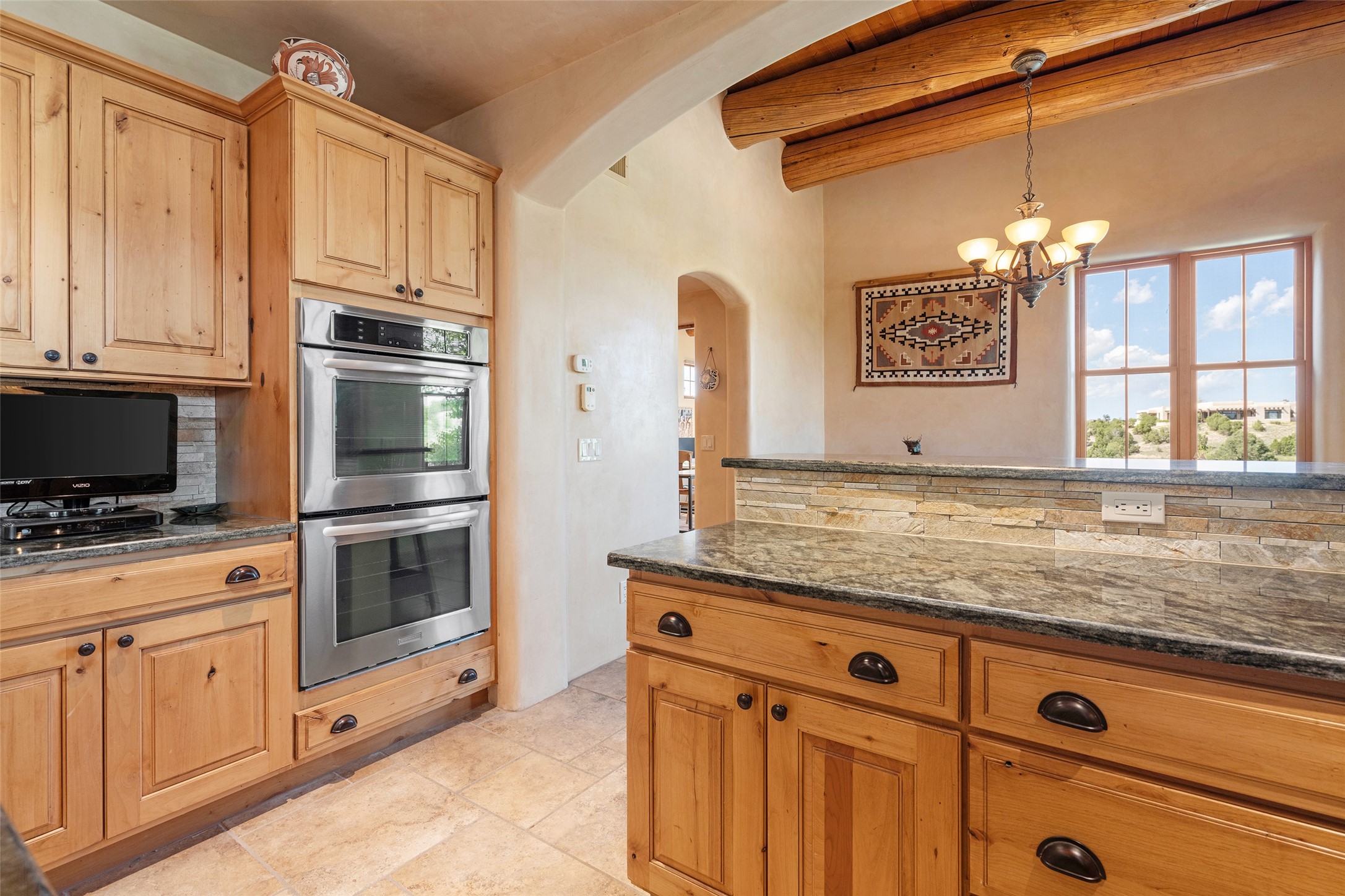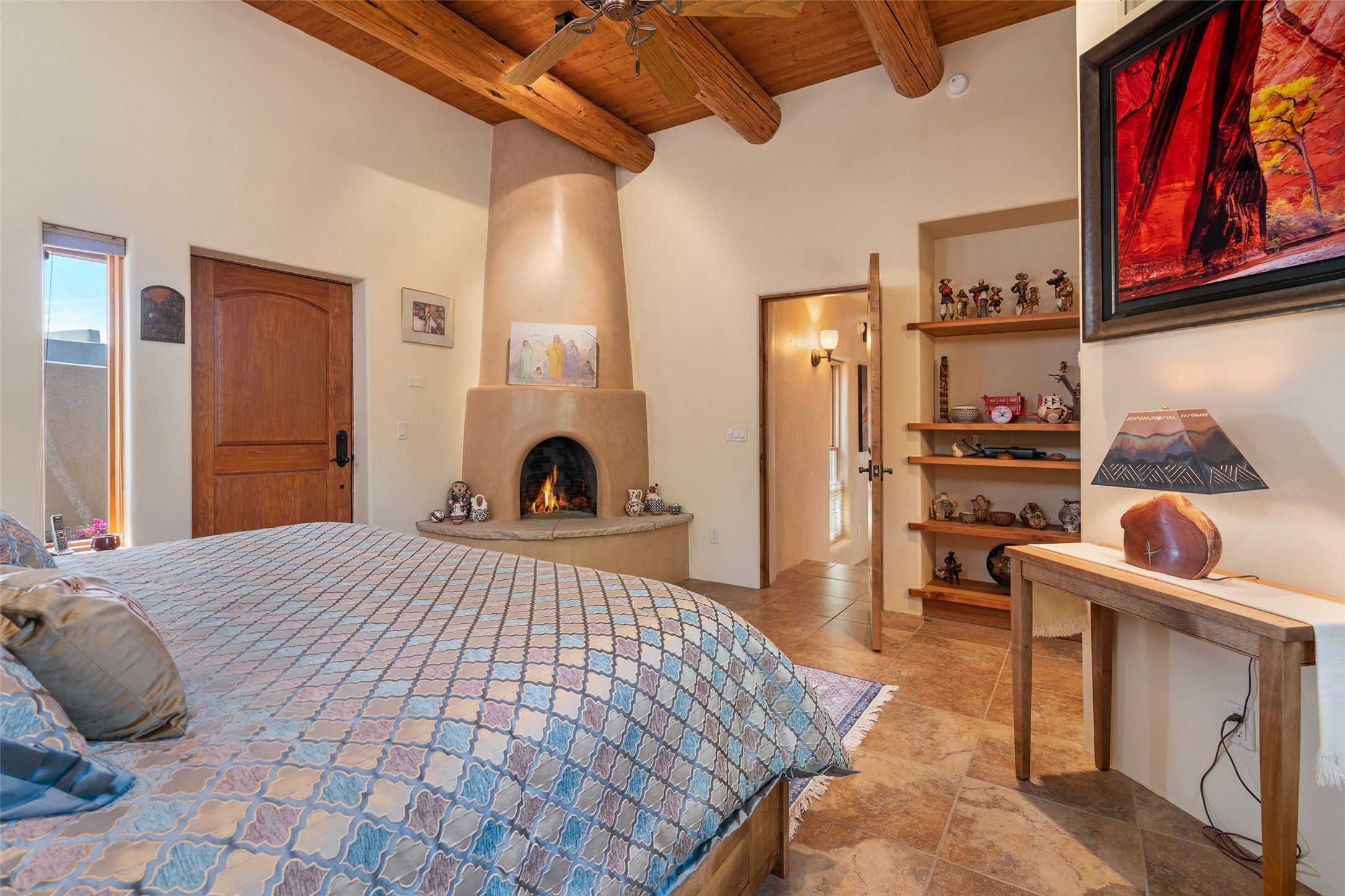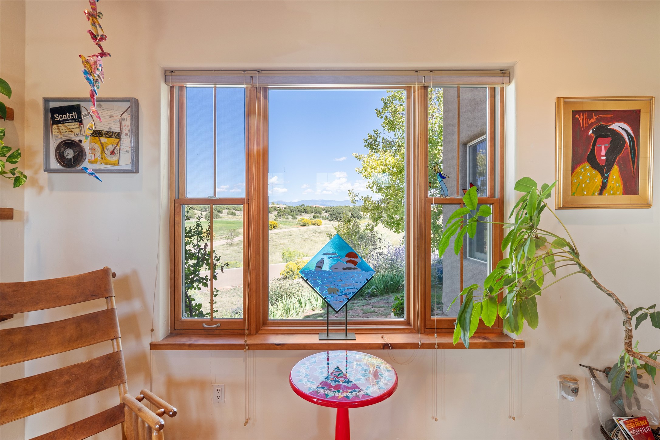 The Grand Trifecta of Santa Fe Living!! This exceptional Las Campanas residence delivers the ultimate blend of golf course living, panoramic mountain vistas, and timeless Santa Fe design. Perfectly sited on a quiet cul-de-sac overlooking the 8th hole of the Sunset Golf Course, the home showcases sweeping views of both the Sangre de Cristo and Jemez mountain ranges--truly some of the finest in Santa Fe. From the hand-laid stone driveway to the beautifully landscaped entry, the curb appeal sets the tone for what awaits inside. Rich Santa Fe character abounds with richly hued, hand-troweled plaster walls, an Anasazi stacked stone dual-sided fireplace, magnificent ceiling treatments including massive beams, vigas and wood ceilings, beautifully carved corbels, and elegant recessed ceiling details. Flagstone accents and custom craftsmanship flow seamlessly throughout. The thoughtfully designed floor plan encompasses three spacious ensuite bedrooms, each distinctly private. The primary suite is a retreat of its own, complete with a spa-like bath featuring dual vanities, a soaking tub, and French doors leading to the expansive portals. At the heart of the home, the chef's kitchen combines modern function with rustic warmth--offering custom cabinetry, granite counters, professional-grade appliances, a center island with five-burner cooktop, and a large pantry. The adjacent dining area captures both views and intimacy, anchored by the stone-trimmed two-sided fireplace. Outdoor living is elevated with a wrap-around portal, built-in grill, and unobstructed vistas of the golf course and surrounding mountains. From sunrise over the Sangres to sunsets over the Jemez, every moment here is a masterpiece. Whether as a perfect lock-and-leave getaway or a full-time residence, this rare offering blends masterful design, luxury, and location--Santa Fe living at its very best.