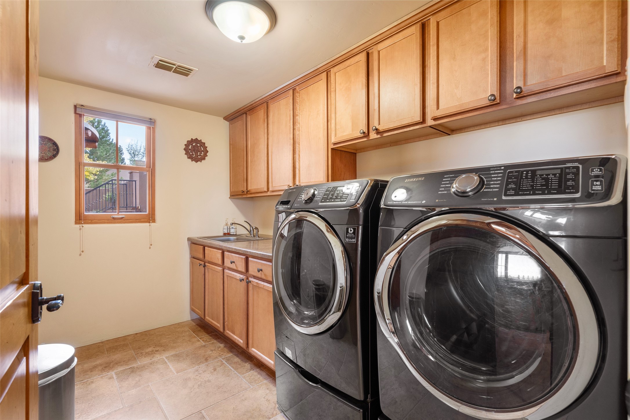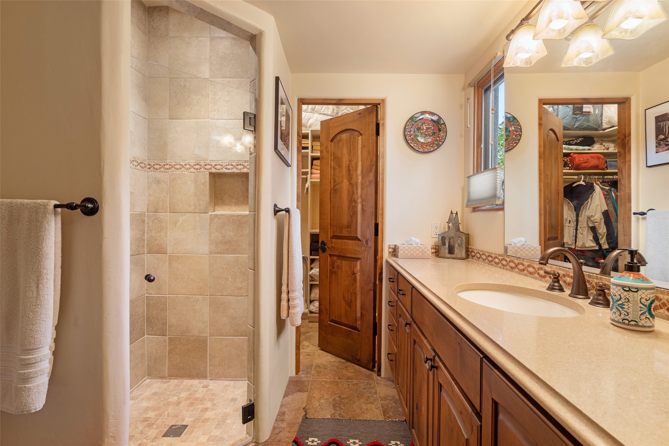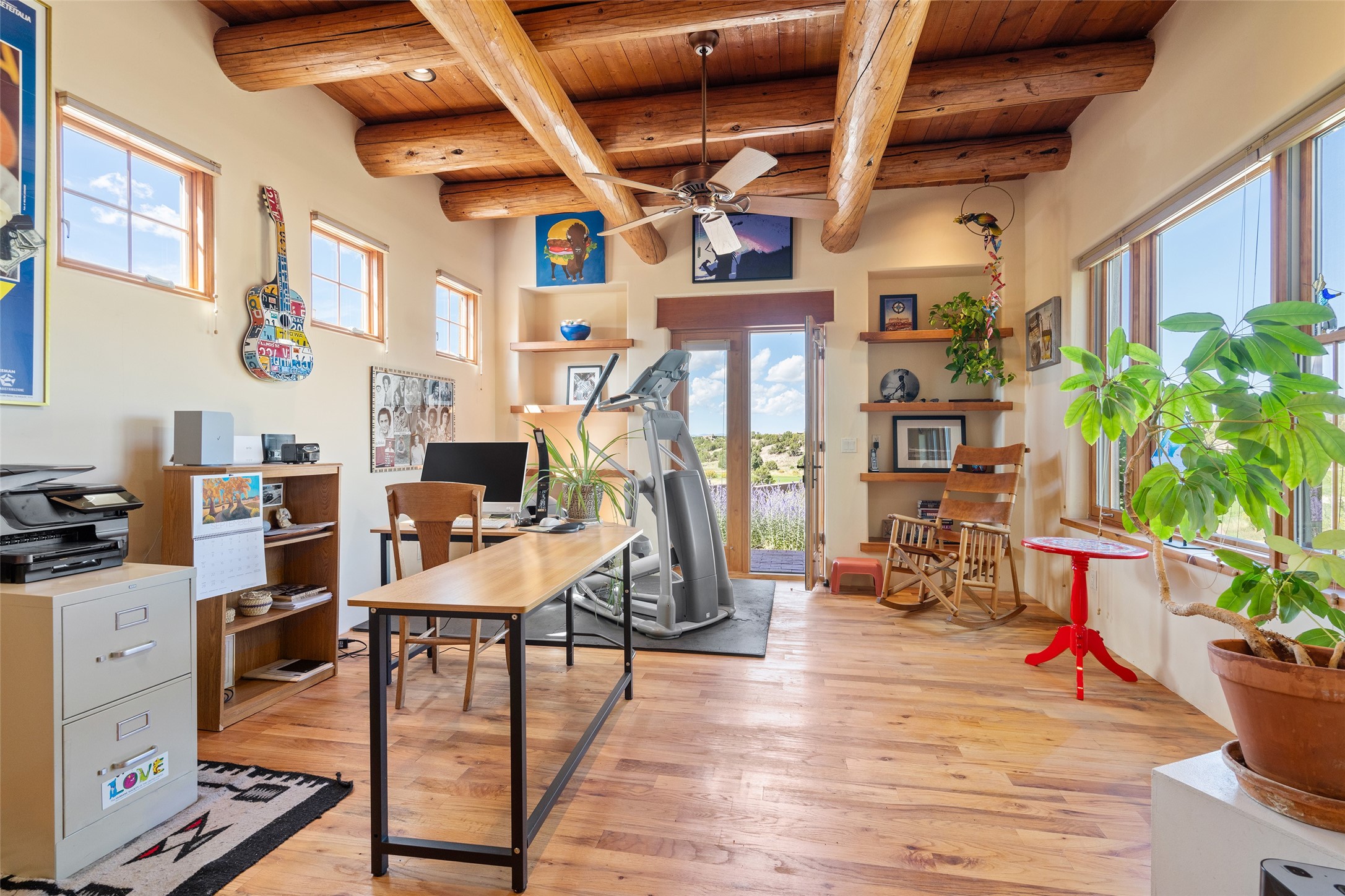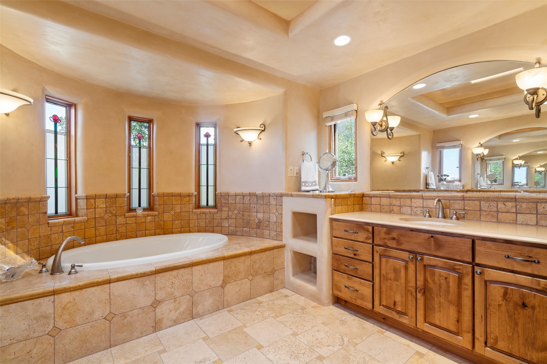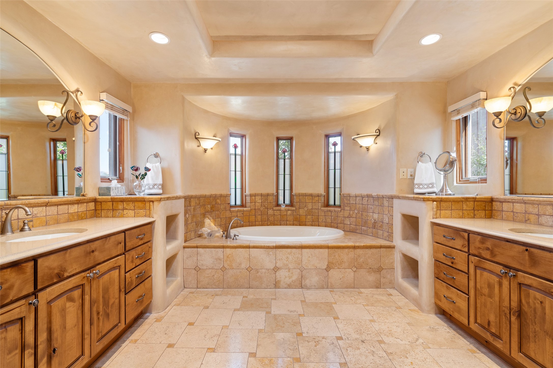 The Grand Trifecta of Santa Fe Living!! This exceptional Las Campanas residence delivers the ultimate blend of golf course living, panoramic mountain vistas, and timeless Santa Fe design. Perfectly sited on a quiet cul-de-sac overlooking the 8th hole of the Sunset Golf Course, the home showcases sweeping views of both the Sangre de Cristo and Jemez mountain ranges--truly some of the finest in Santa Fe. From the hand-laid stone driveway to the beautifully landscaped entry, the curb appeal sets the tone for what awaits inside. Rich Santa Fe character abounds with richly hued, hand-troweled plaster walls, an Anasazi stacked stone dual-sided fireplace, magnificent ceiling treatments including massive beams, vigas and wood ceilings, beautifully carved corbels, and elegant recessed ceiling details. Flagstone accents and custom craftsmanship flow seamlessly throughout. The thoughtfully designed floor plan encompasses three spacious ensuite bedrooms, each distinctly private. The primary suite is a retreat of its own, complete with a spa-like bath featuring dual vanities, a soaking tub, and French doors leading to the expansive portals. At the heart of the home, the chef's kitchen combines modern function with rustic warmth--offering custom cabinetry, granite counters, professional-grade appliances, a center island with five-burner cooktop, and a large pantry. The adjacent dining area captures both views and intimacy, anchored by the stone-trimmed two-sided fireplace. Outdoor living is elevated with a wrap-around portal, built-in grill, and unobstructed vistas of the golf course and surrounding mountains. From sunrise over the Sangres to sunsets over the Jemez, every moment here is a masterpiece. Whether as a perfect lock-and-leave getaway or a full-time residence, this rare offering blends masterful design, luxury, and location--Santa Fe living at its very best.