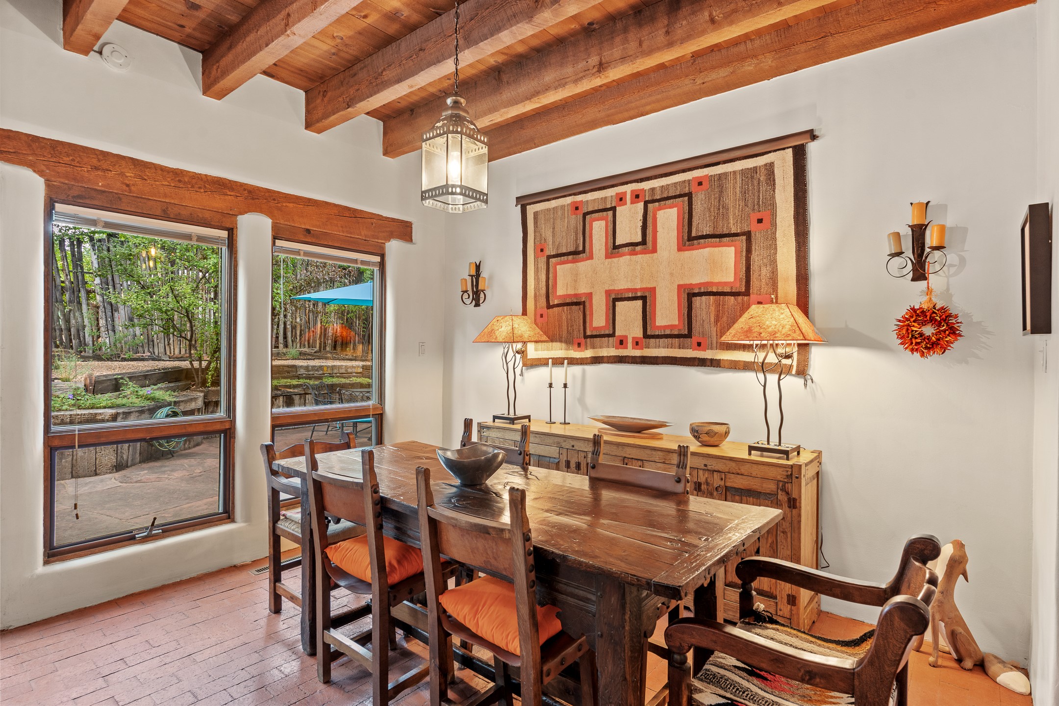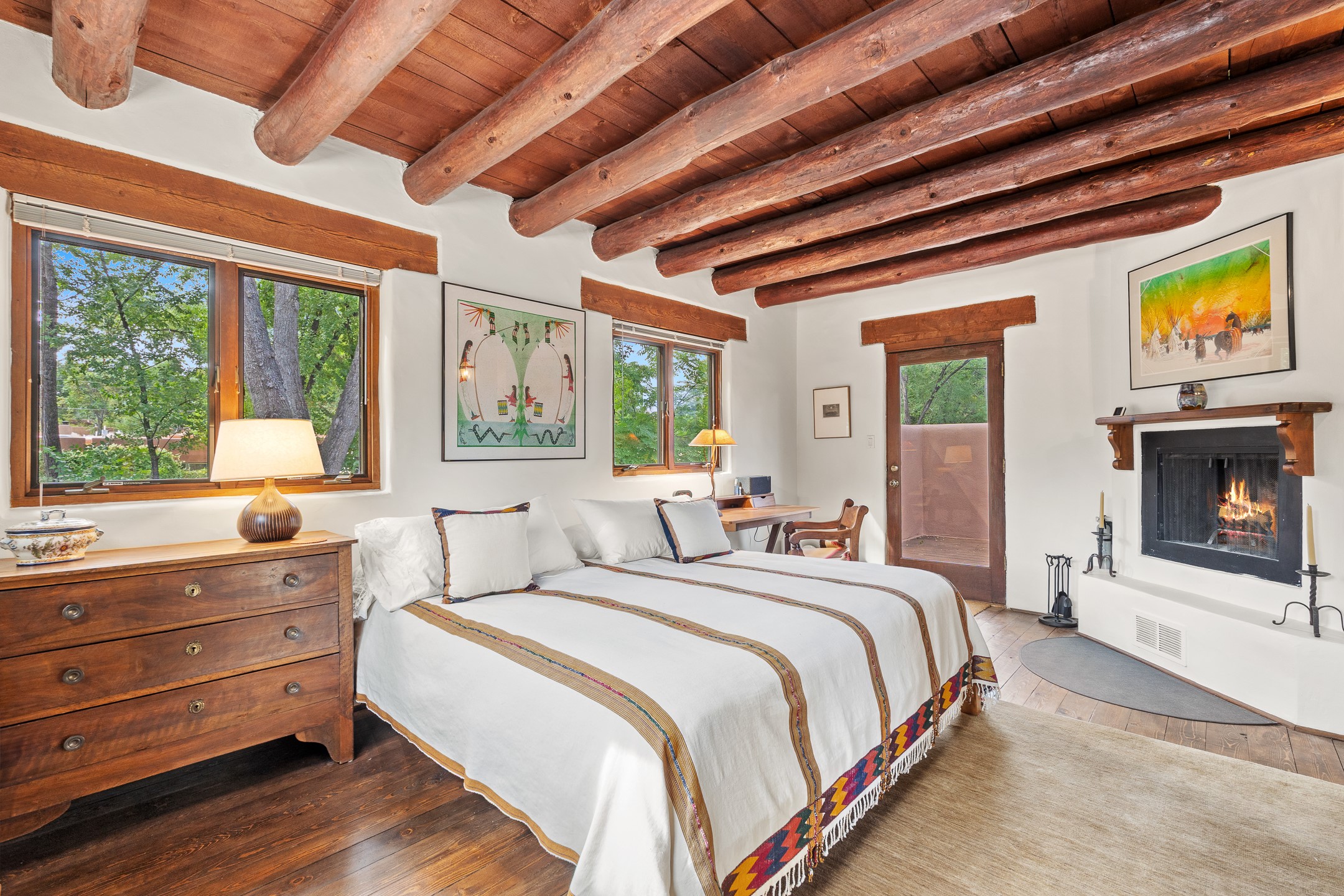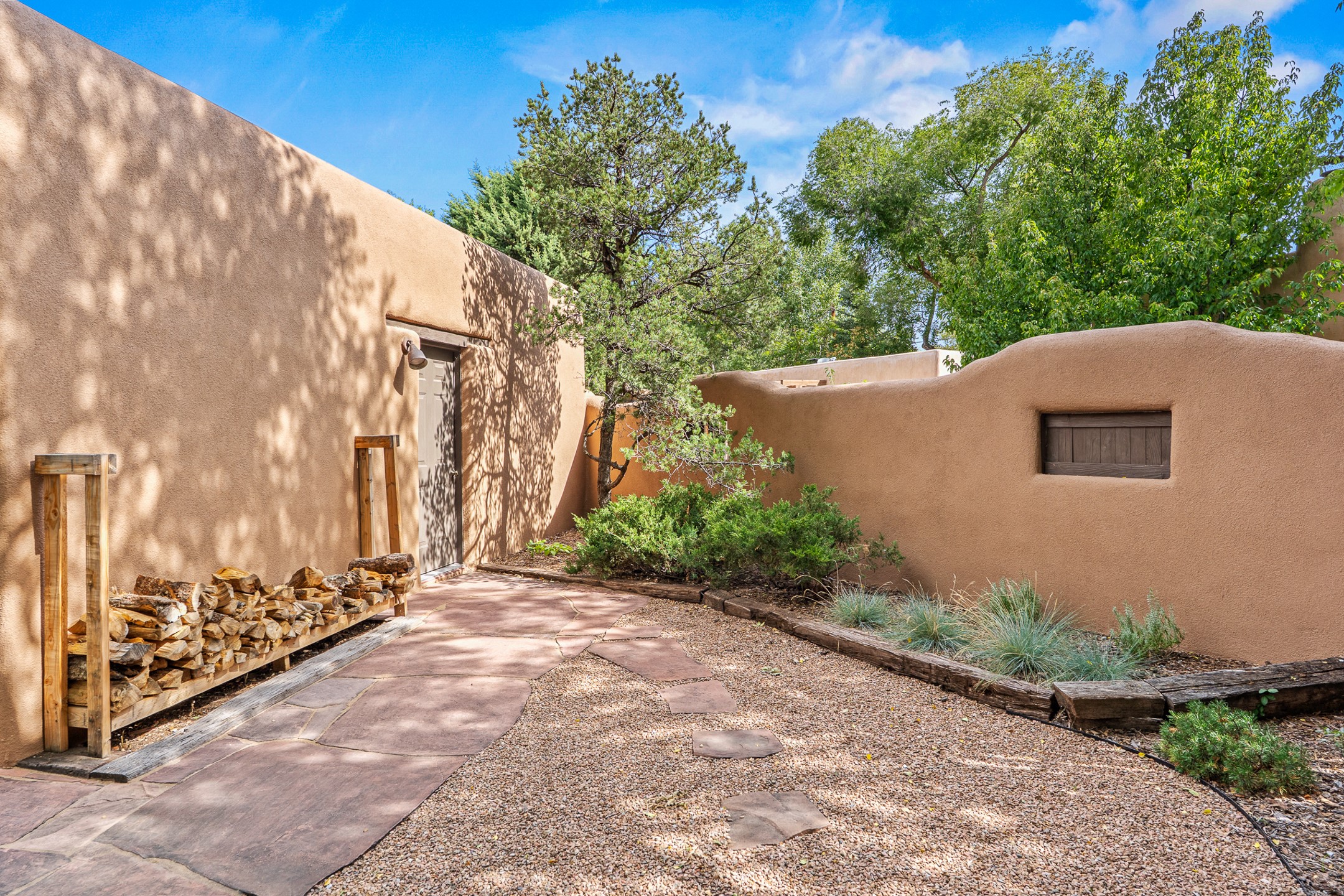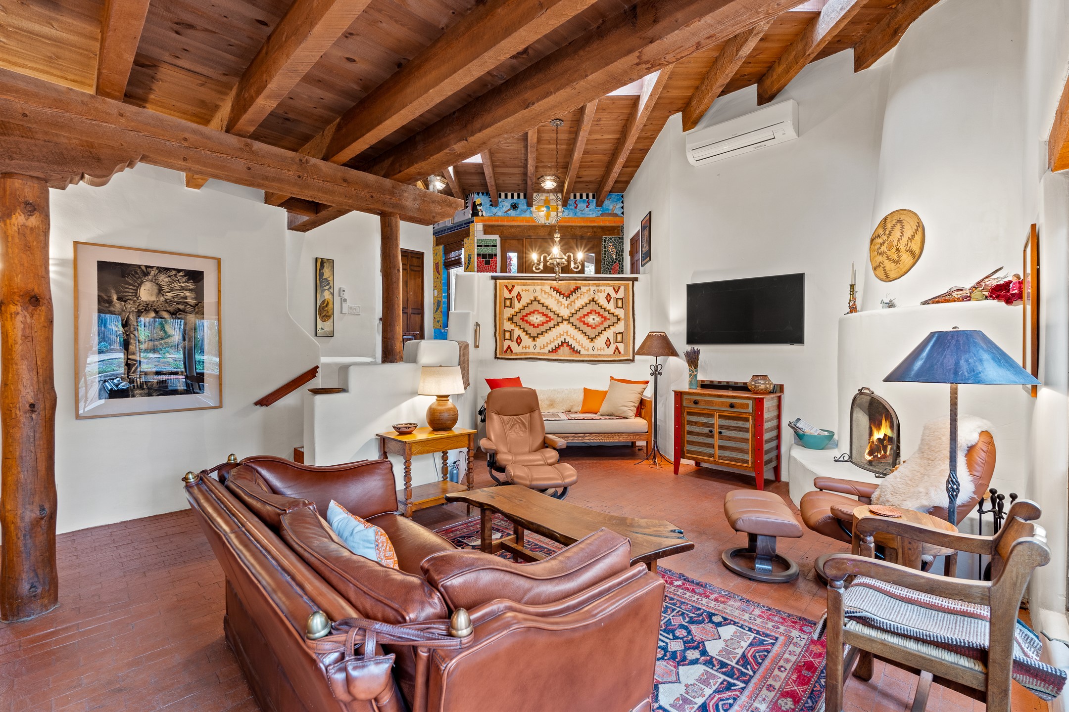 Rare opportunity to claim your slice of historic Eastside magic on Santa Fe's treasured Johnson Lane. The perfect pied--terre or a comfortable full-time residence, this beautifully cared for 3BD-2BA home (with two-car garage!) masterfully combines function with Southwest elegance. Finishes include brick and wood floors throughout, wood beams, and decorative tile work in numerous spaces. Down a modest flight of stairs, the living room offers high ceilings, bountiful natural light, and a wood-burning kiva fireplace. Outside, the fenced-in backyard offers shade from mature trees, low-fuss tiered garden beds (drip irrigation in-place), and an oversized flagstone patio for dining and outdoor leisure. The kitchen offers charm of its own--equipped with Fisher and Paykel appliances (2023), open shelving, and a custom Hopi mosaic backsplash behind the range installed by an indigenous artist. Upstairs, the primary suite is a retreat of its own with a cozy wood-burning fireplace and private outdoor balcony. Recently installed mini-splits throughout keep the home cool on hot summer days, and providesupplemental heating to the existing forced-air heating system in the colder months. Meticulously maintained, with recent roof replacement (2020), new stucco (2025), upgraded 200 Amp electrical service (2023), and many more fantastic improvements for a future homeowner to enjoy immediately. One of the most storied, quiet, streets on Santa Fe's historic Eastside, Johnson Lane offers a welcoming neighborhood, close proximity to coffee shops, restaurants, neighborhood grocery stores, and an easy stroll to famed Canyon Road.