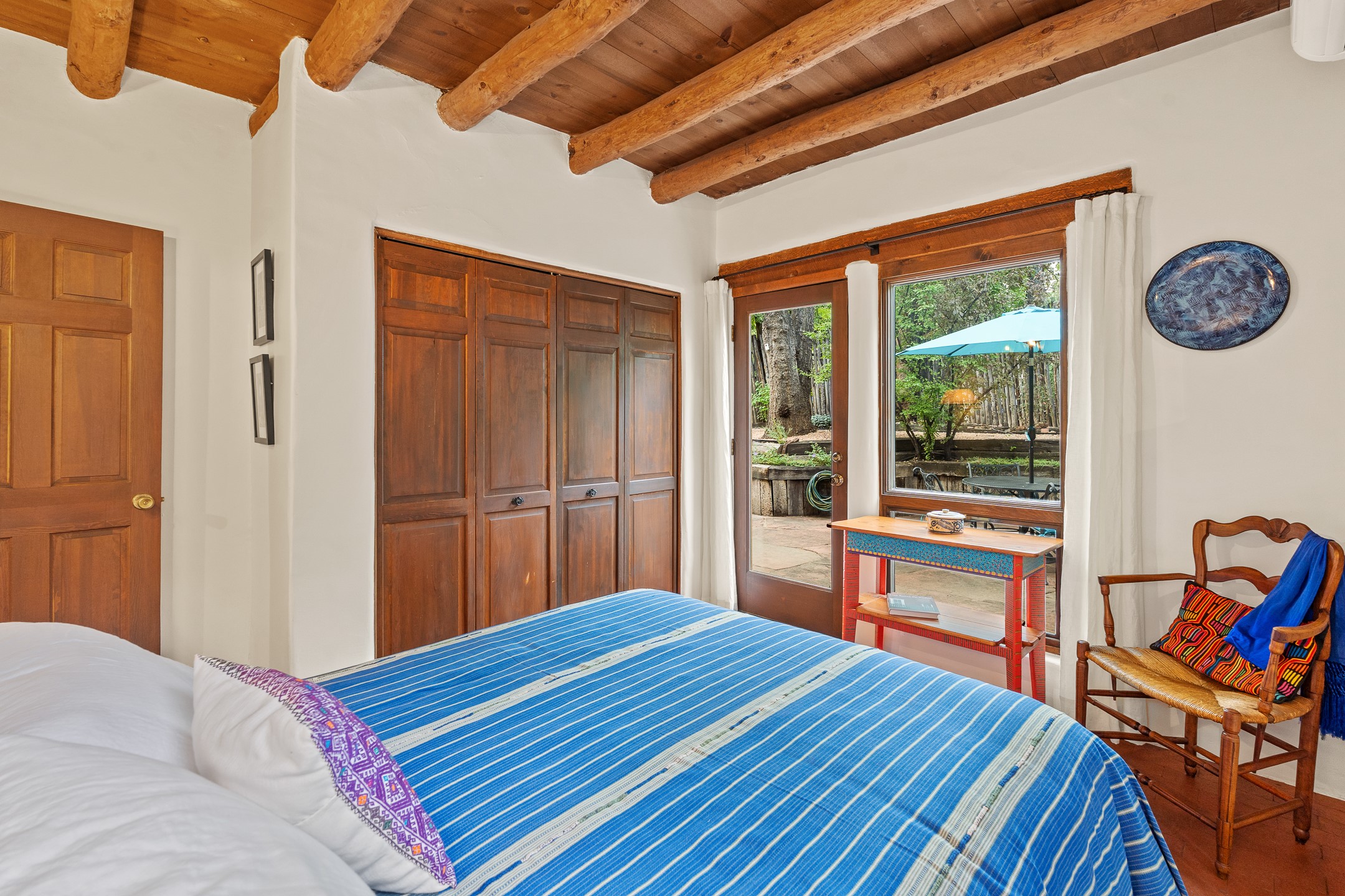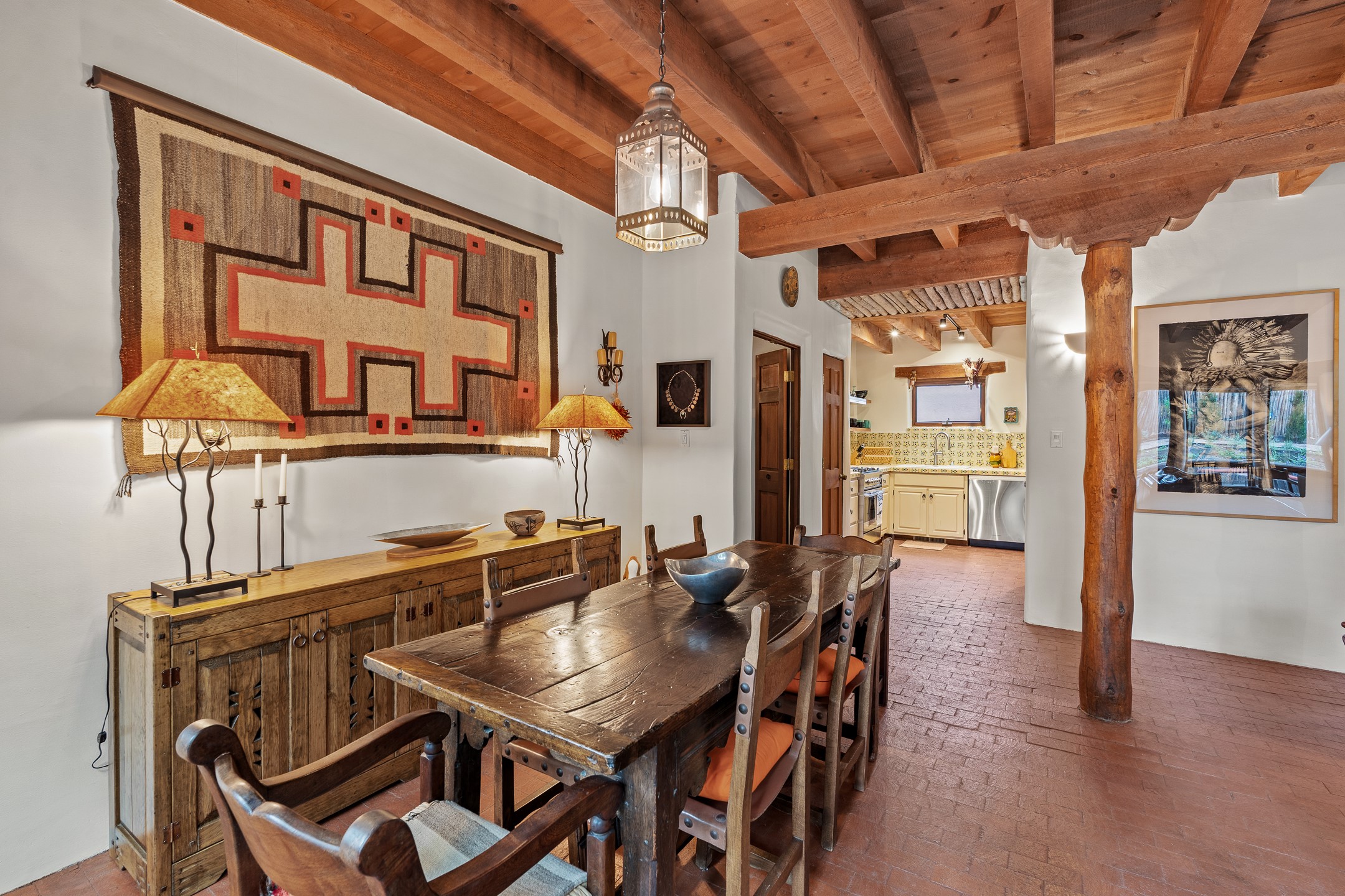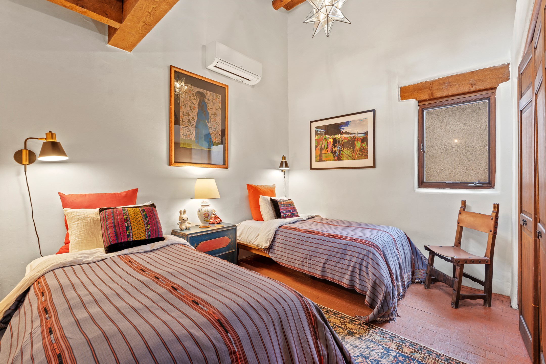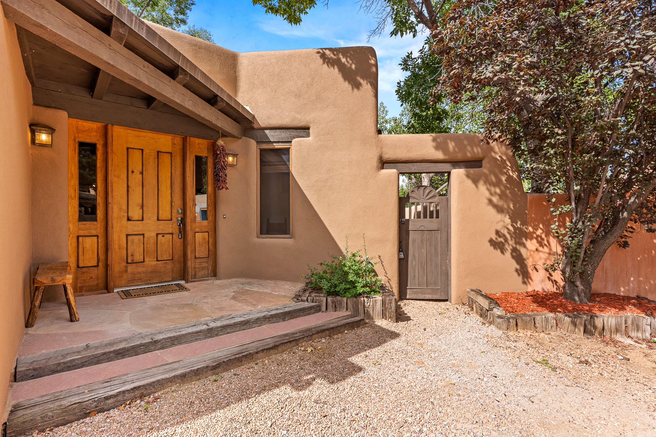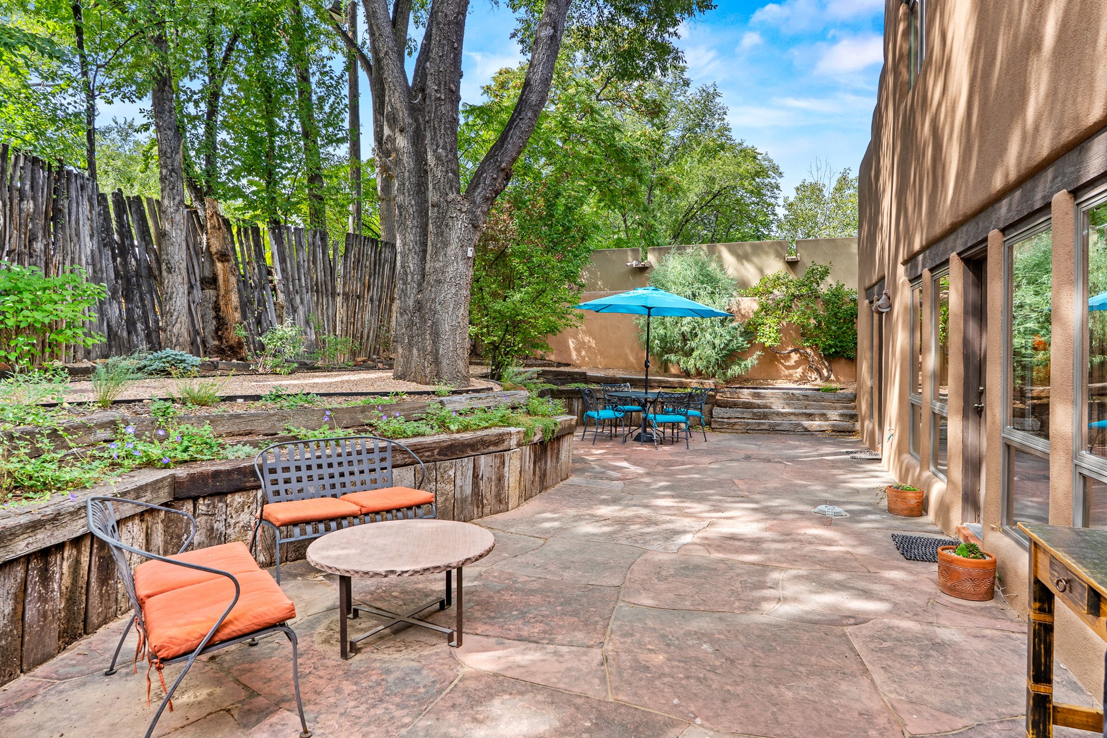 Rare opportunity to claim your slice of historic Eastside magic on Santa Fe's treasured Johnson Lane. The perfect pied--terre or a comfortable full-time residence, this beautifully cared for 3BD-2BA home (with two-car garage!) masterfully combines function with Southwest elegance. Finishes include brick and wood floors throughout, wood beams, and decorative tile work in numerous spaces. Down a modest flight of stairs, the living room offers high ceilings, bountiful natural light, and a wood-burning kiva fireplace. Outside, the fenced-in backyard offers shade from mature trees, low-fuss tiered garden beds (drip irrigation in-place), and an oversized flagstone patio for dining and outdoor leisure. The kitchen offers charm of its own--equipped with Fisher and Paykel appliances (2023), open shelving, and a custom Hopi mosaic backsplash behind the range installed by an indigenous artist. Upstairs, the primary suite is a retreat of its own with a cozy wood-burning fireplace and private outdoor balcony. Recently installed mini-splits throughout keep the home cool on hot summer days, and providesupplemental heating to the existing forced-air heating system in the colder months. Meticulously maintained, with recent roof replacement (2020), new stucco (2025), upgraded 200 Amp electrical service (2023), and many more fantastic improvements for a future homeowner to enjoy immediately. One of the most storied, quiet, streets on Santa Fe's historic Eastside, Johnson Lane offers a welcoming neighborhood, close proximity to coffee shops, restaurants, neighborhood grocery stores, and an easy stroll to famed Canyon Road.