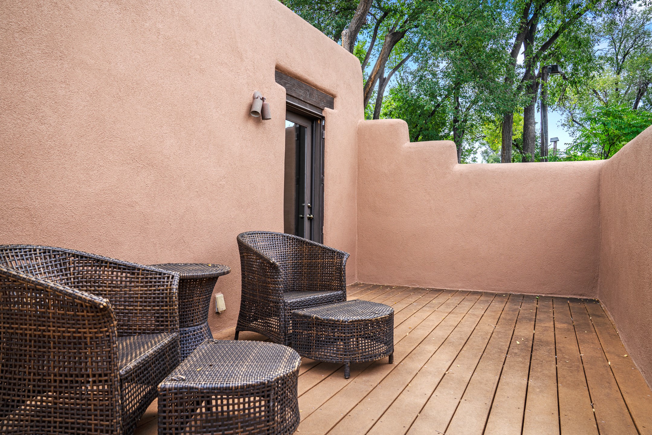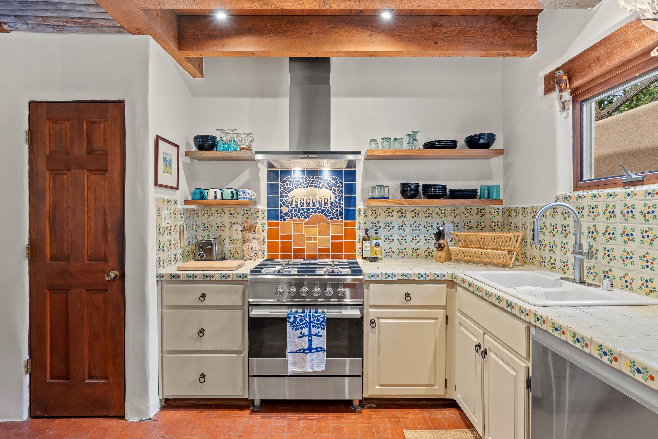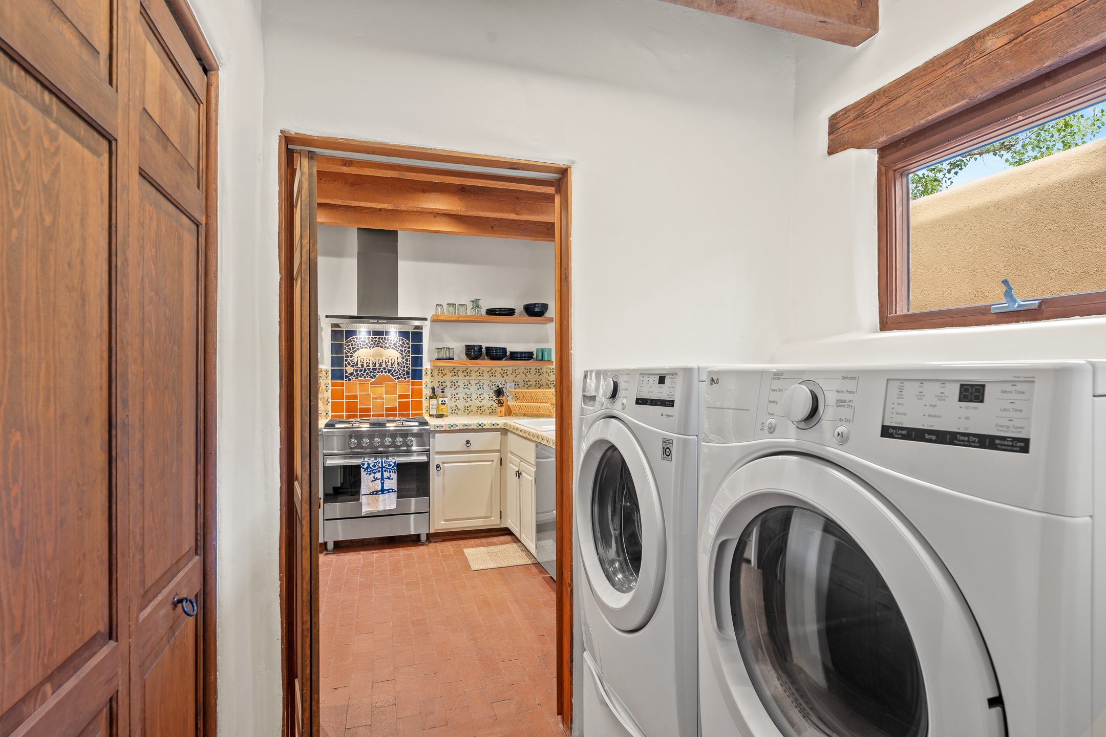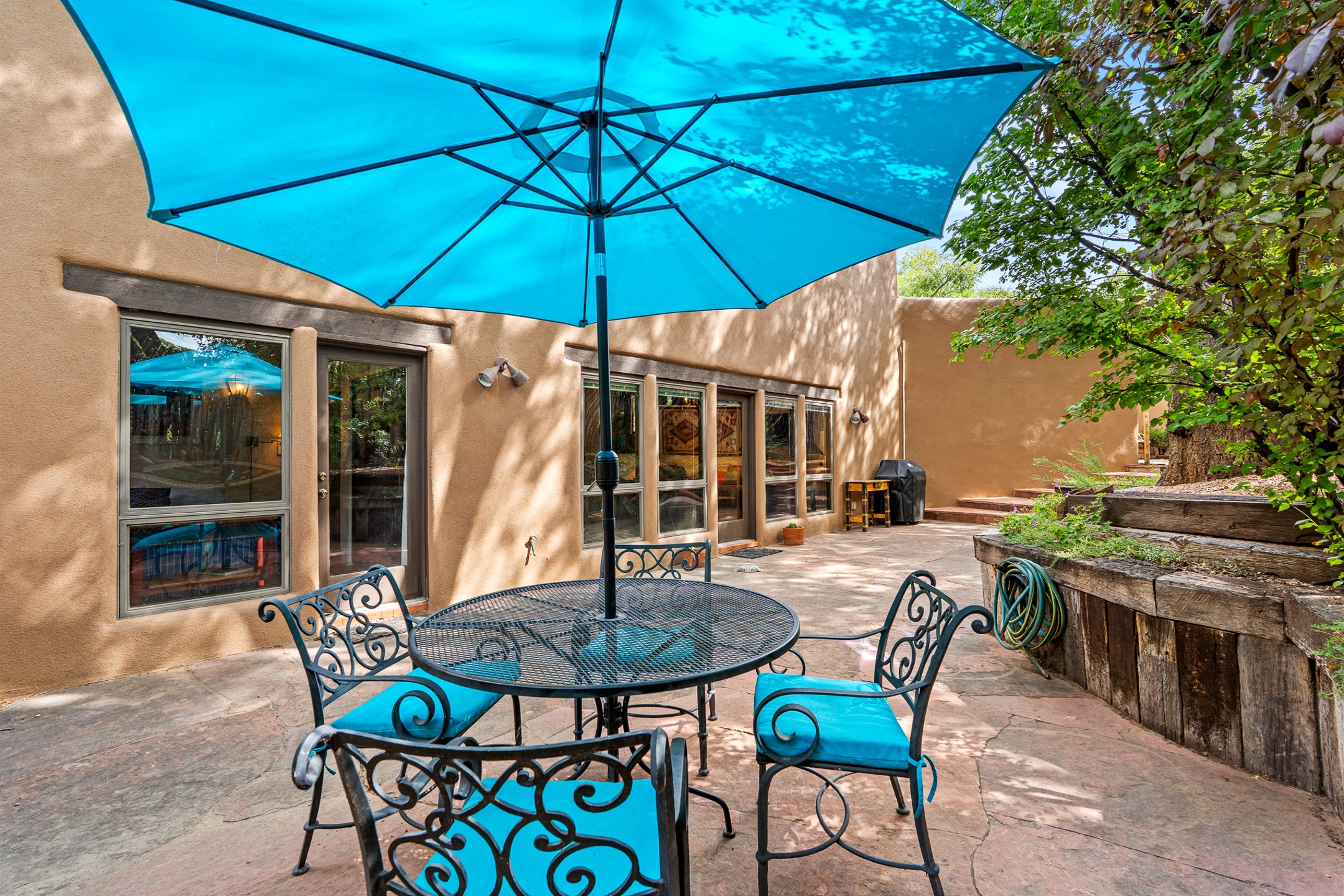 Rare opportunity to claim your slice of historic Eastside magic on Santa Fe's treasured Johnson Lane. The perfect pied--terre or a comfortable full-time residence, this beautifully cared for 3BD-2BA home (with two-car garage!) masterfully combines function with Southwest elegance. Finishes include brick and wood floors throughout, wood beams, and decorative tile work in numerous spaces. Down a modest flight of stairs, the living room offers high ceilings, bountiful natural light, and a wood-burning kiva fireplace. Outside, the fenced-in backyard offers shade from mature trees, low-fuss tiered garden beds (drip irrigation in-place), and an oversized flagstone patio for dining and outdoor leisure. The kitchen offers charm of its own--equipped with Fisher and Paykel appliances (2023), open shelving, and a custom Hopi mosaic backsplash behind the range installed by an indigenous artist. Upstairs, the primary suite is a retreat of its own with a cozy wood-burning fireplace and private outdoor balcony. Recently installed mini-splits throughout keep the home cool on hot summer days, and providesupplemental heating to the existing forced-air heating system in the colder months. Meticulously maintained, with recent roof replacement (2020), new stucco (2025), upgraded 200 Amp electrical service (2023), and many more fantastic improvements for a future homeowner to enjoy immediately. One of the most storied, quiet, streets on Santa Fe's historic Eastside, Johnson Lane offers a welcoming neighborhood, close proximity to coffee shops, restaurants, neighborhood grocery stores, and an easy stroll to famed Canyon Road.