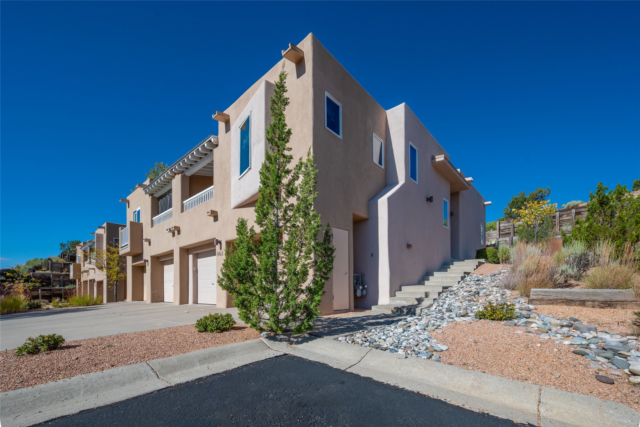 Minutes to De Vargas Mall, Down Town Plaza and Highway 285/84 .This light filled Townhome with spectacular views has it all. The open Living area features Cathedral ceilings, vigas, fireplace and walk out to private courtyard..The radiant floor heating is enhanced with refrigerated ductless A/C heat splits in living room and both upstairs bedrooms. Each Bedroom features en suite baths and the primary bedroom has its own balcony and walk in closet. Other features include skylights, nichos, and parking for guests .. Furniture for sale separately...Don't forget the oversized 2 car garage which offers extra storage space !!