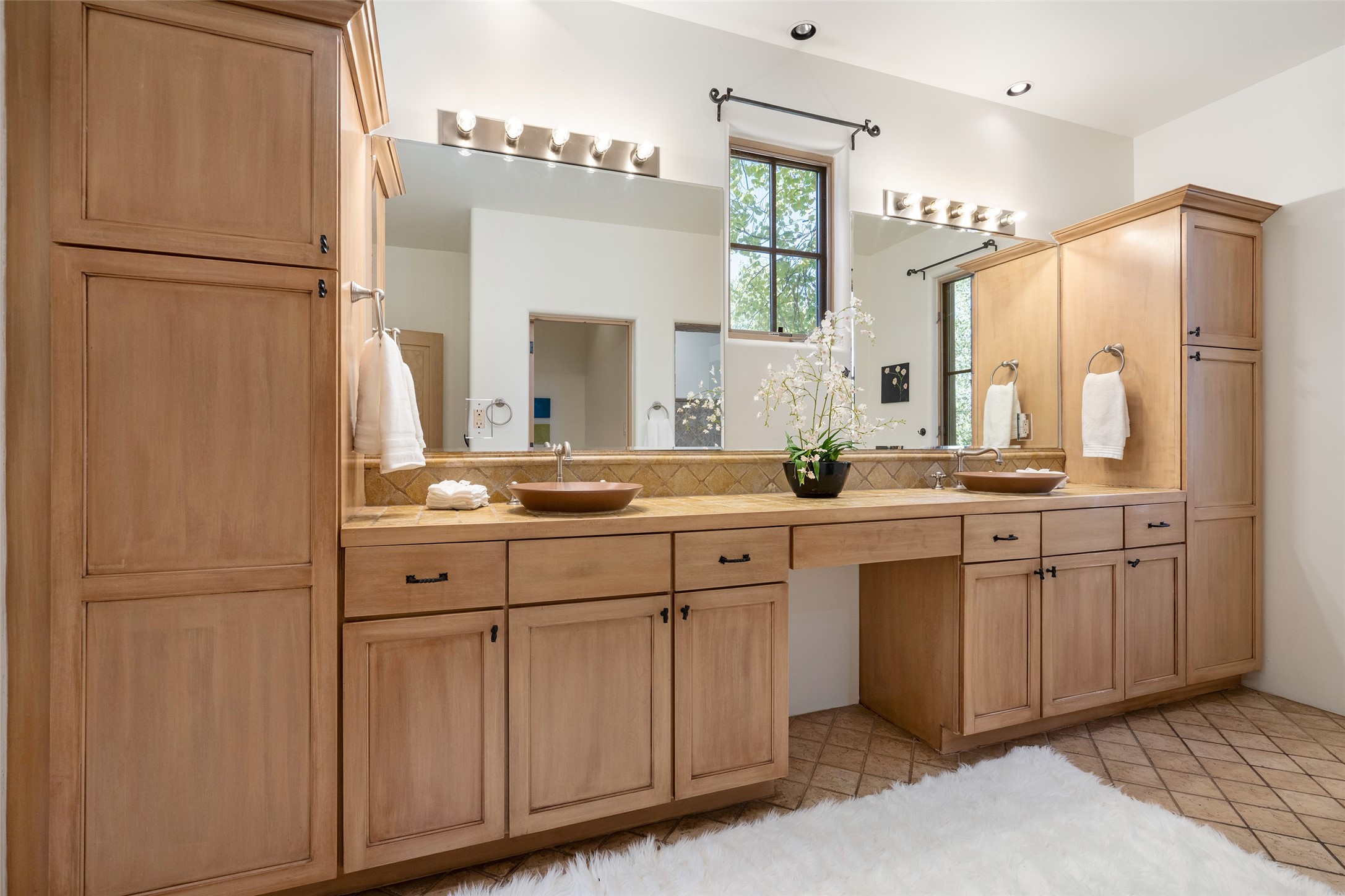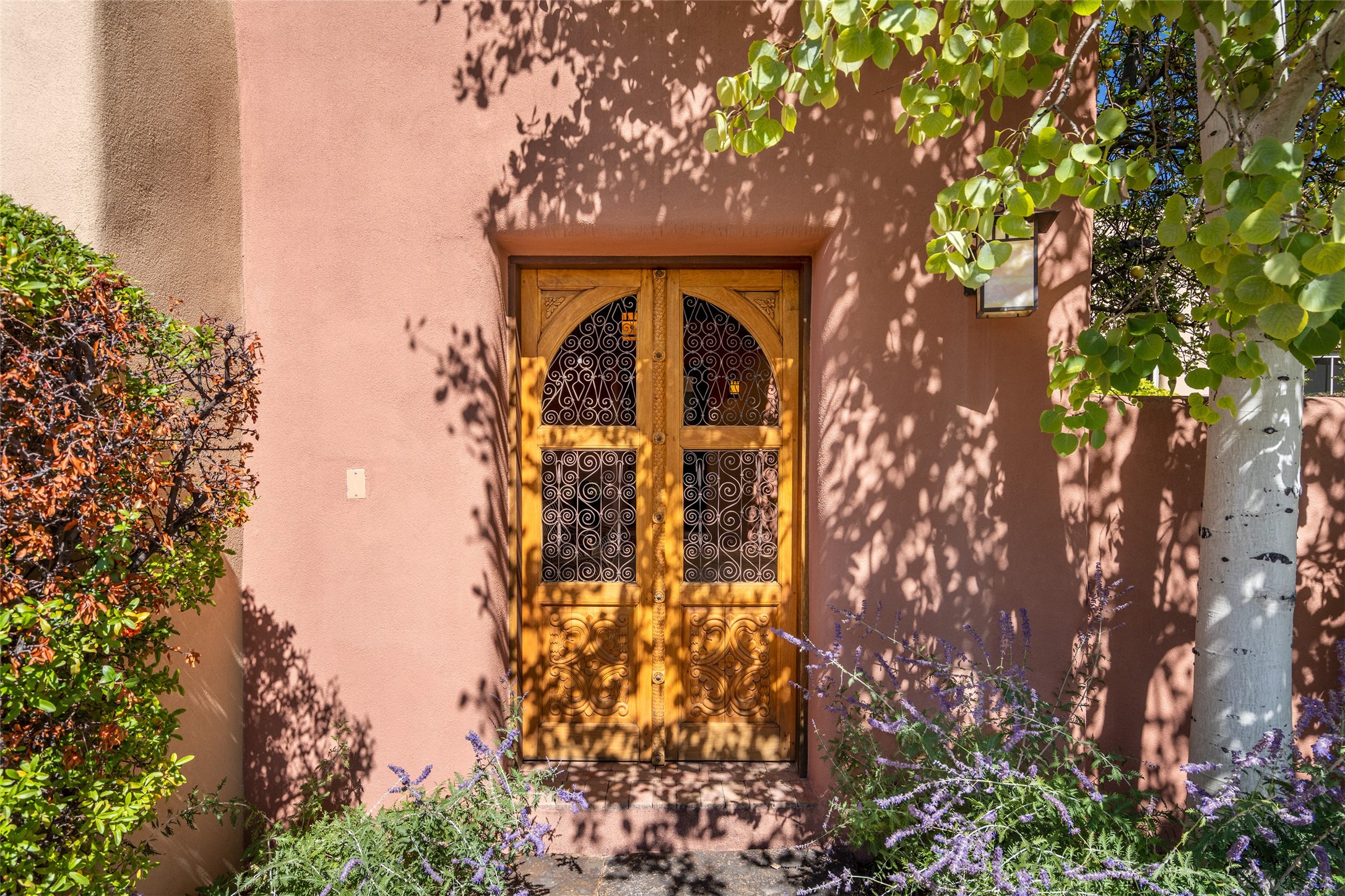 SERENE & PRIVATE SANTA FE ESTATE. Nestled on over 2 acres in one of Santa Fe's premier communities, this 4 bedroom, 4.5 bath home offers an elegant blend of scale and comfort. Thoughtfully designed for both grand entertaining and easy day-to-day living. A light filled great room with a fireplace anchors the home, while patios off nearly every room invite seamless indoor/outdoor living. The recently remodeled kitchen will delight culinary enthusiasts, and a finished office space - converted from one of the 3 garage bays - adds flexibility for today's lifestyle. The private guest addition features its own living room and en-suite, complemented by two additional guest suites each with private baths. Outdoors, a long driveway leads to two lush courtyards filled with grass flowers, trees, and shrubs, Multiple apple trees and two tranquil water features enhance the serene setting. Despite its generous footprint, the home maintains a warm, welcoming feel, filled with natural light and surrounded by native landscaping for privacy. Just minutes from downtown Santa Fe and with easy highway access, this property offers the best of Southwestern living - spacious, secluded, and perfectly situated. *This home is being sold as-is, where is*