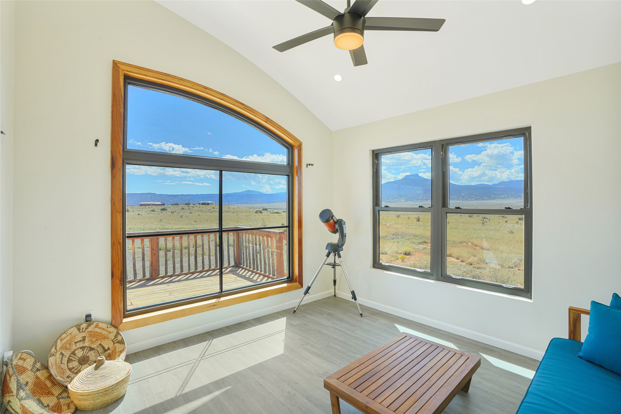 199 Private Drive 1728 in Youngsville sits on five acres with access to a private boat ramp and recreation area on Abiquiu Lake. Behind a motorized gate, the property offers both privacy and convenience. The 768-square-foot home, completed in 2020, was designed around the idea of efficient living. High ceilings, clerestory windows, and rounded corners create an easy flow through two bedrooms, a full kitchen, dining nook, living area, and three-quarter bath.Energy-efficient windows and appliances, mini-split heating and cooling, and smart-home features are already in place. The home is tied to the grid, and the solar array helps offset electric costs, with the option to add battery backup if desired. Low-flow fixtures, low or no-VOC finishes, and fire-resistant siding contribute to its durability and efficiency.The property is served by a shared well with a reverse osmosis system and a conventional septic system. From the house, the views reach across Ghost Ranch, Cerro Pedernal, and Mesa Prieta--landscapes that define northern New Mexico. With gated entry, lake access, and a home designed for efficiency, this property offers a comfortable balance between setting and design.