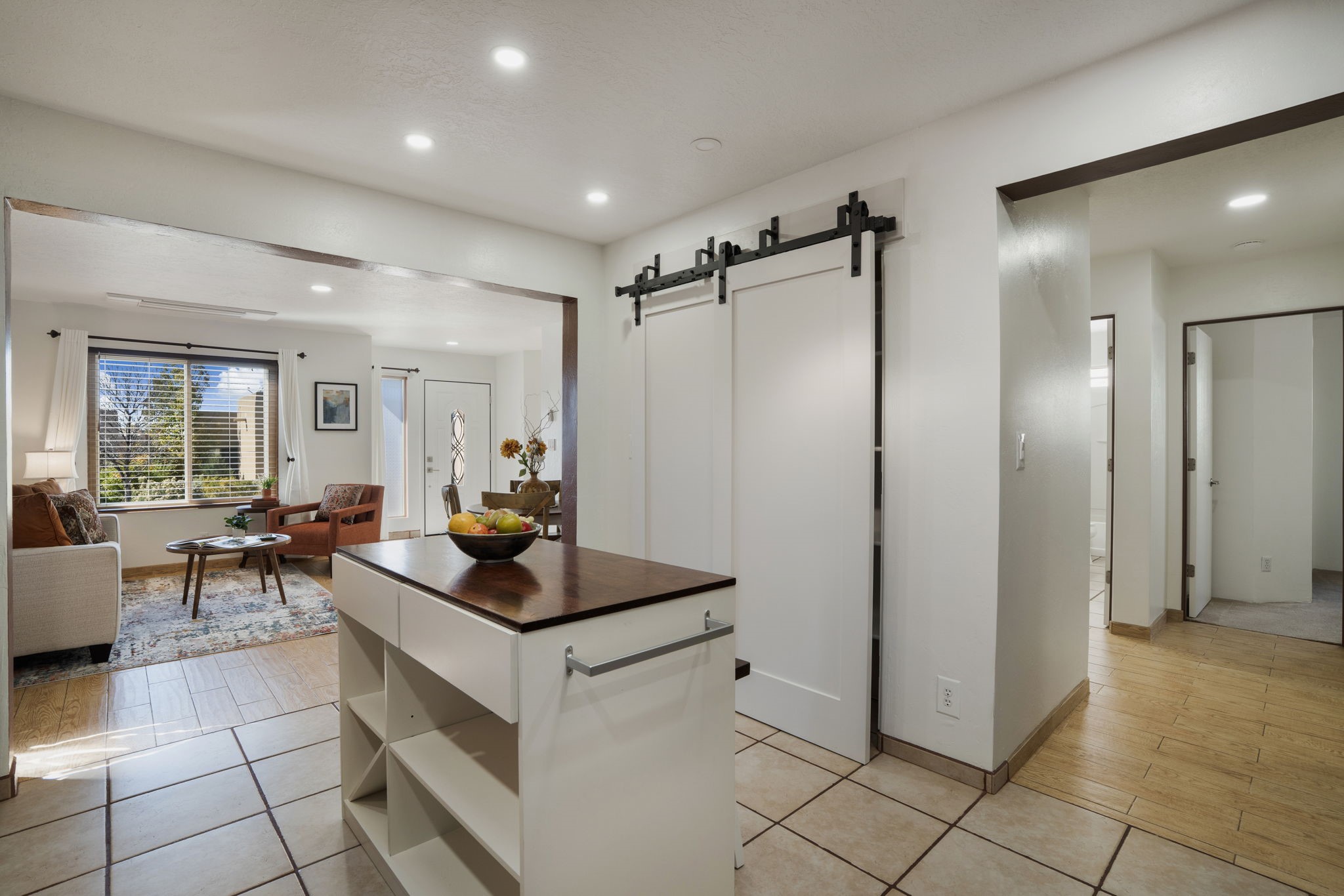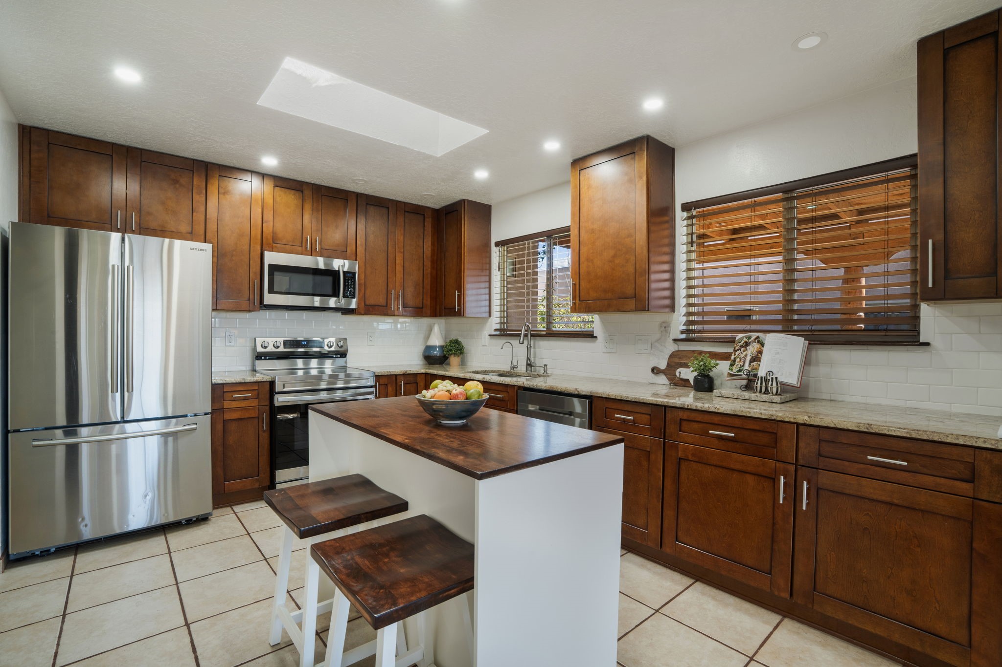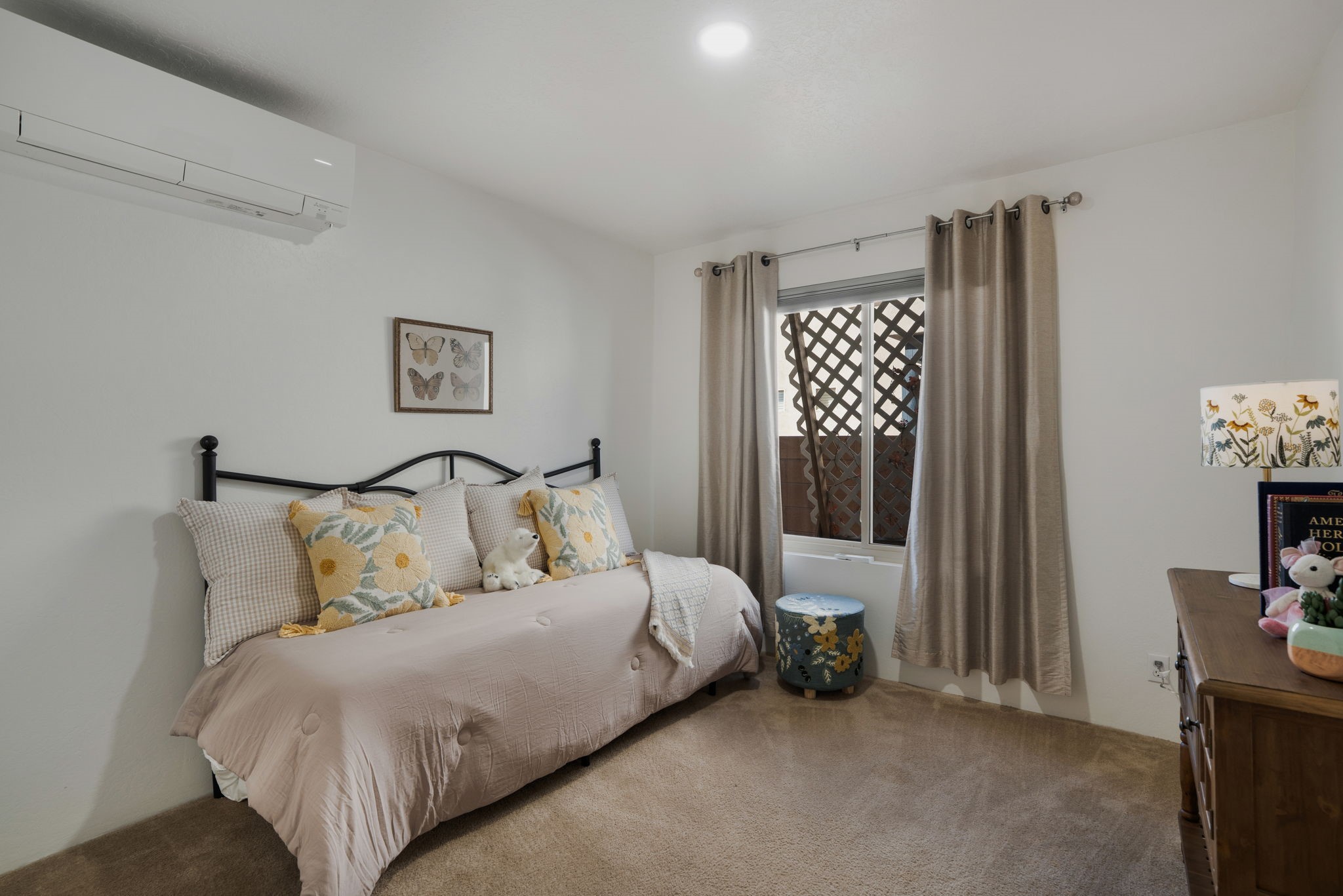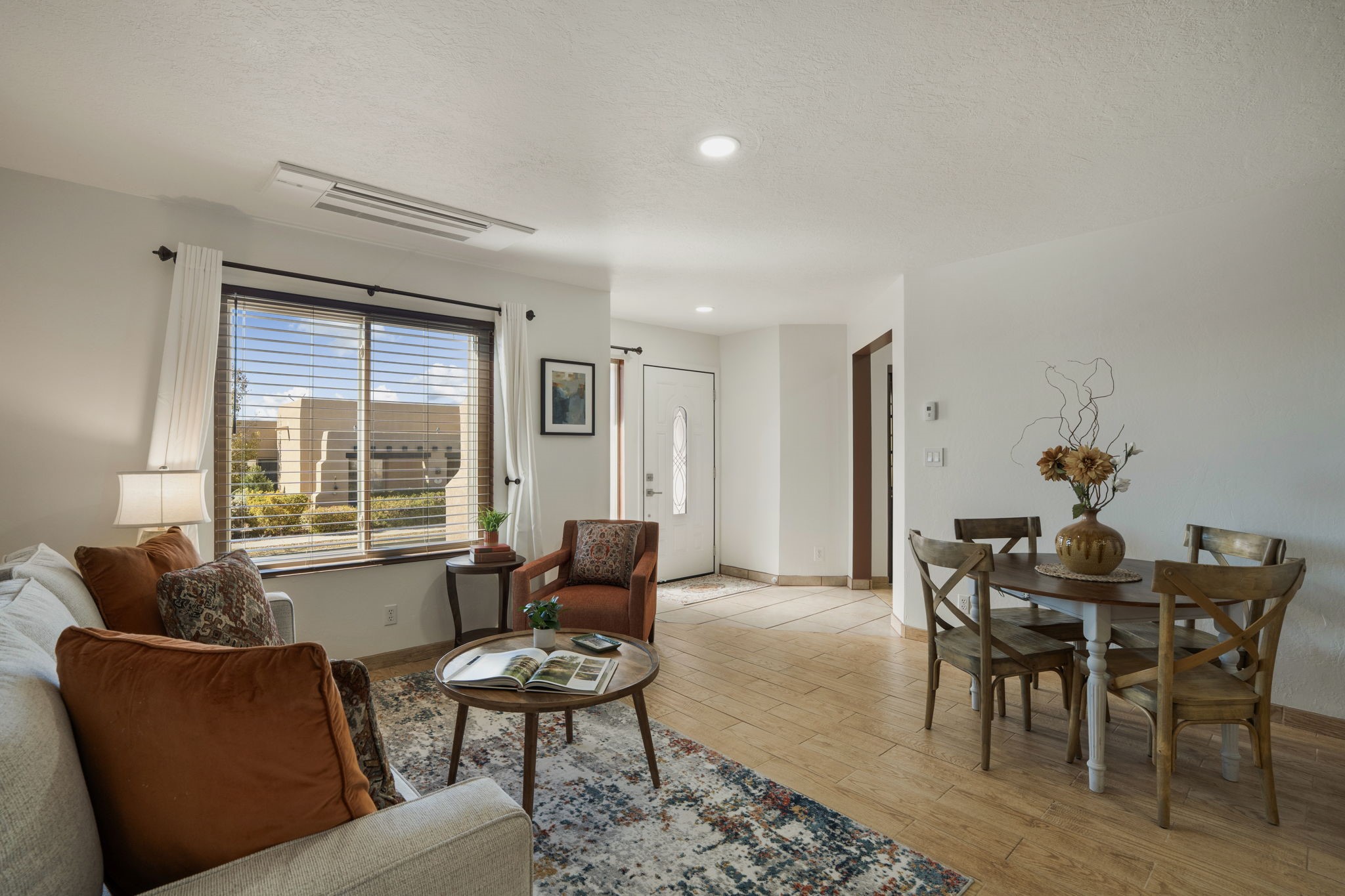 Welcome to this beautifully maintained 4-bedroom home, offering the perfect balance of modern updates and warm, inviting spaces. With 1,509 square feet of thoughtfully designed living area, this residence was built in 2006 and has been lovingly upgraded for efficiency and style.Step inside to a light-filled living room featuring elegant wood-look tile floors, inset lighting, and a seamless flow to the outdoors. A door leads to a large covered portal, running almost the entire length of the house, where carved wooden posts add a touch of timeless Southwestern character--perfect for relaxing or entertaining.At the heart of the home is a fabulous kitchen designed for both everyday living and culinary creativity. Enjoy granite countertops, a large, movable kitchen cart that functions beautifully as a central island, and stainless steel appliances that shine beneath newer skylights. The electric stove, subway tile backsplash, and beautiful cabinetry create a clean, contemporary aesthetic, while a large pantry with charming barn doors keeps everything neatly organized.The primary bedroom is a spacious retreat with three large windows that fill the room with natural light. The ensuite bath has been tastefully remodeled, offering a spa-like atmosphere, and the walk-in closet provides ample storage. All bedrooms feature plush carpeting for personalized comfort.This home is as efficient as it is beautiful, boasting a whole house solar electric system that also powers the mini splits in the 4 bedrooms and living room (fully paid off), a foam roof with membrane (4-5 years old), newer skylights, radiant in-floor heating, a 5-year-old boiler, and a 5-year-old gas water heater. The attached two-car garage at the back of the home adds convenience and privacy.With its combination of thoughtful upgrades, energy efficiency, and inviting style, this home truly offers the best of modern Southwestern living in the delightful Rancho Viejo neighborhood, replete with mountain views, walking trails and lots of open space.
