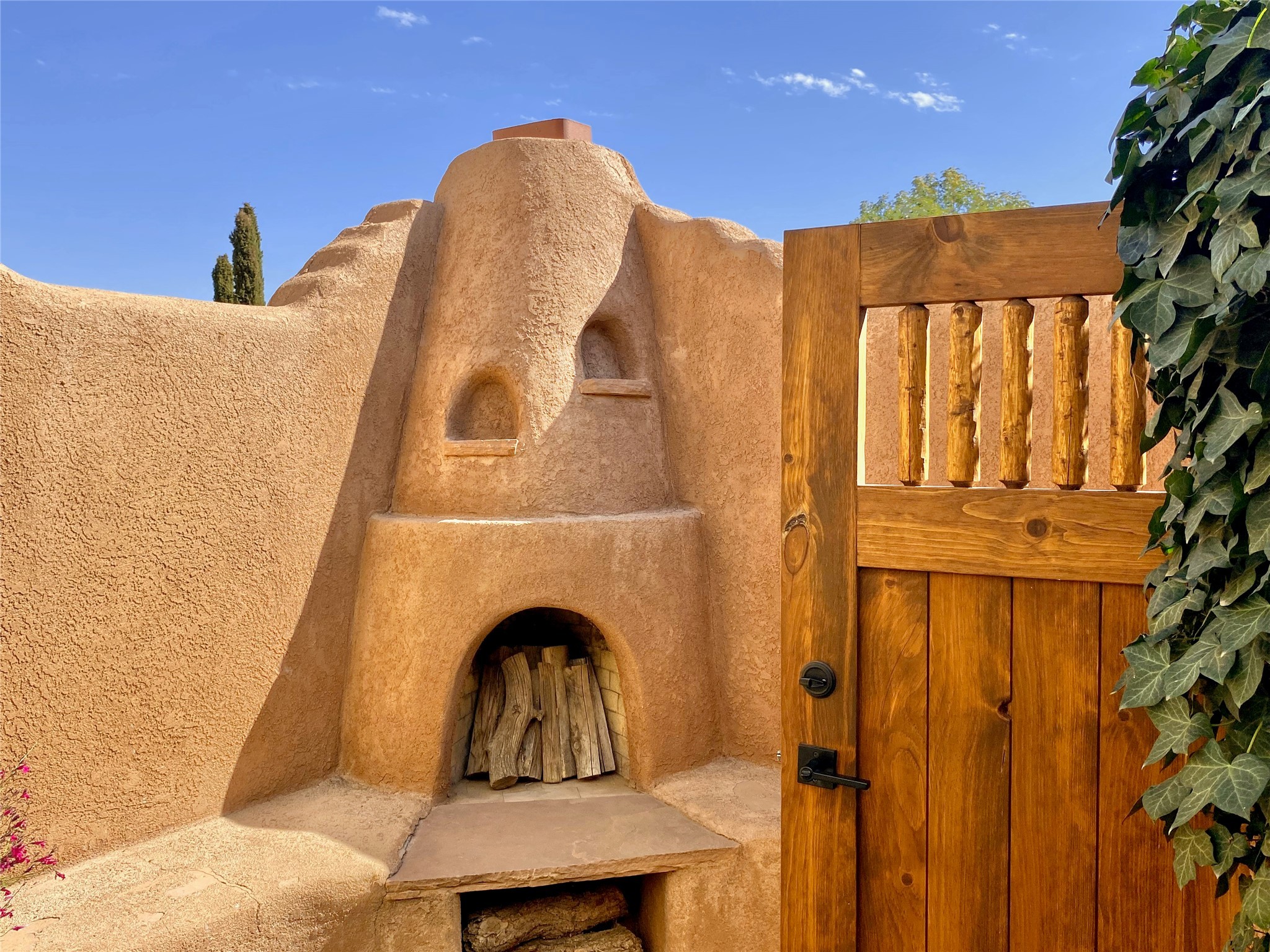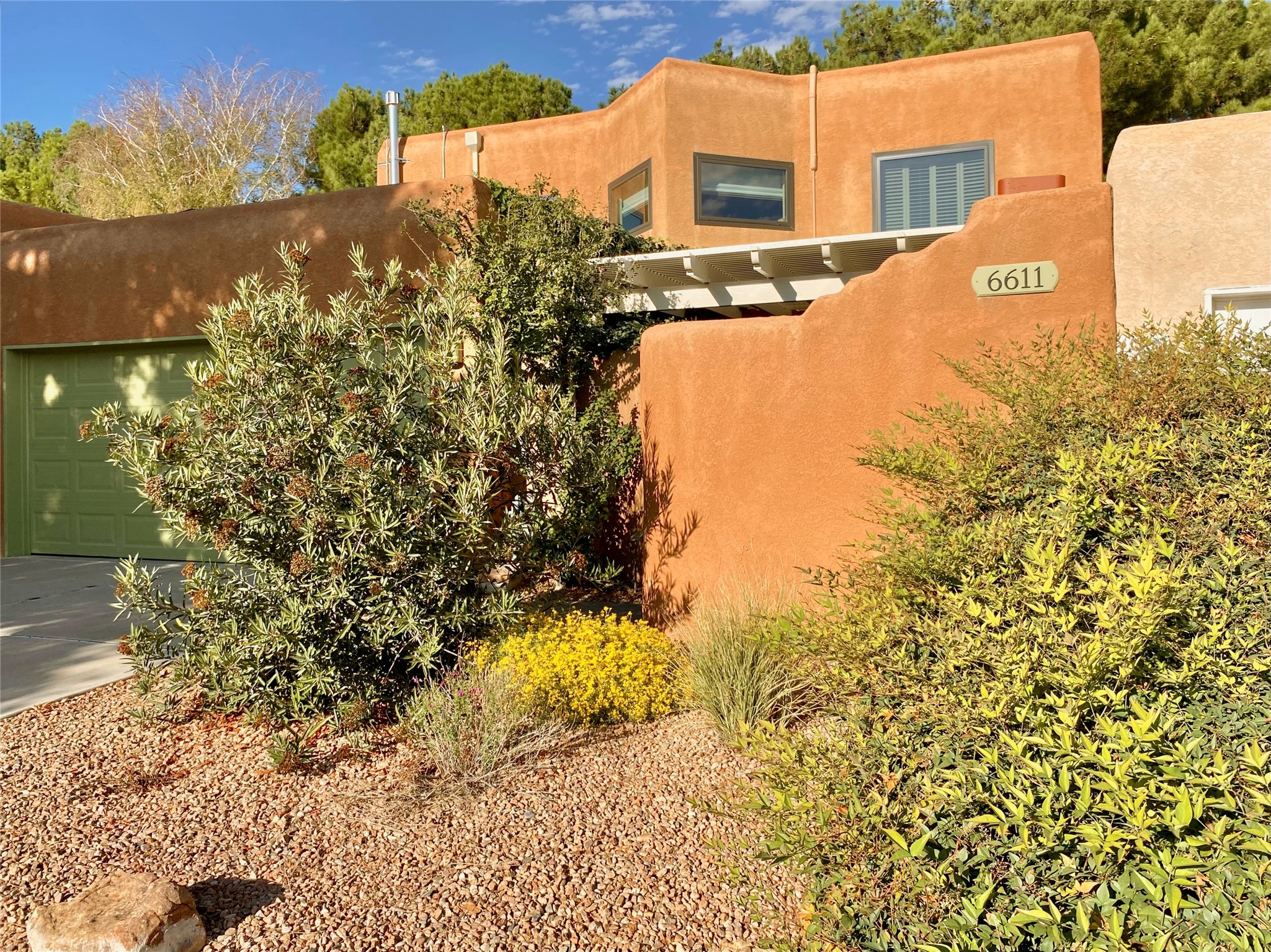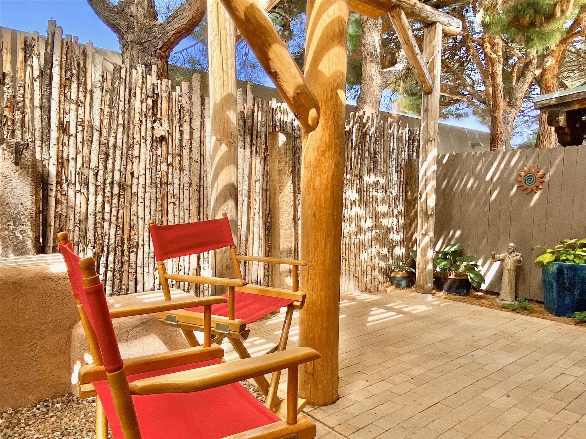 NEW MEXICO TRUE in a quiet, desirable North Valley enclave. This gem has it all, Solar Power, Refrigerated Air, TPO Roof, Granite Countertops, New Windows and 2-Car Garage with storage. The front courtyard secret garden has a custom shade structure, outdoor fireplace, water feature and rain collection tank. The artisan wood carved entry door welcomes you to a unique high desert interior with plenty of artistic touches. The Great Room has double height beamed ceilings, and gas kiva and an Open Kitchen with custom cabinetry and granite countertops. Plus 1 Bedroom and Laundry Room with great storage; a Full Bath and a Backyard perfect for entertaining! The custom spiral staircase leads you to an oversize Bedroom Suite with large Bath, Walk-In Closet, TV Nook and Office with Sandia views!