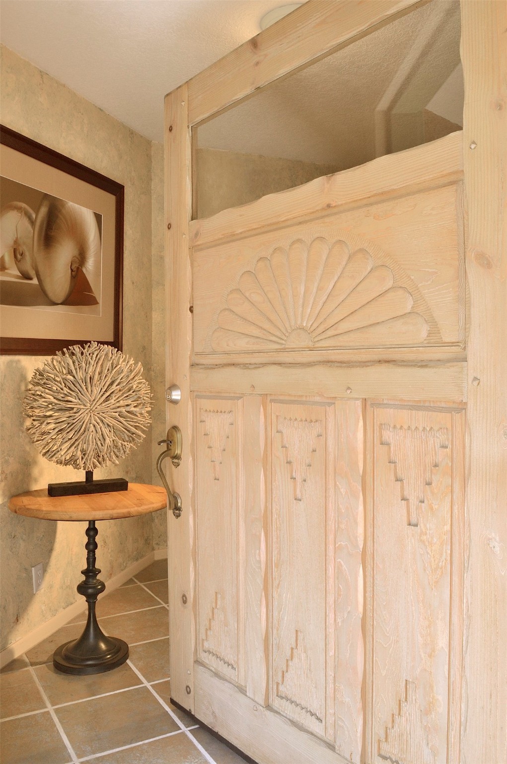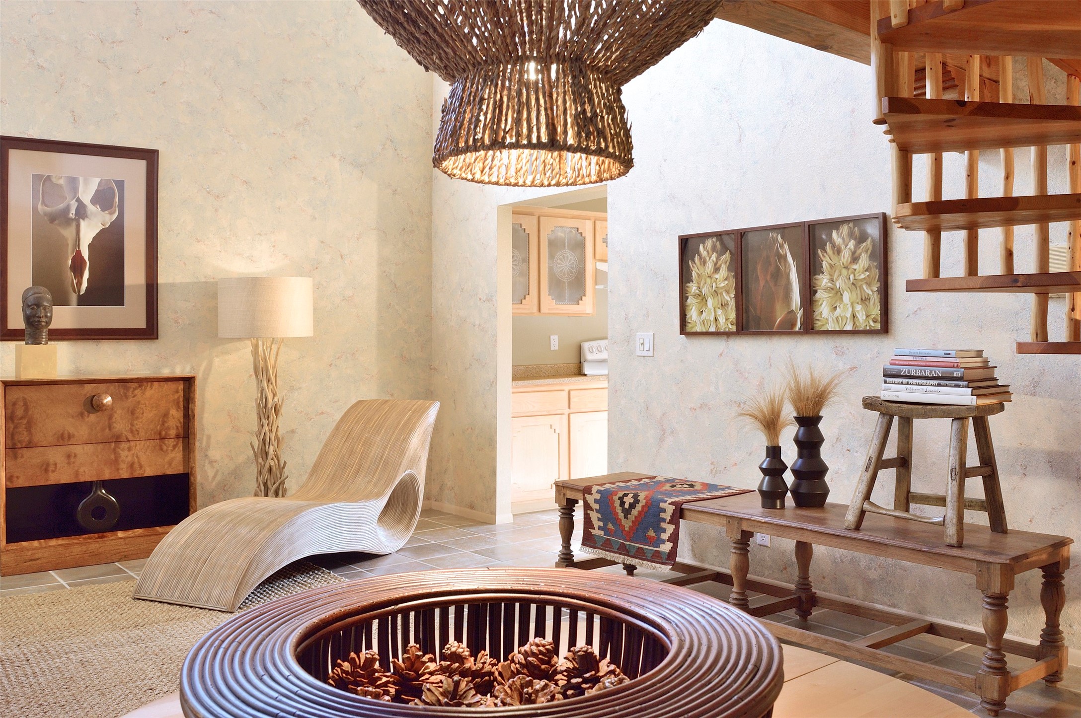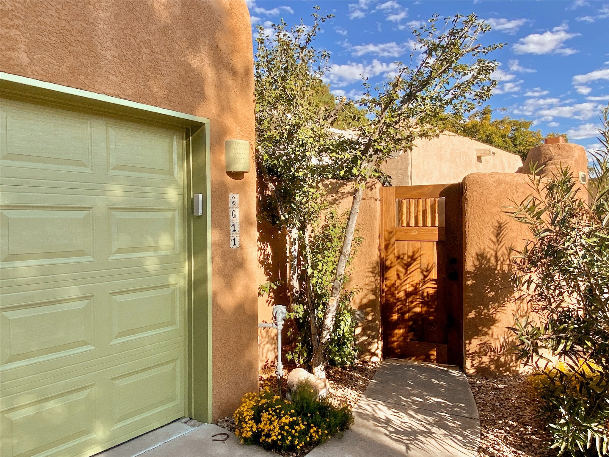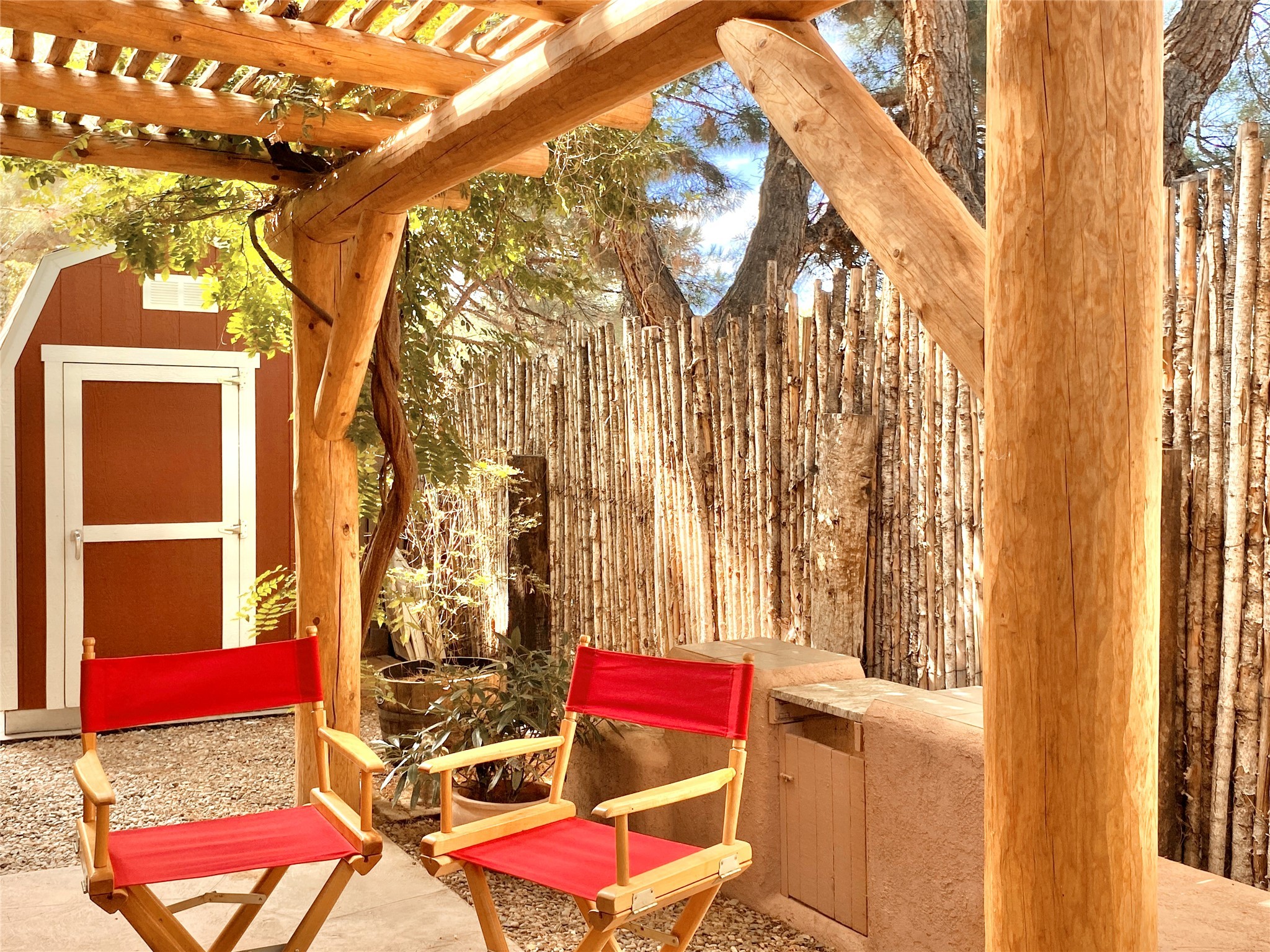 NEW MEXICO TRUE in a quiet, desirable North Valley enclave. This gem has it all, Solar Power, Refrigerated Air, TPO Roof, Granite Countertops, New Windows and 2-Car Garage with storage. The front courtyard secret garden has a custom shade structure, outdoor fireplace, water feature and rain collection tank. The artisan wood carved entry door welcomes you to a unique high desert interior with plenty of artistic touches. The Great Room has double height beamed ceilings, and gas kiva and an Open Kitchen with custom cabinetry and granite countertops. Plus 1 Bedroom and Laundry Room with great storage; a Full Bath and a Backyard perfect for entertaining! The custom spiral staircase leads you to an oversize Bedroom Suite with large Bath, Walk-In Closet, TV Nook and Office with Sandia views!