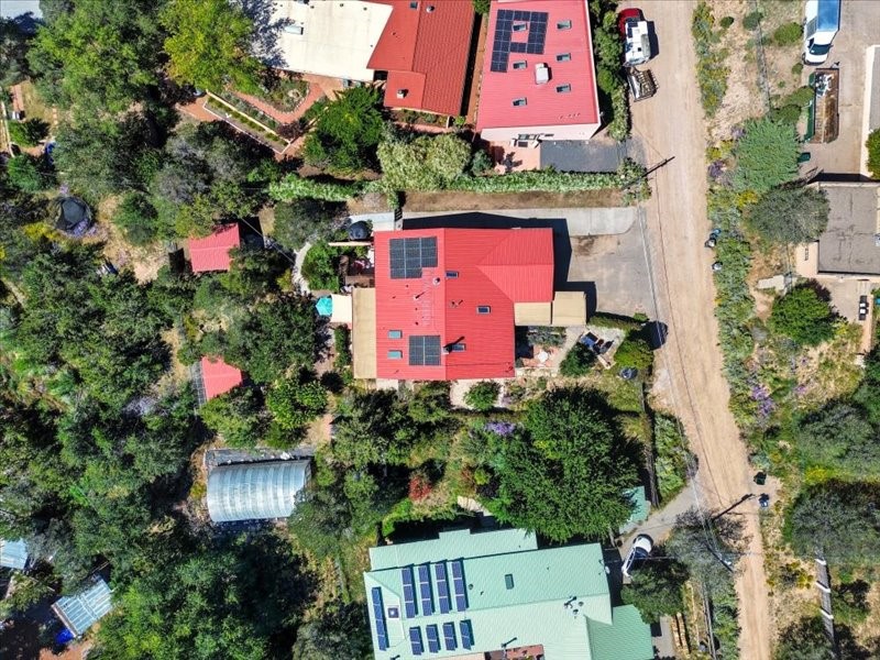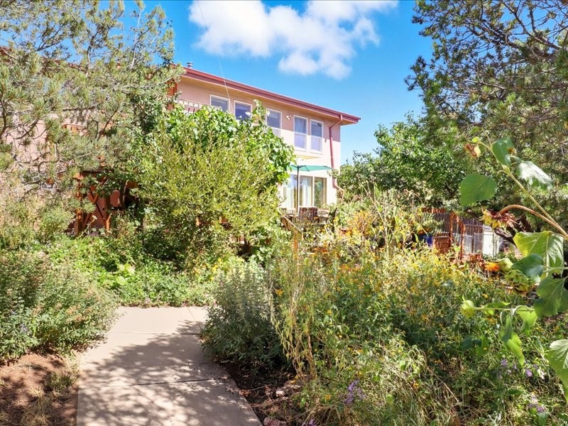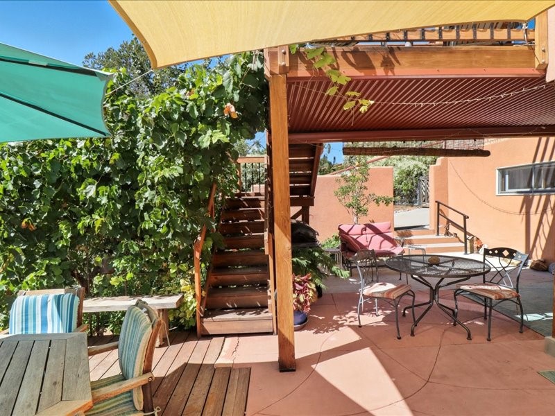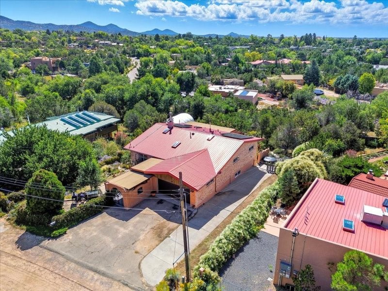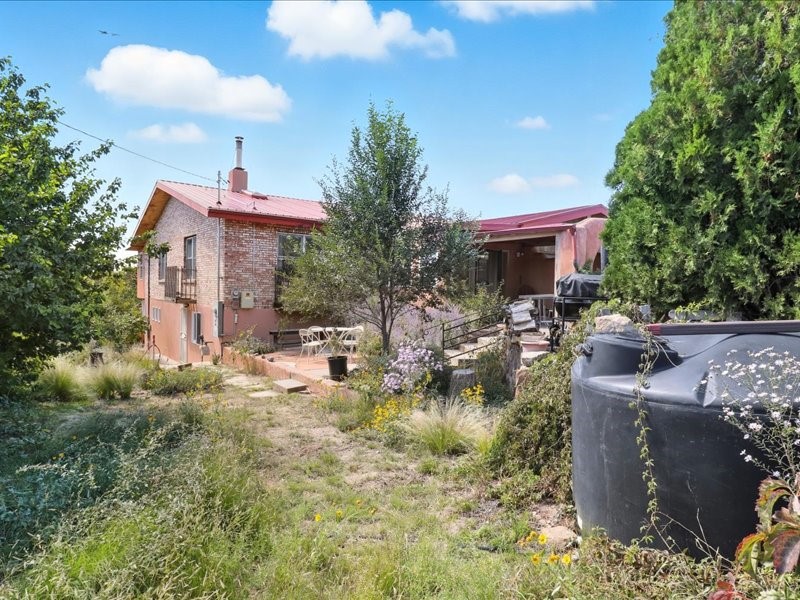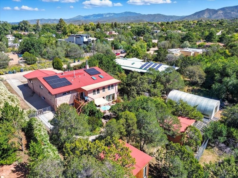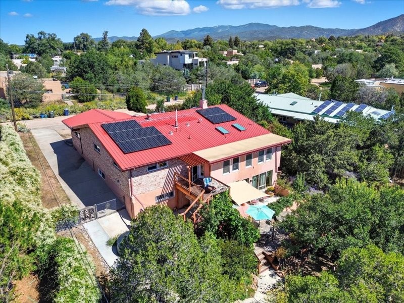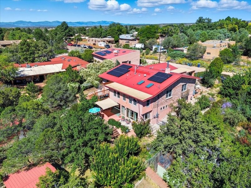 Welcome to this exceptional Santa Fe property, where classic brick construction meets timeless character and thoughtful updates. With 3242 sq ft of well-designed space, the property offers two connected but separate living quarters plus a charming studio, ideal for multigenerational living, rental income, or guest accommodations. Set on a lush, private lot, this is a true garden sanctuary, boasting a pitched metal roof, inviting brick exterior, fruit trees, greenhouse, water rights, and both city and well water. Multiple porches and patios extend the living space outdoors, perfect for enjoying Santa Fe's blue skies, and endless sunsets. A sustainable grey water system nourishes the gardens, while solar panels add efficiency. The upper 3-bedroom residence offers soaring ceilings with wood beams, recessed lighting, windows framing mountain views, and a striking interior rock wall with wood stove, brings rustic charm. Tile and laminate floors flow throughout. The primary suite features a full bath, while a second bath serves guests. A south-facing porch captures warmth and light.The lower 3-bedroom residence highlights warm wood details, butcher block and steel counters, and new windows. The primary suite has a walk-in closet, patio access, and en-suite bath. Multiple heating zones, gas stove, and ceiling fans ensure year-round comfort. Additional highlights include 6 heating zones, established rental history, and a flexible design perfect for live/rent or guest accommodations. A separate utility meter enhances rental potential. Completing the property is a detached studio, perfect for an artist studio or private retreat. With it's brick exterior, solar power, greenhouse, gardens, fruit trees, patios, hot tub, 2 car garage, ample storage, and mountain views, this home embodies the Santa Fe lifestyle. Whether envisioned as a family compound, income-producing property, or serene retreat, it offers unmatched character, flexibility, and lasting value.