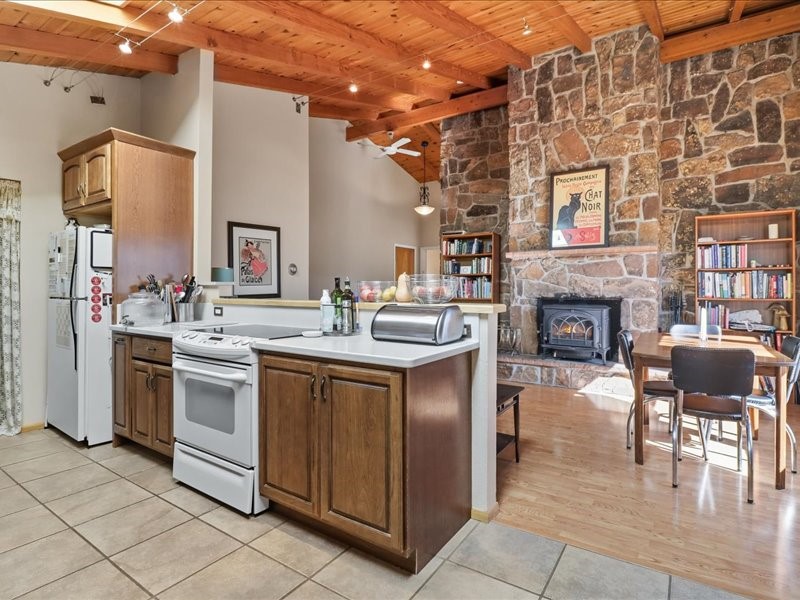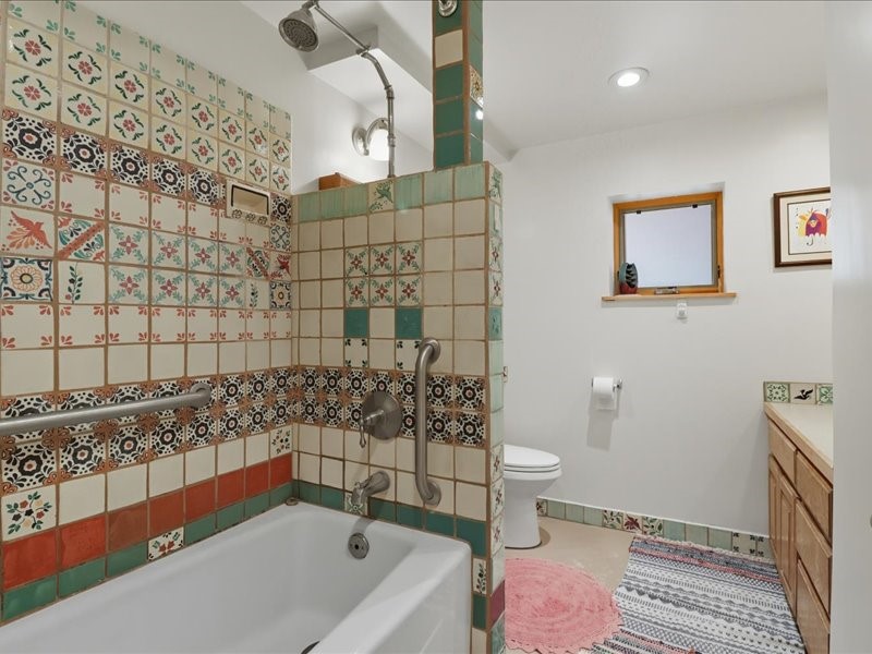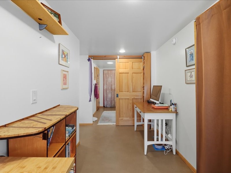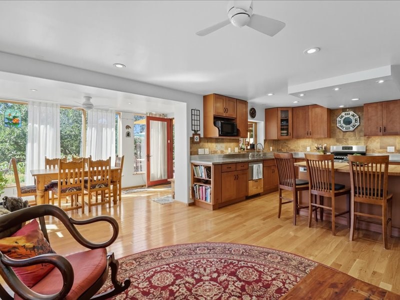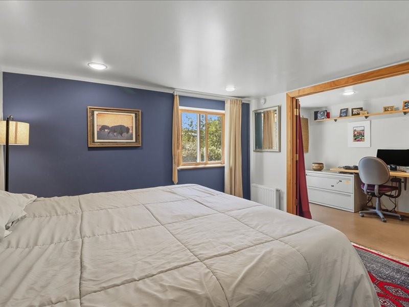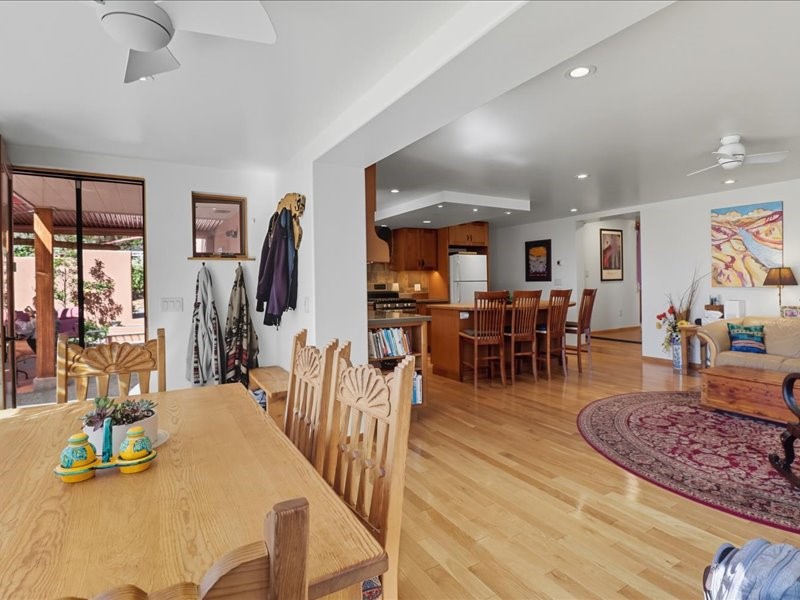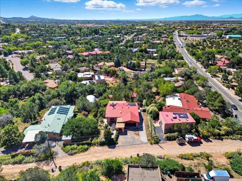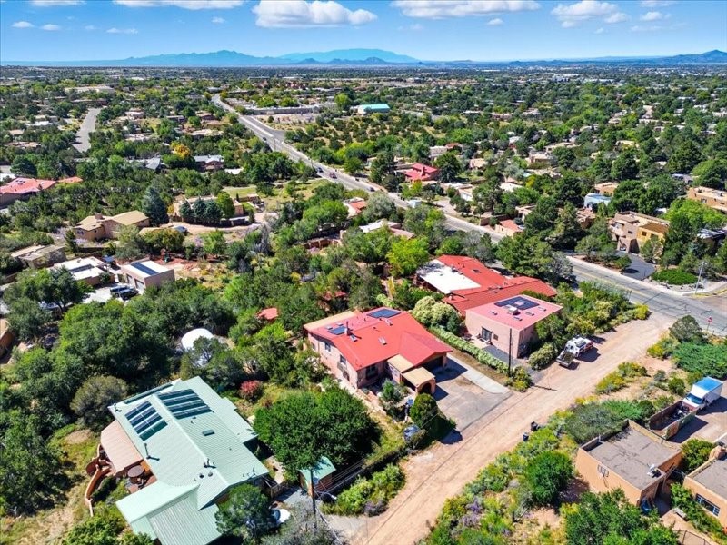 Welcome to this exceptional Santa Fe property, where classic brick construction meets timeless character and thoughtful updates. With 3242 sq ft of well-designed space, the property offers two connected but separate living quarters plus a charming studio, ideal for multigenerational living, rental income, or guest accommodations. Set on a lush, private lot, this is a true garden sanctuary, boasting a pitched metal roof, inviting brick exterior, fruit trees, greenhouse, water rights, and both city and well water. Multiple porches and patios extend the living space outdoors, perfect for enjoying Santa Fe's blue skies, and endless sunsets. A sustainable grey water system nourishes the gardens, while solar panels add efficiency. The upper 3-bedroom residence offers soaring ceilings with wood beams, recessed lighting, windows framing mountain views, and a striking interior rock wall with wood stove, brings rustic charm. Tile and laminate floors flow throughout. The primary suite features a full bath, while a second bath serves guests. A south-facing porch captures warmth and light.The lower 3-bedroom residence highlights warm wood details, butcher block and steel counters, and new windows. The primary suite has a walk-in closet, patio access, and en-suite bath. Multiple heating zones, gas stove, and ceiling fans ensure year-round comfort. Additional highlights include 6 heating zones, established rental history, and a flexible design perfect for live/rent or guest accommodations. A separate utility meter enhances rental potential. Completing the property is a detached studio, perfect for an artist studio or private retreat. With it's brick exterior, solar power, greenhouse, gardens, fruit trees, patios, hot tub, 2 car garage, ample storage, and mountain views, this home embodies the Santa Fe lifestyle. Whether envisioned as a family compound, income-producing property, or serene retreat, it offers unmatched character, flexibility, and lasting value.