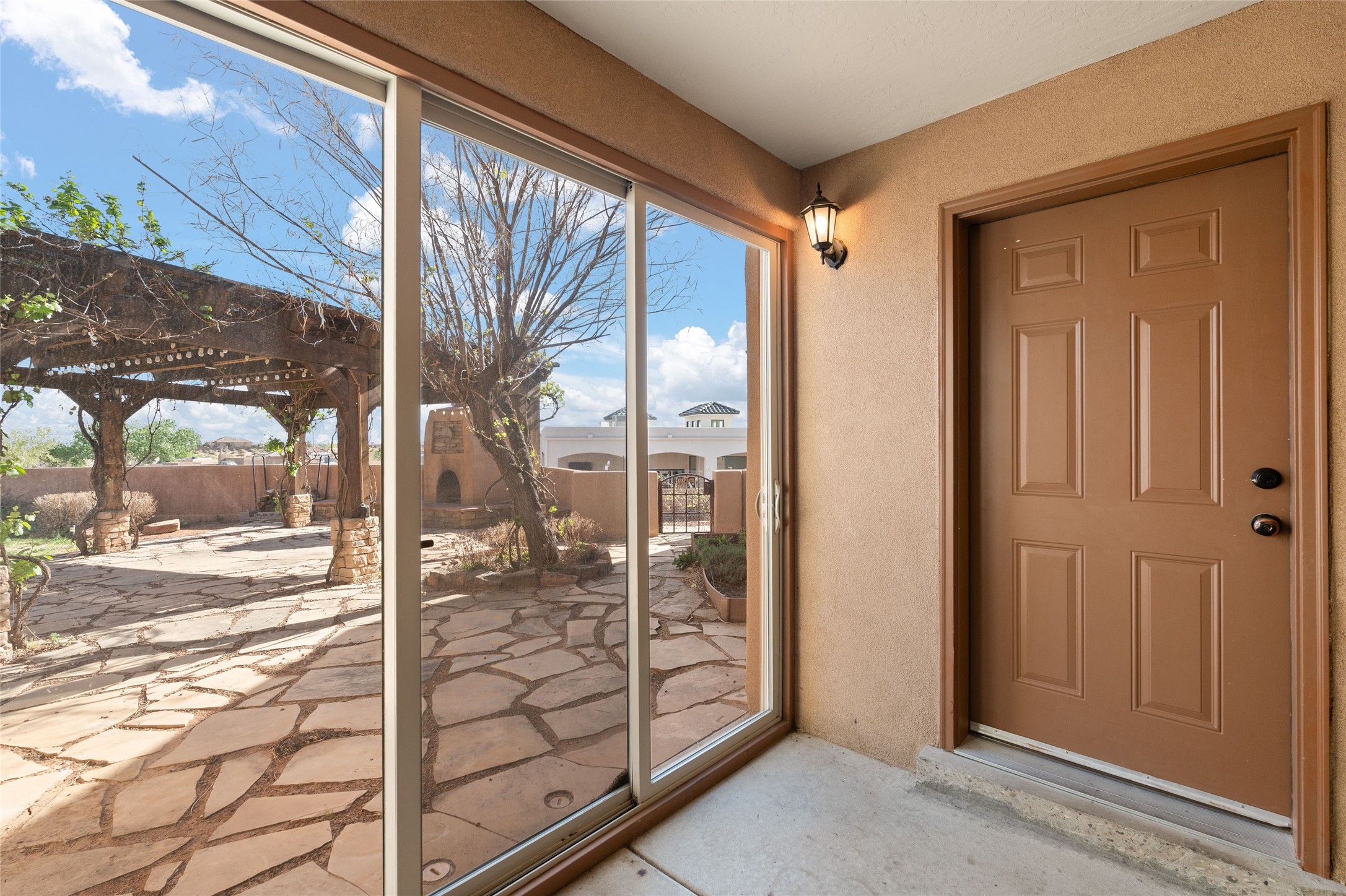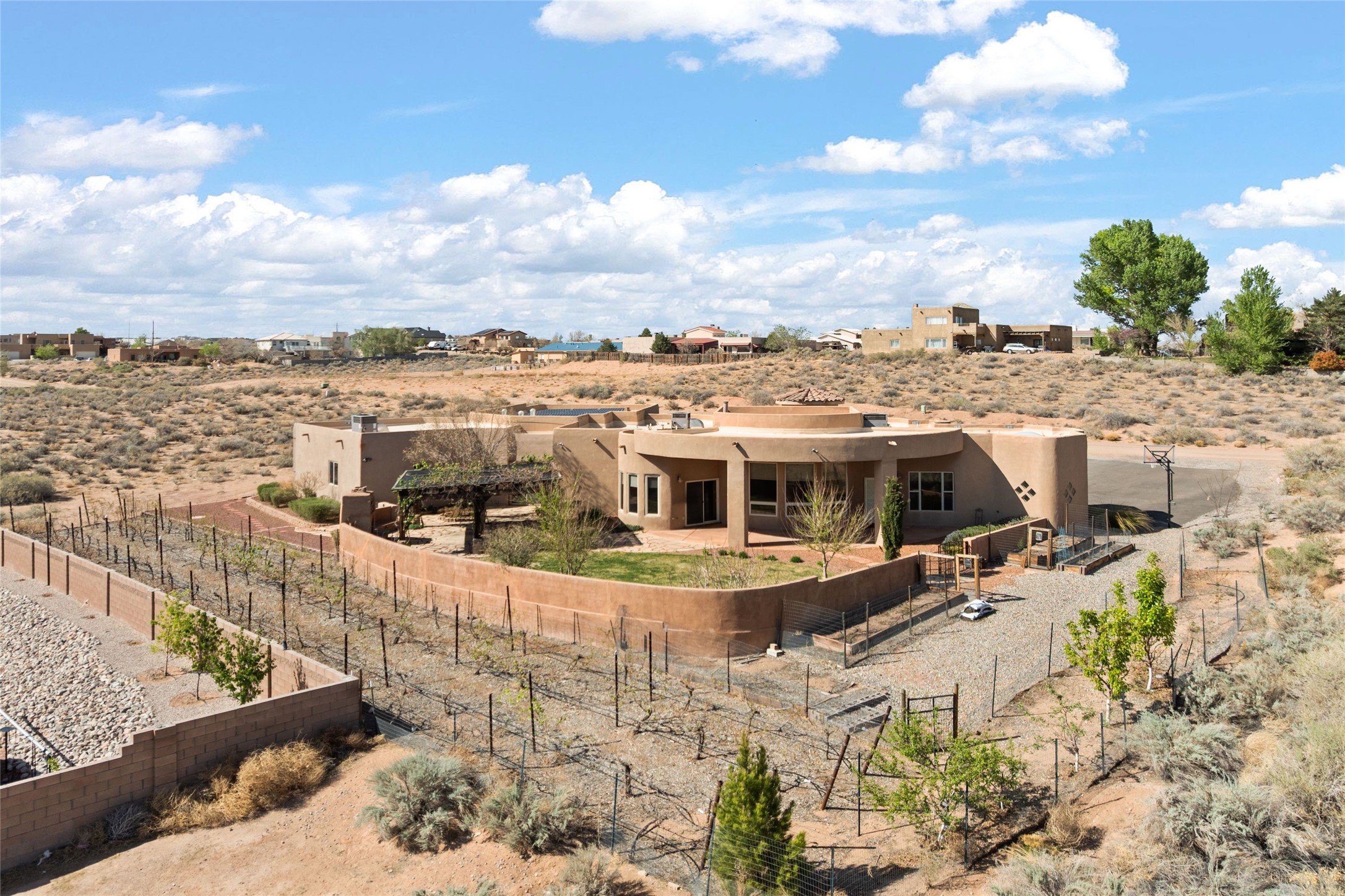 Seller owned solar and a private well! Enjoy the space without the high costs. Nestled on a lush and generous .52-acre lot in Rio Rancho, this property delivers expansive indoor-outdoor living, and countless features including a separate living area/casita. The home includes an oversized 3-car garage (1,488 SF) with extended depth, a dedicated hobby/game room, a 10x15 woodworking space, and a separate storage shed -- perfect for every project or pastime. The main house is designed with community and comfort in mind. The chef's kitchen boasts a gas cooktop, double convection ovens, dual sinks, a walk-in pantry, and flows effortlessly into the dining and living areas -- perfect for entertaining.A stacked stone custom gas log fireplace with banco seating adds cozy ambiance. The primary suite features southern views and private access to the extended covered back patio, a snail shower, garden tub, dual sinks, and a walk-in closet. Three additional bedrooms and two bathrooms provide ample room for children, guests, or office space.18-panel owned solar system installed in 2016. A central vacuum system adds further convenience. A standout feature is the spacious attached 800 SF casita, offering a full kitchen, living room, walk-in closet, and ensuite bathroom with linen storage. All on one level with no carpet, this private space is ideal for in-laws, guests, or even potential rental income.Outdoors, create unforgettable memories in the pergola-covered patio wrapped in grapevines, with a custom wood-burning fireplace and banco seating -- ideal for BBQs, al fresco dinners, and relaxing evenings. The property's mature vineyard includes Cabernet Sauvignon, Chardonnay, and more. Owners and past owners have previously had local farmers care for the grapes in exchange for the fruit at harvest time making this lush landscaping easy to enjoy.Edible landscaping surrounds you with fruit trees and raised garden beds for vegetables and herbs. New roof (2019).