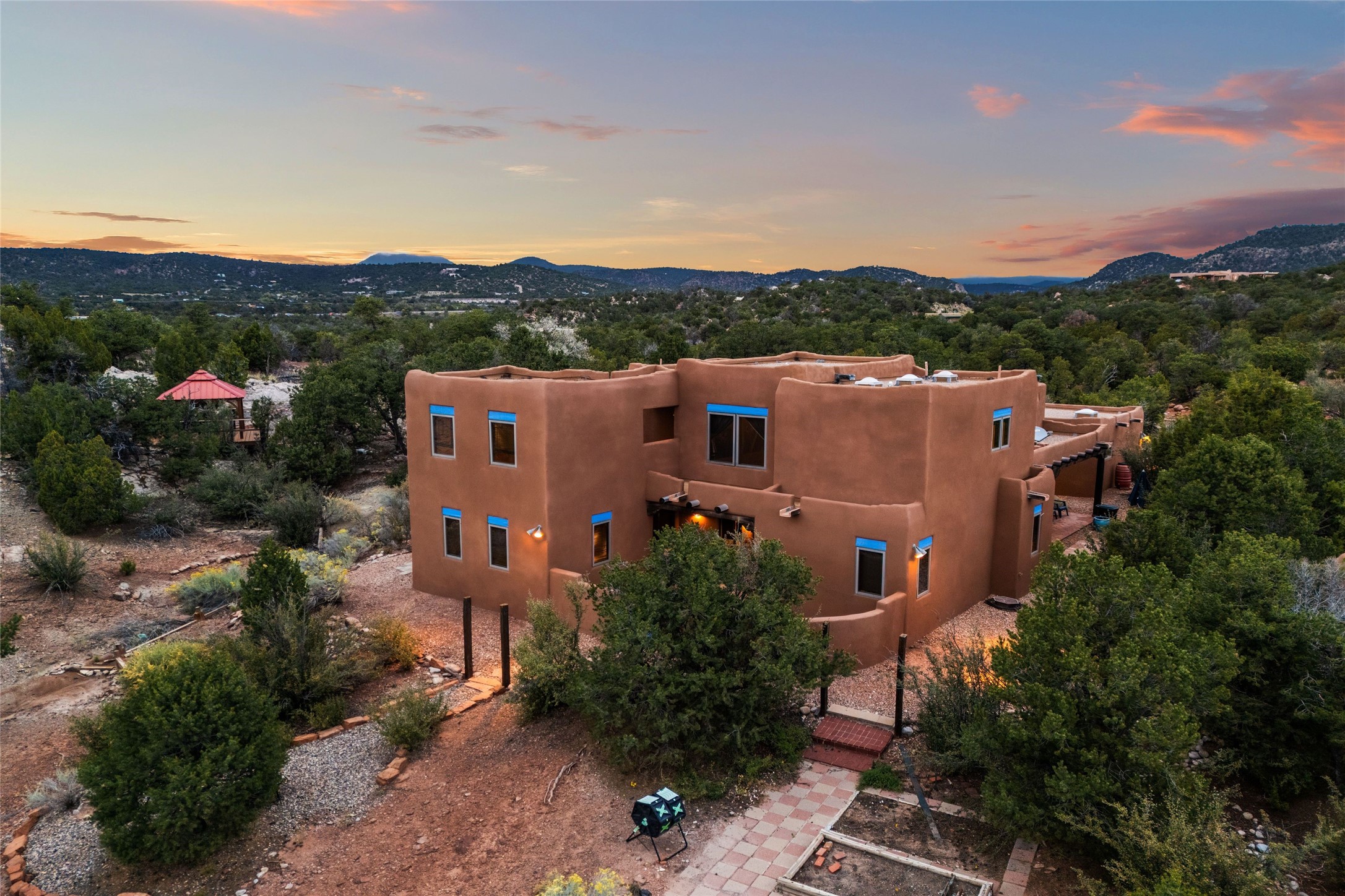 Welcome to your private Southwestern sanctuary--an enchanting 3-bedroom, 2-bathroom retreat nestled on 6.5 acres of beautifully landscaped land. Horses allowed! Acreage backs to preserved land. From the moment you step inside, you're greeted by the warmth of traditional wood vigas and the inviting glow of a kiva fireplace.The thoughtfully designed layout offers two spacious bedrooms and a full bathroom on the main level, perfect for guests or family. A bonus living area opens to a gated courtyard, creating a peaceful space for morning coffee or evening gatherings under the stars. Upstairs, the primary suite is a true haven, featuring a wood-lined deck with breathtaking mountain views and a bonus room ideal for an art studio, yoga space, or home office.Outside the magic continues to a shaded gazebo, perfect for relaxing or entertaining. A separate outbuilding offers endless possibilities--whether you dream of a workshop, creative studio, or guest space. The covered carport includes additional storage. There is no HOA.This property is more than a home--it's a lifestyle. A rare opportunity to embrace tranquility, creativity, and the natural beauty of New Mexico, all within your own private oasis.