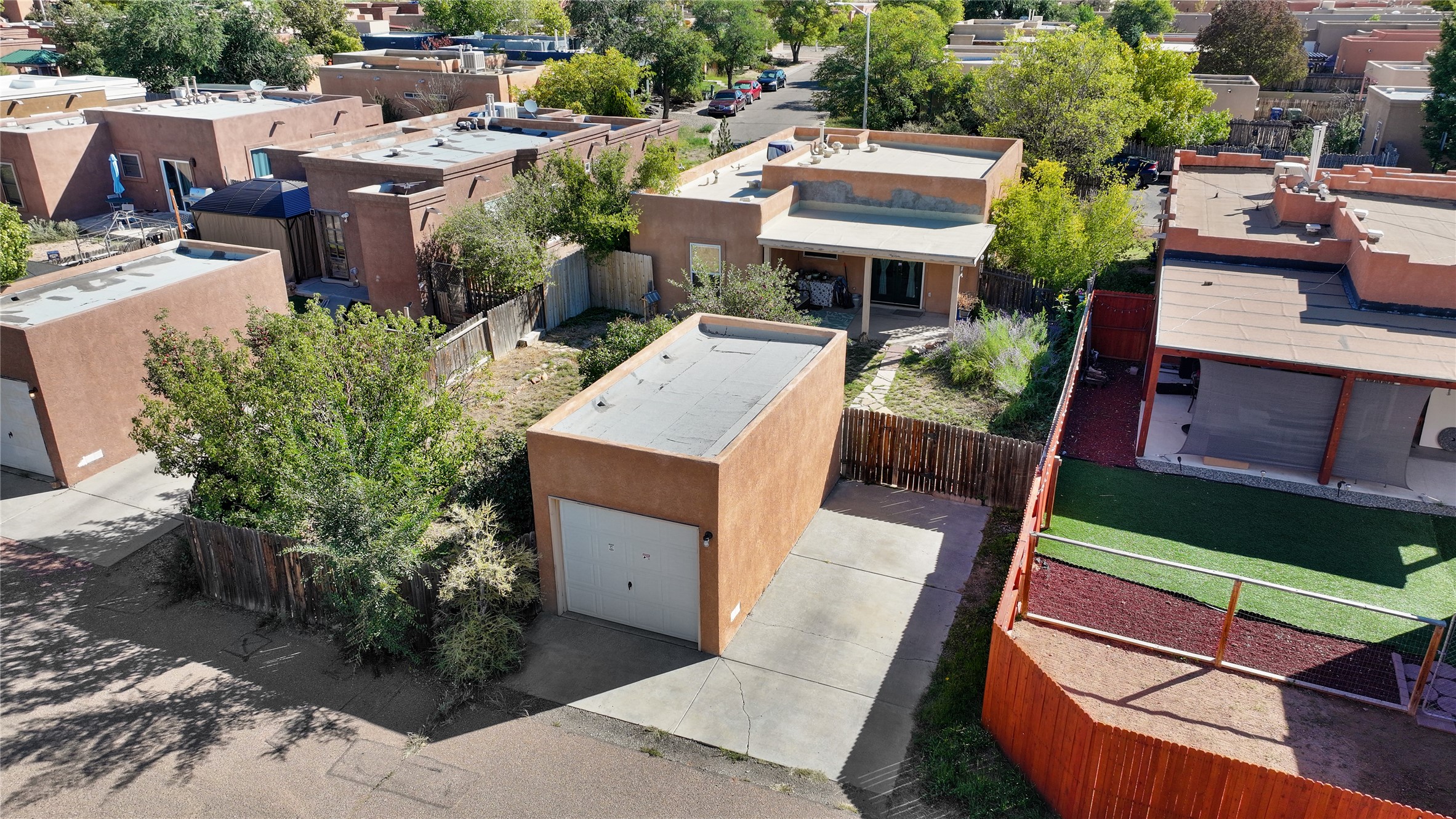 Charming 2-bedroom, 1-bath home with a 1-car garage and off-street parking. Comfortable, move-in ready living with tranquil outdoor spaces. A gated, fenced front yard with established, drip-irrigated plantings provides curb appeal and privacy. Inside, the living and dining areas flow into the kitchen, and an updated bathroom showcases clean, modern finishes. The fully enclosed backyard is a gardener's delight with bountiful apple trees and lush landscaping, plus a detached garage that could also serve as a gym or workshop. Ideally located with easy access to I-25 and NM-599 and near shopping, schools, popular restaurants, and Presbyterian Hospital. Schedule your showing today!