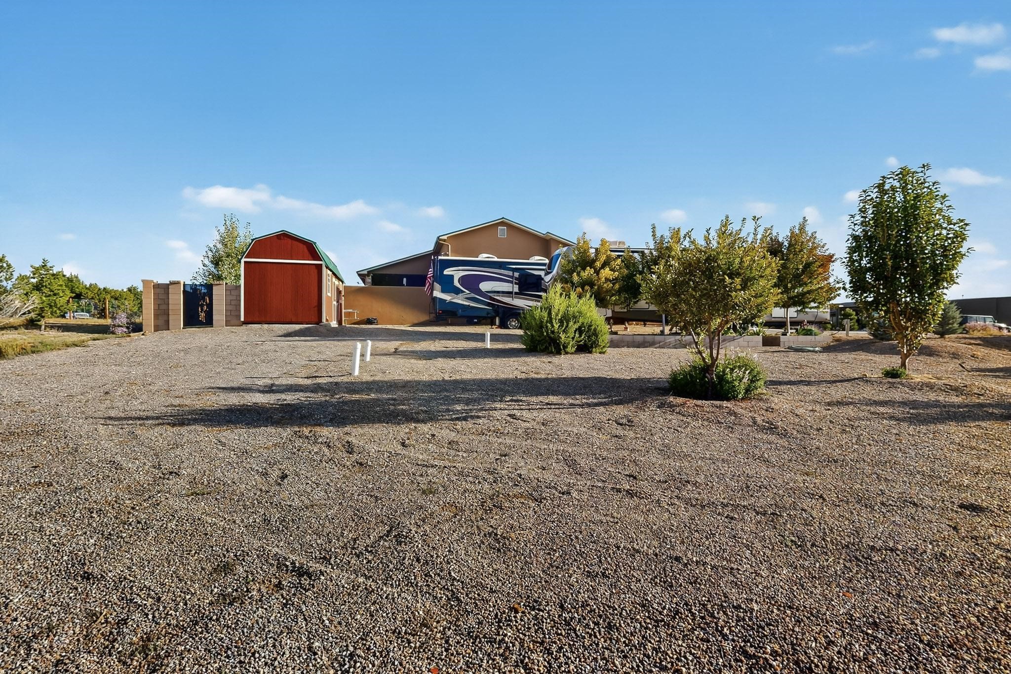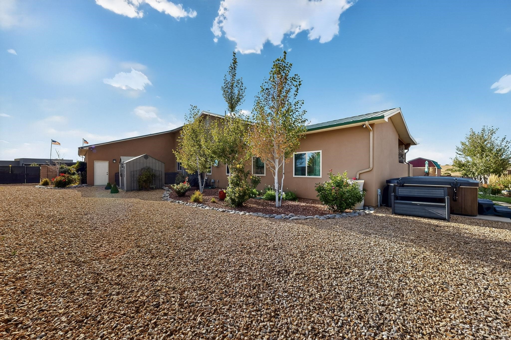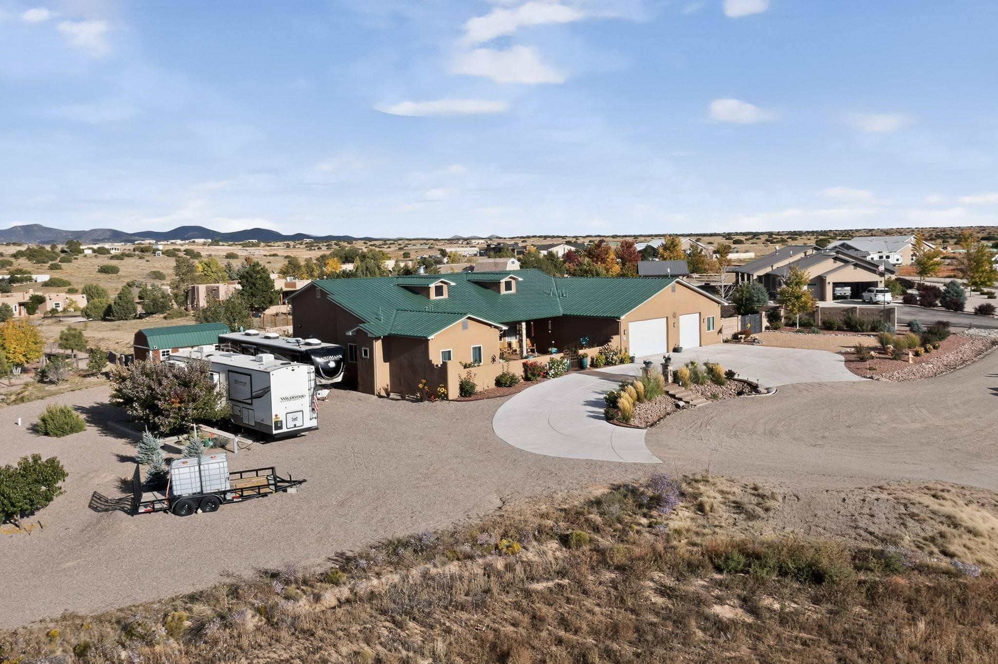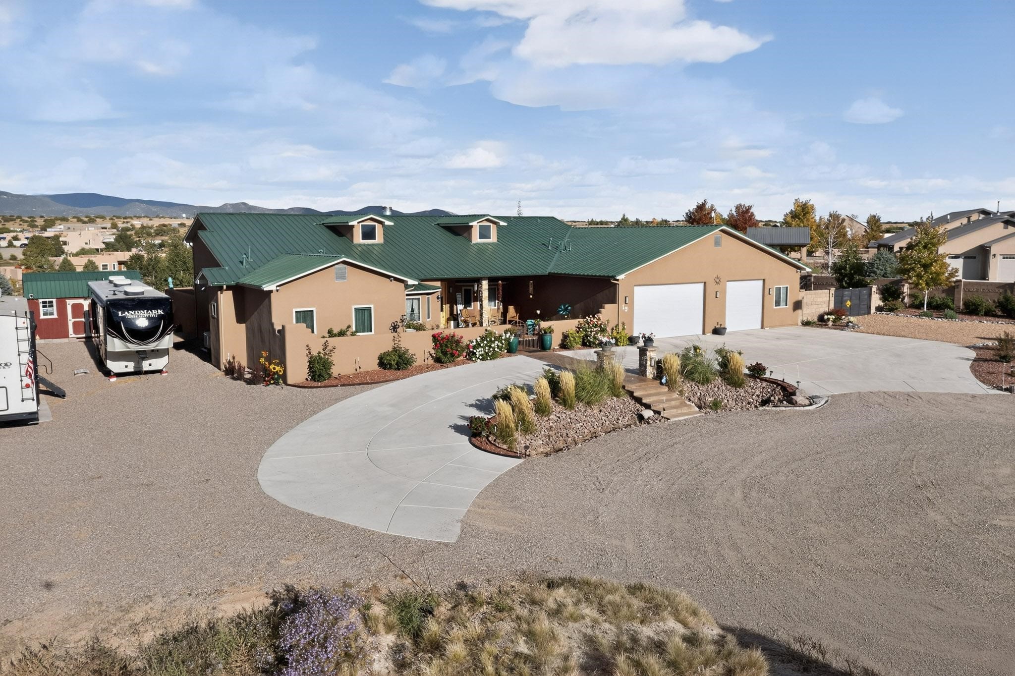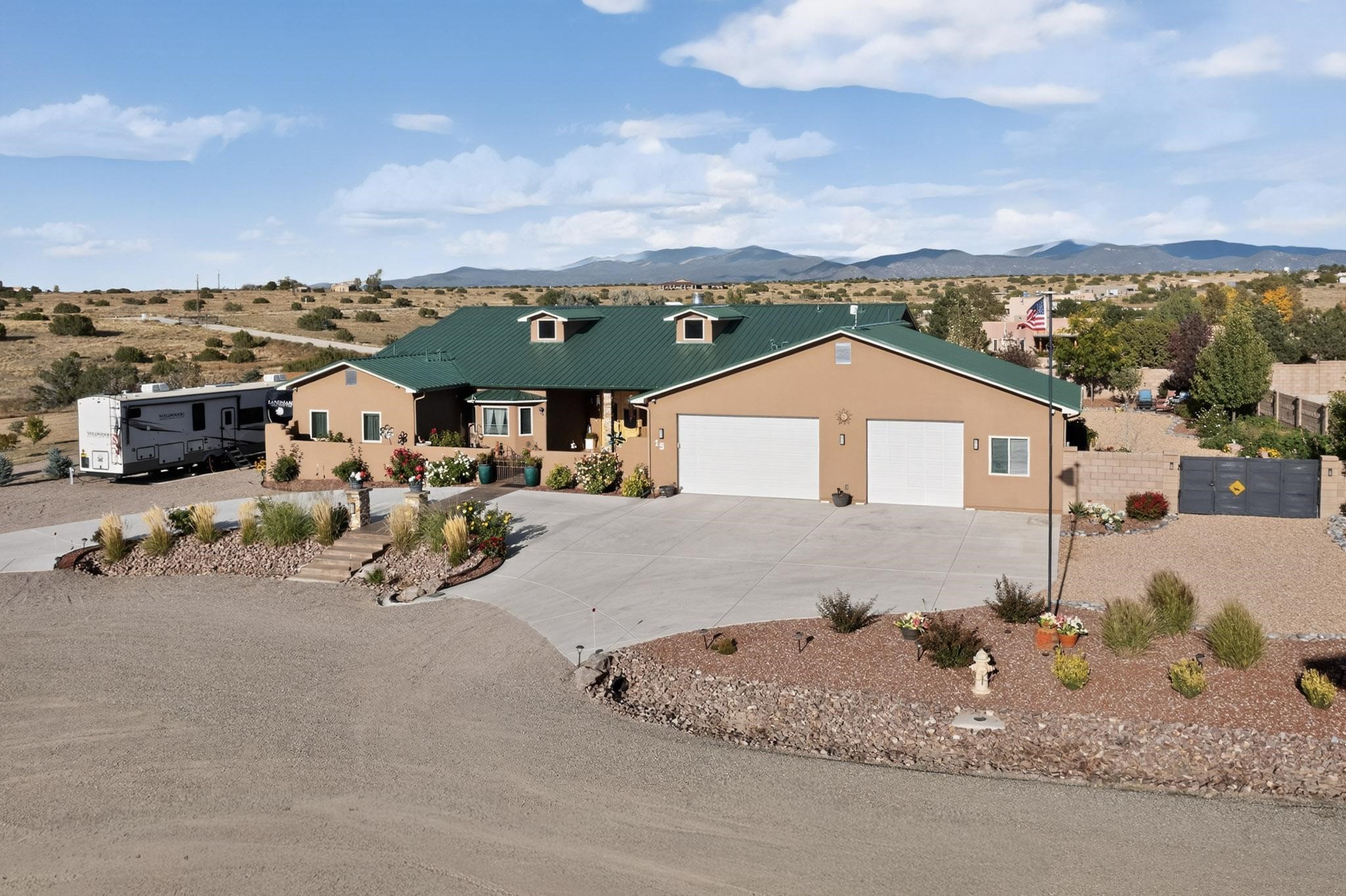 Nestled in the private, gated community of Valle Serena, this meticulously designed single-level home offers the perfect balance of comfort, luxury, and practicality. Built in 2022, the residence spans 3 bedrooms (two with ensuite baths) and includes an additional full bath and half bath for your guests' convenience. The bright, open-concept interior is both inviting and functional. The living area features soaring ceilings and a cozy wood-burning fireplace, ideal for enjoying Santa Fe's crisp fall evenings and snowy winter nights. Transition effortlessly into the chef's kitchen, a culinary haven outfitted with premium appliances, custom cabinetry, a large island, and a generous butler's pantry for all your storage needs.Step outside to experience your own private oasis -- the fully fenced backyard is beautifully landscaped with fruit trees, a vibrant rose garden, and delicate aspen trees, creating a serene setting to relax or entertain. Whether soaking in the luxurious hot tub or enjoying alfresco dining on the extended patio, you'll be treated to breathtaking views of the enchanting Sangre de Cristo Mountains. This home is not only aesthetically stunning but is also rich with thoughtful amenities, including a pitched pro-panel roof (with a transferable warranty), security system (audio/visual), central refrigerated air conditioning, two storage sheds, and RV parking with hook-ups for added convenience. A spacious 3-car garage, complete with extra storage and workspace, rounds out this home's exceptional offerings. Located just minutes from Santa Fe's world-renowned art galleries, fine dining, and unparalleled outdoor recreation, this residence offers a unique opportunity to embrace privacy, modern luxury, and unbeatable convenience. Don't miss the chance to make this exquisite Southwest retreat your own--schedule your showing today!