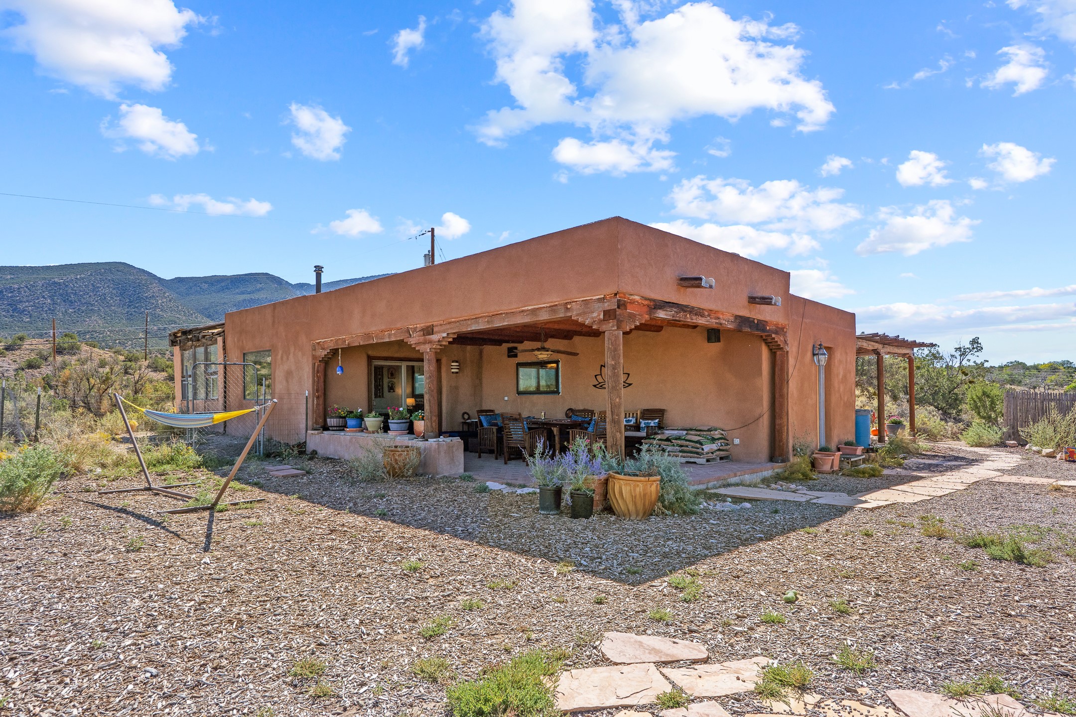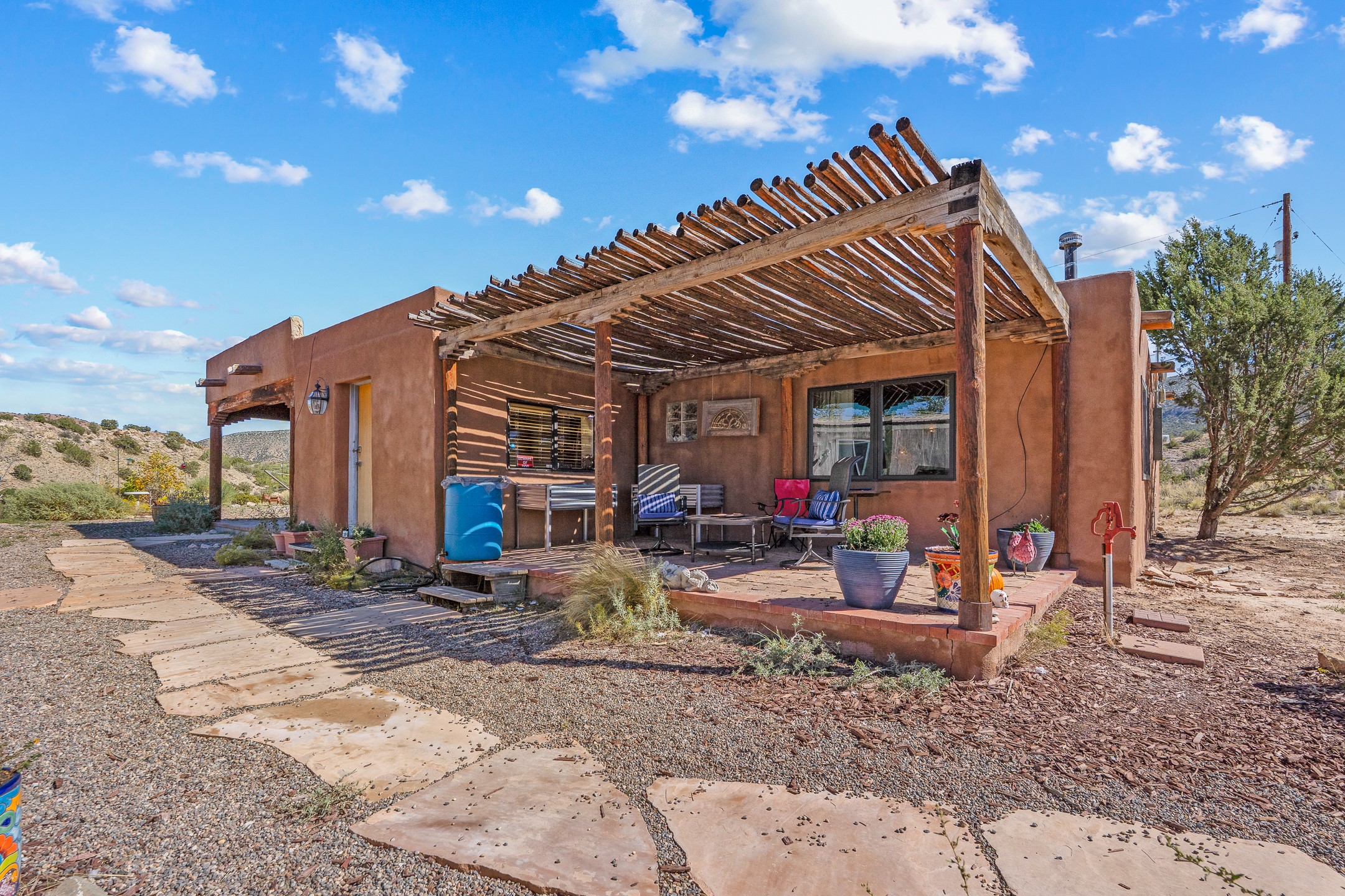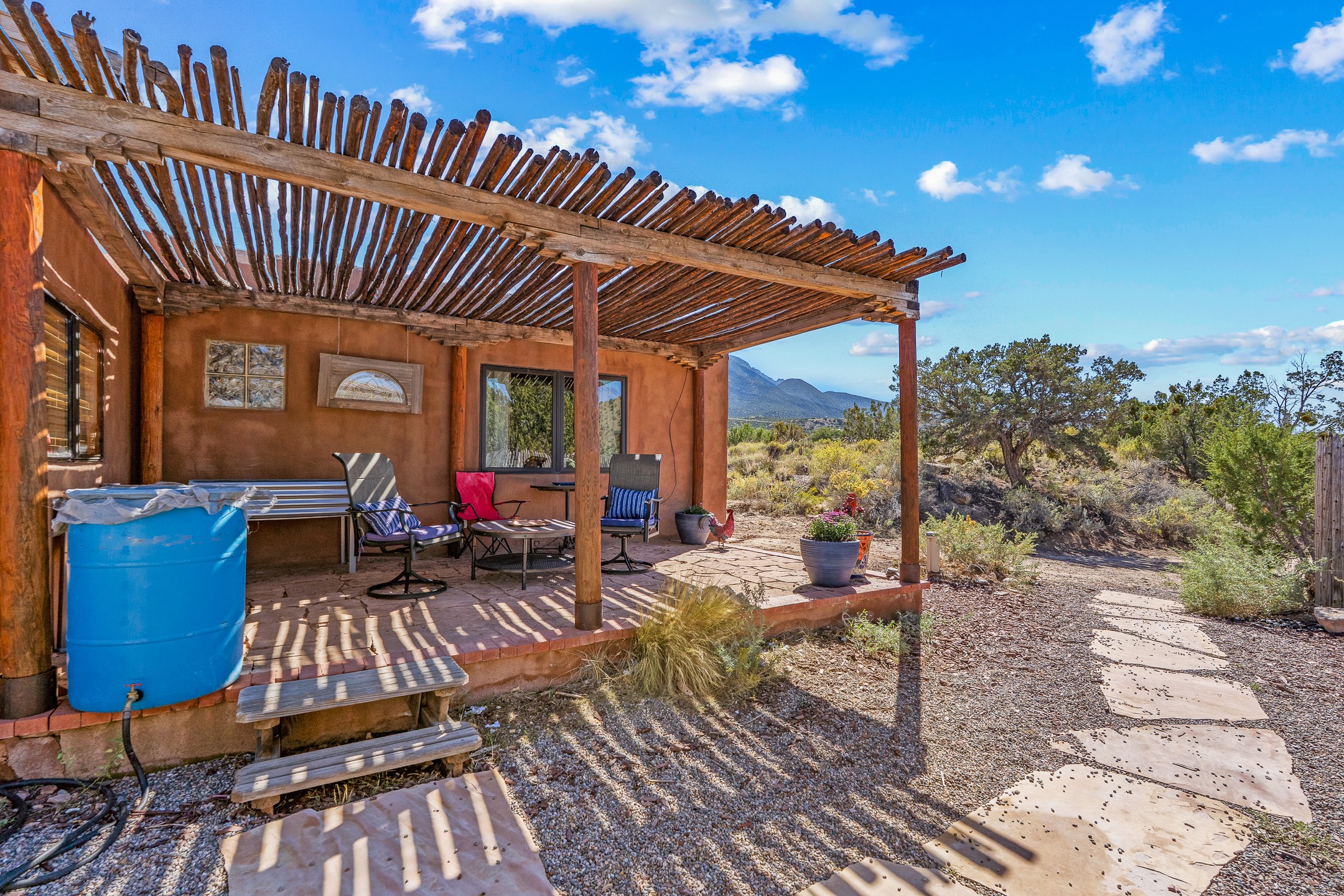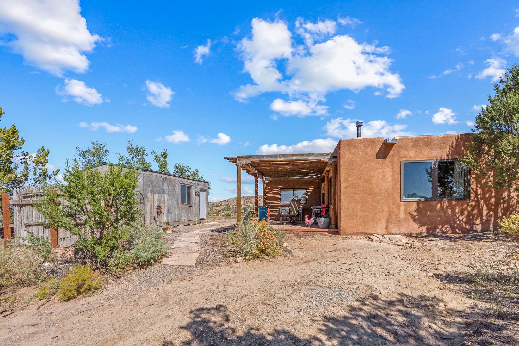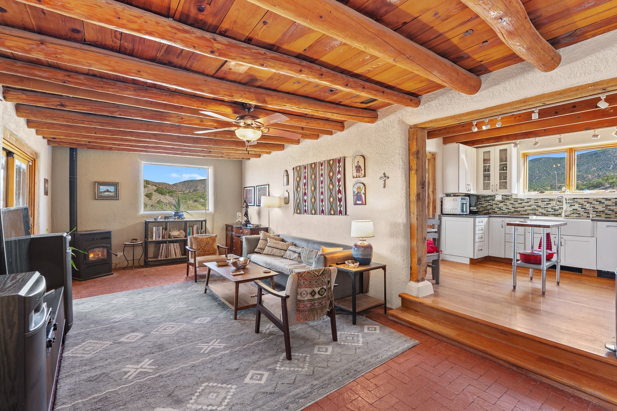 Nestled beside a picturesque canyon, part of the historic San Antonio de Las Huertas Land Grant, and near National Forest access, this charming adobe home--dating back to the 1940s--sits on two tranquil acres surrounded by sweeping mountain views. Thoughtfully updated to preserve its authentic Southwestern character, the home features traditional vigas and wood plank ceilings that create a warm, inviting atmosphere. Step onto the spacious covered portal, complete with vigas and a brick floor, and take in the serene vistas of the Sandia and Jemez mountains--an ideal setting for outdoor dining or entertaining. The main portal opens into a cozy living room with pellet stove and beautifully plastered adobe walls. The remodeled kitchen blends rustic charm with modern convenience, offering a country-style farm sink, quartz countertops, and a butcher block island. Both bedrooms are generously sized. Pella windows and patio door. Recent upgrades include a new roof system, new hot water heater, and new main electric panel service, all installed in September 2025. 320-square-foot workshop, 108-square-foot storage shed, and a large, fenced yard perfect for dogs. An older addition presents exciting possibilities--building plans available to convert to dining room. $9600 bid to turn it in to another portal. $10,000 credit to Buyer for old addition.