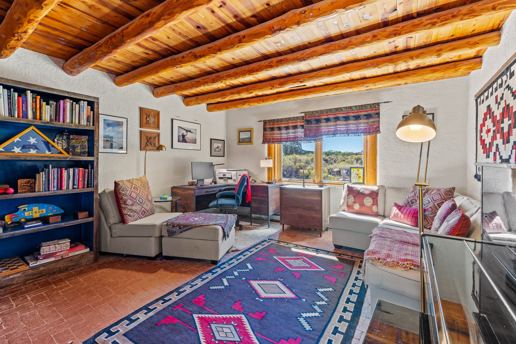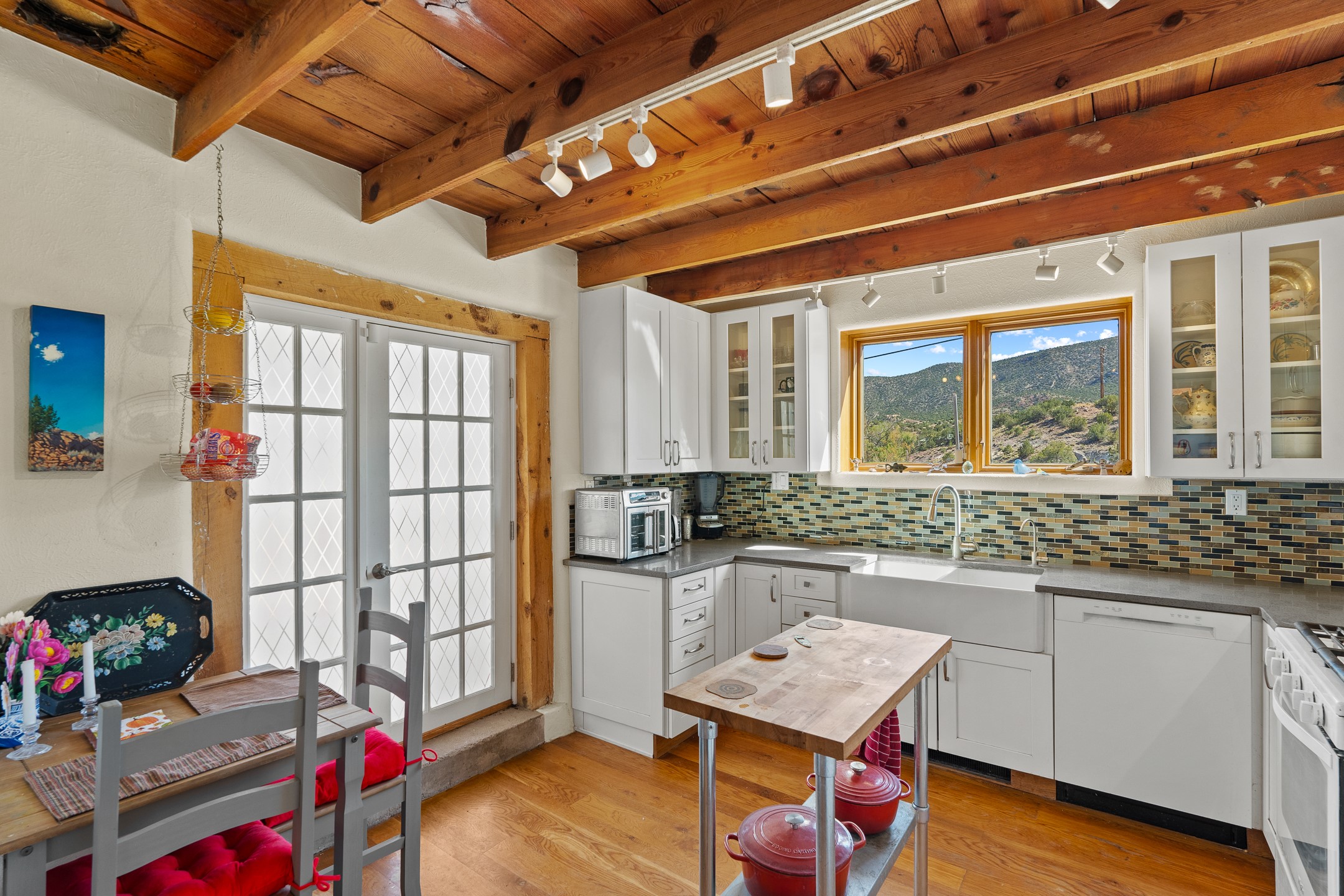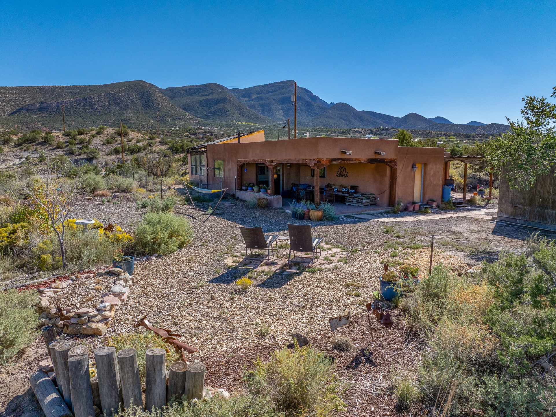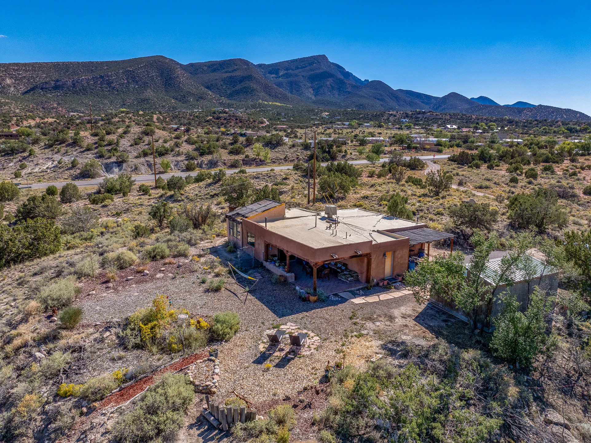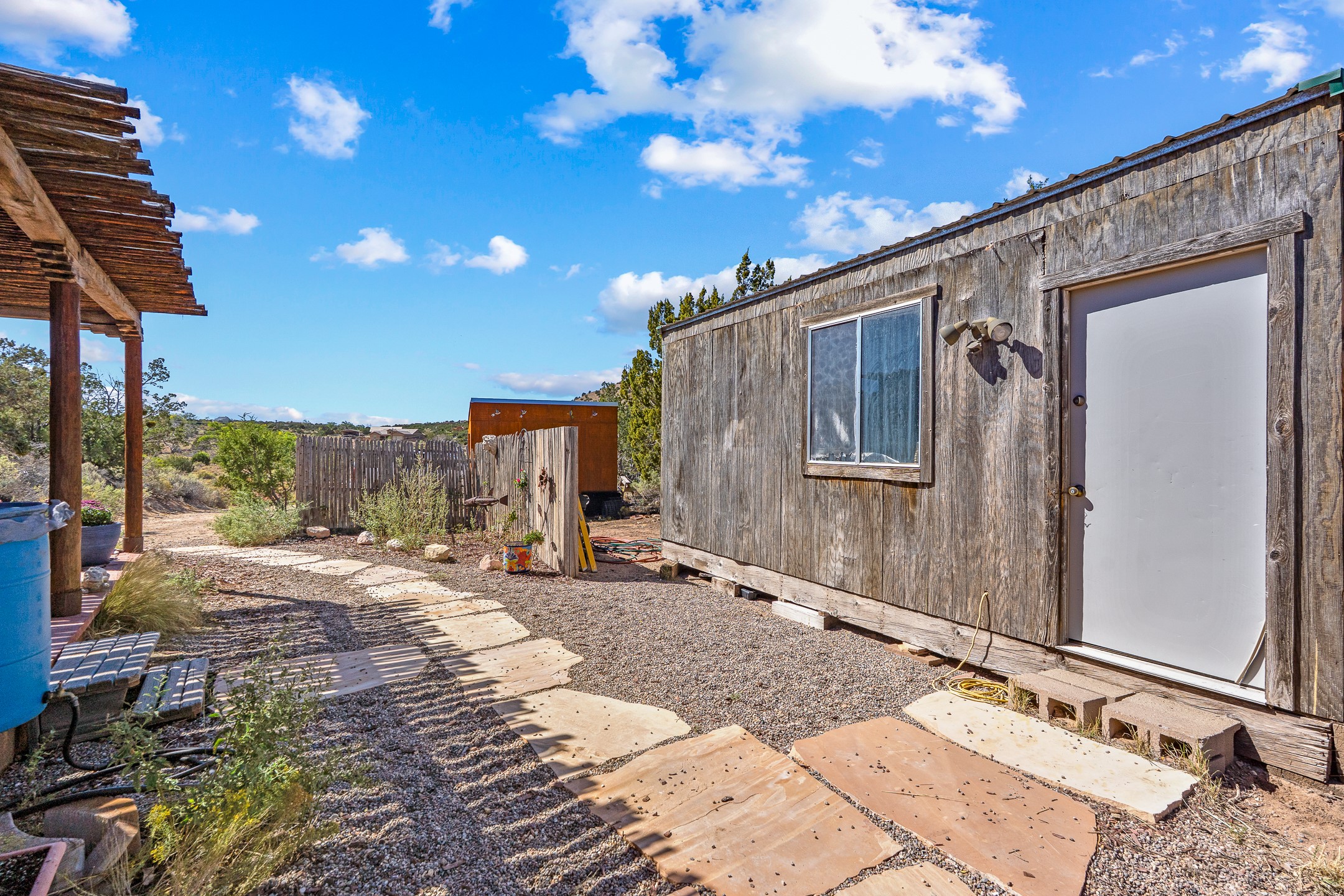 Nestled beside a picturesque canyon, part of the historic San Antonio de Las Huertas Land Grant, and near National Forest access, this charming adobe home--dating back to the 1940s--sits on two tranquil acres surrounded by sweeping mountain views. Thoughtfully updated to preserve its authentic Southwestern character, the home features traditional vigas and wood plank ceilings that create a warm, inviting atmosphere. Step onto the spacious covered portal, complete with vigas and a brick floor, and take in the serene vistas of the Sandia and Jemez mountains--an ideal setting for outdoor dining or entertaining. The main portal opens into a cozy living room with pellet stove and beautifully plastered adobe walls. The remodeled kitchen blends rustic charm with modern convenience, offering a country-style farm sink, quartz countertops, and a butcher block island. Both bedrooms are generously sized. Pella windows and patio door. Recent upgrades include a new roof system, new hot water heater, and new main electric panel service, all installed in September 2025. 320-square-foot workshop, 108-square-foot storage shed, and a large, fenced yard perfect for dogs. An older addition presents exciting possibilities--building plans available to convert to dining room. $9600 bid to turn it in to another portal. $10,000 credit to Buyer for old addition.