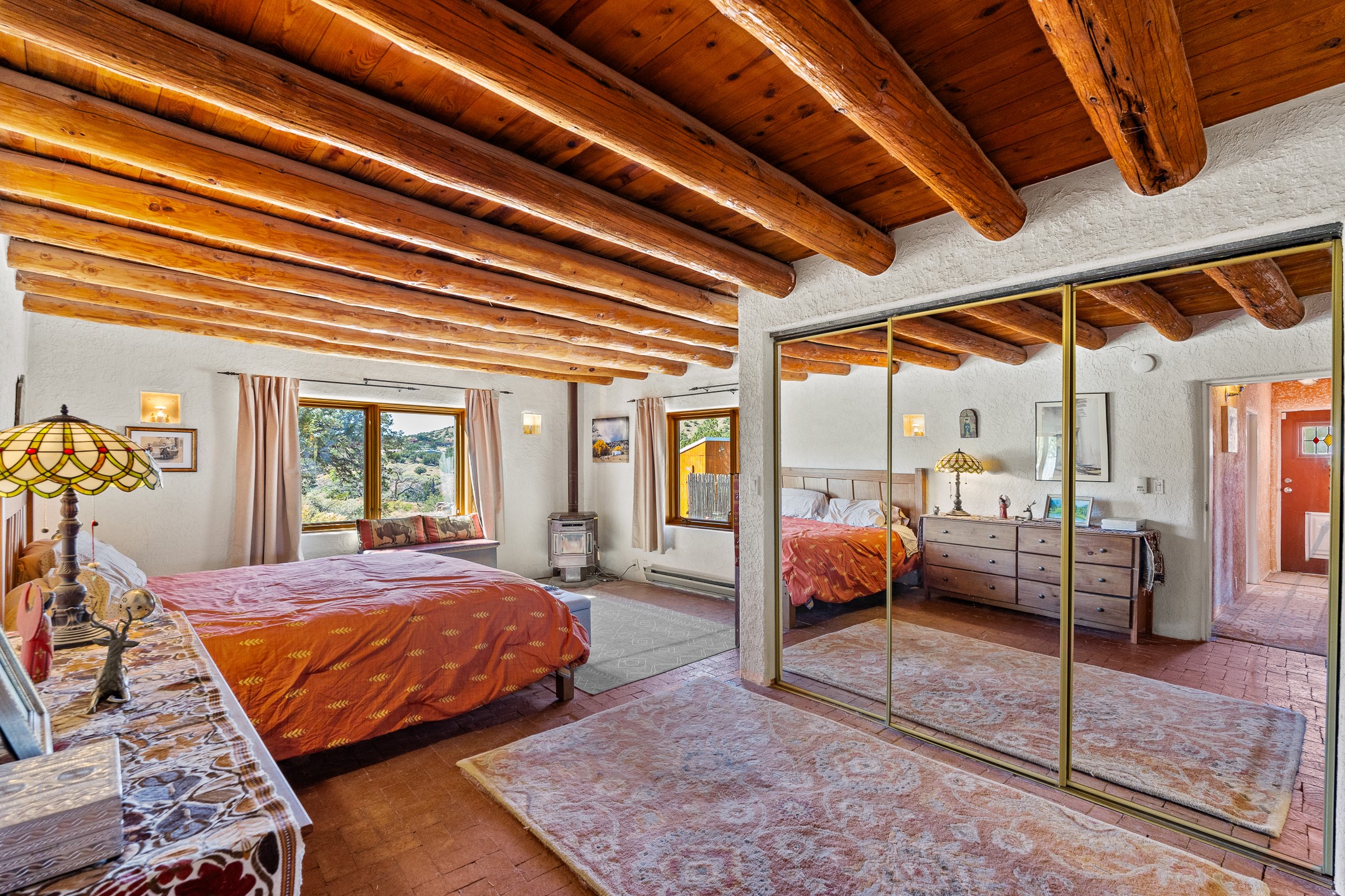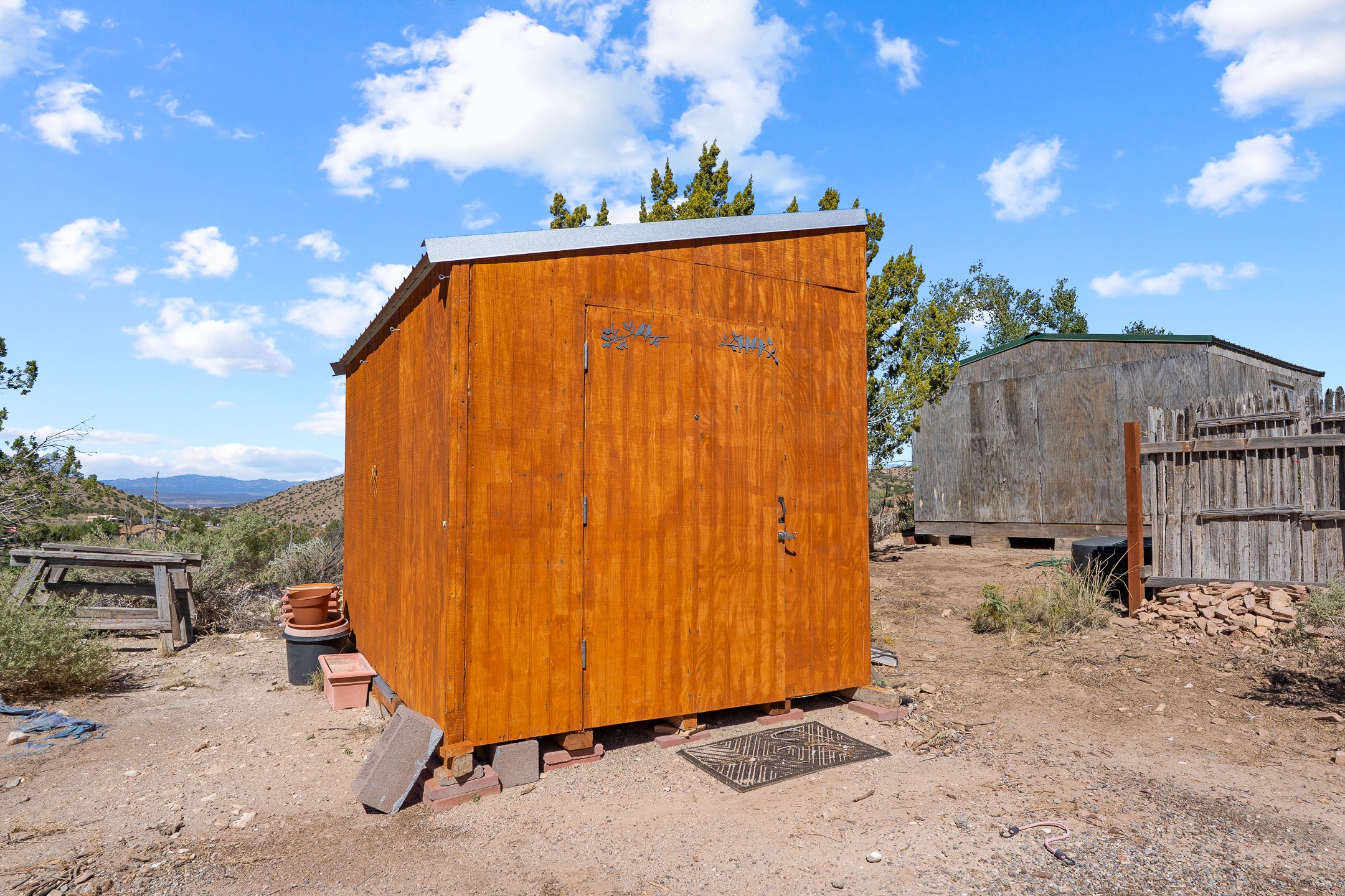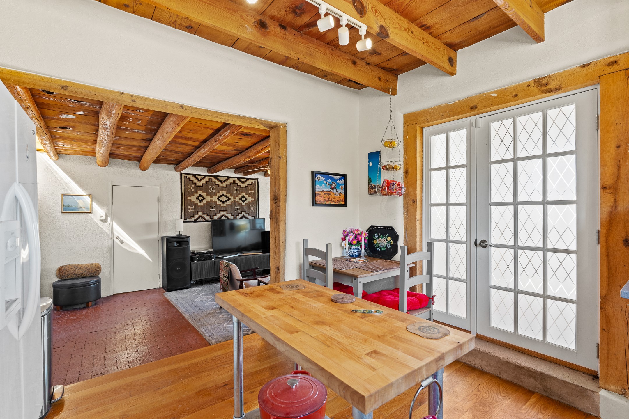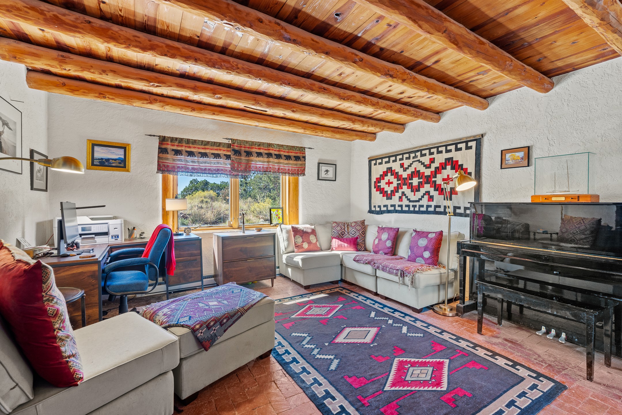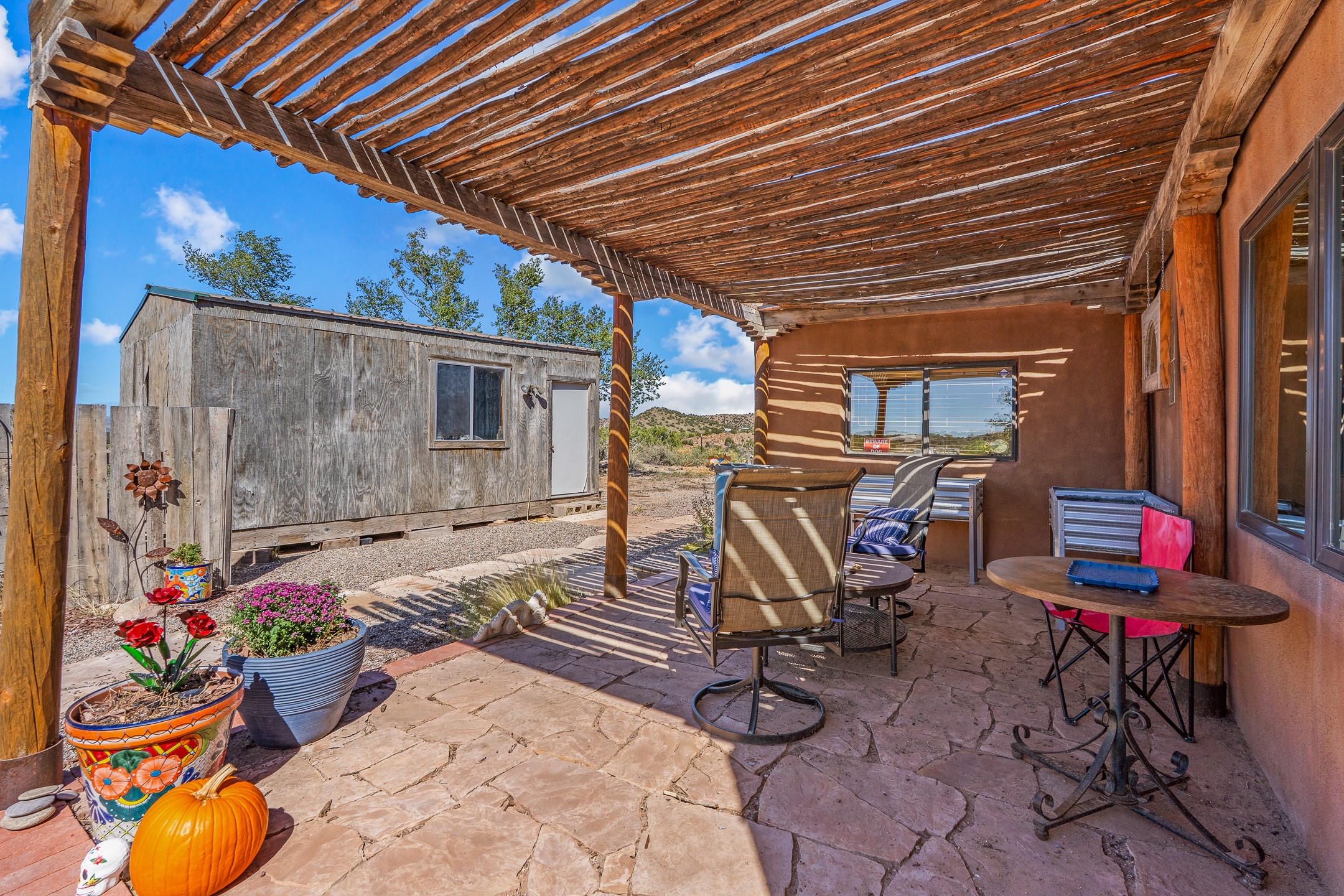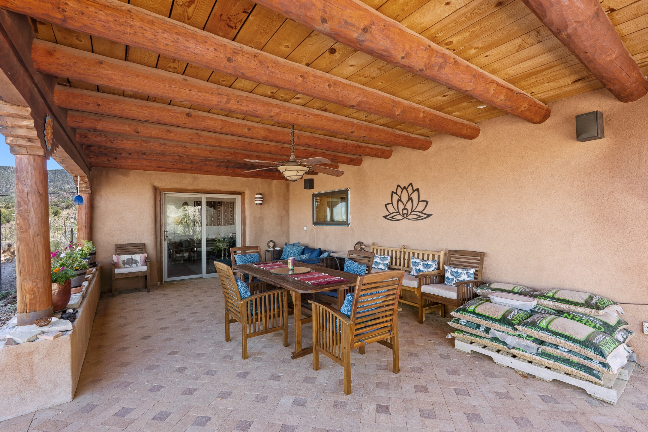 Nestled beside a picturesque canyon, part of the historic San Antonio de Las Huertas Land Grant, and near National Forest access, this charming adobe home--dating back to the 1940s--sits on two tranquil acres surrounded by sweeping mountain views. Thoughtfully updated to preserve its authentic Southwestern character, the home features traditional vigas and wood plank ceilings that create a warm, inviting atmosphere. Step onto the spacious covered portal, complete with vigas and a brick floor, and take in the serene vistas of the Sandia and Jemez mountains--an ideal setting for outdoor dining or entertaining. The main portal opens into a cozy living room with pellet stove and beautifully plastered adobe walls. The remodeled kitchen blends rustic charm with modern convenience, offering a country-style farm sink, quartz countertops, and a butcher block island. Both bedrooms are generously sized. Pella windows and patio door. Recent upgrades include a new roof system, new hot water heater, and new main electric panel service, all installed in September 2025. 320-square-foot workshop, 108-square-foot storage shed, and a large, fenced yard perfect for dogs. An older addition presents exciting possibilities--building plans available to convert to dining room. $9600 bid to turn it in to another portal. $10,000 credit to Buyer for old addition.