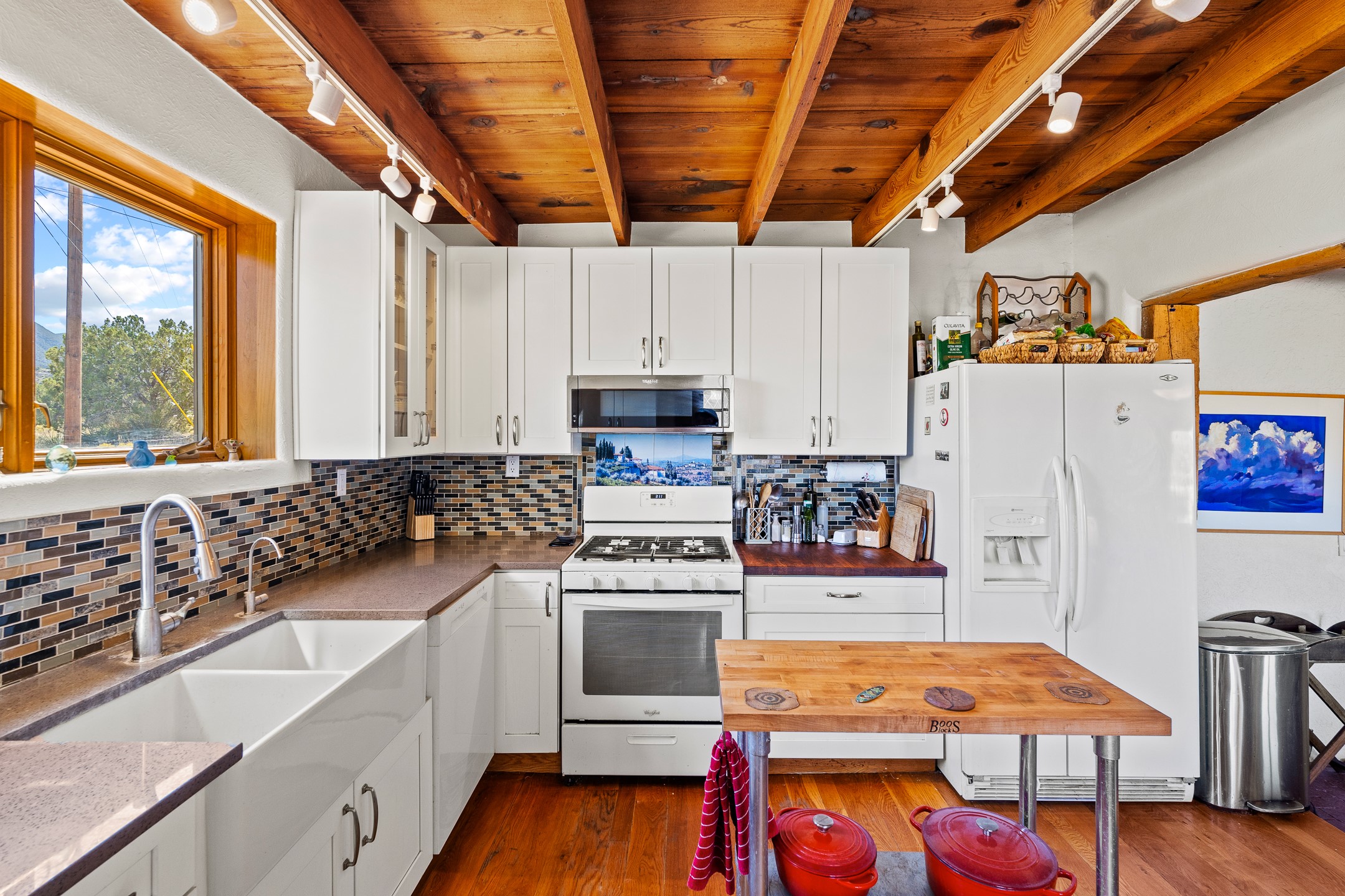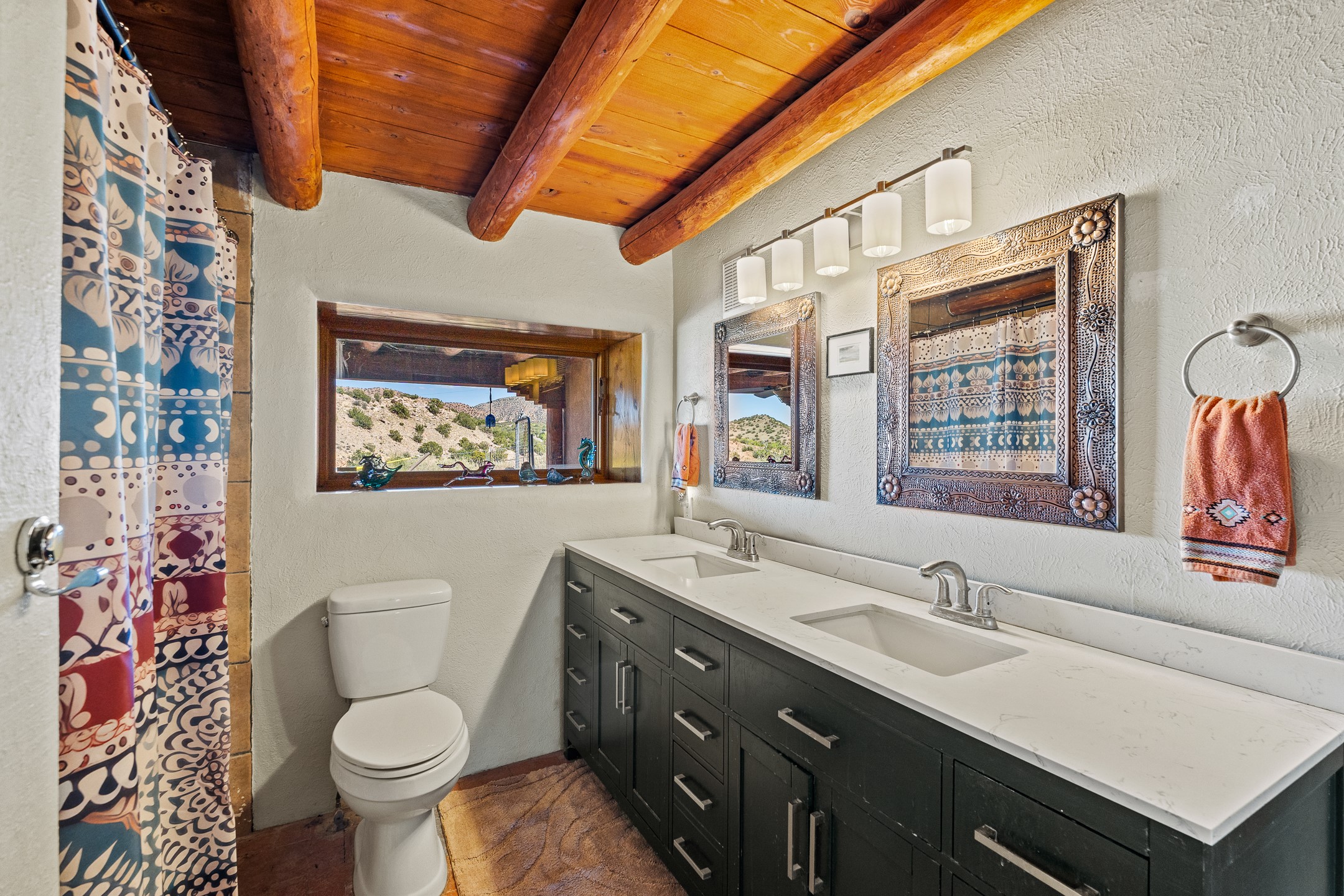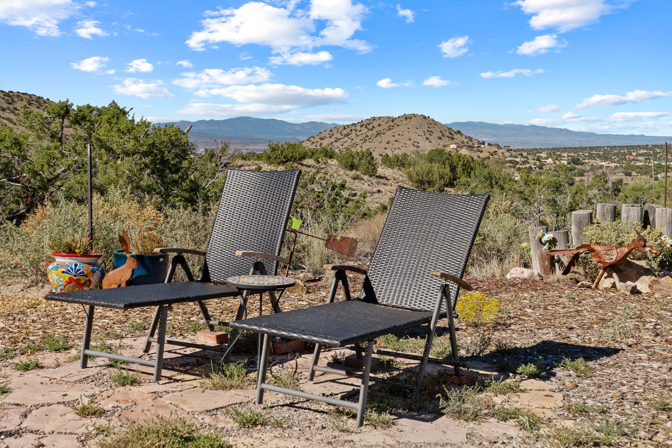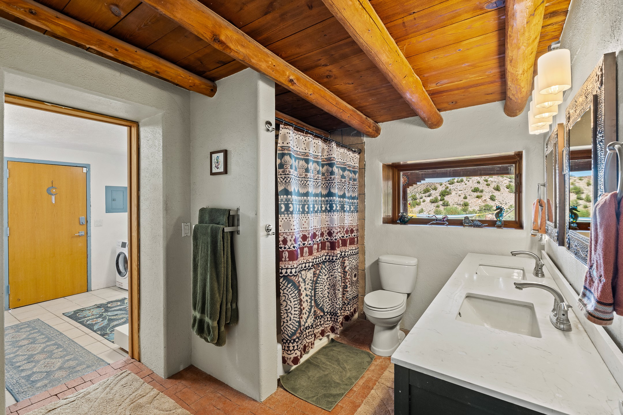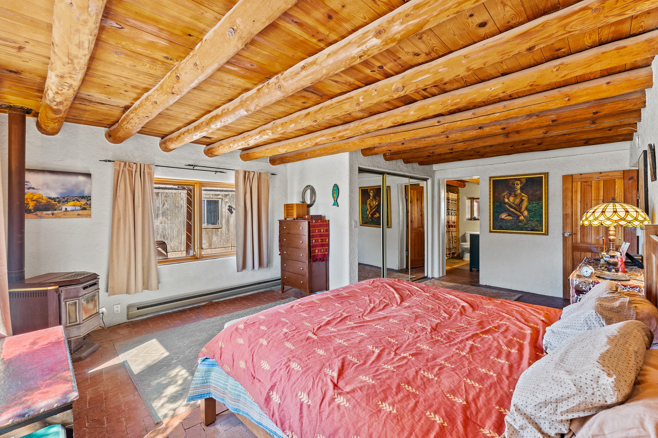 Nestled beside a picturesque canyon, part of the historic San Antonio de Las Huertas Land Grant, and near National Forest access, this charming adobe home--dating back to the 1940s--sits on two tranquil acres surrounded by sweeping mountain views. Thoughtfully updated to preserve its authentic Southwestern character, the home features traditional vigas and wood plank ceilings that create a warm, inviting atmosphere. Step onto the spacious covered portal, complete with vigas and a brick floor, and take in the serene vistas of the Sandia and Jemez mountains--an ideal setting for outdoor dining or entertaining. The main portal opens into a cozy living room with pellet stove and beautifully plastered adobe walls. The remodeled kitchen blends rustic charm with modern convenience, offering a country-style farm sink, quartz countertops, and a butcher block island. Both bedrooms are generously sized. Pella windows and patio door. Recent upgrades include a new roof system, new hot water heater, and new main electric panel service, all installed in September 2025. 320-square-foot workshop, 108-square-foot storage shed, and a large, fenced yard perfect for dogs. An older addition presents exciting possibilities--building plans available to convert to dining room. $9600 bid to turn it in to another portal. $10,000 credit to Buyer for old addition.