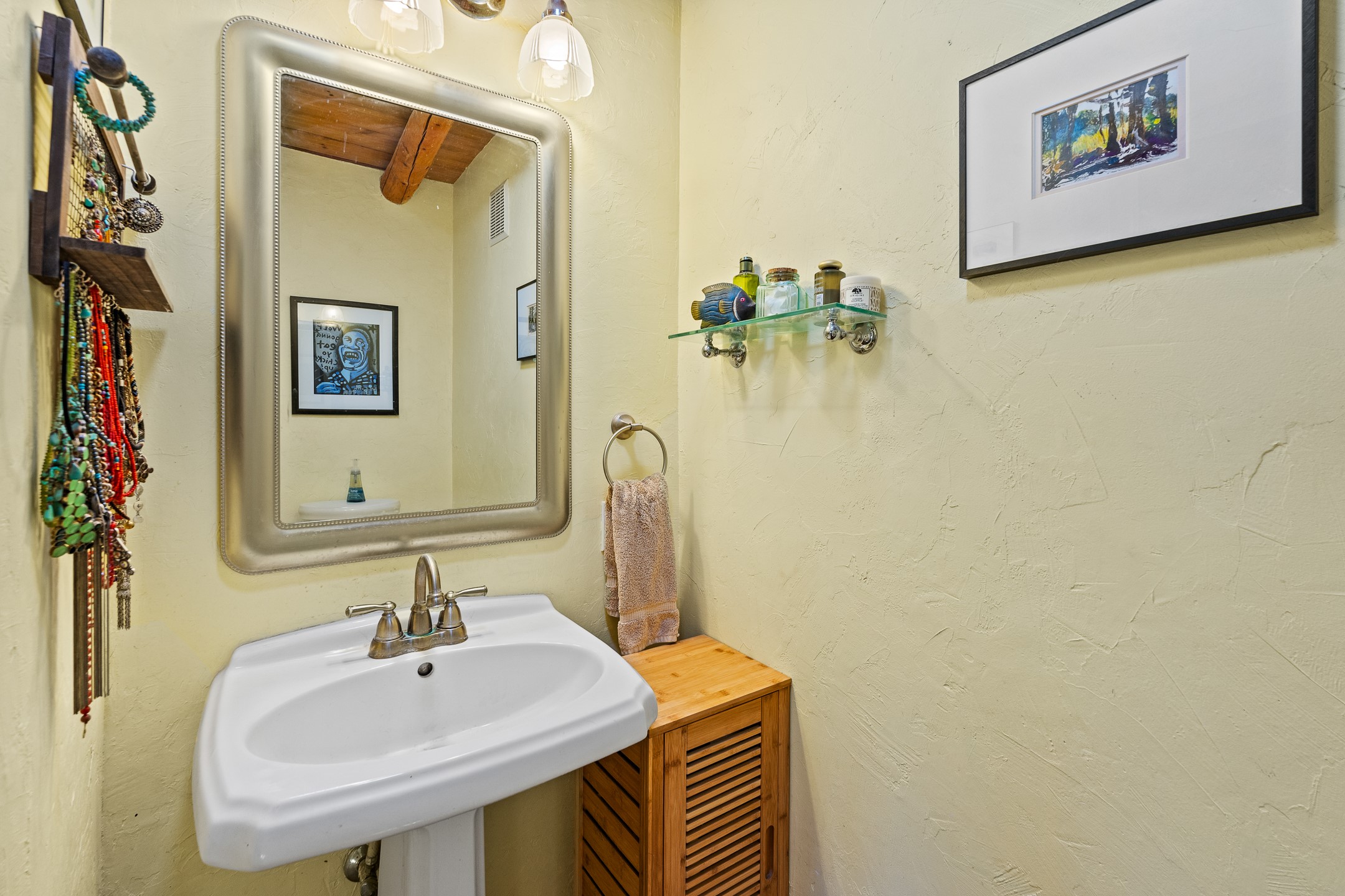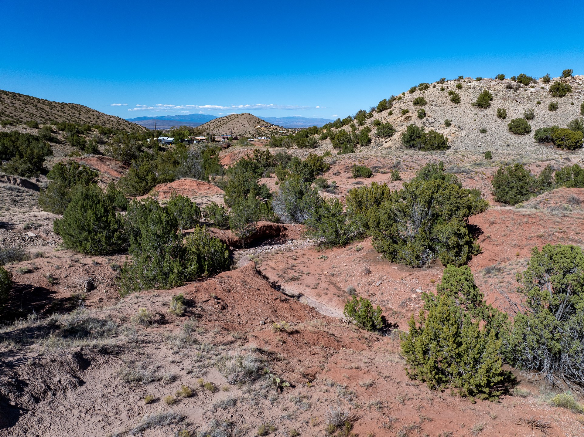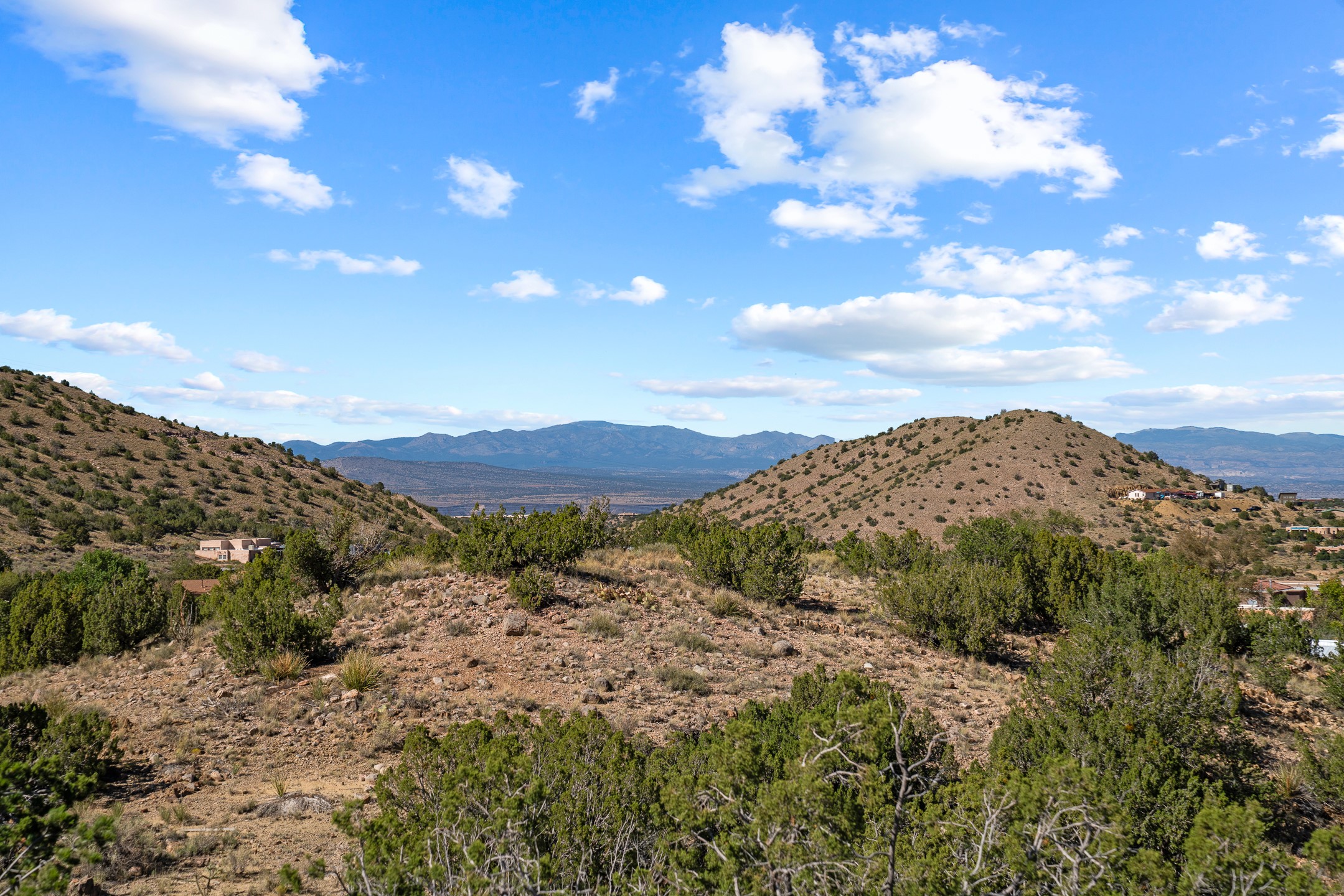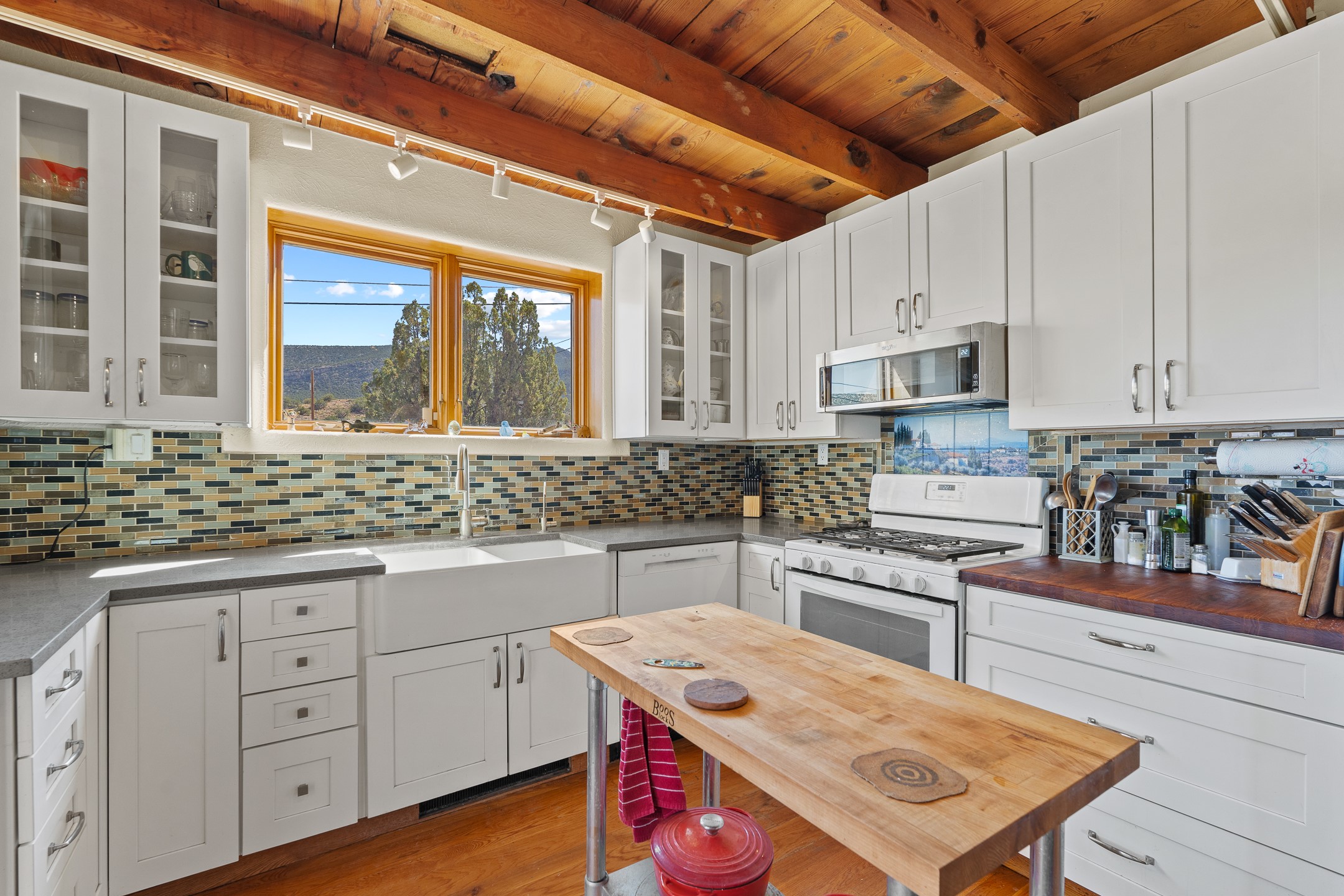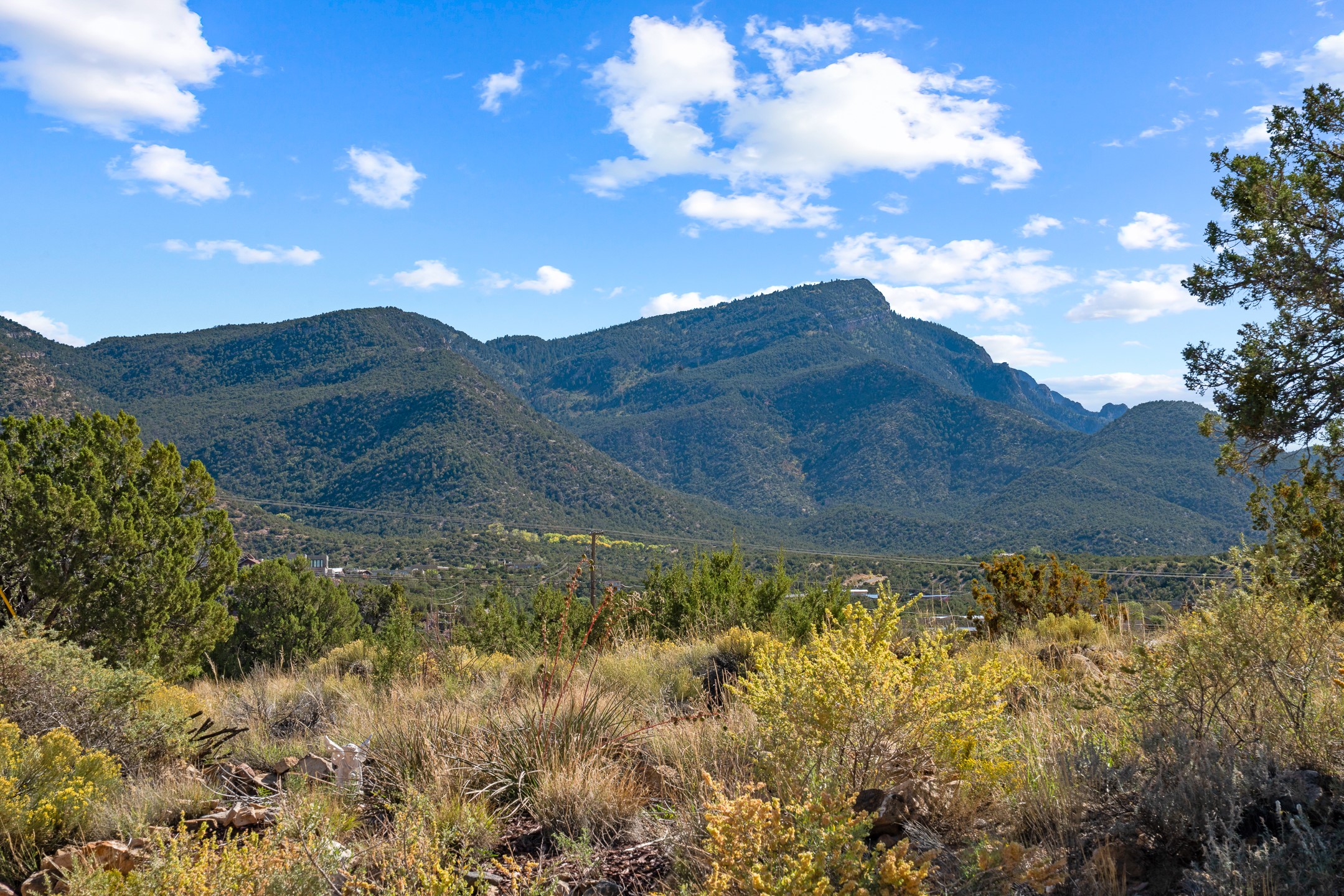 Nestled beside a picturesque canyon, part of the historic San Antonio de Las Huertas Land Grant, and near National Forest access, this charming adobe home--dating back to the 1940s--sits on two tranquil acres surrounded by sweeping mountain views. Thoughtfully updated to preserve its authentic Southwestern character, the home features traditional vigas and wood plank ceilings that create a warm, inviting atmosphere. Step onto the spacious covered portal, complete with vigas and a brick floor, and take in the serene vistas of the Sandia and Jemez mountains--an ideal setting for outdoor dining or entertaining. The main portal opens into a cozy living room with pellet stove and beautifully plastered adobe walls. The remodeled kitchen blends rustic charm with modern convenience, offering a country-style farm sink, quartz countertops, and a butcher block island. Both bedrooms are generously sized. Pella windows and patio door. Recent upgrades include a new roof system, new hot water heater, and new main electric panel service, all installed in September 2025. 320-square-foot workshop, 108-square-foot storage shed, and a large, fenced yard perfect for dogs. An older addition presents exciting possibilities--building plans available to convert to dining room. $9600 bid to turn it in to another portal. $10,000 credit to Buyer for old addition.