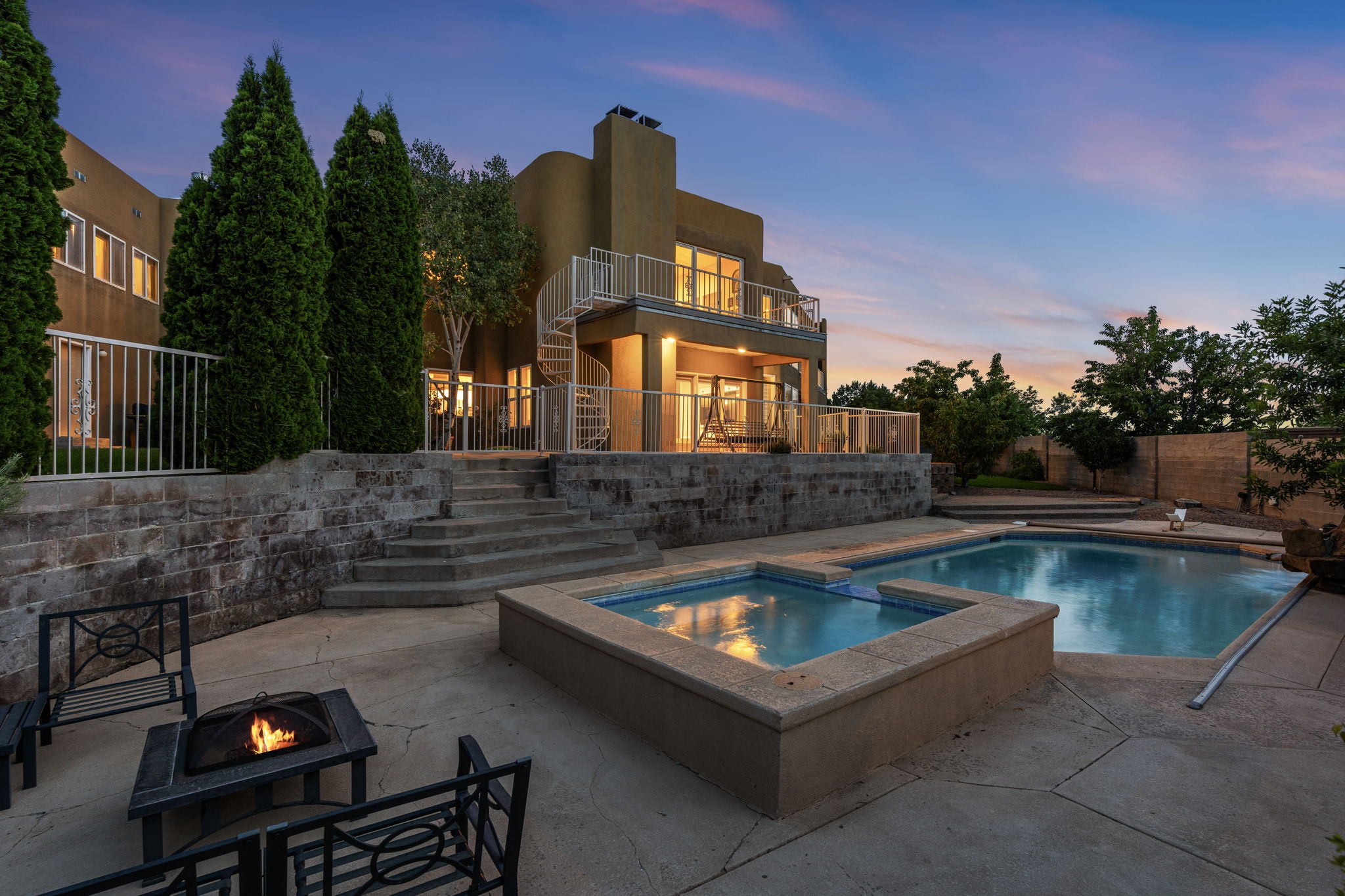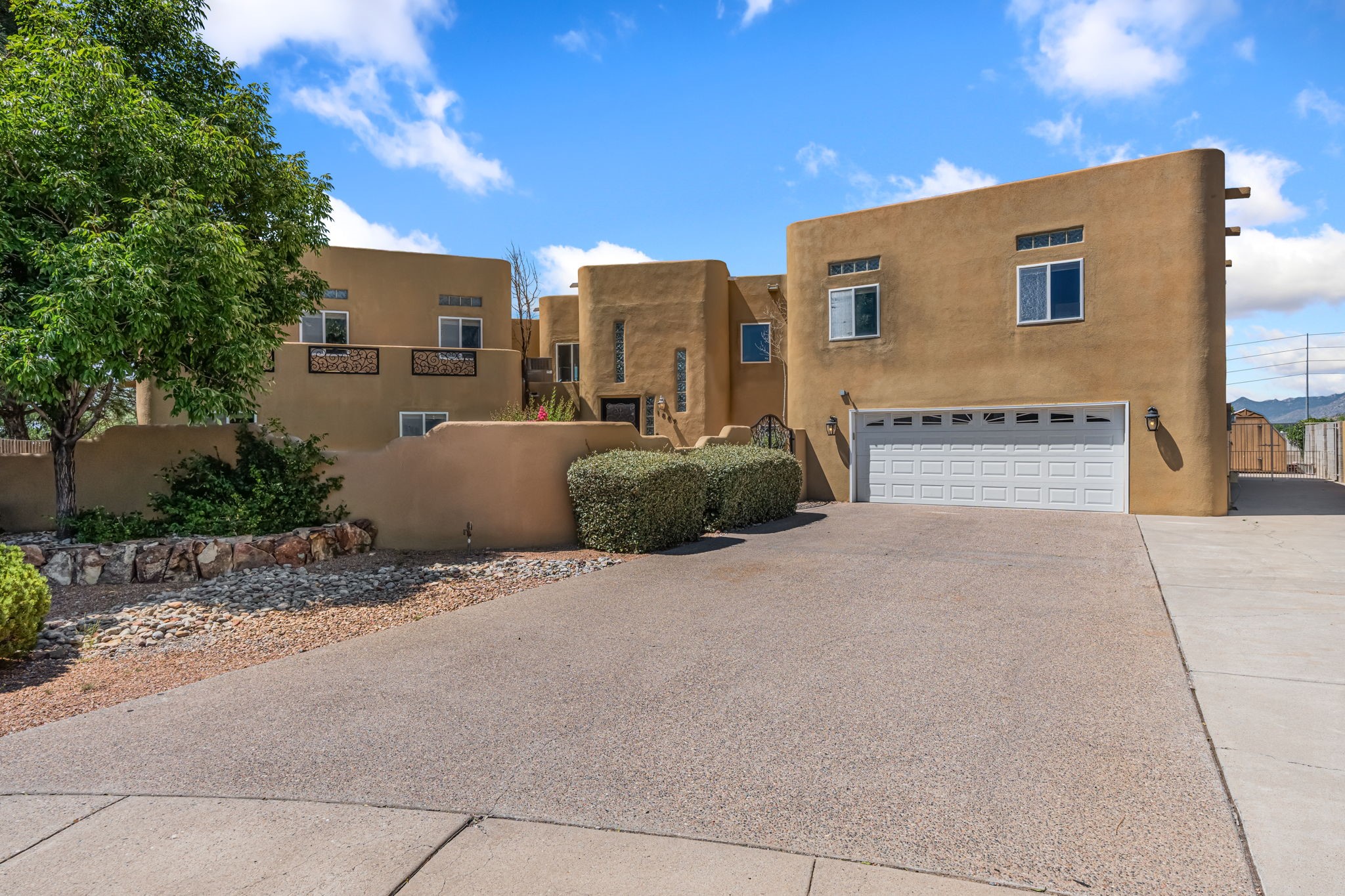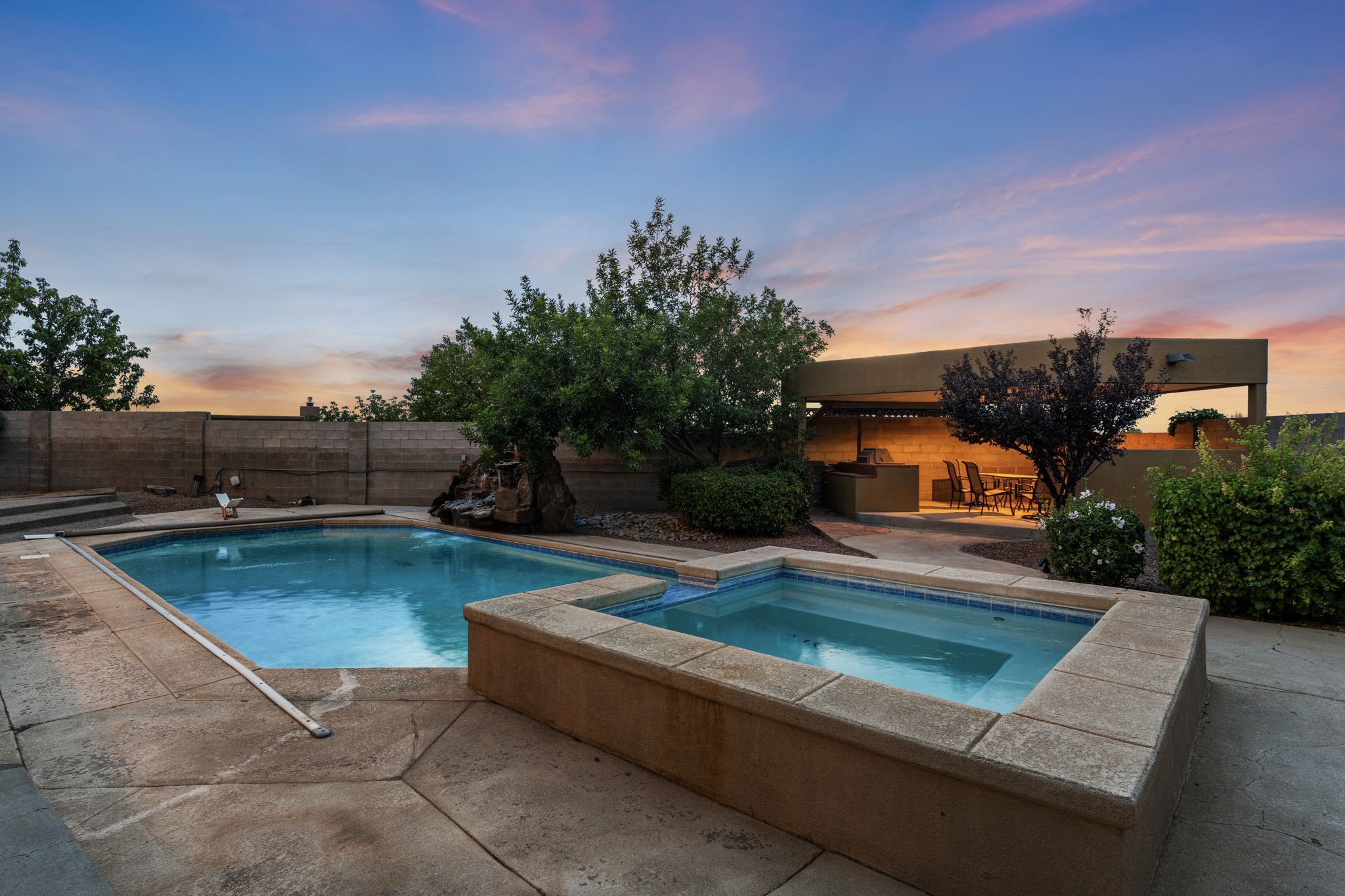 This elegant 1809 Archuleta Dr NE. This expansive 6-bedroom, 4-bath home offers an updated kitchen that blends style and functionality, two primary suites, a spacious upstairs living/game room with a bar, and an inviting atrium. Enjoy a cinematic experience in the private movie theater room, or take advantage of the tandem pull-through garage, which leads to a beautifully landscaped backyard. Nestled next to Embudo Canyon, the property ensures privacy and tranquility. The outdoor space includes an inground pool, outdoor kitchen, fruit trees (peach, cherry, apricot), and grapevines--perfect for both relaxation and entertainment.