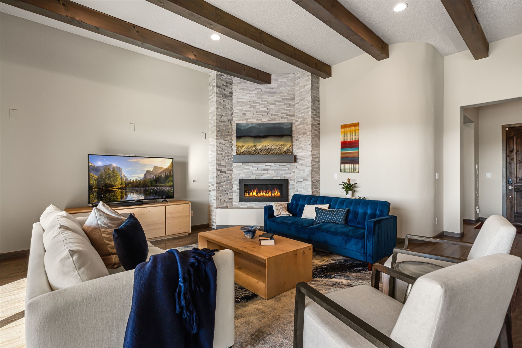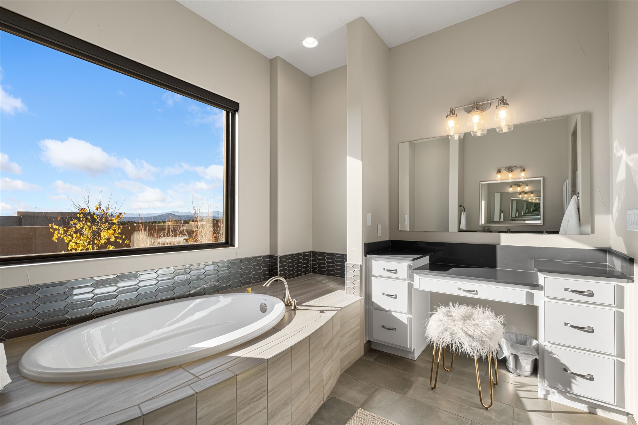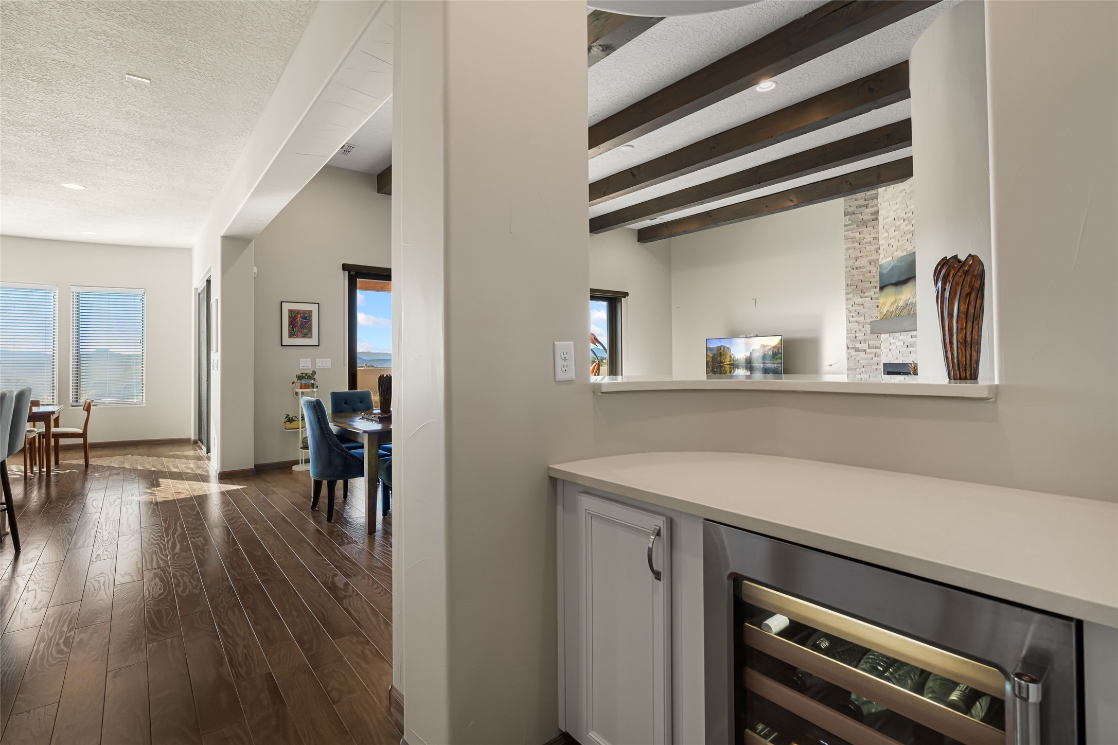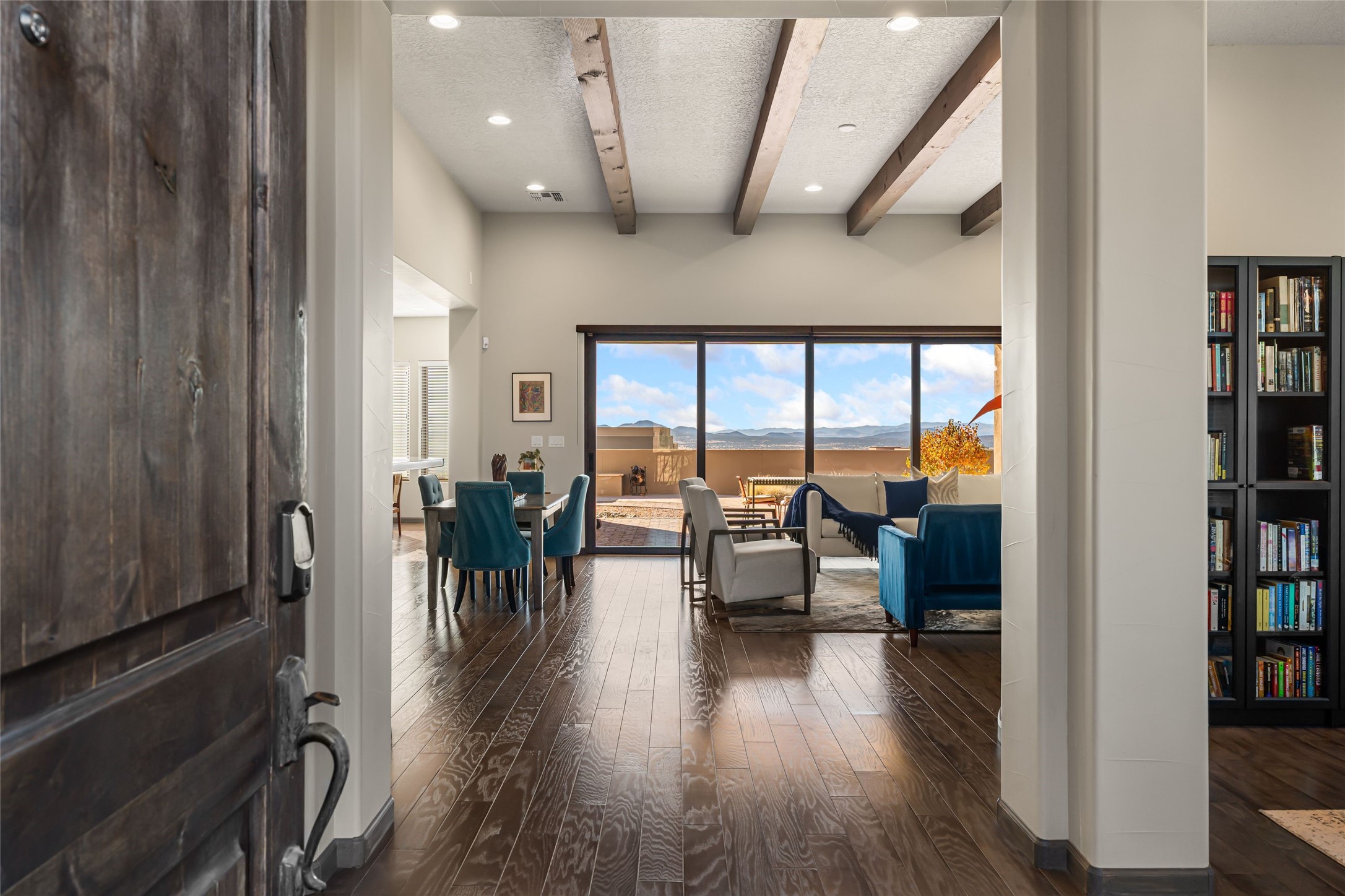 Set in Las Terrazas at Las Campanas, this beautifully maintained home enjoys expansive Jemez Mountain views and an easy indoor-outdoor connection. Light-filled living and dining spaces open to a deep portal with a kiva fireplace, ideal for sunset gatherings. The kitchen centers on a generous island with caf seating and a butler's pantry. Three ensuite bedrooms, an office or media room and thoughtful details such as quartz counters, hardwood floors, crown molding and a smarthome system combine comfort with quality. Landscaped with drip irrigation and certified Silver by Build Green NM. Club at Las Campanas memberships optional.