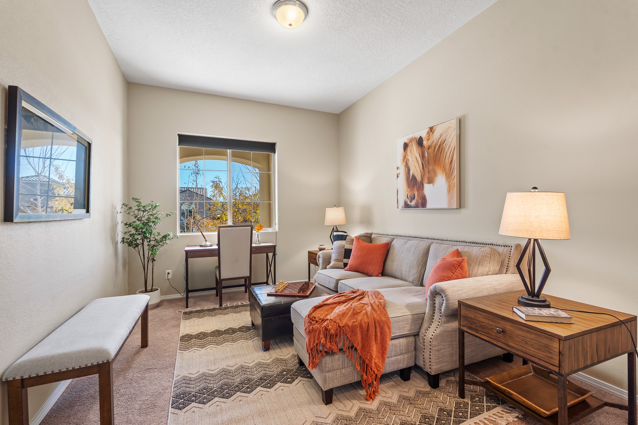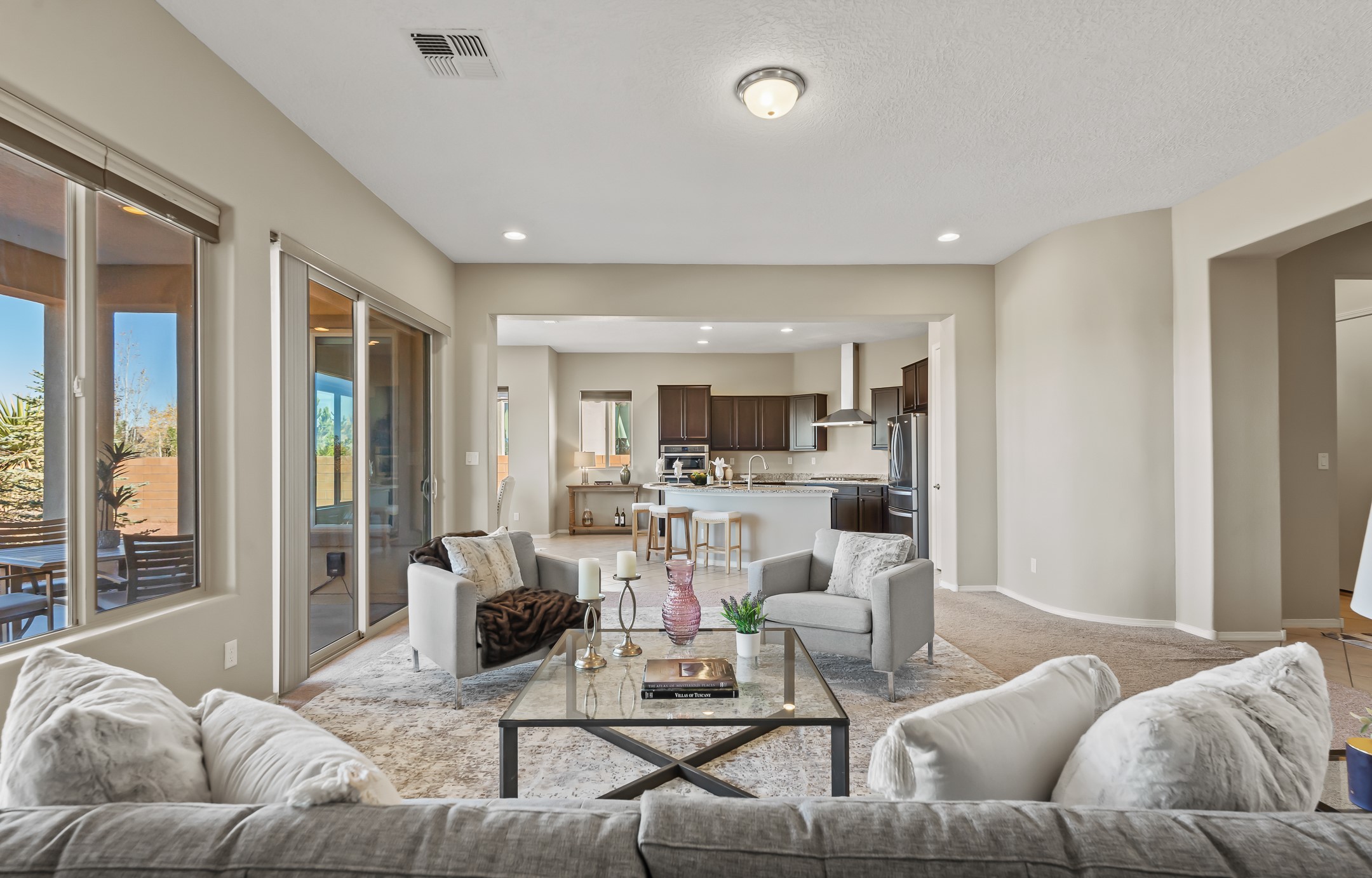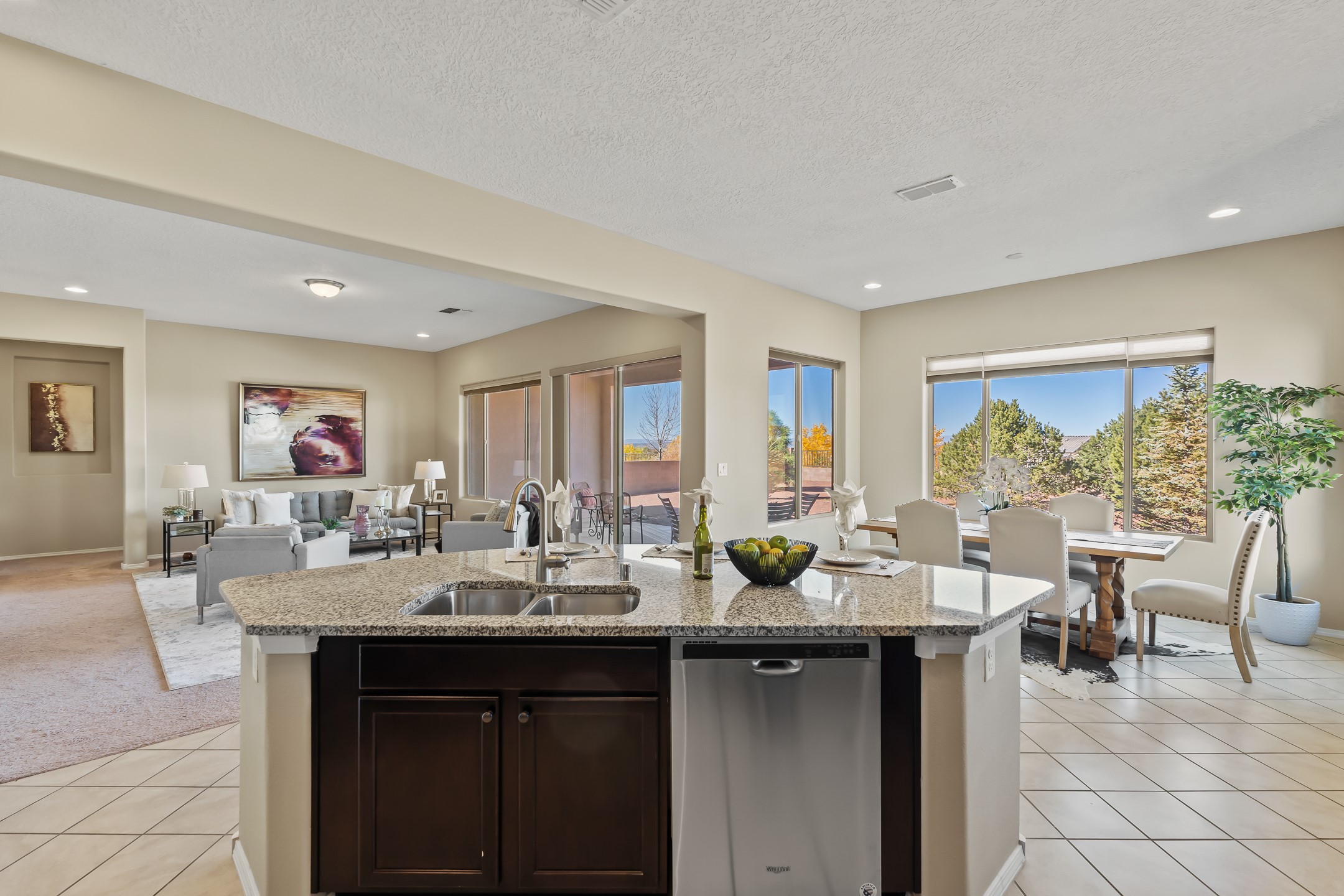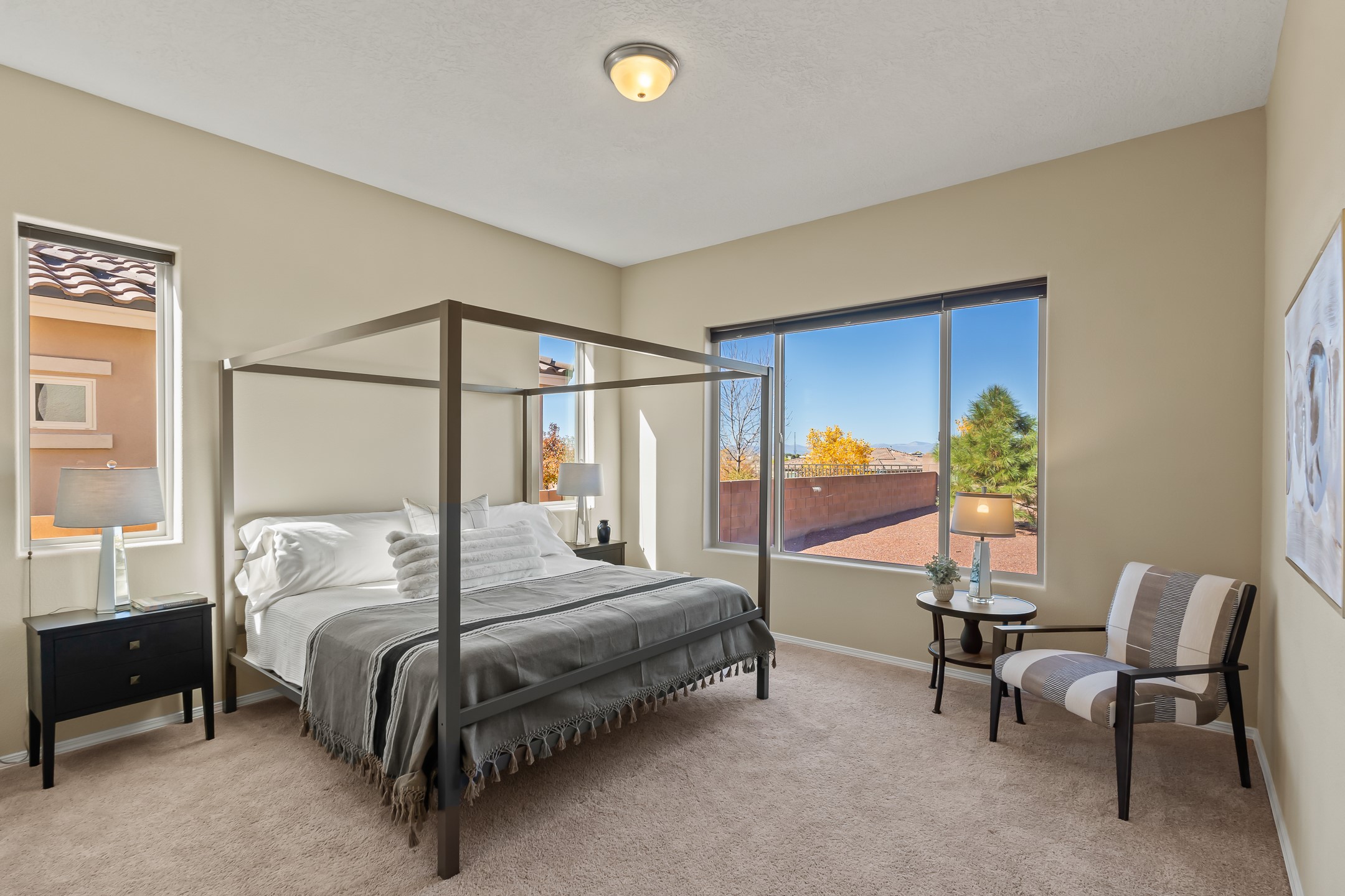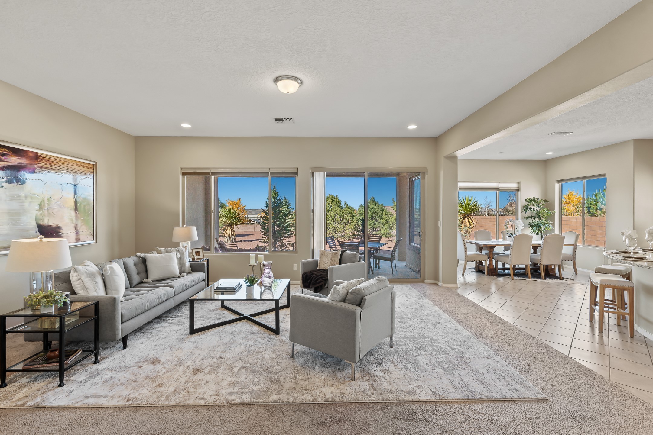 Positioned on a premier elevated lot, this refined single-level residence frames breathtaking views and glowing New Mexico sunsets. Designed for effortless living, the 3-bedroom, 2-bath floor plan spans about 2,045 sq. ft. with sun-filled open spaces, a dining bay window that captures the light, and well-crafted finishes that balance comfort and style.The 3rd bedroom is a 3-walled flex space --ideal as an office, studio, or den--and was thoughtfully designed to be easily enclosed if a true bedroom is desired.Outdoors, an artfully landscaped yard unfolds with evergreens--yucca, blue and green spruce, ponderosa, and pion--creating a serene natural backdrop for morning coffee or evening skies painted in color. Tucked within a quiet setting near scenic trails, the home offers both tranquility and convenient access to Santa Fe, Albuquerque, and nearby amenities.This combination of setting and views are rare in the Las Soleras community, an exceptional opportunity not to be missed.