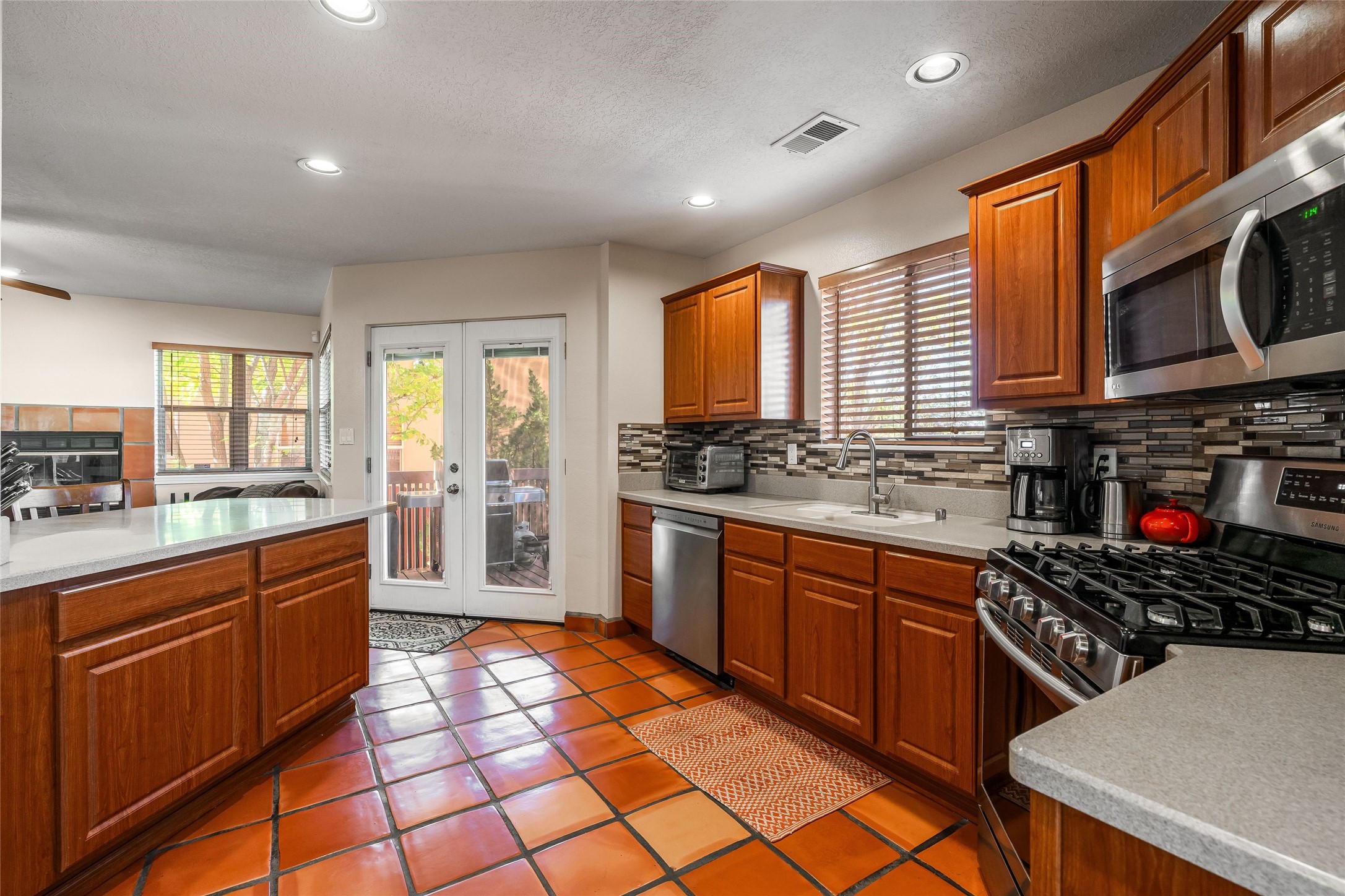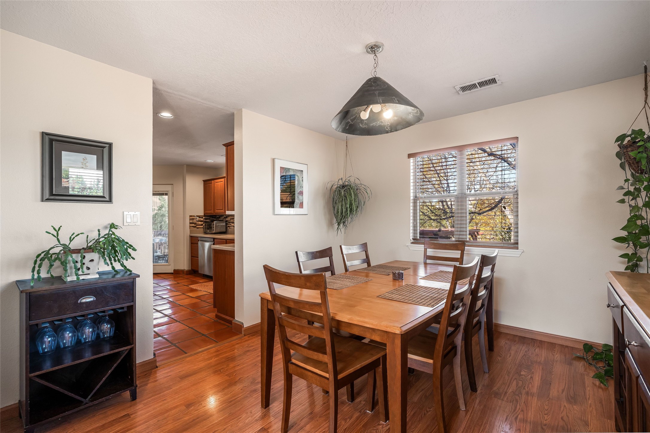 This spacious and comfortable two-story home sits on a unique private lot in the quiet and well-maintained Pueblos del Sol neighborhood. The large landscaped and fully-fenced backyard overlooks open space and features mature shade and apple trees, a pergola, and a patio that are perfect for entertaining, grilling, gardening or relaxing. The kitchen connects to the den for casual gatherings or morning coffee, with easy access to the backyard off the kitchen. The primary suite is the perfect retreat with a huge updated and expanded shower and separate bath, a large walk-in closet, and a peaceful balcony for catching the sunset or some mountain views. The living room has tons of natural light, high ceilings and vigas which provide the cozy comfort of home. There is plenty of room for your family, guests, or home office in this 2,286 square foot 4 bedroom and 3 bath home. An oversized and finished 2-car garage, tool shed, second refrigerator, giant kitchen pantry, laundry room, and ample closet space provide plenty of storage for all your needs and hobbies. Miles of neighborhood walking trails are accessible just a few steps from the house, and the brand new Pueblos del Sol playground is just down the street. Recent updates include a new water heater (2025), new upstairs blinds (2025), whole house parapet restoration (2024), and upstairs guest and primary bathroom remodel (2020).