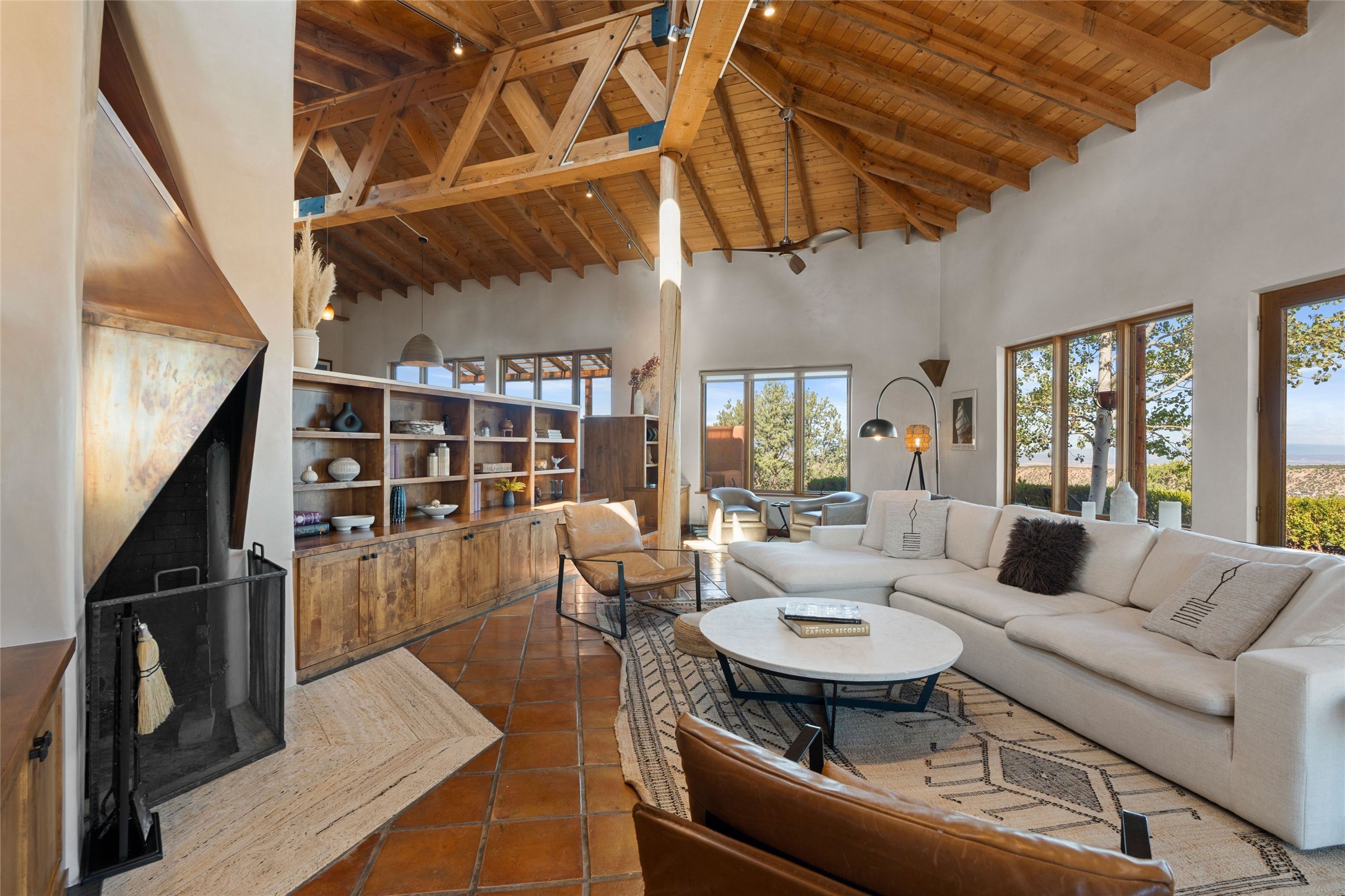 Stunning 3-bedroom, 3.5-bath home in Vista Redonda professionally sited on 5 ridge-top acres of pion trees and breathtaking views of the Sangre de Cristo and Jemez Mountains. Constructed by renowned builder Dennis Sayer, this residence showcases exceptional workmanship and reflective design. The pitched roof and soaring beamed ceilings create an airy, inviting atmosphere, while the hard plaster walls and polished Saltillo tiles add timeless elegance. Upon entering, you'll find a spacious great room that flows into a dining area and a well-appointed eat-in kitchen. The office, complete with built-in desk and bookcases, provides a quiet retreat, while the kiva fireplace adds warmth and character to the space. The home features two en-suite bedrooms in each wing, ensuring privacy and comfort for guests.. In addition, there is a detached 196 sq. ft. studio/casita. Multiple outdoor areas invite you to enjoy al fresco dining and entertaining, including a delightful sunrise breakfast patio where you can soak in the morning sun with a cup of coffee. Natural light floods the home through plentiful skylights, windows, and glass doors, begetting a bright and welcoming environment. Additional highlights include a heated 2-car garage and newer boiler and water heaters. Just south of Vista Redonda is the Village of Tesuque, its neighborhood gathering spot Tesuque Village Market and the contemporary restaurant and bar, El Nido. Easy access to The Santa Fe Opera and downtown Santa Fe.