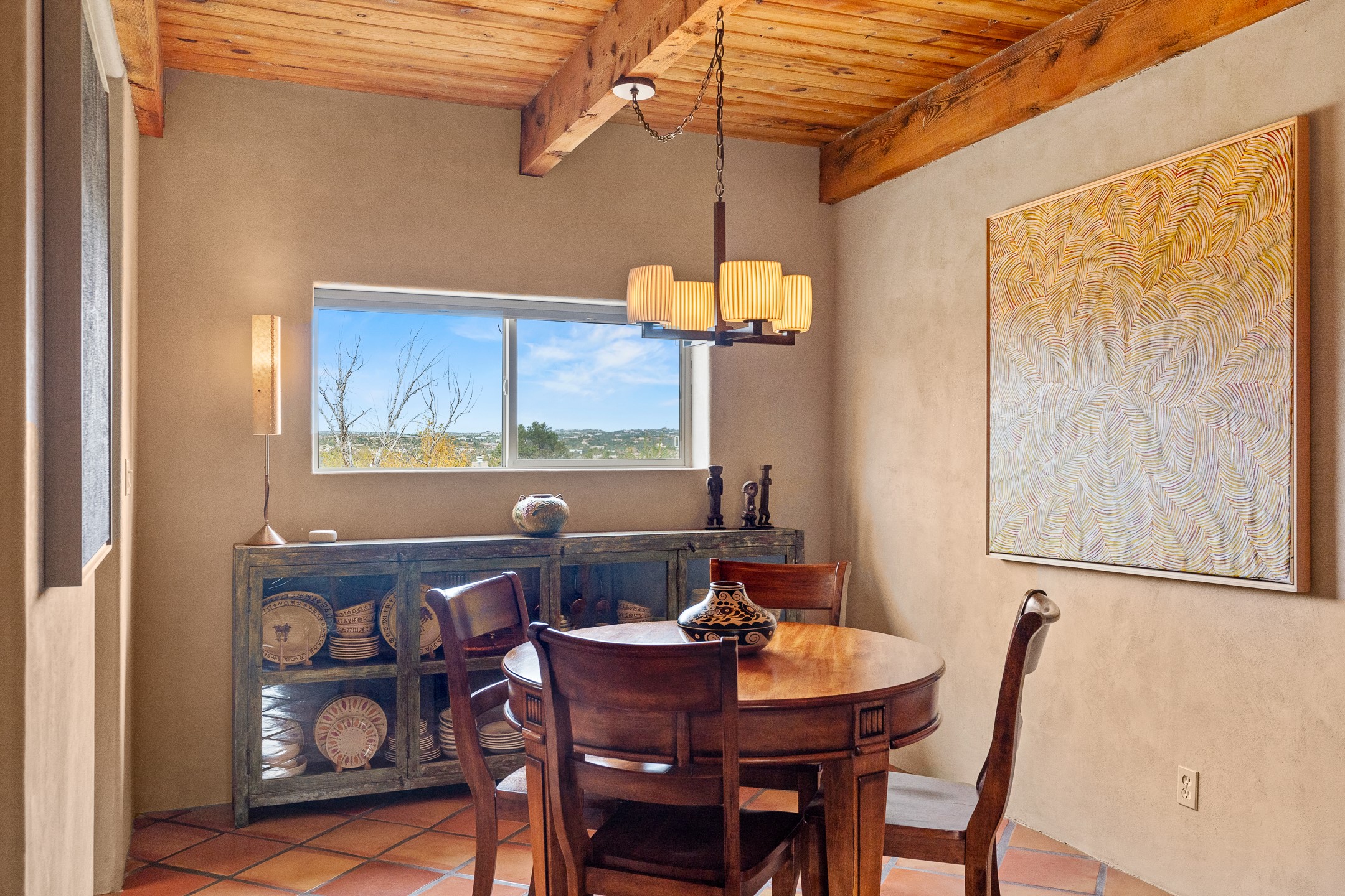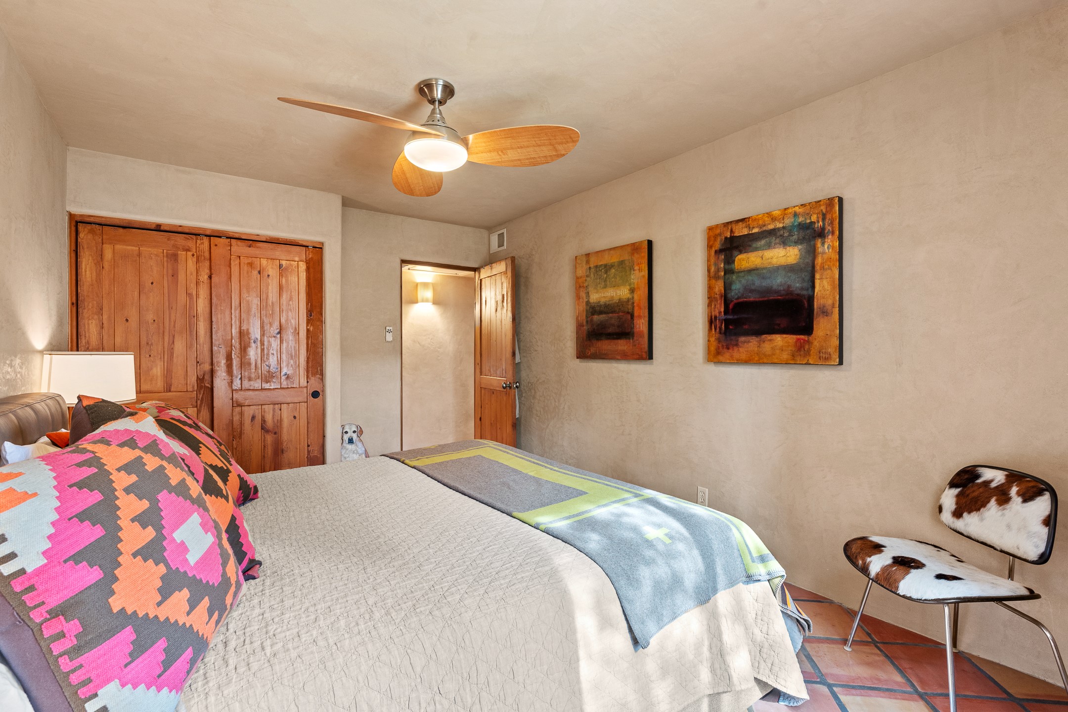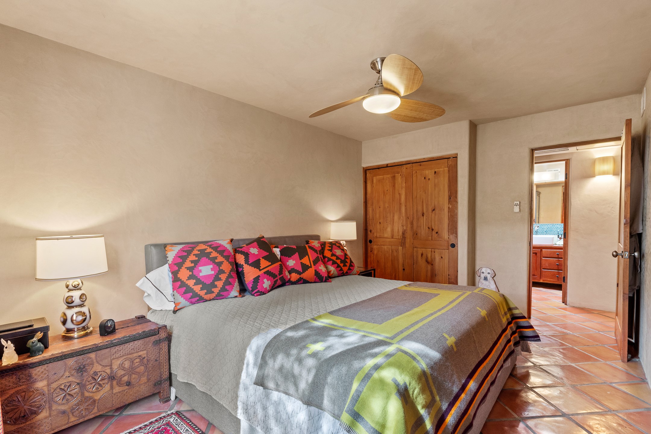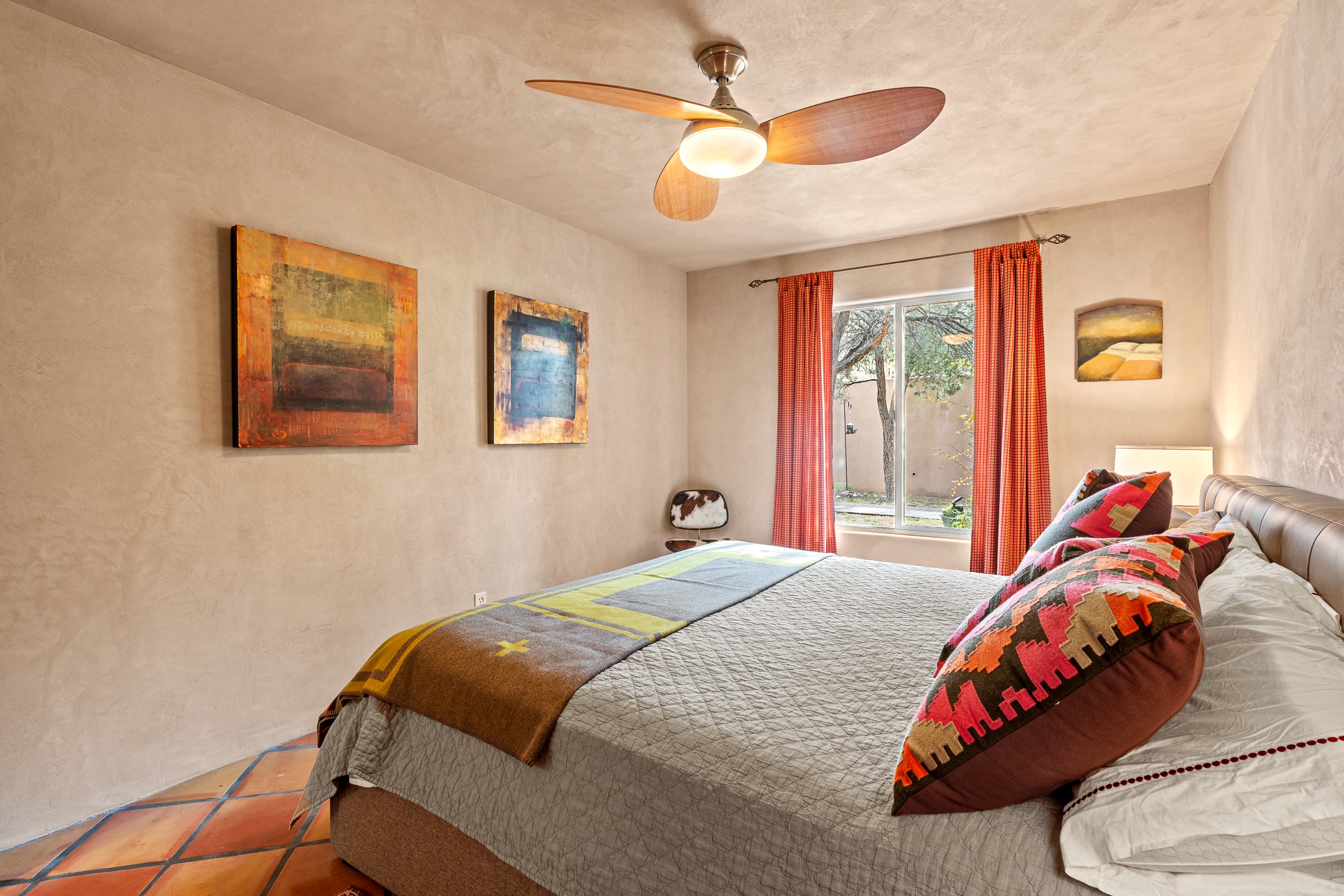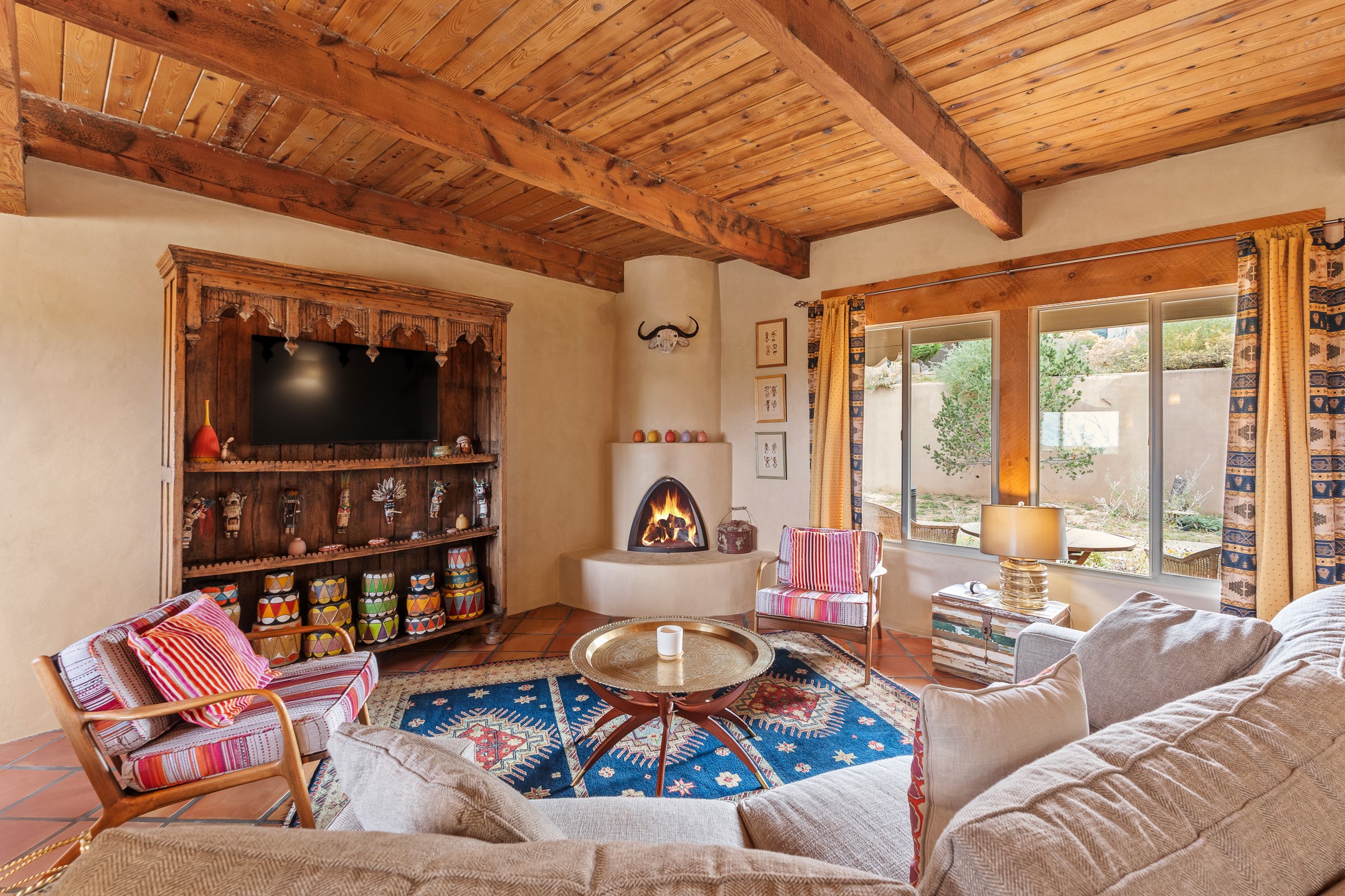 This charming 2 bedroom, 2 bathroom single-level condominium is ideally located just 6 blocks from the vibrant heart of downtown Santa Fe and only 1 block from the scenic road to Ski Santa Fe, with access to numerous hiking and biking trails. Nestled within the coveted Fort Marcy Compound, this beautifully updated home offers a quiet setting with minimal passersby. The HOA does not place restrictions on rentals, making this a perfect candidate for a short-term rental property, a vacation home for when you want to visit Santa Fe, or a full-time residence as it has been for the current owners! The spacious interior features Saltillo tiles laid on an angle, American Clay walls, and exposed natural beams. Enjoy cozy evenings by the Kiva fireplace and the convenience of an office space that opens into the living area for better flow. The modern kitchen boasts a new induction stove, a low-profile fridge, custom cabinetry with a bar, and full pantry storage. With two windows showcasing stunning sunset views and a beautifully landscaped garden area, this condo is the perfect blend of comfort and style. Don't miss your chance to experience the best of Santa Fe living! The on-site management company operates a vountary STR propram. Ask listing broker for details. Amenities include an indoor swimming pool and hot tub, a popular attraction for vacationers in the summer and winter months! Call for your showing today, before it's gone!