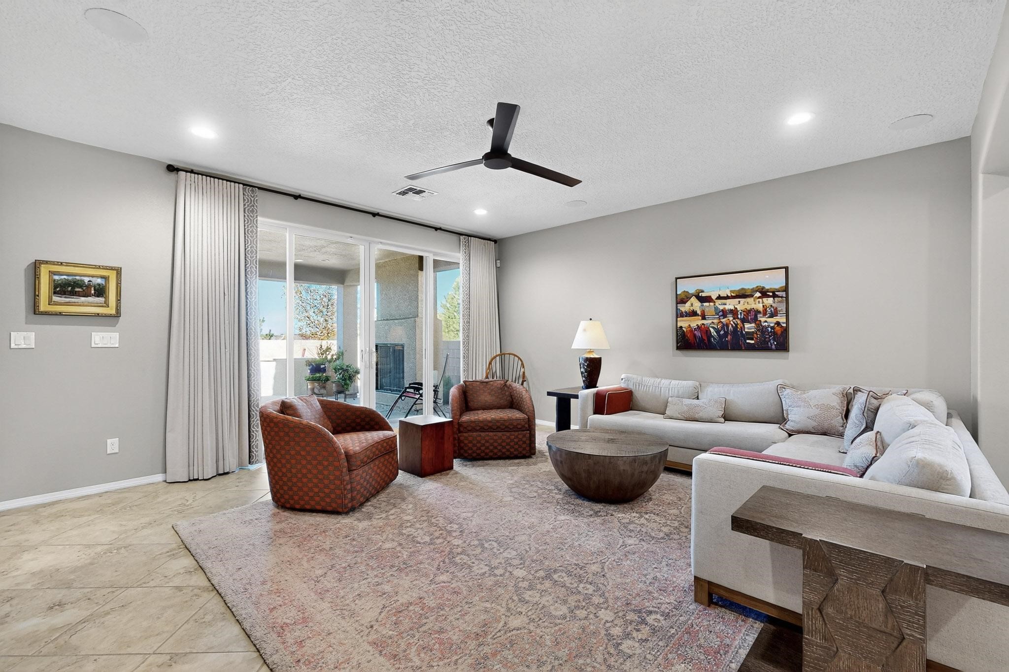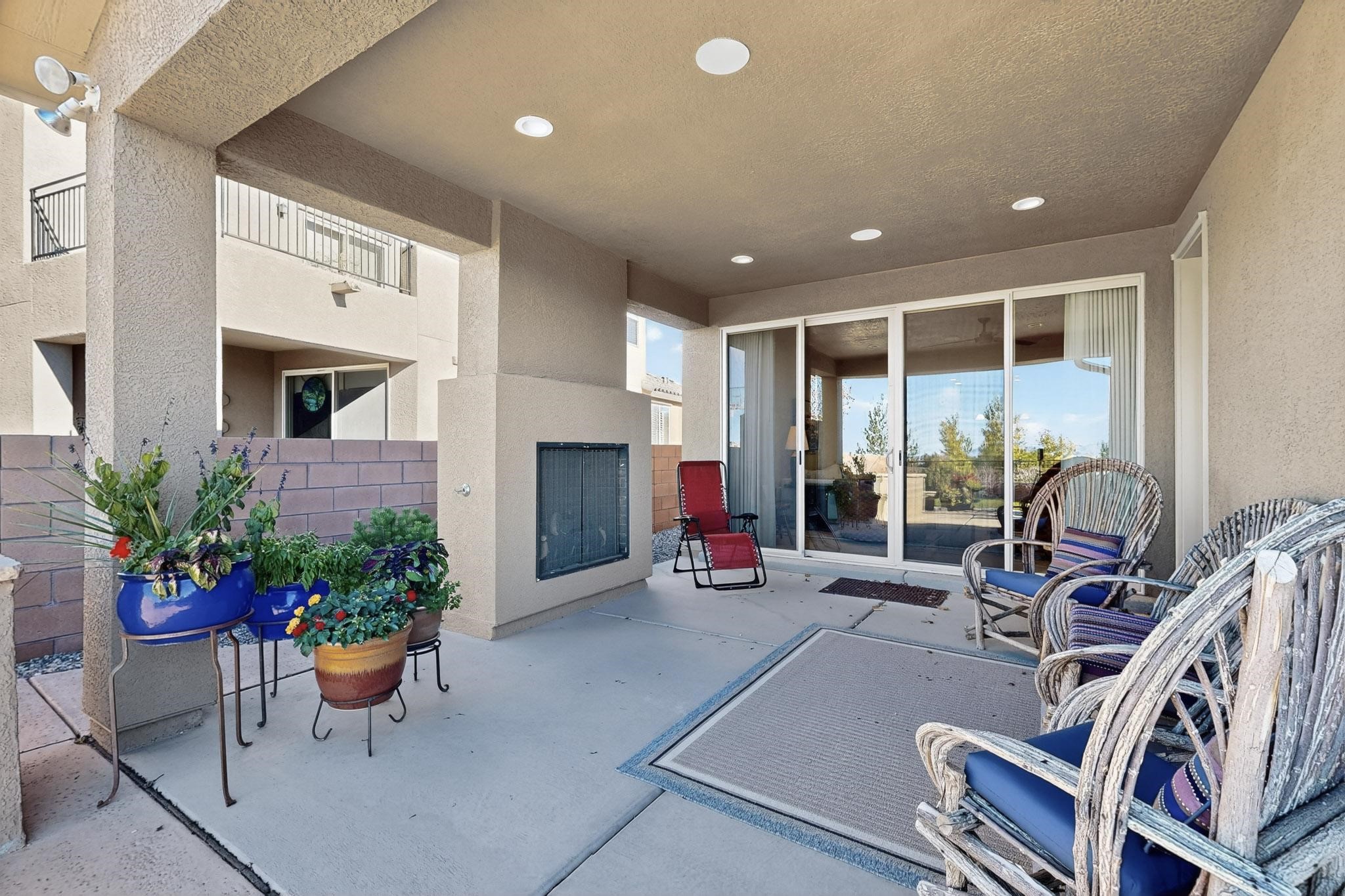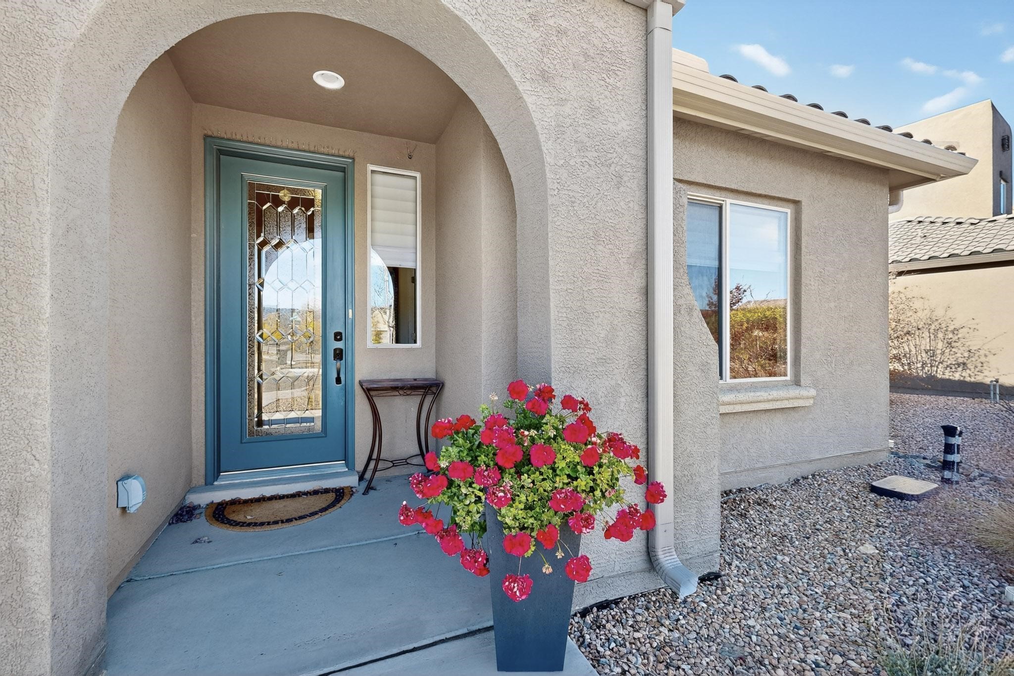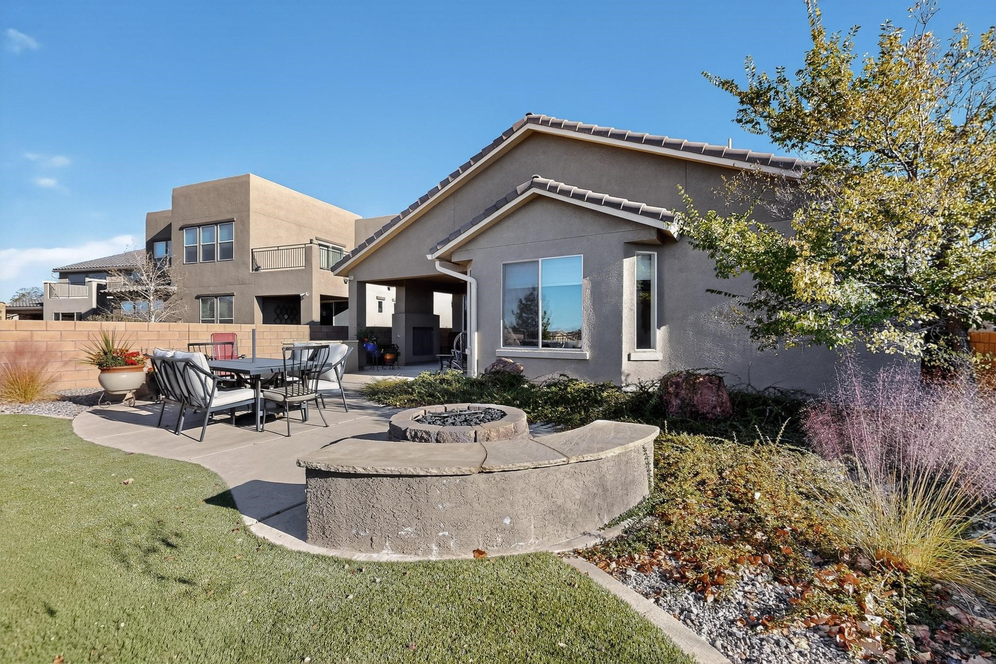 This is a one owner, former model home on a premium lot with many upgrades and even mountain views! There is shopping and restaurants nearby and easy access to I-25. The open concept living area is spacious and separates the primary suite from the 3 guest bedrooms. There are 2 bathrooms and also a den/office. Included are custom window coverings throughout. The front and back yards are beautifully landscaped. The turf and drip irrigation makes for easy maintenance. The backyard will bring year round enjoyment with a gas fireplace in the portal and a gas fire pit with sitting area in the yard. The house backs up to open space from which you will enjoy the mountain views and gorgeous Santa Fe sunsets. This is a must see if you are looking for a meticulously maintained single level home that is truly move in ready.
