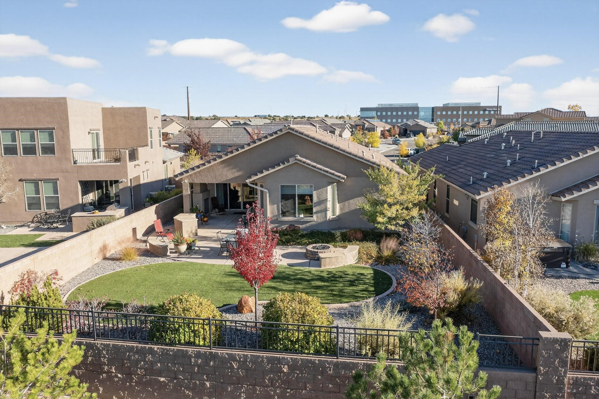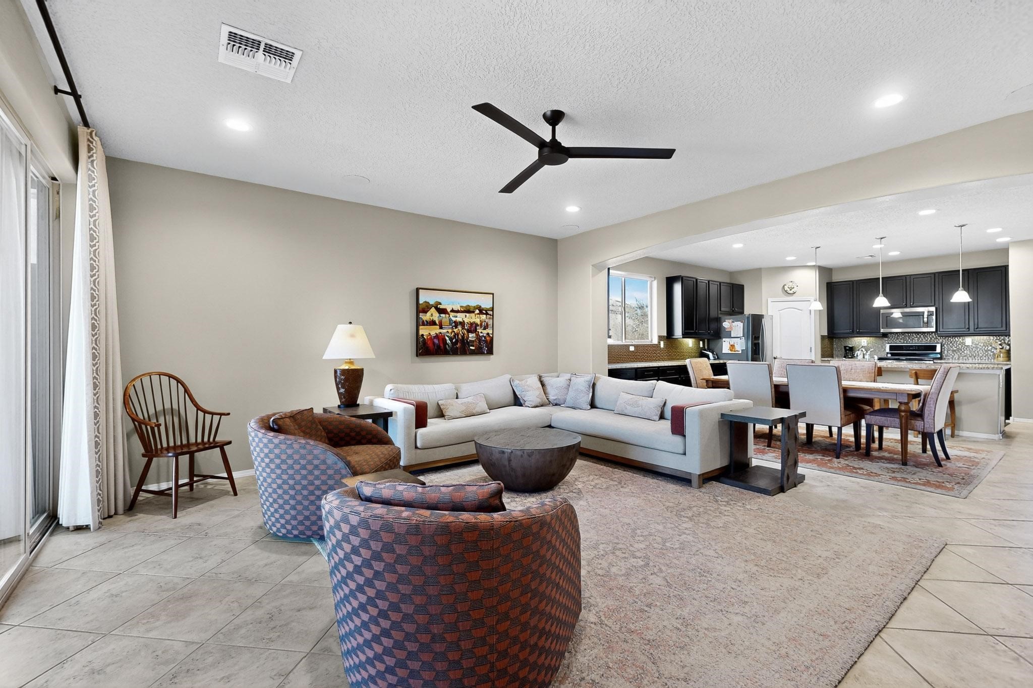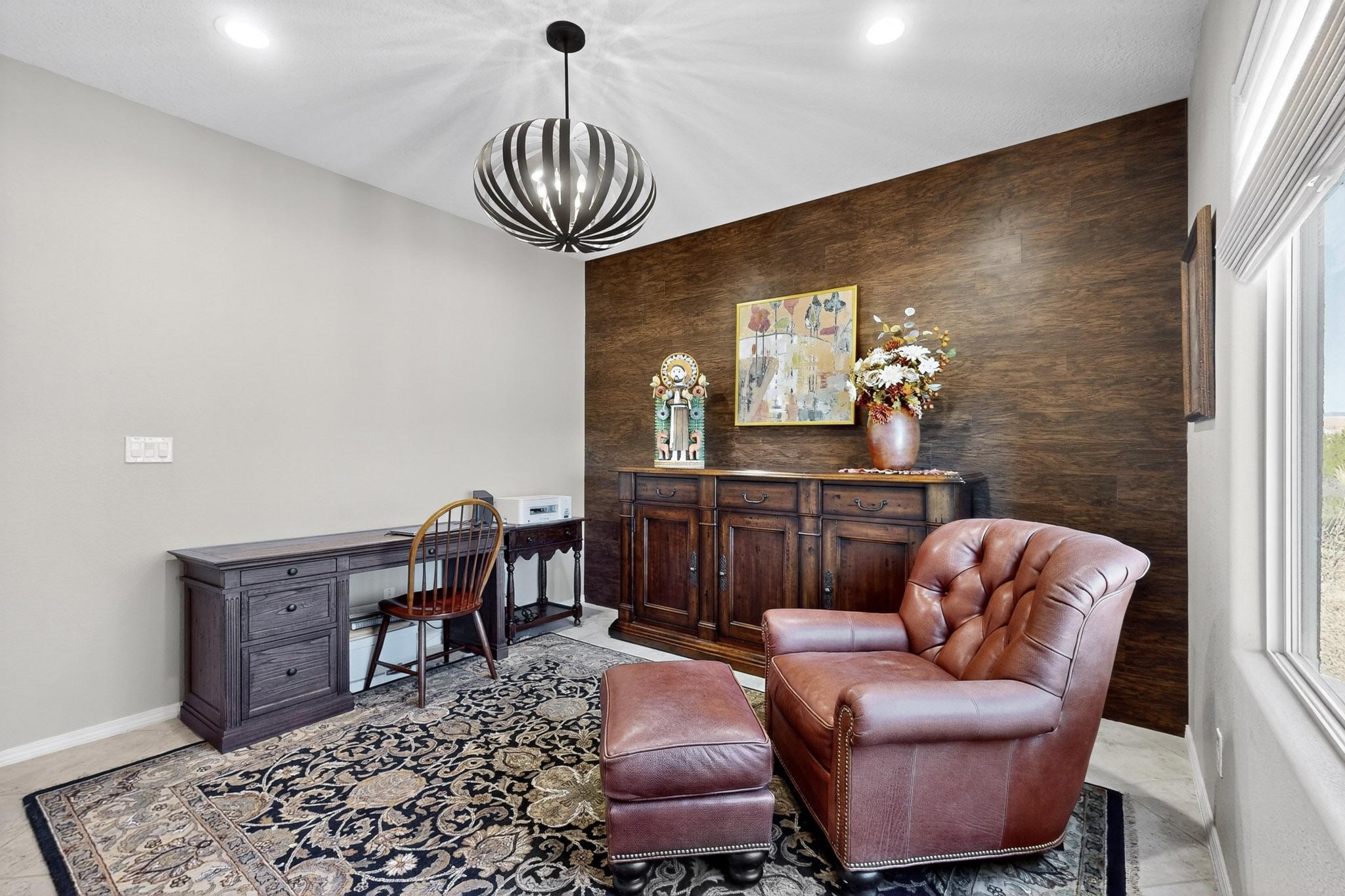 This is a one owner, former model home on a premium lot with many upgrades and even mountain views! There is shopping and restaurants nearby and easy access to I-25. The open concept living area is spacious and separates the primary suite from the 3 guest bedrooms. There are 2 bathrooms and also a den/office. Included are custom window coverings throughout. The front and back yards are beautifully landscaped. The turf and drip irrigation makes for easy maintenance. The backyard will bring year round enjoyment with a gas fireplace in the portal and a gas fire pit with sitting area in the yard. The house backs up to open space from which you will enjoy the mountain views and gorgeous Santa Fe sunsets. This is a must see if you are looking for a meticulously maintained single level home that is truly move in ready.