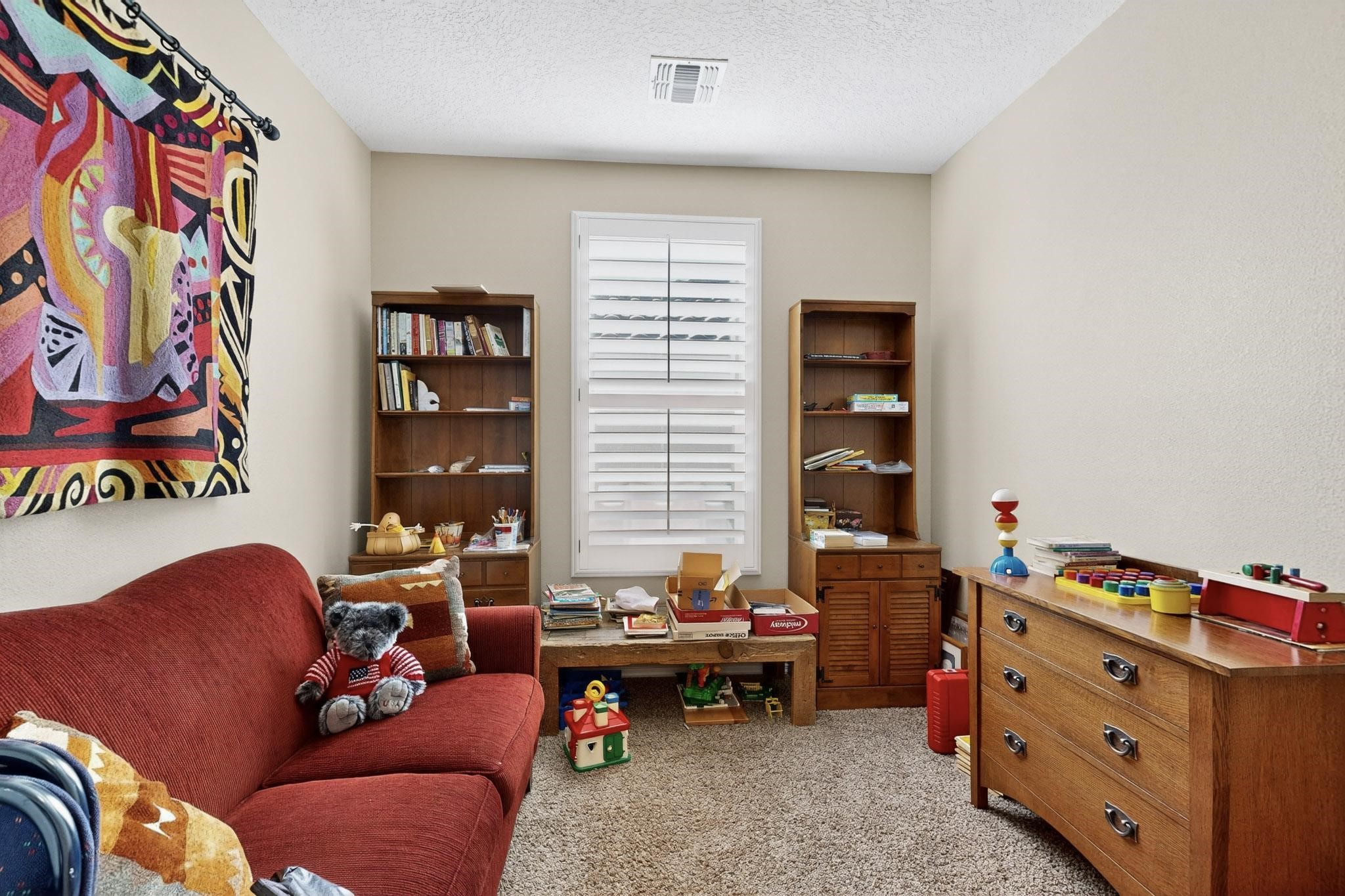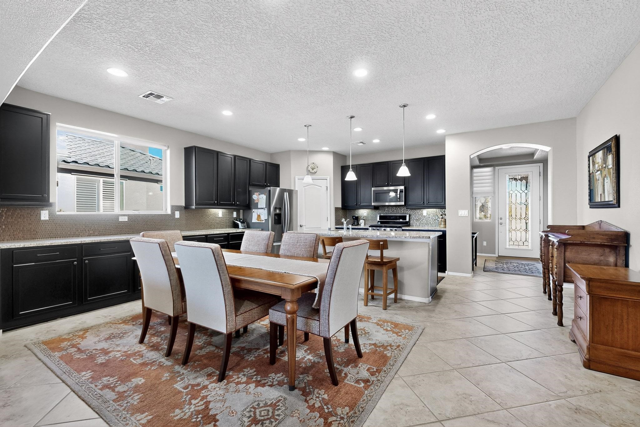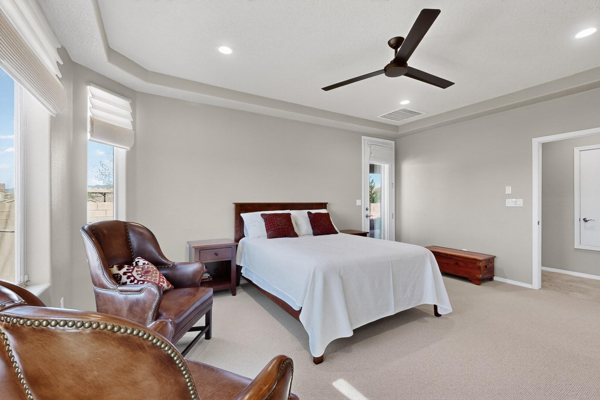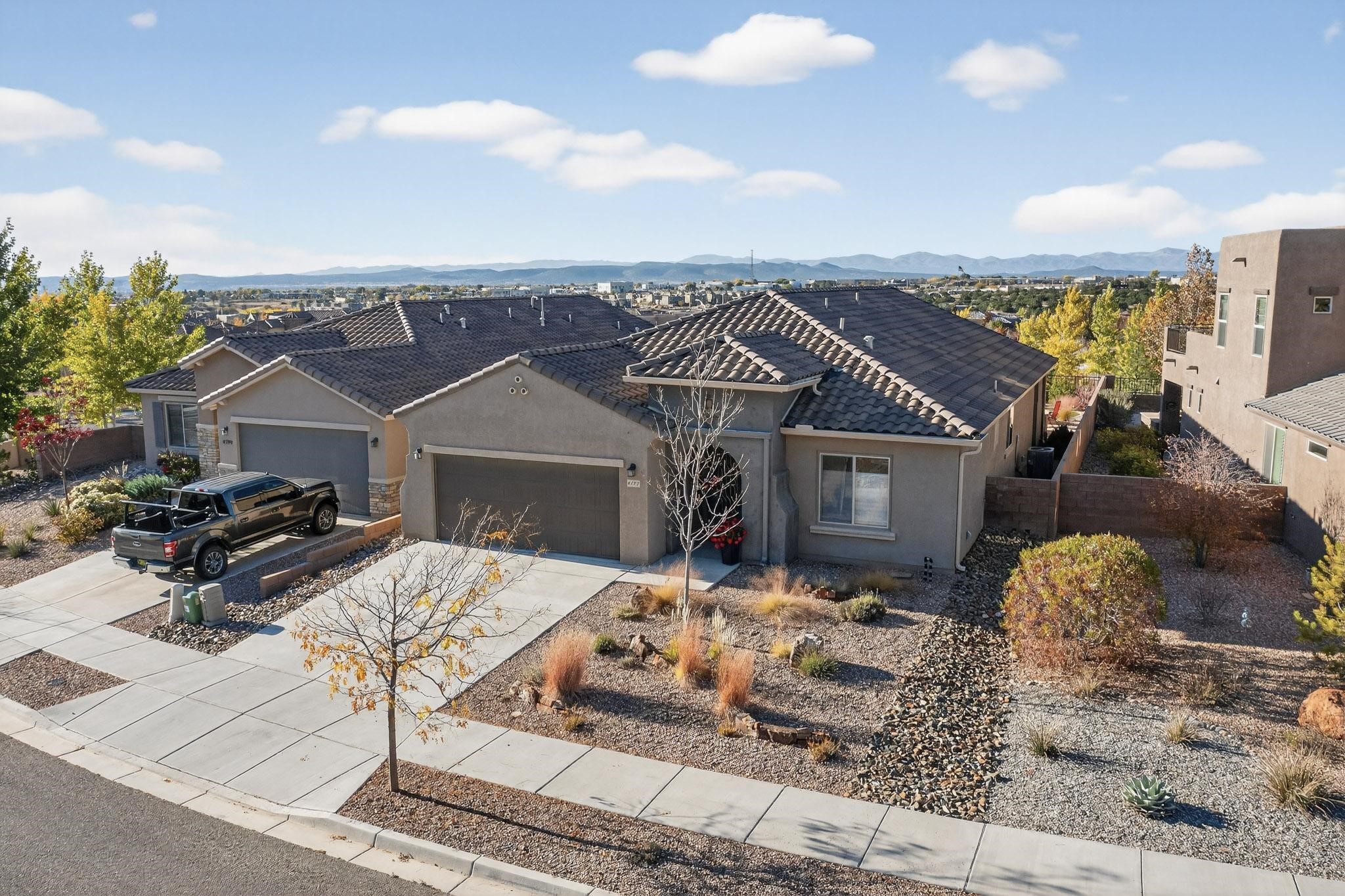 This is a one owner, former model home on a premium lot with many upgrades and even mountain views! There is shopping and restaurants nearby and easy access to I-25. The open concept living area is spacious and separates the primary suite from the 3 guest bedrooms. There are 2 bathrooms and also a den/office. Included are custom window coverings throughout. The front and back yards are beautifully landscaped. The turf and drip irrigation makes for easy maintenance. The backyard will bring year round enjoyment with a gas fireplace in the portal and a gas fire pit with sitting area in the yard. The house backs up to open space from which you will enjoy the mountain views and gorgeous Santa Fe sunsets. This is a must see if you are looking for a meticulously maintained single level home that is truly move in ready.