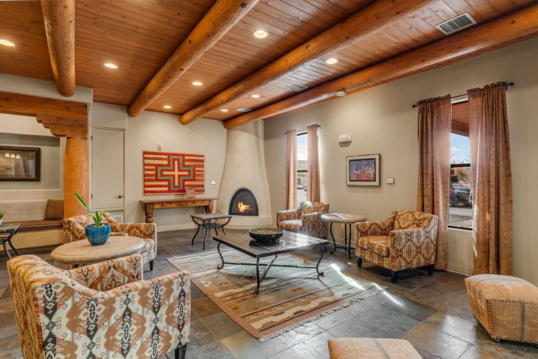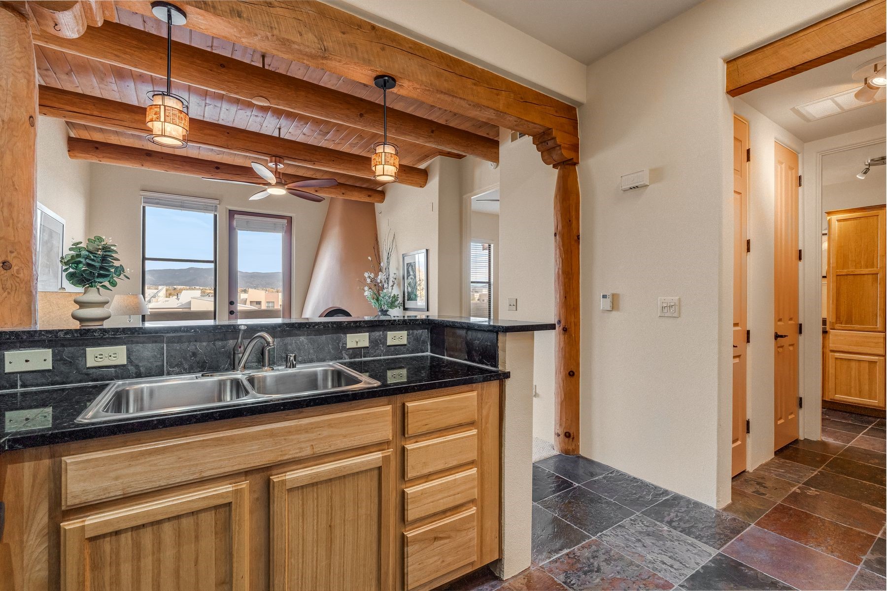 High-end top floor elegance at The Alameda! This 1 Bedroom/1 Bathroom luxe condo has rare and sought after Sangre de Cristo mountain views from the Living Room, Kitchen, Bedroom and Balcony. Enjoy the fine architectural interior features of wood vigas, tongue and groove ceilings, corbels and a handsome corner gas kiva fireplace. Significant upgrades have been made this year that include: All new paint, stripped and sealed slate flooring, 100% berber carpeting, new induction stove, Elfa custom closets, new hot water tank, new pendant lighting and new blinds. This unit includes a one-car garage and 50 square foot storage room right across the hallway. The Alameda is a luxury amenity condominium gated community that includes: Heated outside swimming pool with BBQ; Fitness Center; Party Rooms with Kitchens and Lounge Areas throughout and a Dog Run. Onsite professional manager and 24 hour controlled access. Fabulous location and close to shopping, dining and entertainment. This great opportunity can be yours so live La Dolce Vita and schedule your showing today!