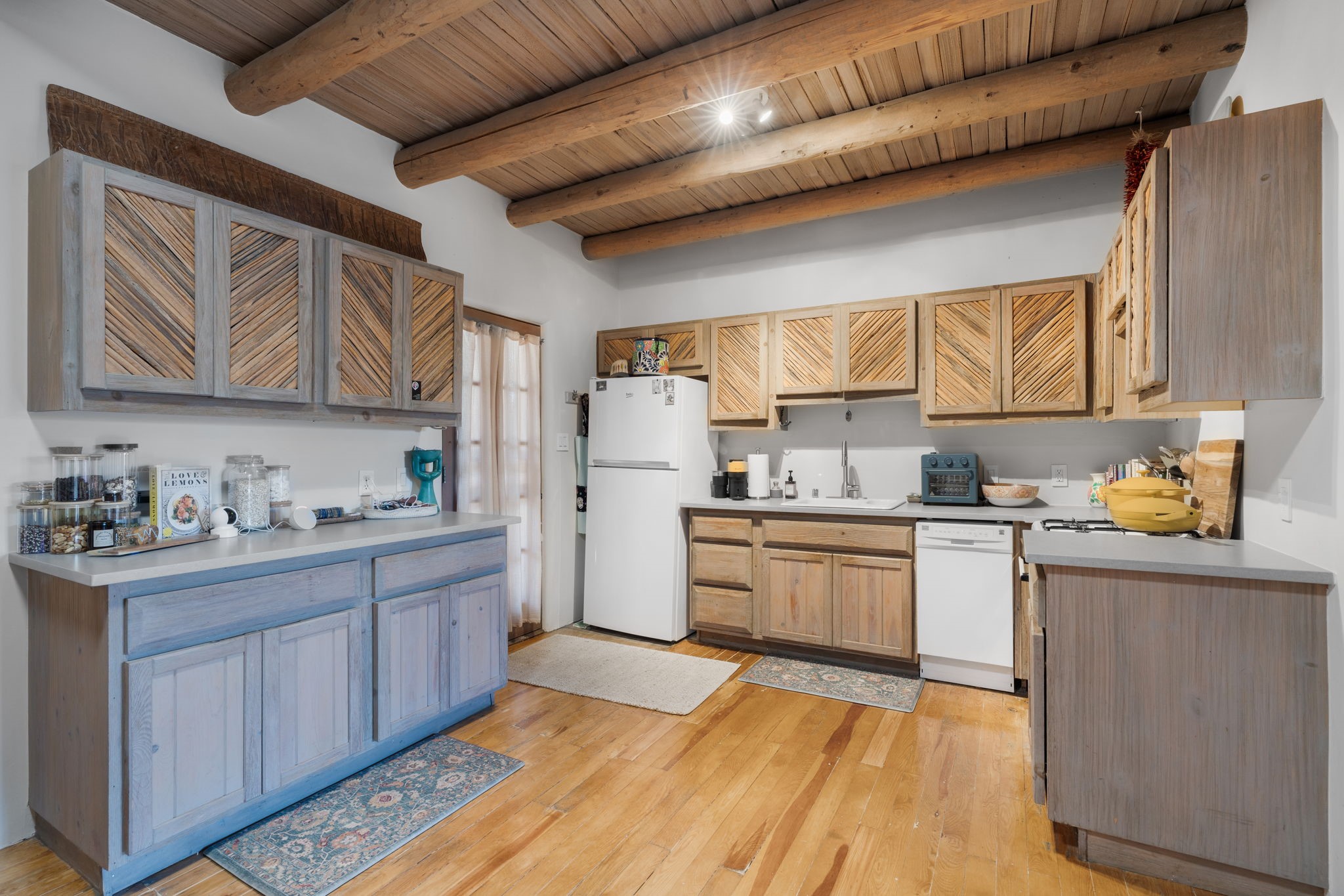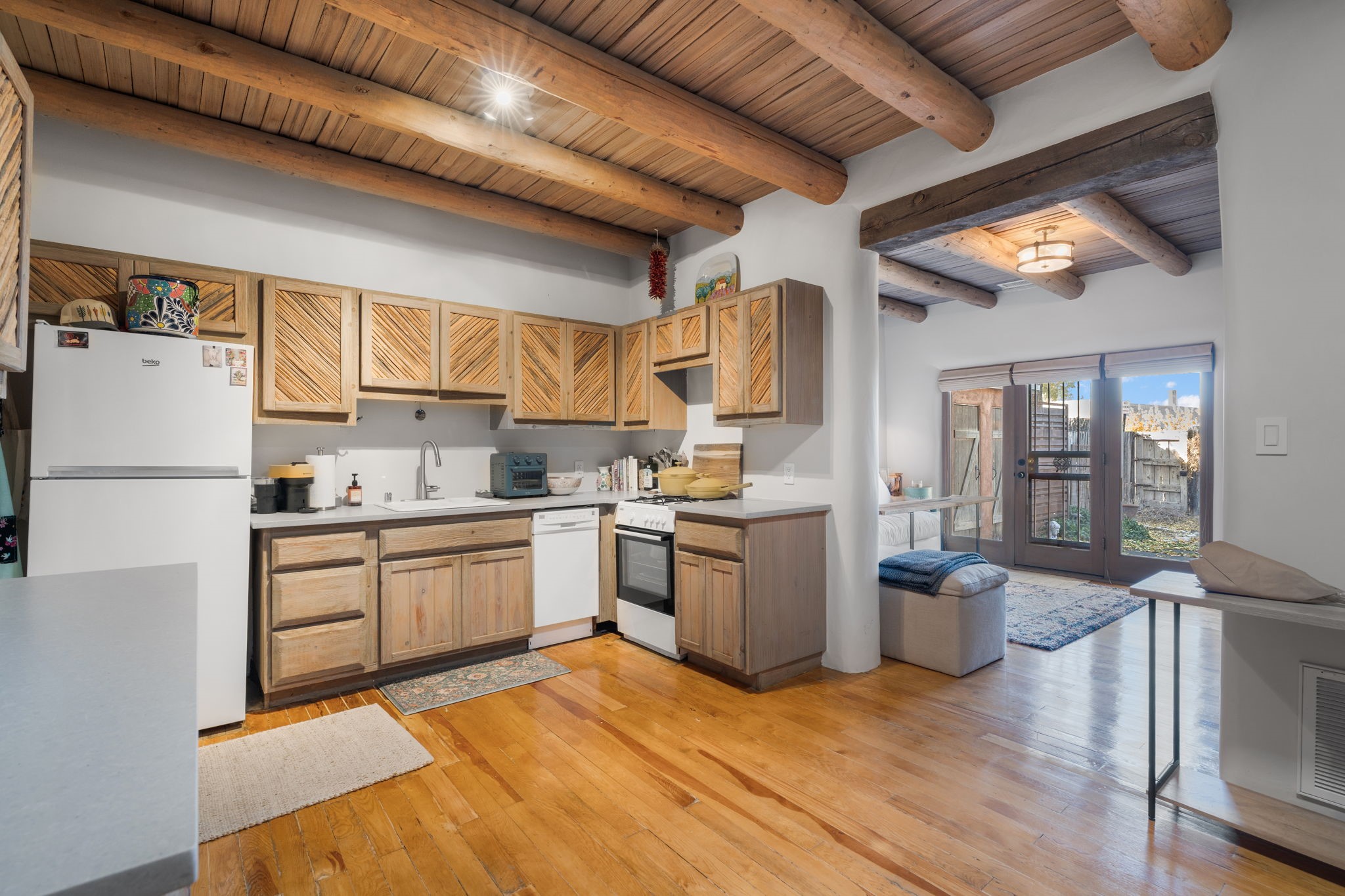Updated 1 bed 1 bath condo in the heart of the Guadalupe Historic District. Warm Santa Fe style throughout with vigas, T and G ceilings, a kiva fireplace and pine plank floors. The kitchen is refreshed with quartz counters and solid storage. A private flagstone patio and garden give you real outdoor living space for dinner, coffee or quiet mornings. Single level, no interior steps and your own reserved parking spot. Close to the Railyard, the Plaza and Museum Hill.